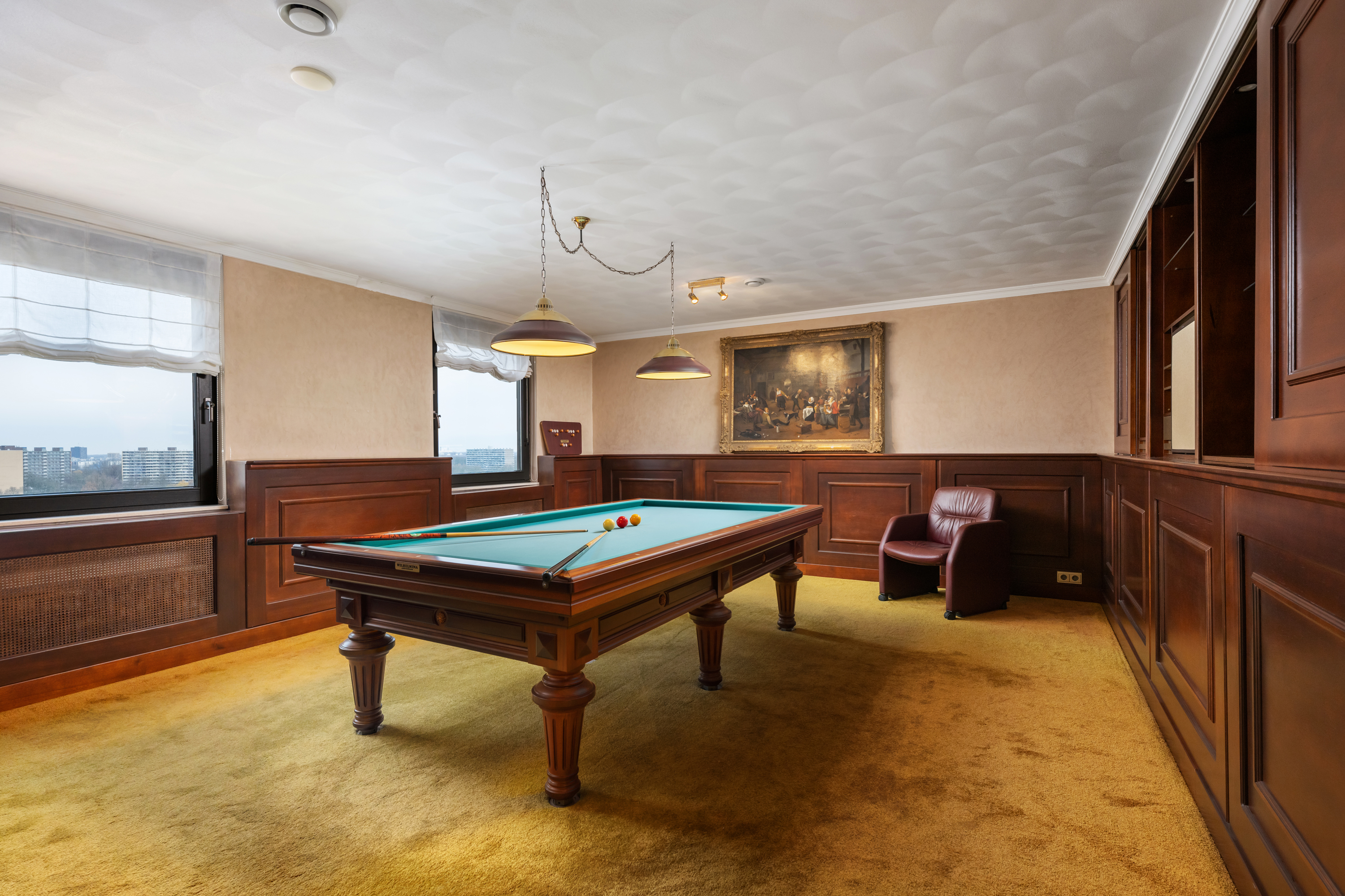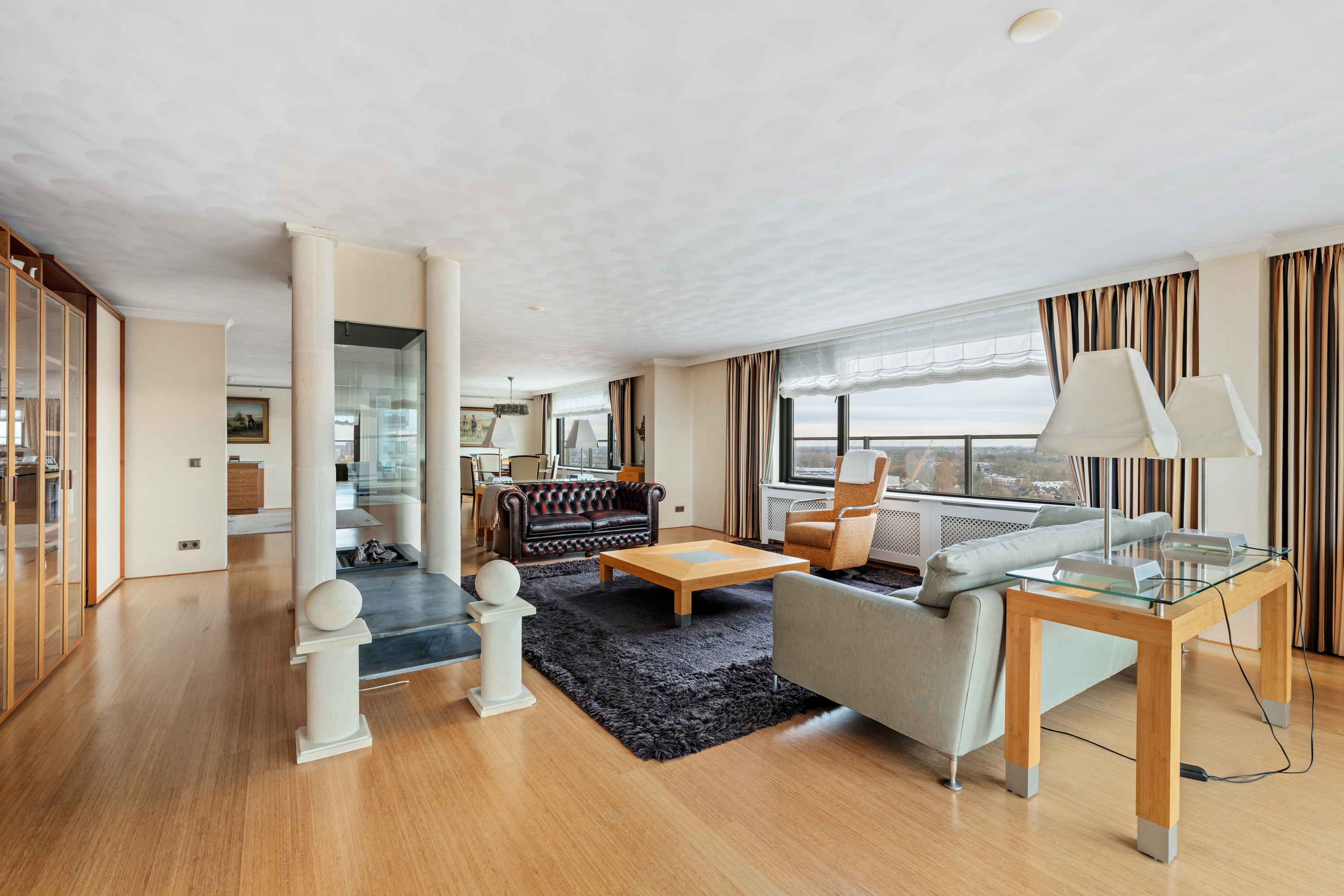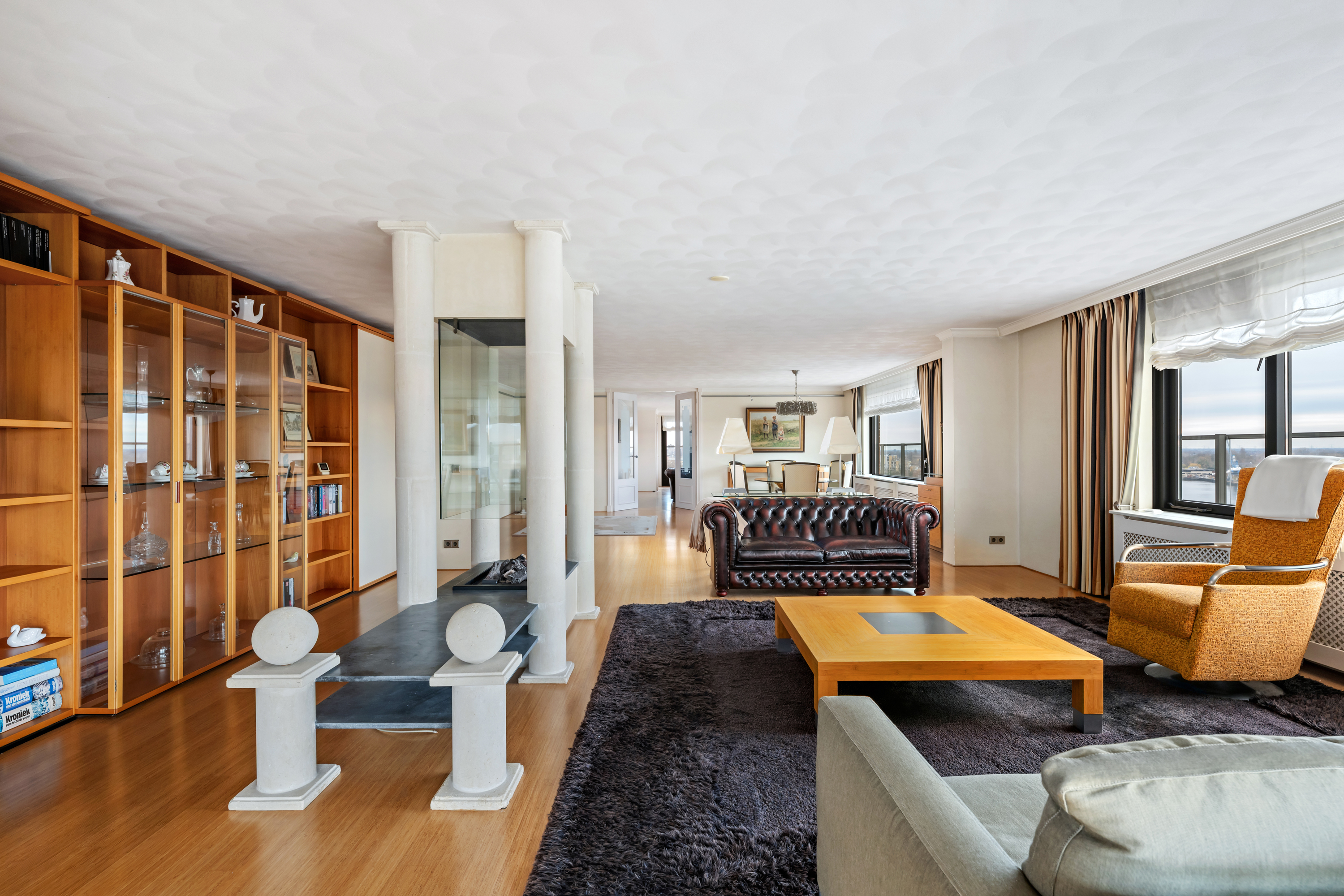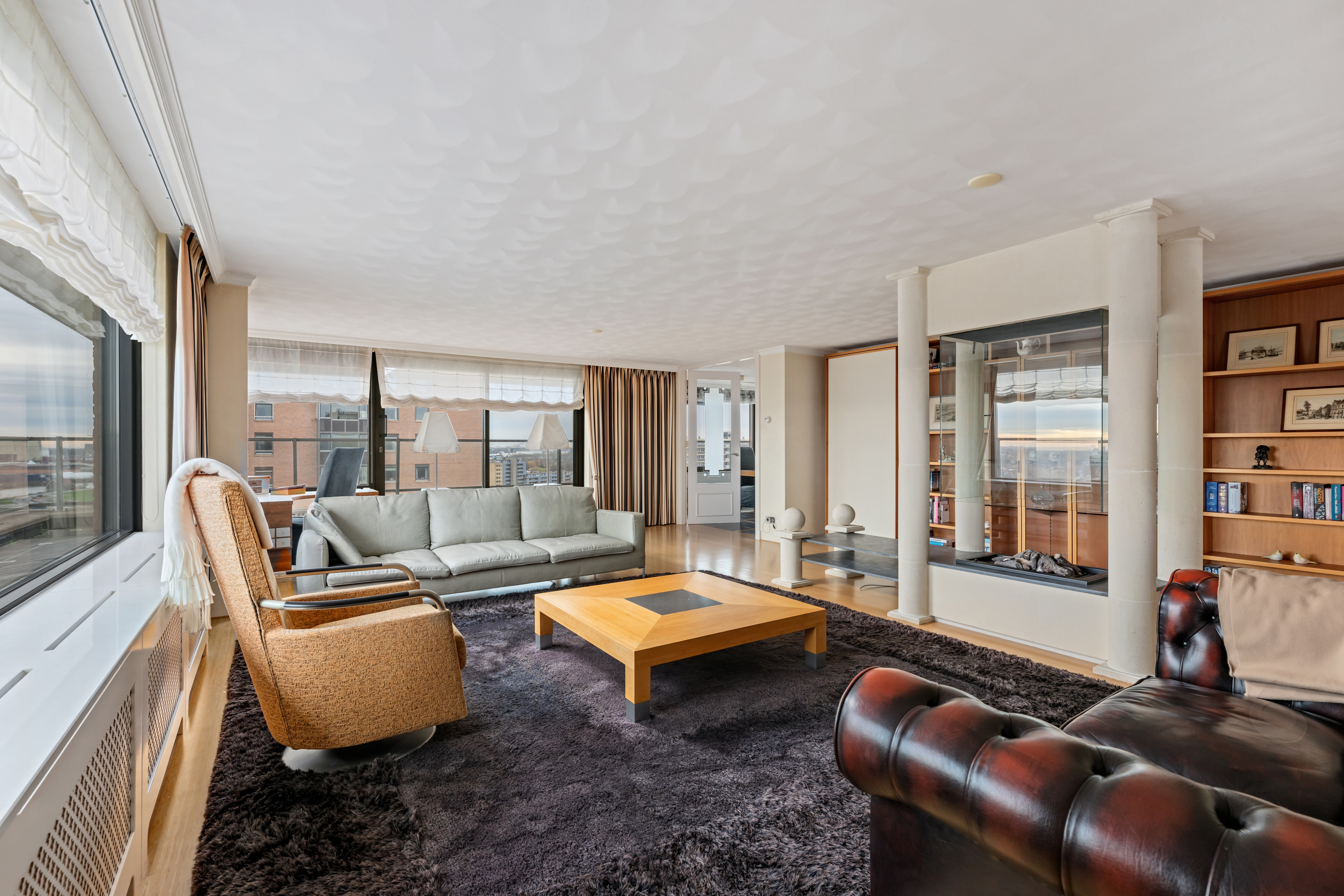 Een waar indrukwekkend penthouse (bijna 370m2 wonen) dat de volledige bovenste etage beslaat en omgeven is door rust, ruimte en panoramisch uitzicht. De woning biedt een imposante living met haard, een stijlvolle bibliotheek/werkkamer, aparte eetkamer en een royale woonkeuken. Met vier ruime slaapkamers is er volop ruimte voor gezin, gasten of werk aan huis. Daarnaast zijn er drie badkamers, een aparte wasruimte en een sfeervolle biljartkamer met klassieke uitstraling.