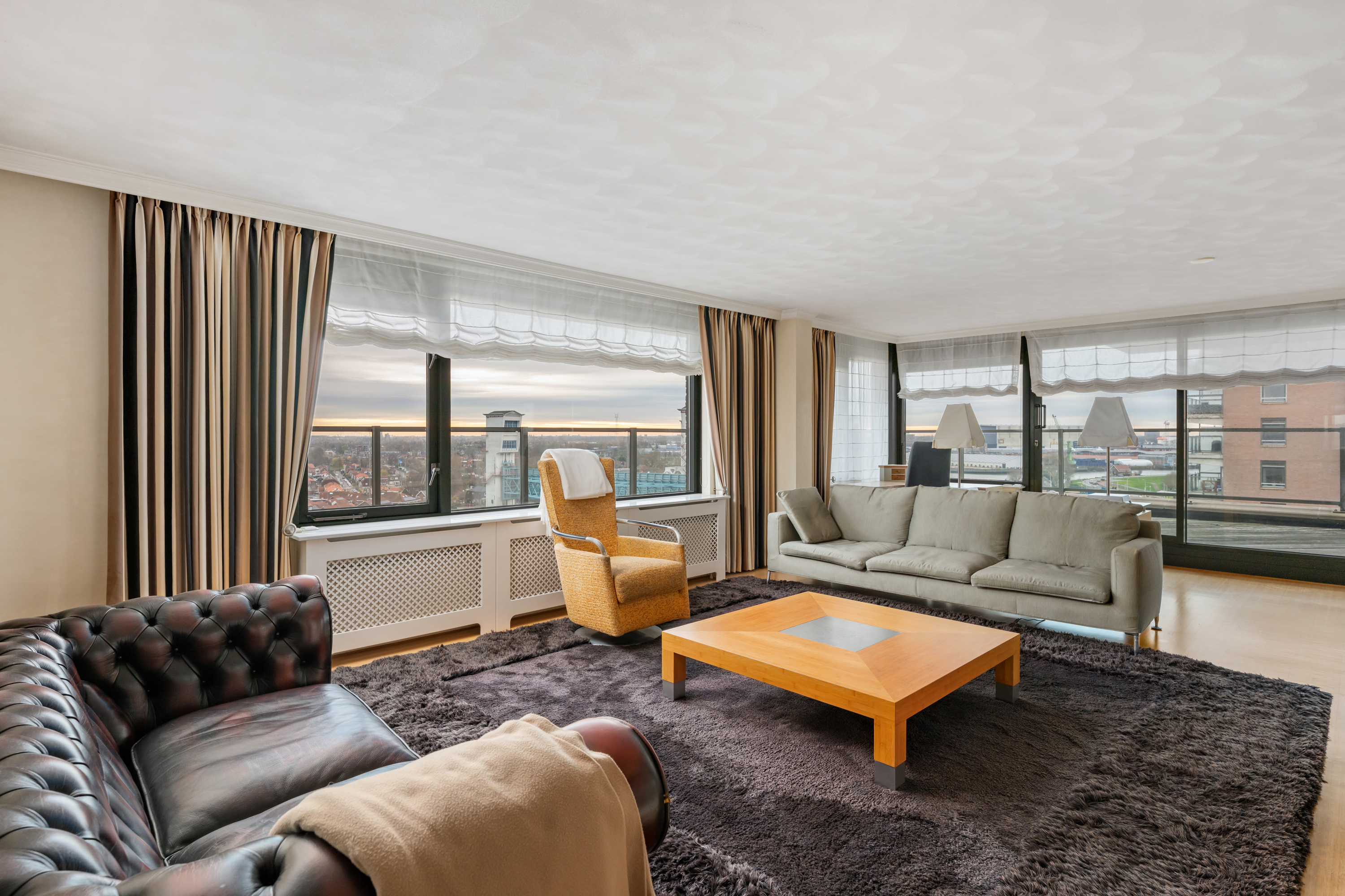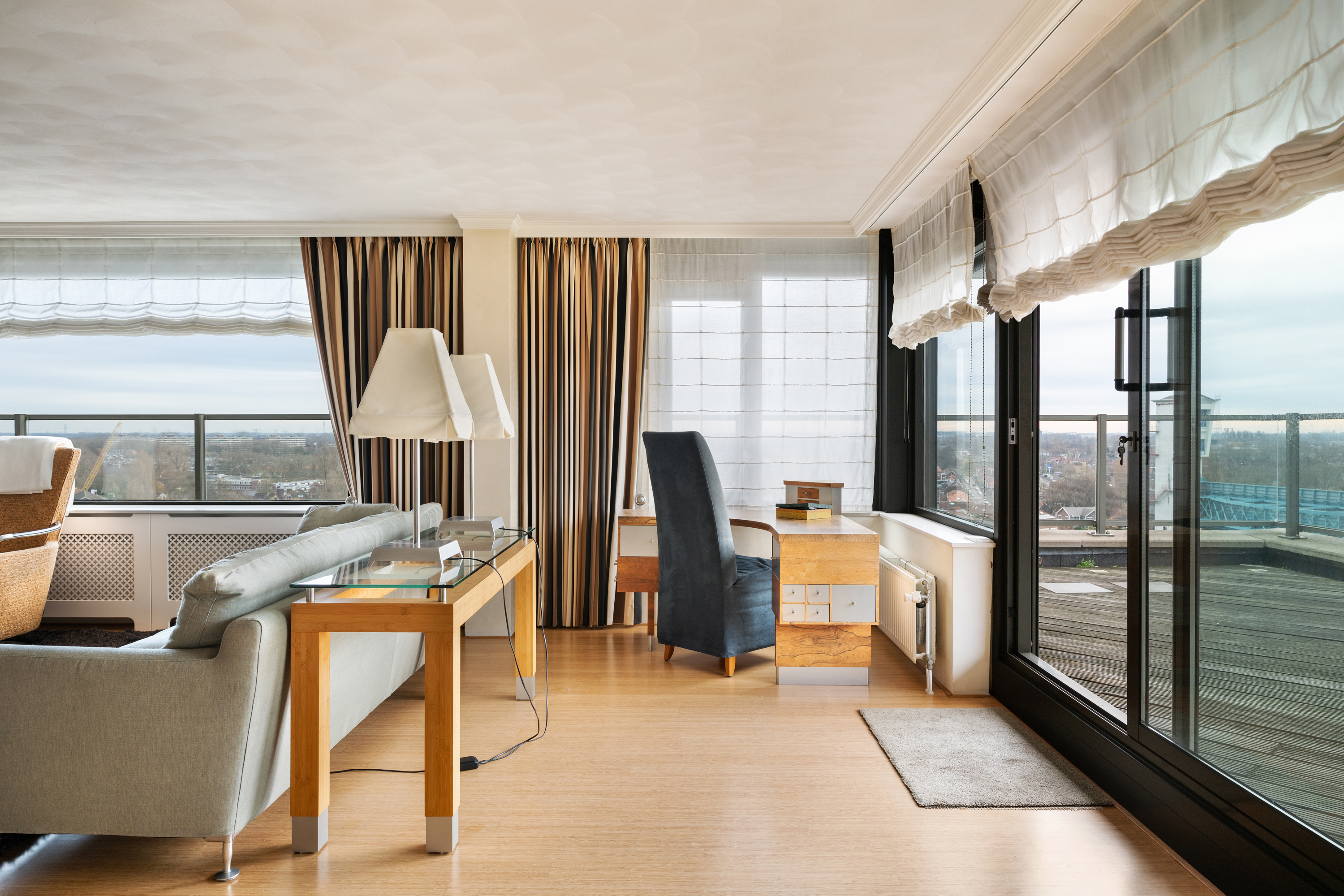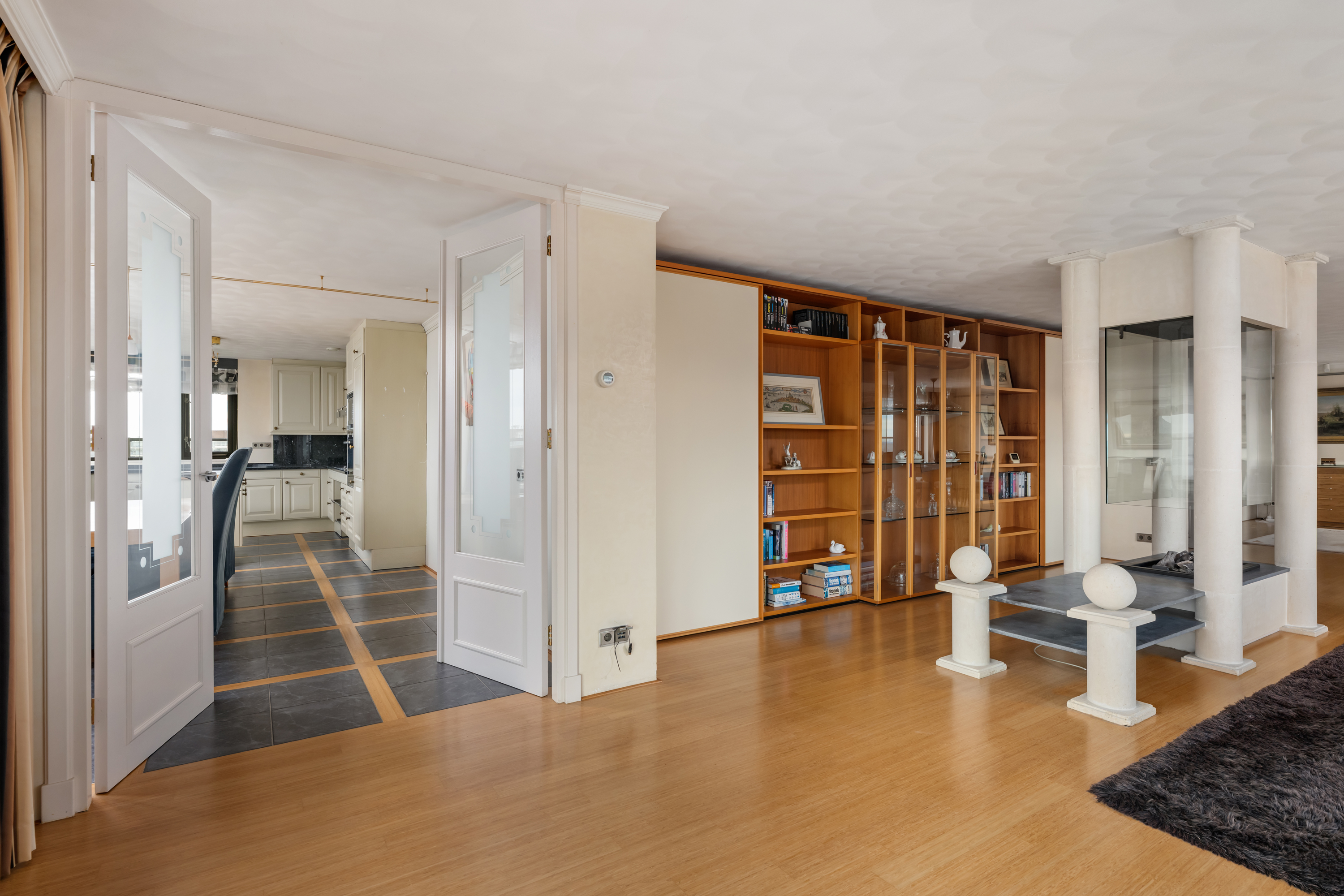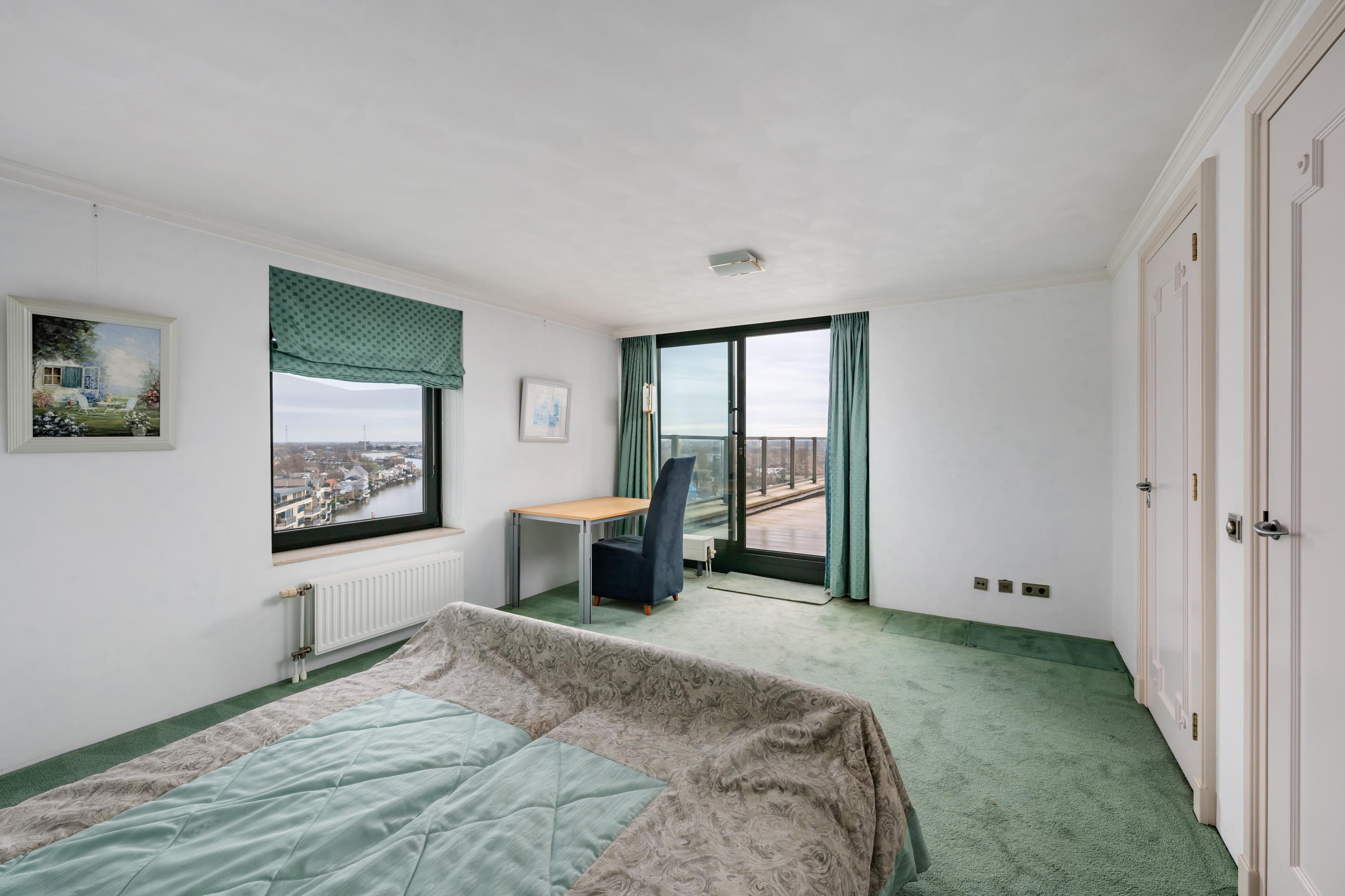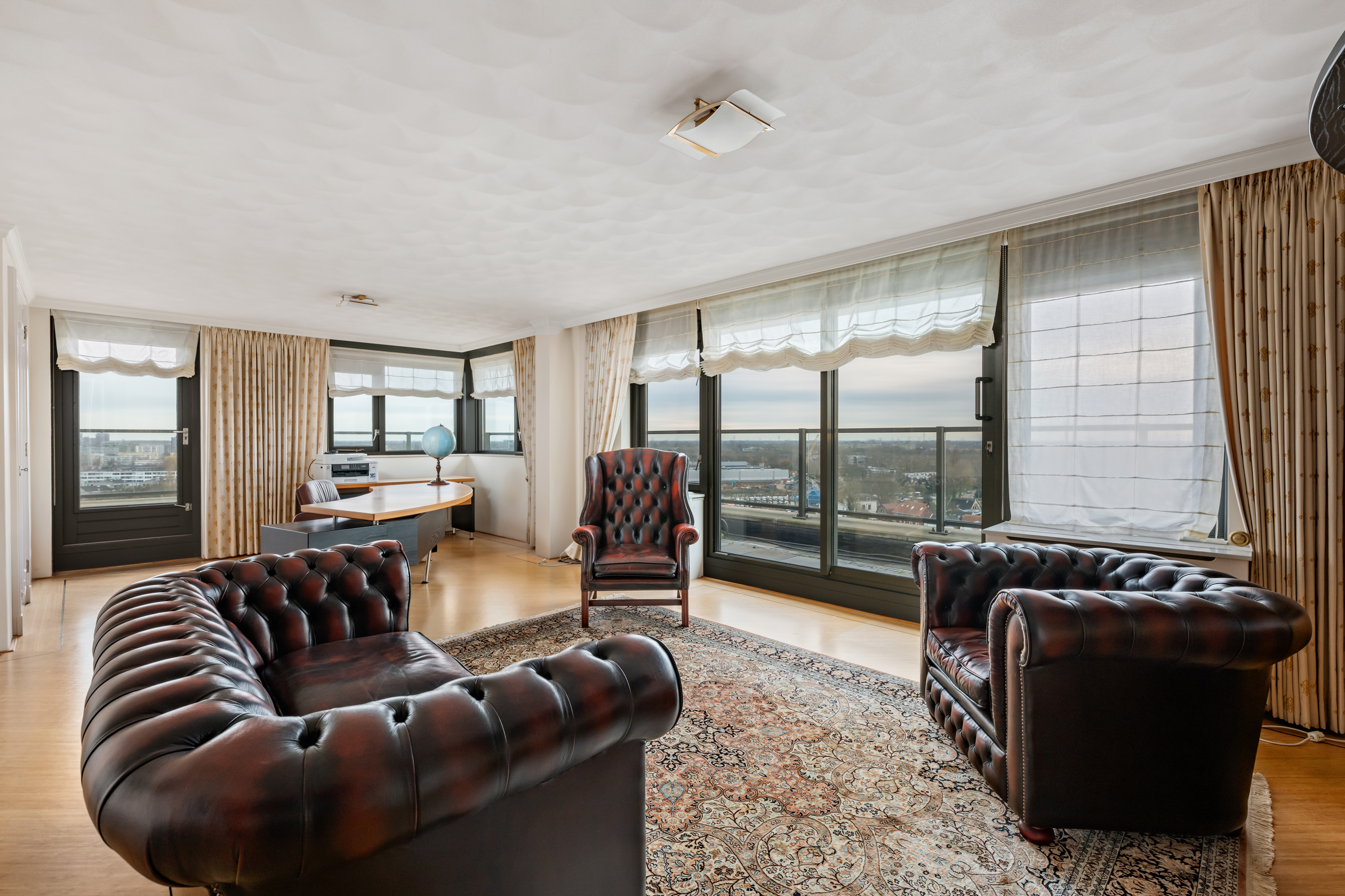 Een waar indrukwekkend penthouse (bijna 370m2 wonen) dat de volledige bovenste etage beslaat en omgeven is door rust, ruimte en panoramisch uitzicht. De woning biedt een imposante living met haard, een stijlvolle bibliotheek/werkkamer, aparte eetkamer en een royale woonkeuken. Met vier ruime slaapkamers is er volop ruimte voor gezin, gasten of werk aan huis. Daarnaast zijn er drie badkamers, een aparte wasruimte en een sfeervolle biljartkamer met klassieke uitstraling.