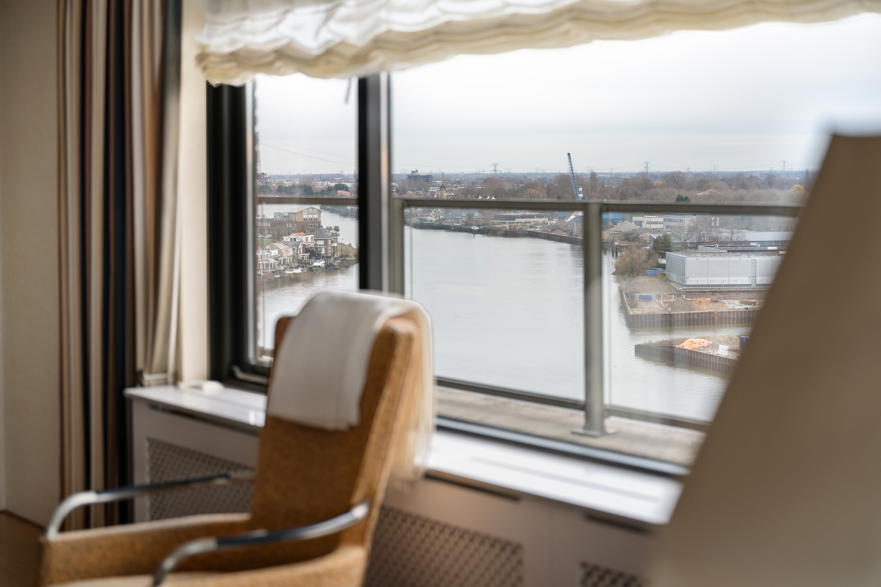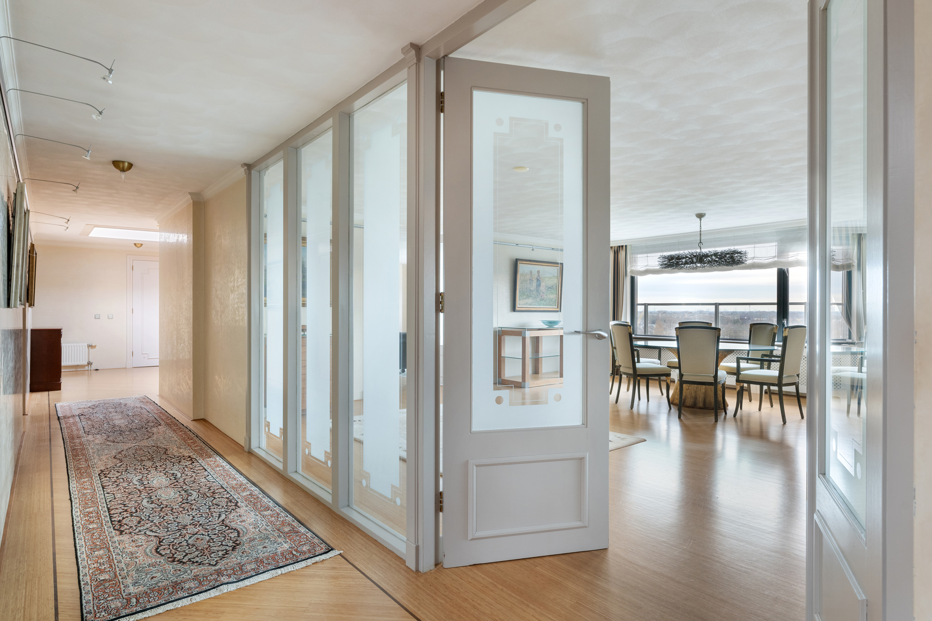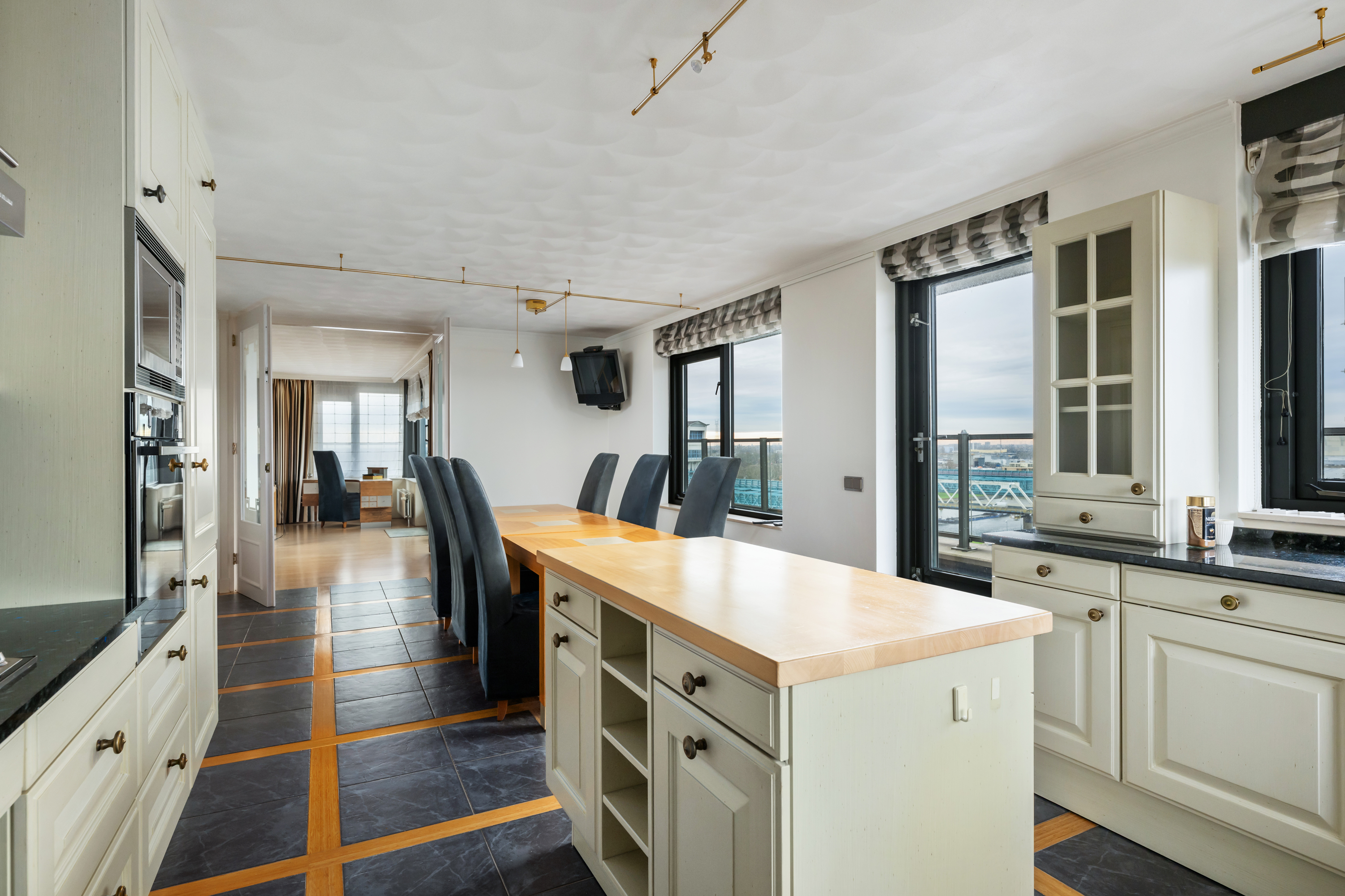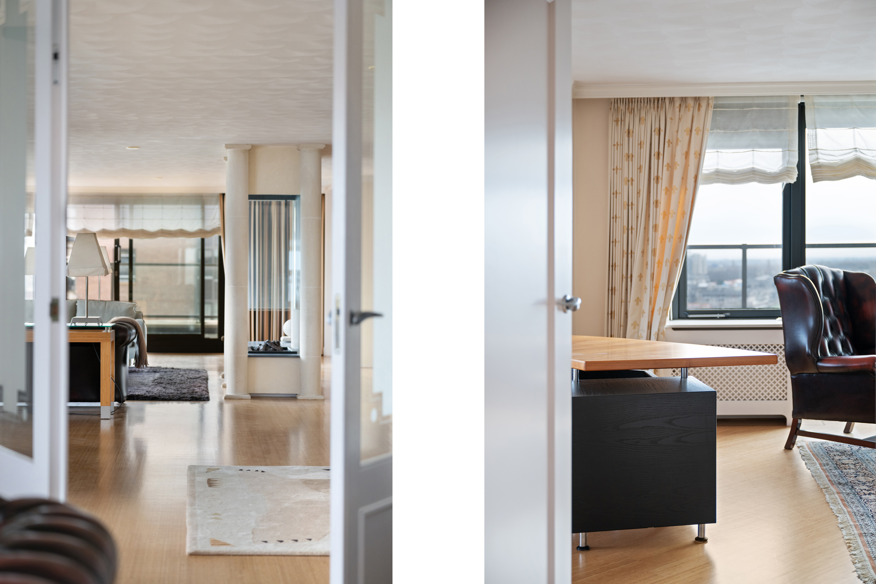 Dit penthouse beslaat de volledige bovenste verdieping van het gebouw. De ontvangst vindt plaats in een royale entree hal met een fijn detail; daglicht vanwege het dakraam. Vanuit deze prettige hal met garderobe, toilet en wasruimte met de installaties trekt de aandacht naar de dubbele deuren welke toegang geven tot een imposante living met open haard en een separate eetkamer met de royale keuken. Dit is een ware leefruimte op zich en voorzien van klassieke kastfronten, zwart natuurstenen werkblad en volop ruimte voor een grote eettafel. De grote raampartijen in de woonkamer laten een zee van daglicht binnen en vanuit vrijwel elke hoek geniet u van een panoramisch uitzicht over de rivier, de stad en het groen van de omliggende wijken. Aan de woonkamer is momenteel de riante werkkamer gesitueerd ook weer met toegang tot het terras.