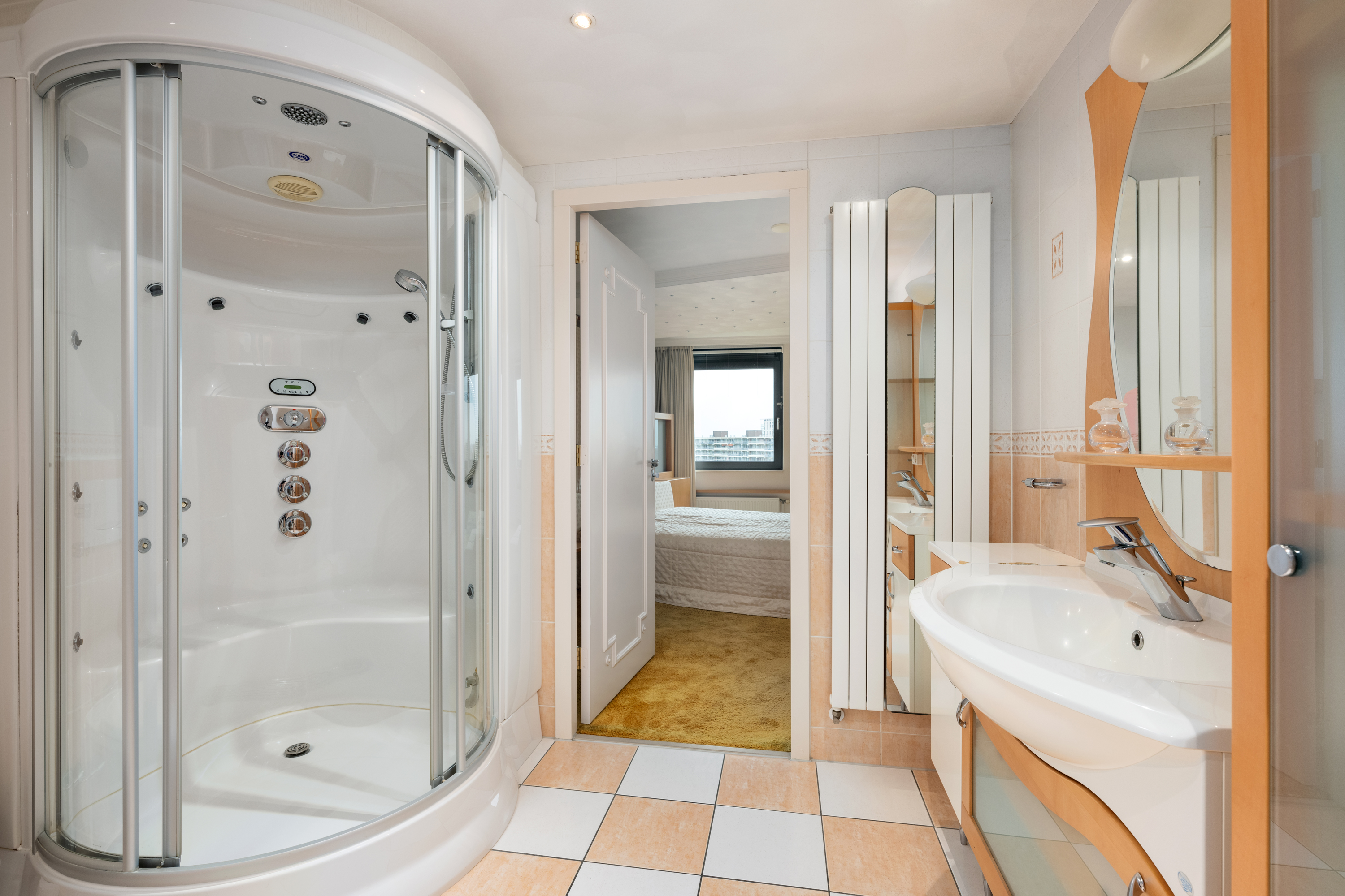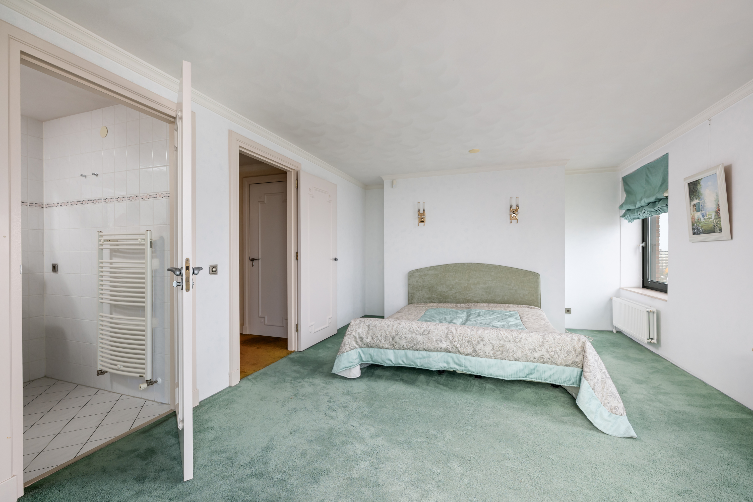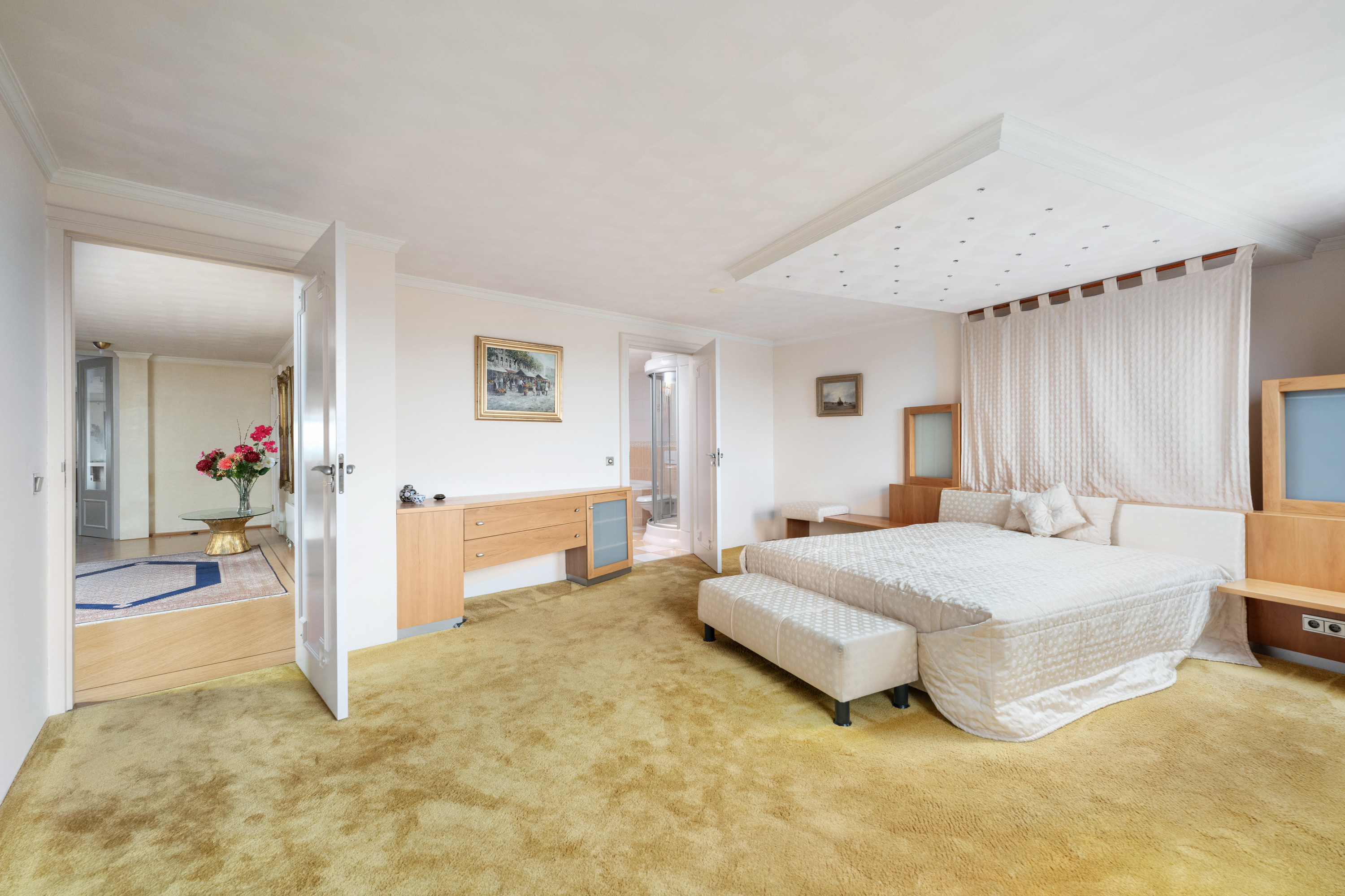 De “master” slaapkamer welke vanuit de hal bereikbaar is, is zeer royaal van opzet. Bijzonder is ook de zeer riante walk-in closet, een volledig ingerichte kleedruimte die aanvoelt als een luxe boetiek, met op maat gemaakte kasten, ingebouwde verlichting en overvloedige opbergruimte voor kleding, accessoires en meer. Vanuit de slaapkamer loopt u bovendien zo door naar de aangrenzende badkamer, wat deze vleugel tot een waar privéverblijf maakt.
