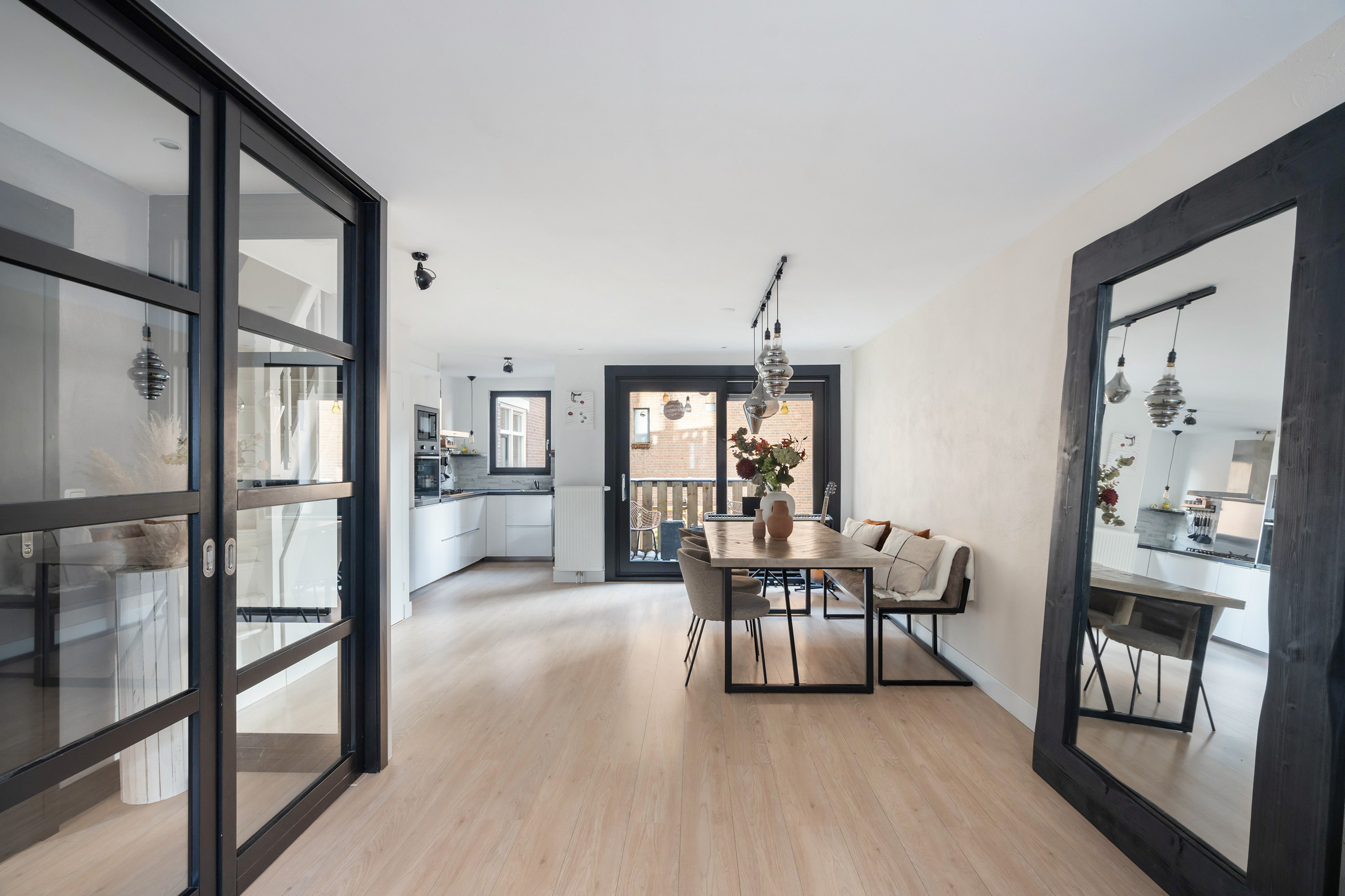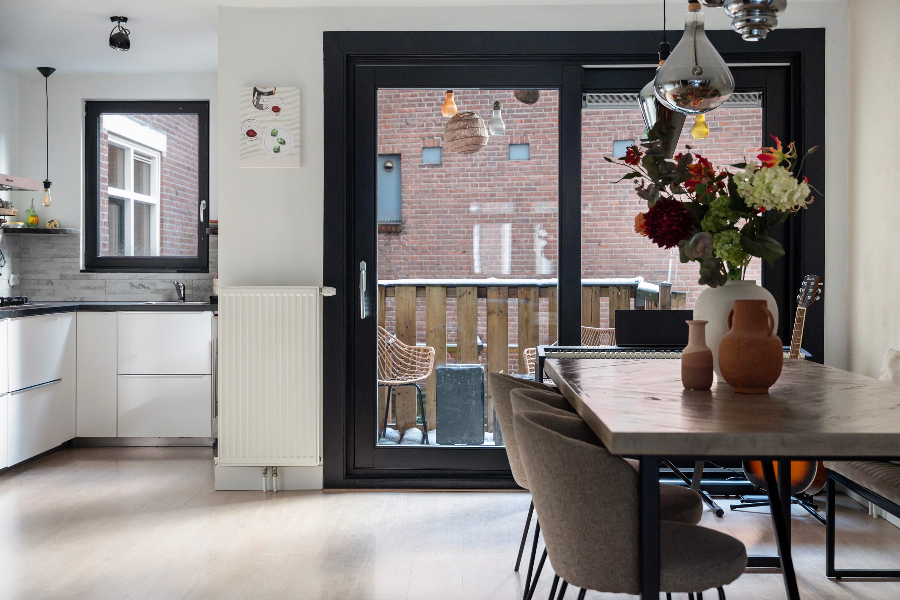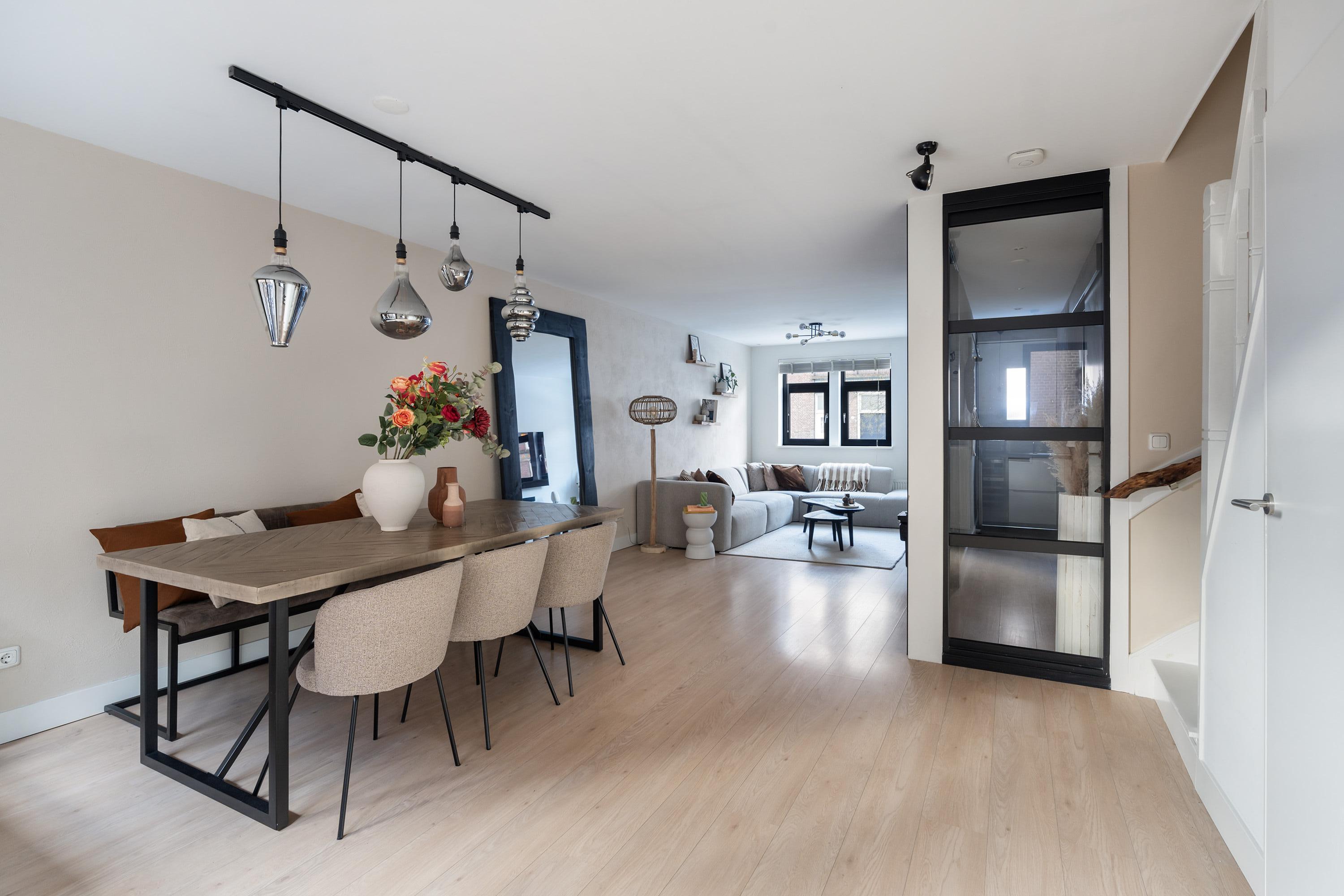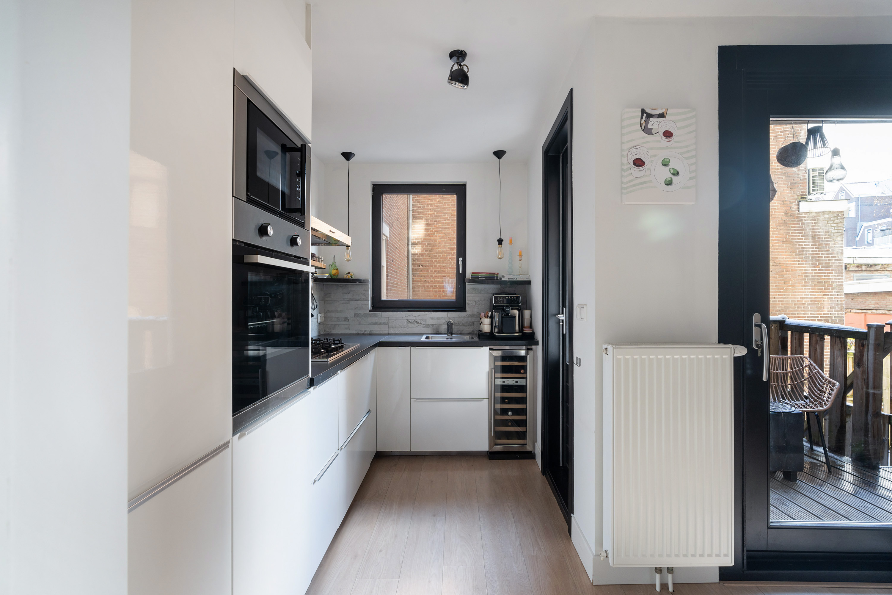 Via de entree kom je binnen op de lichte en ruime woonverdieping waar wonen, koken en eten mooi in elkaar overlopen. De moderne staal look deuren geven direct een stijlvolle eerste indruk. De woonkamer voelt open en uitnodigend aan en dankzij de grote raampartijen valt er veel natuurlijk licht naar binnen. De open keuken is modern uitgevoerd en van alle gemakken voorzien, waaronder een magnetron, oven, gas kookplaat, afzuigkap, vaatwasser en een wijn klimaatkast. De keuken is prettig gepositioneerd ten opzichte van de eetruimte en vormt het hart van de woning. Via de strakke schuifpui uit 2022 stap je zo het balkon op, gelegen op het zuidwesten. Een heerlijke plek voor een kop koffie in de zon of een borrel aan het einde van de dag. Vanaf het balkon leidt een trapje direct naar de achtertuin. Ook deze is gelegen op het zuidwesten en biedt volop privacy en zon. Een fijne buitenruimte waar je midden in de stad heerlijk kunt genieten.