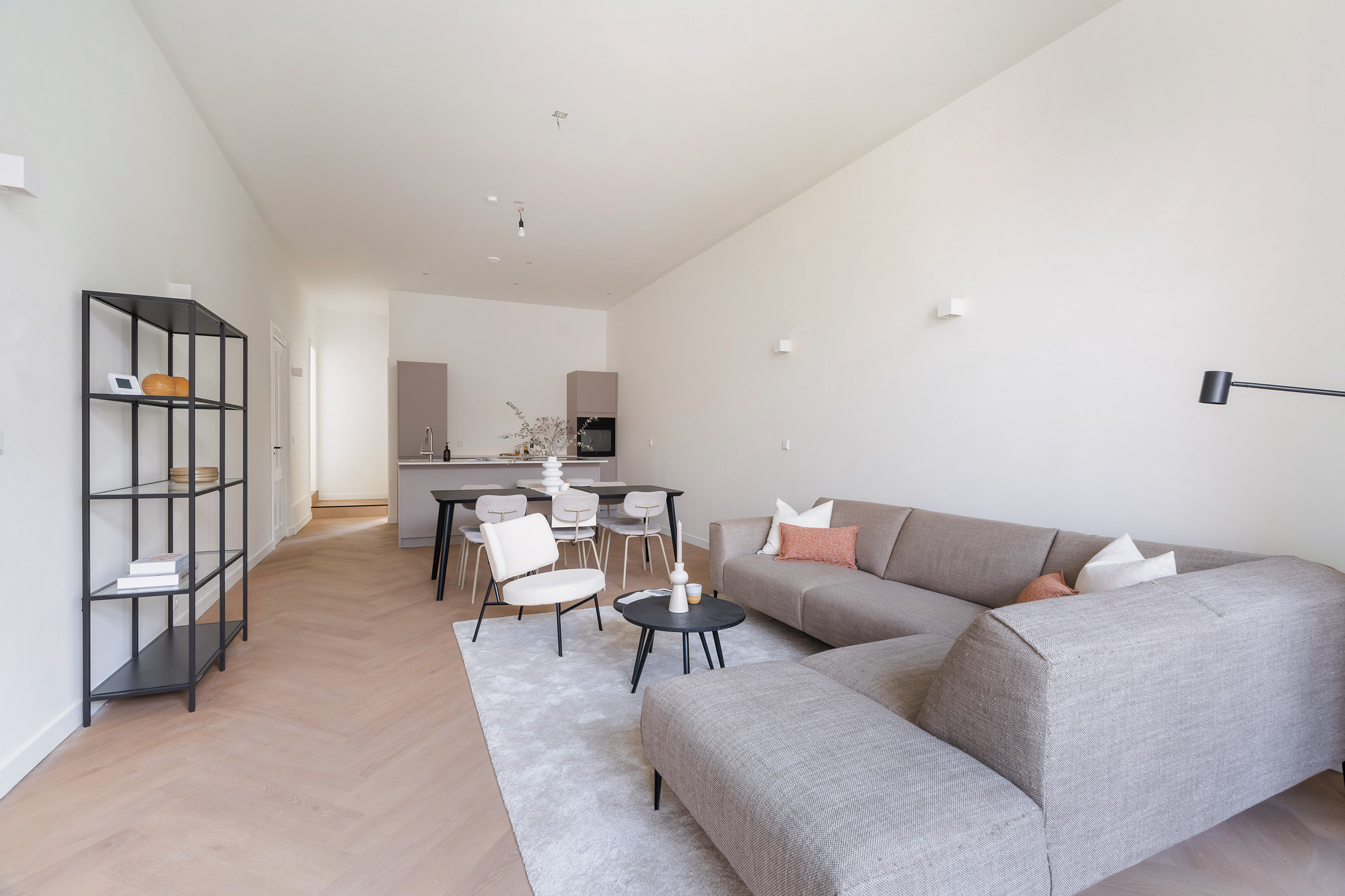 Eenmaal boven stap je de gloednieuwe woning binnen in een hal die toegang biedt tot verschillende vertrekken. We starten in de lichte en ruime woonkamer aan de achterzijde van de woning met grote raampartijen aan de achterzijde, hoge plafonds en een prettig uitzicht. De prachtige visgraat vloer, strakke wanden en moderne afwerking geven direct een luxe gevoel. De ruimte biedt volop mogelijkheden voor een comfortabele zithoek én een grote eettafel.