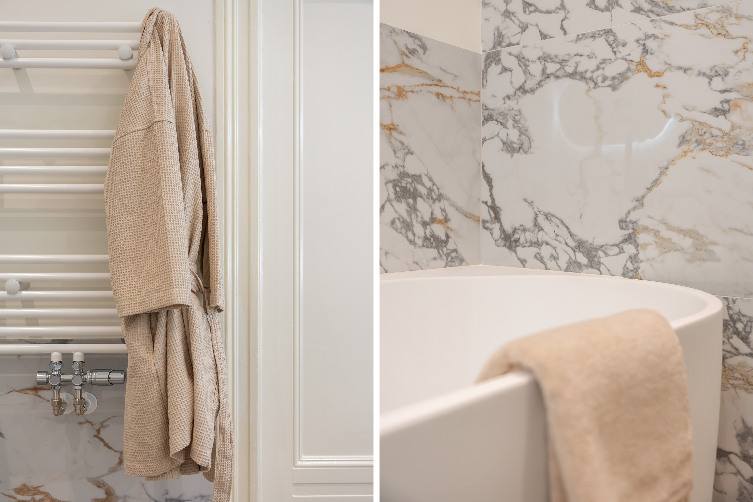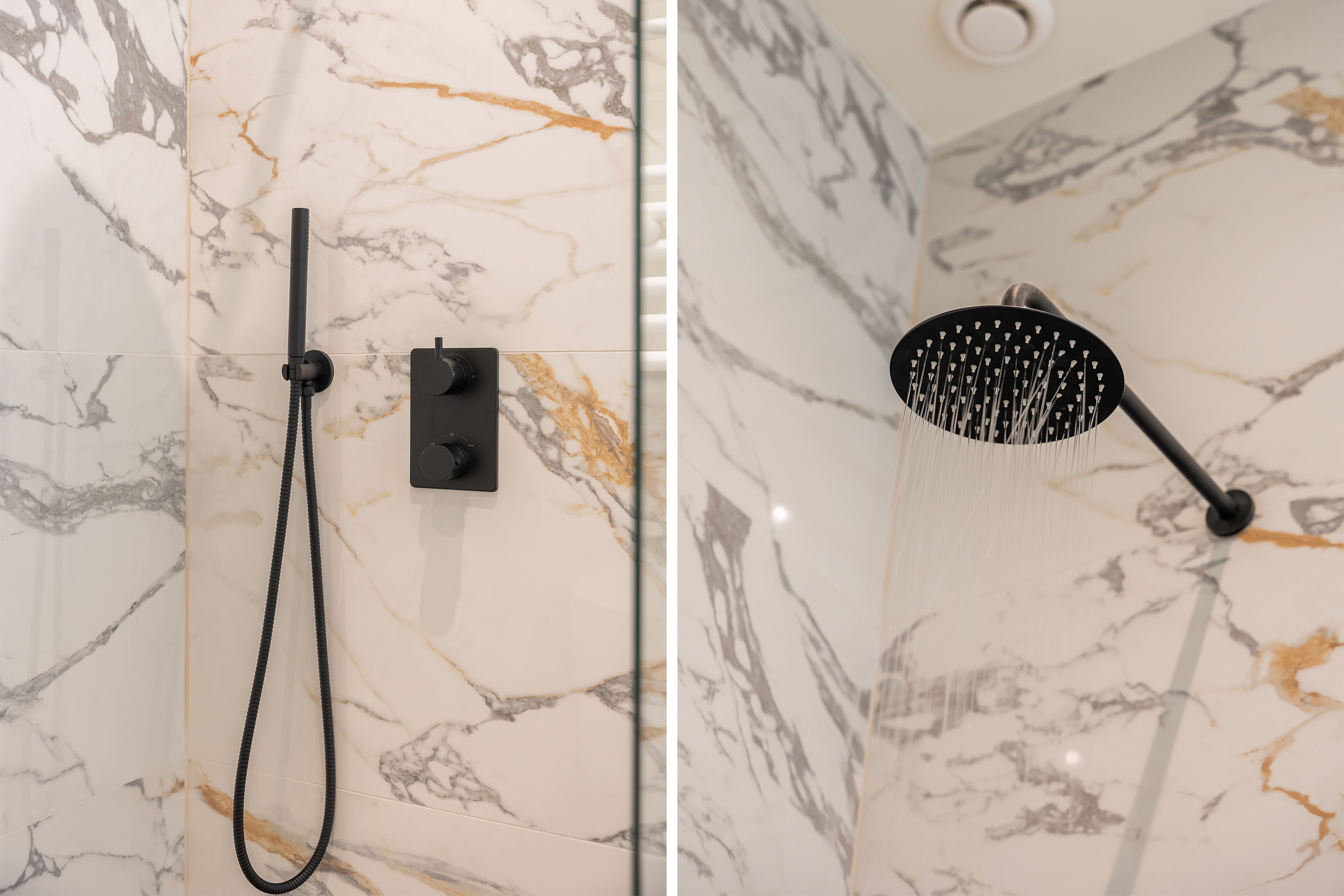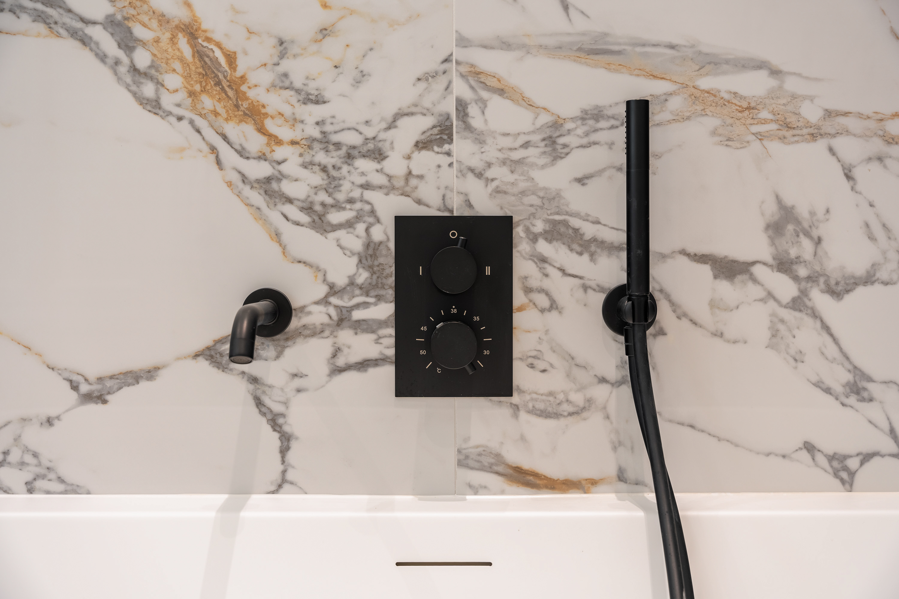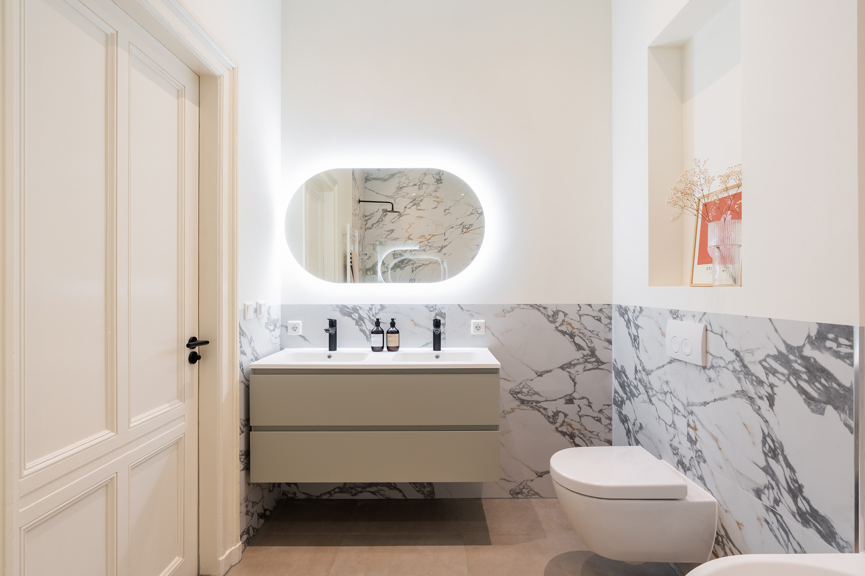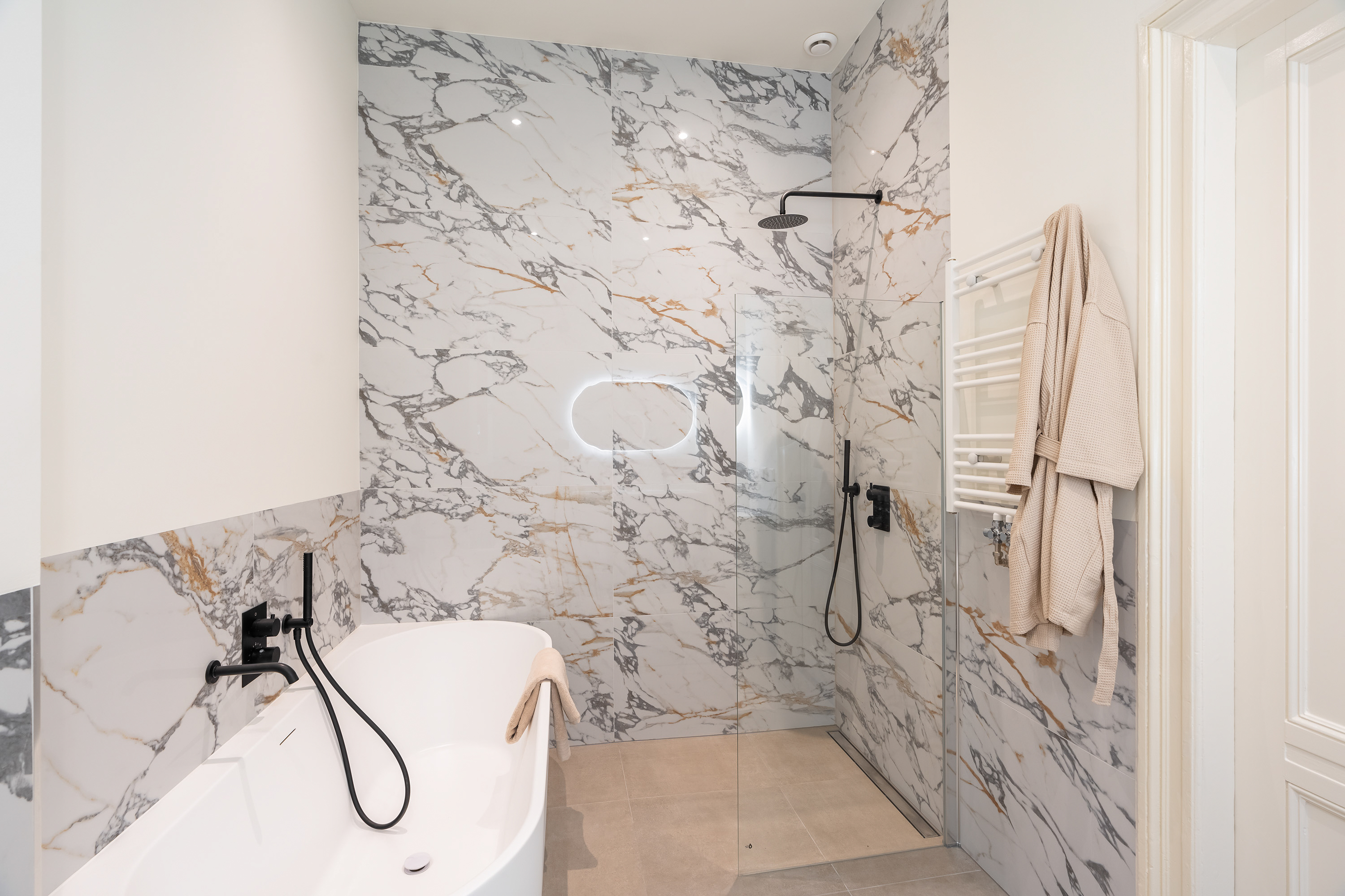 De badkamer is een absolute eyecatcher: strak, modern en zeer compleet. Je vindt hier een ligbad, een ruime inloopdouche met glazen wand, een dubbel wastafelmeubel met spiegel én een toilet. Alles is nieuw, hoogwaardig afgewerkt en tot in de puntjes verzorgd, alsof je een luxe hotel binnenstapt.
