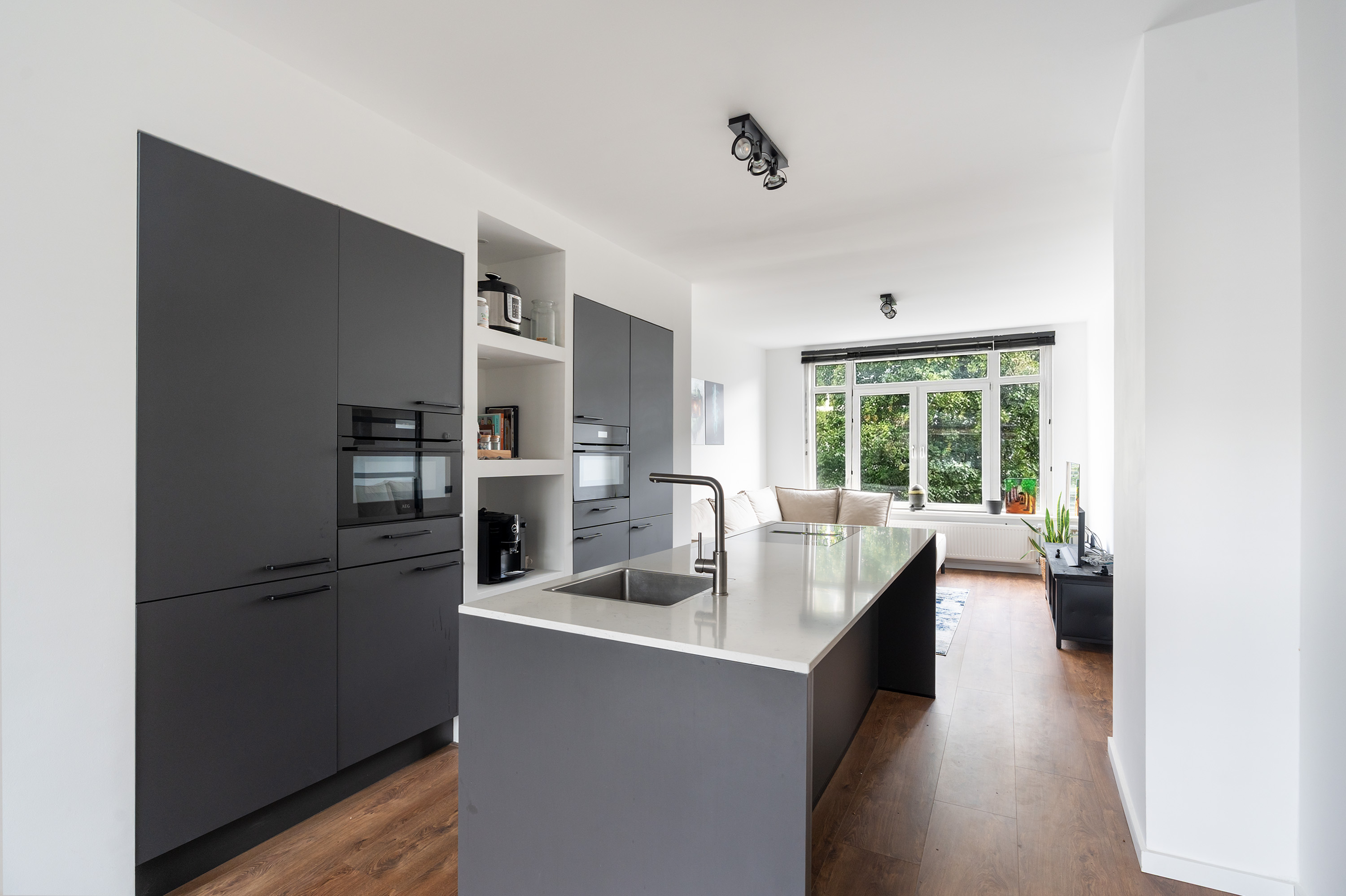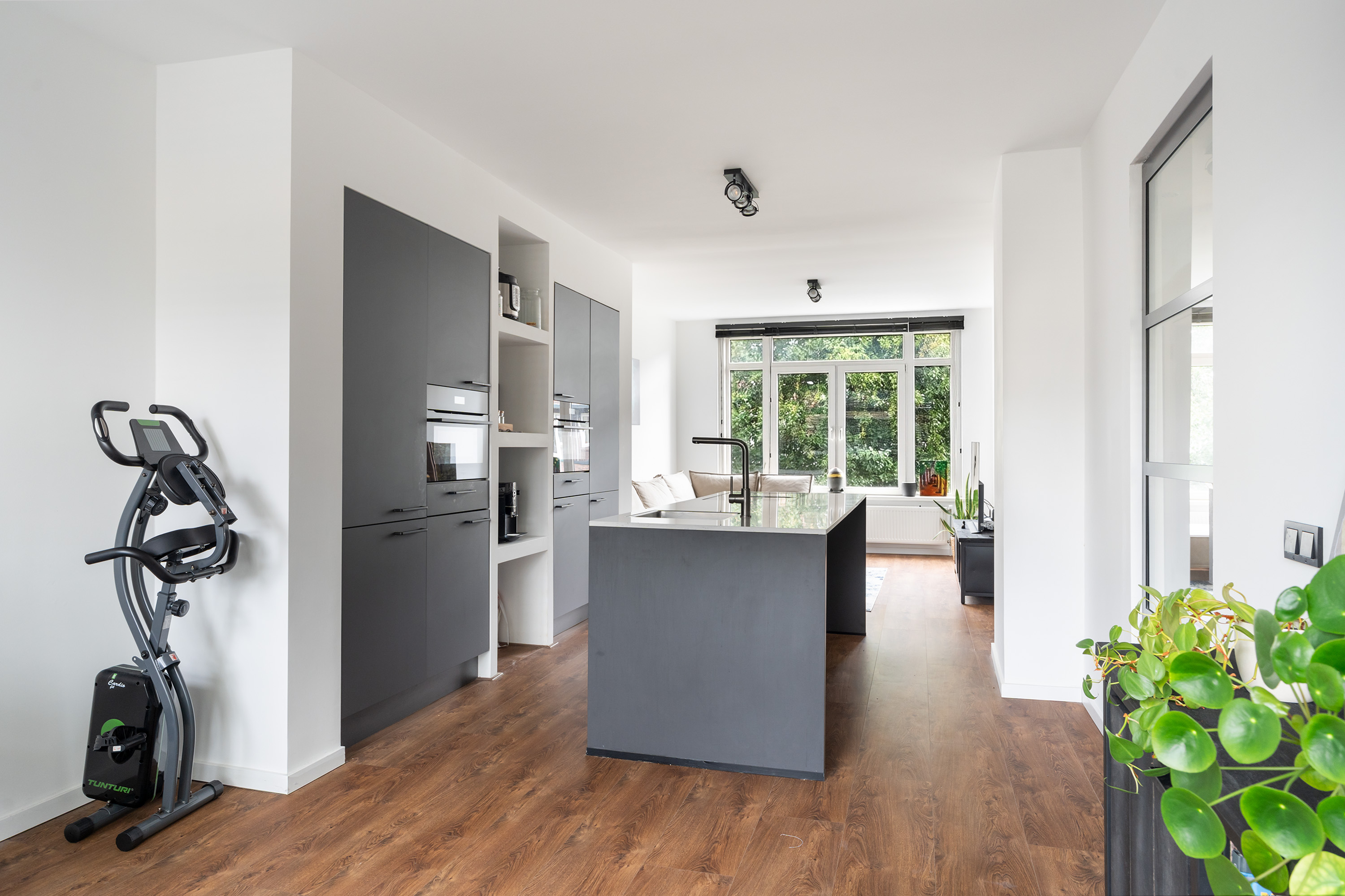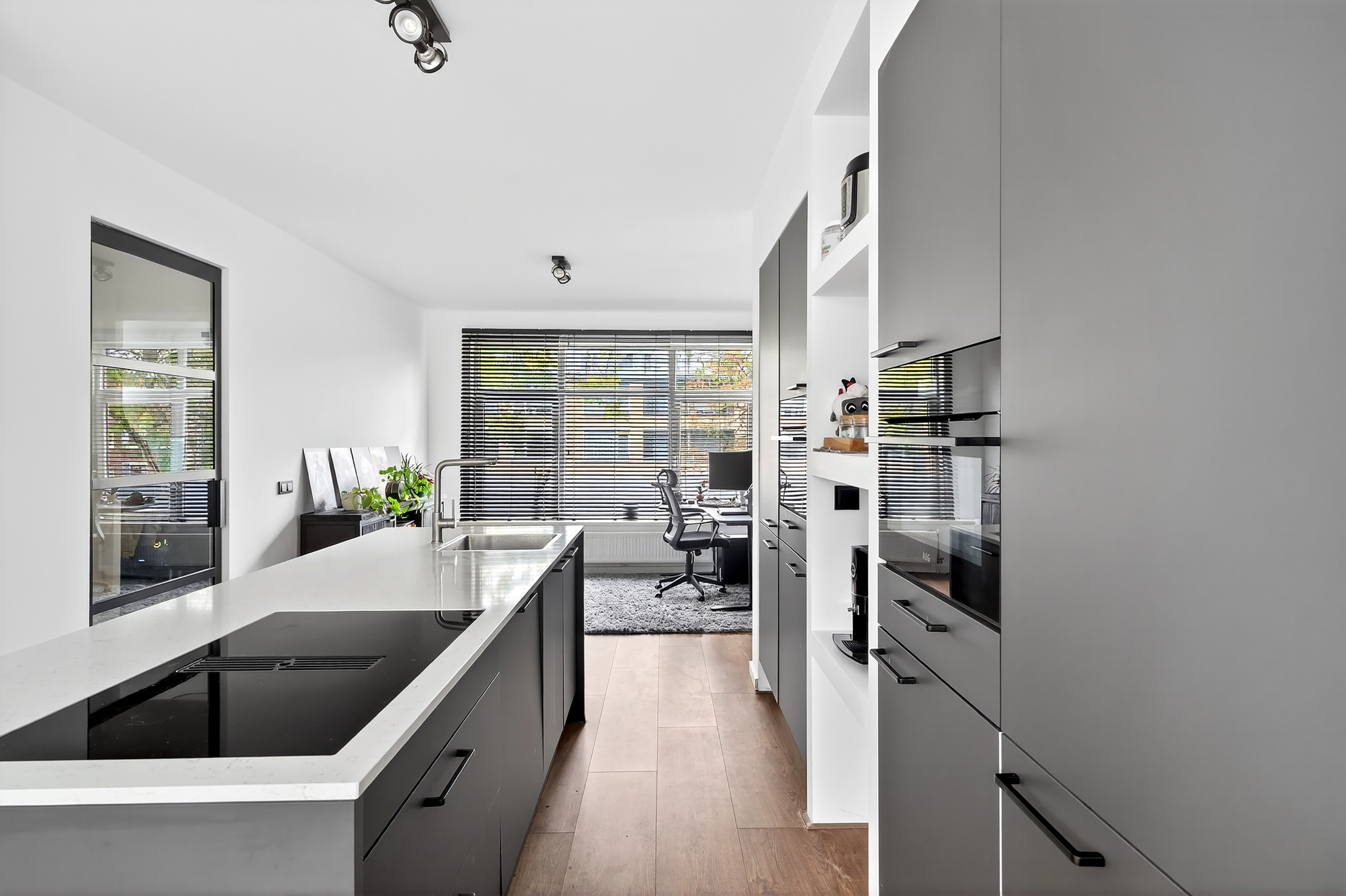 Aan de achterzijde is de lichte woonkamer gelegen met grote raampartijen die uitkijken op het groen. De open keuken is een absolute blikvanger en een droom voor de kookliefhebber. Centraal in de ruimte prijkt een imposant kookeiland met wit composieten werkblad welke het culinaire en sociale middelpunt vormt. De symmetrische kastenwand is voorzien van hoogwaardige inbouwapparatuur waaronder een koel-/vriescombinatie, een combi oven en magnetron. Open nissen zorgen voor een speels accent en bieden ruimte aan je favoriete kookboeken en koffiemachine. Aan de voorzijde van de woning, waar zich nu een werkplek bevindt, is meer dan voldoende ruimte voor het creëren van een sfeervolle eethoek.