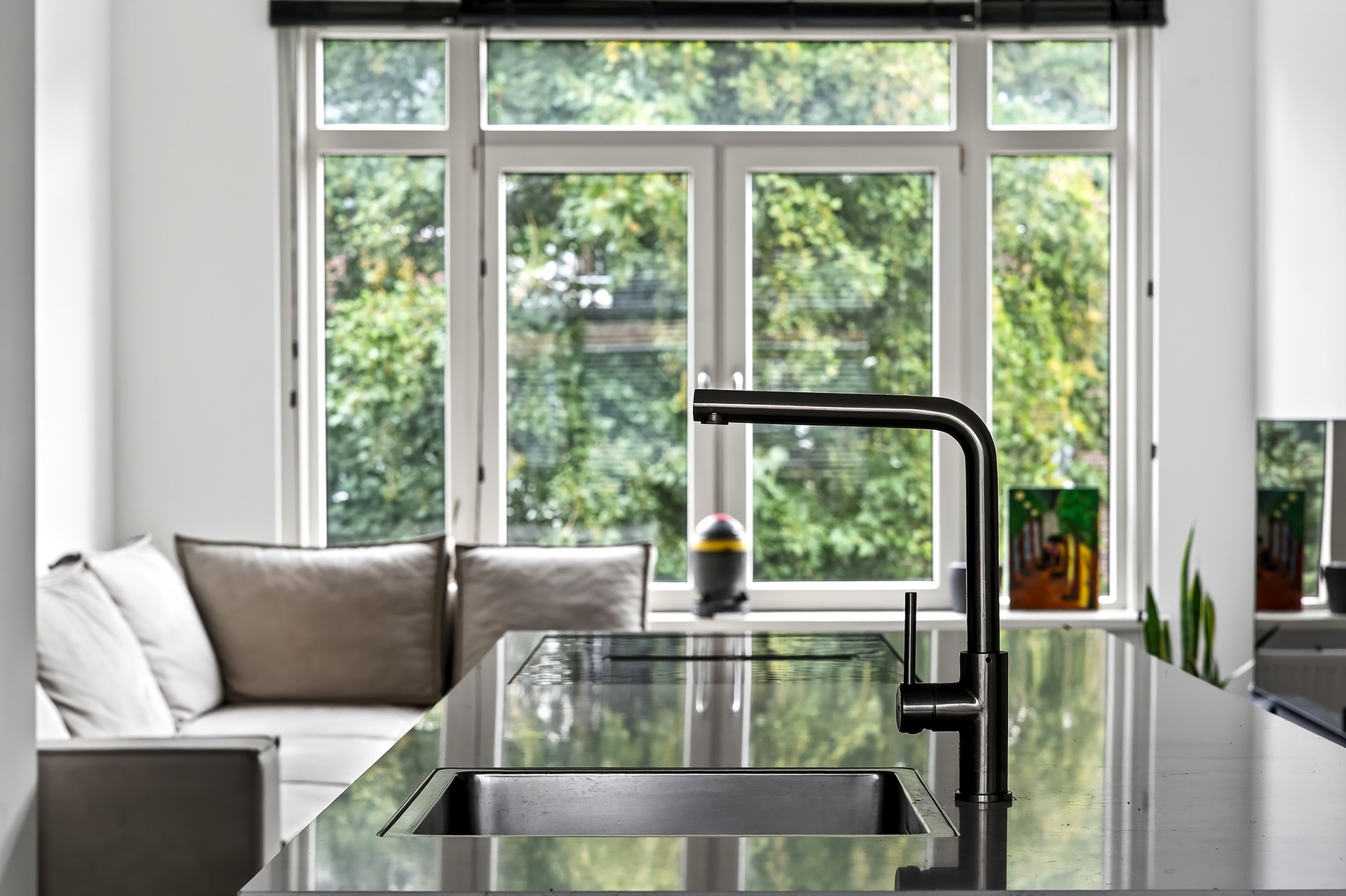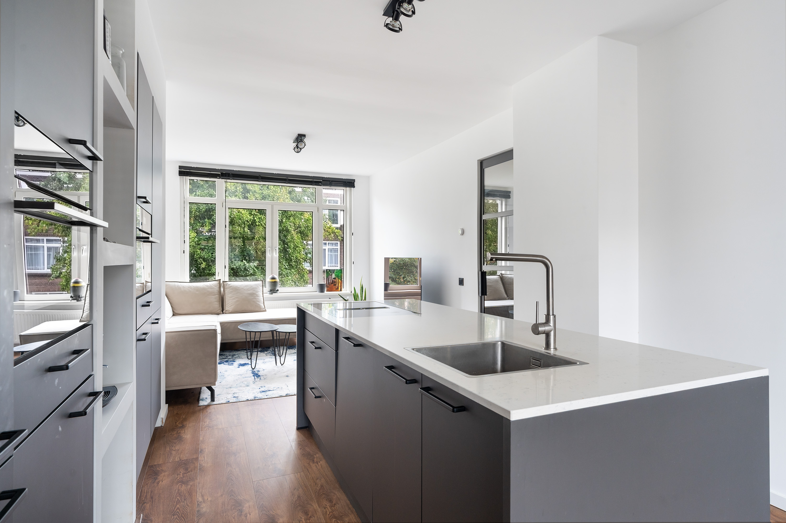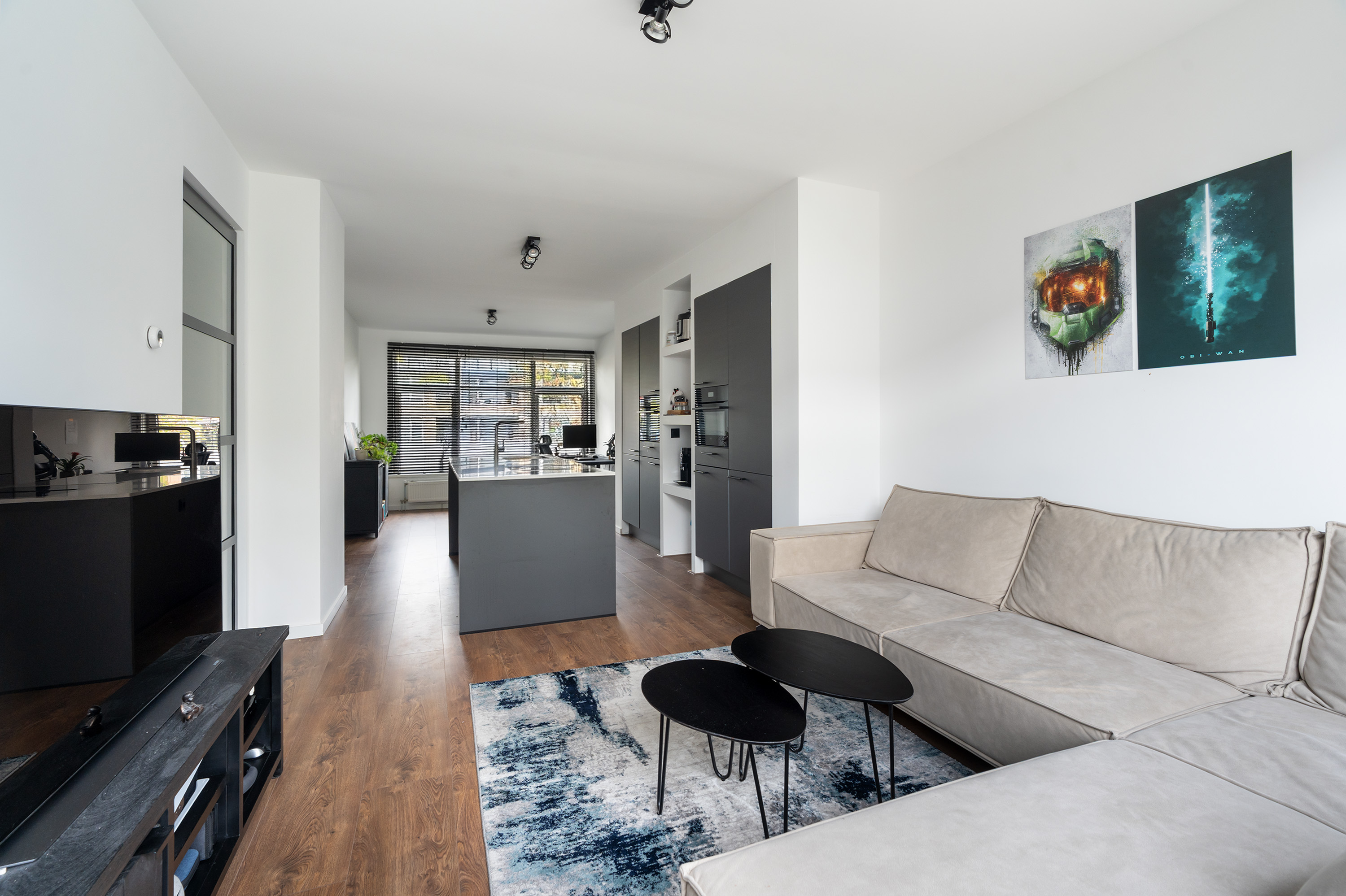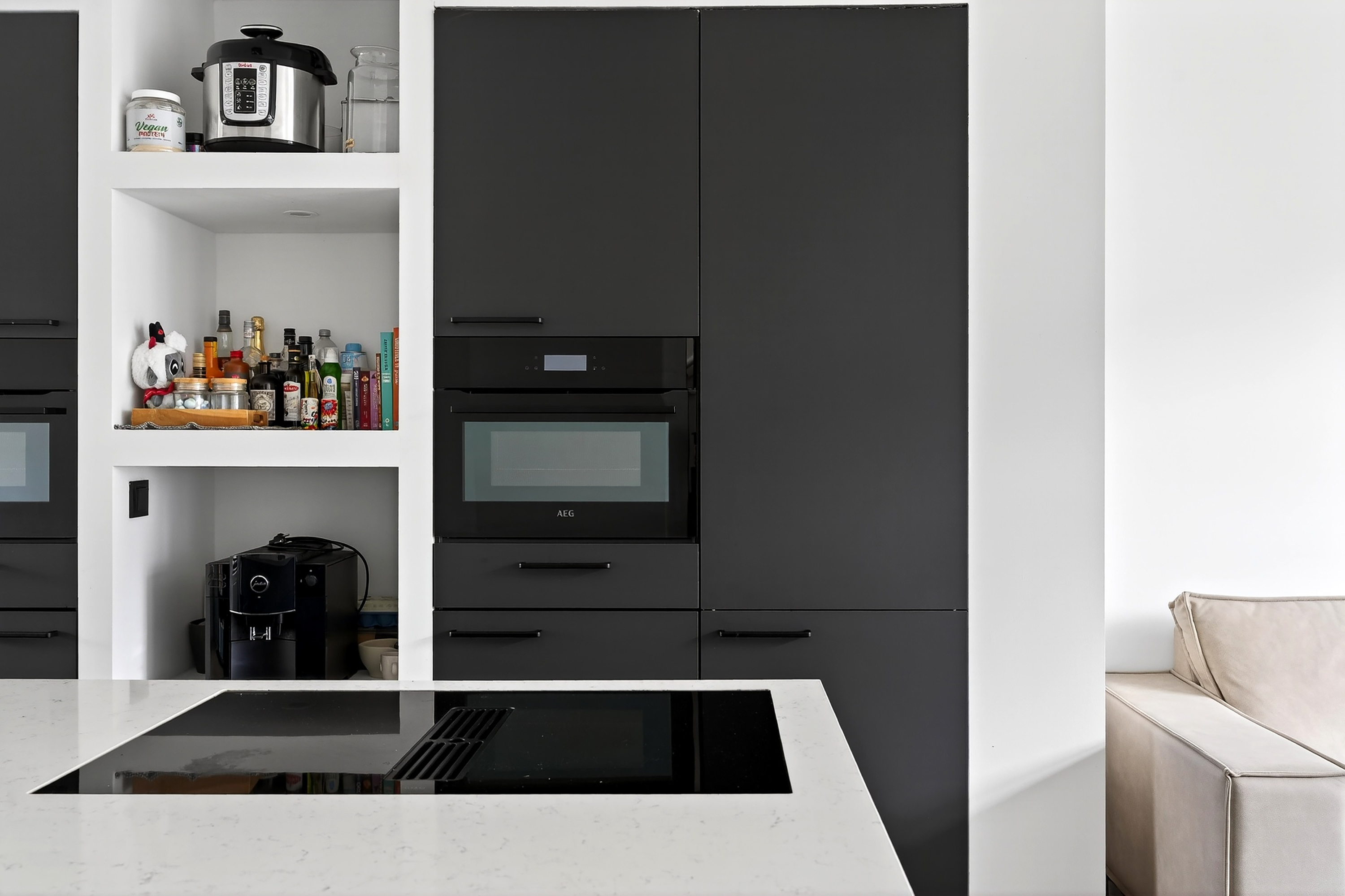 Aan de achterzijde is de lichte woonkamer gelegen met grote raampartijen die uitkijken op het groen. De open keuken is een absolute blikvanger en een droom voor de kookliefhebber. Centraal in de ruimte prijkt een imposant kookeiland met wit composieten werkblad welke het culinaire en sociale middelpunt vormt. De symmetrische kastenwand is voorzien van hoogwaardige inbouwapparatuur waaronder een koel-/vriescombinatie, een combi oven en magnetron. Open nissen zorgen voor een speels accent en bieden ruimte aan je favoriete kookboeken en koffiemachine. Aan de voorzijde van de woning, waar zich nu een werkplek bevindt, is meer dan voldoende ruimte voor het creëren van een sfeervolle eethoek.