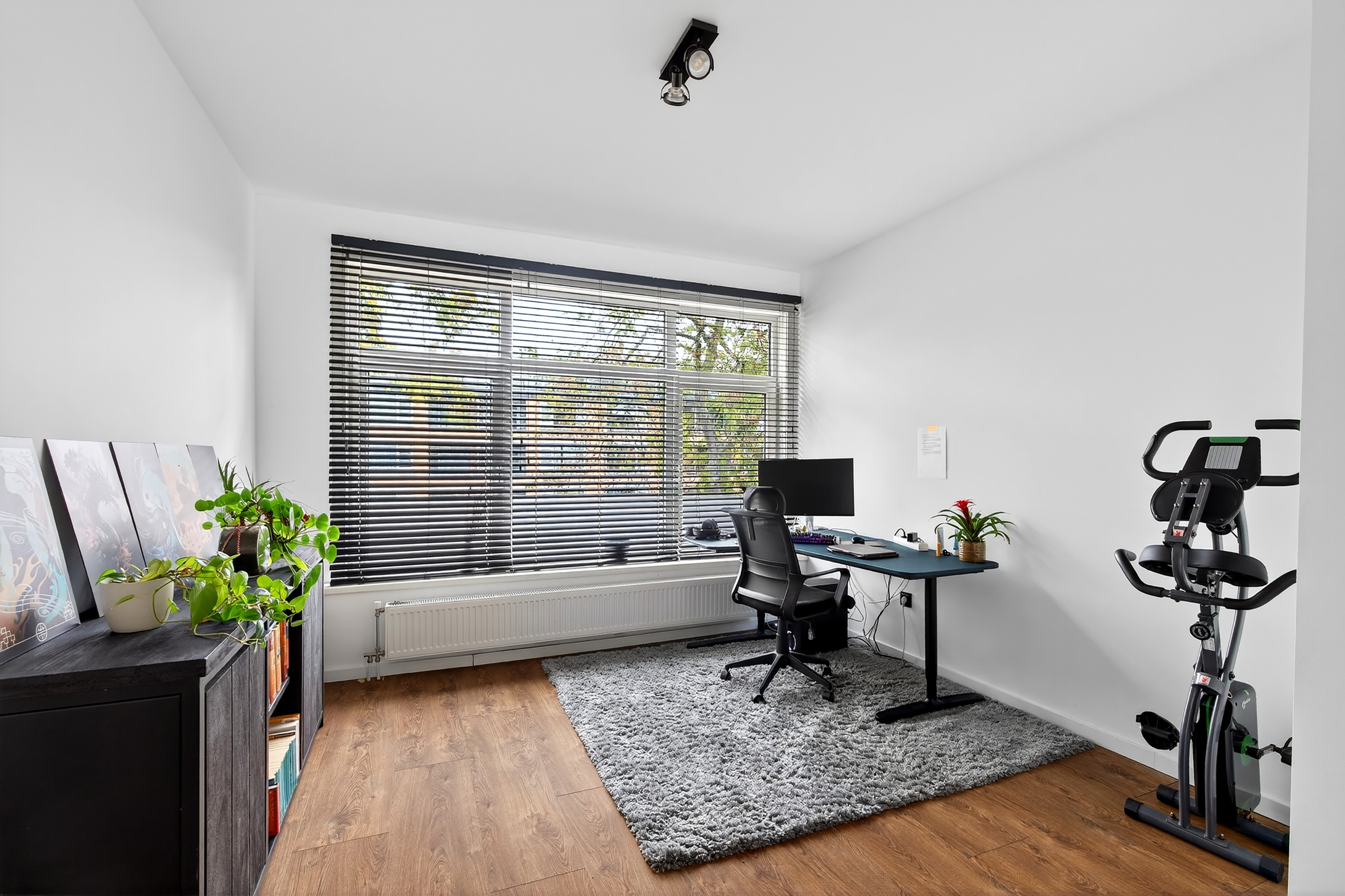 De tweede slaapkamer leent zich perfect als kinderkamer, logeerkamer of, zoals nu in gebruik,