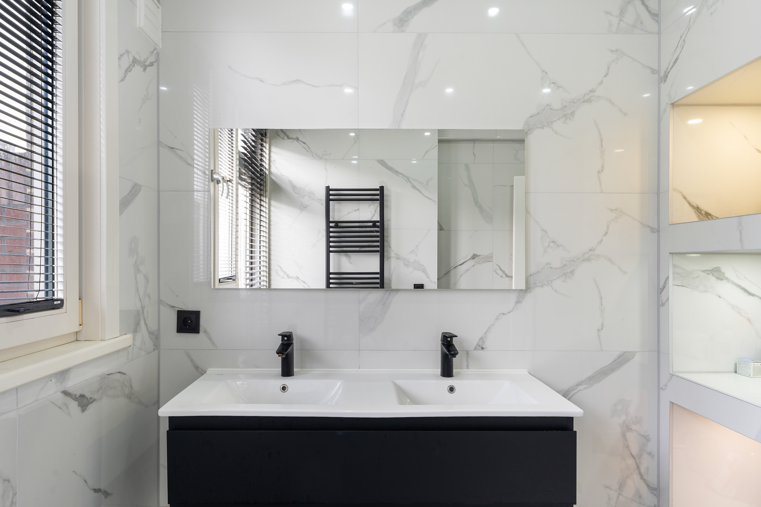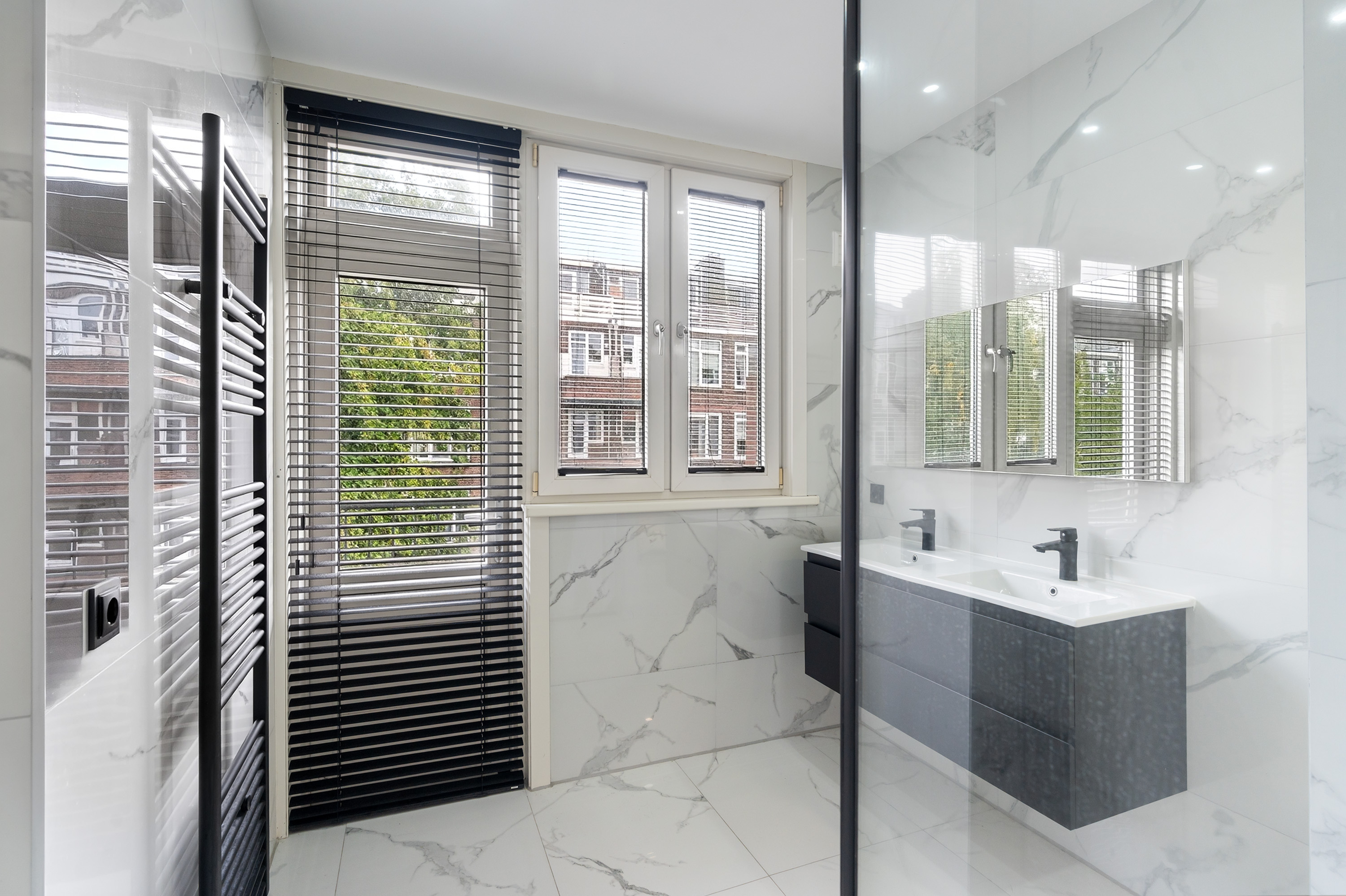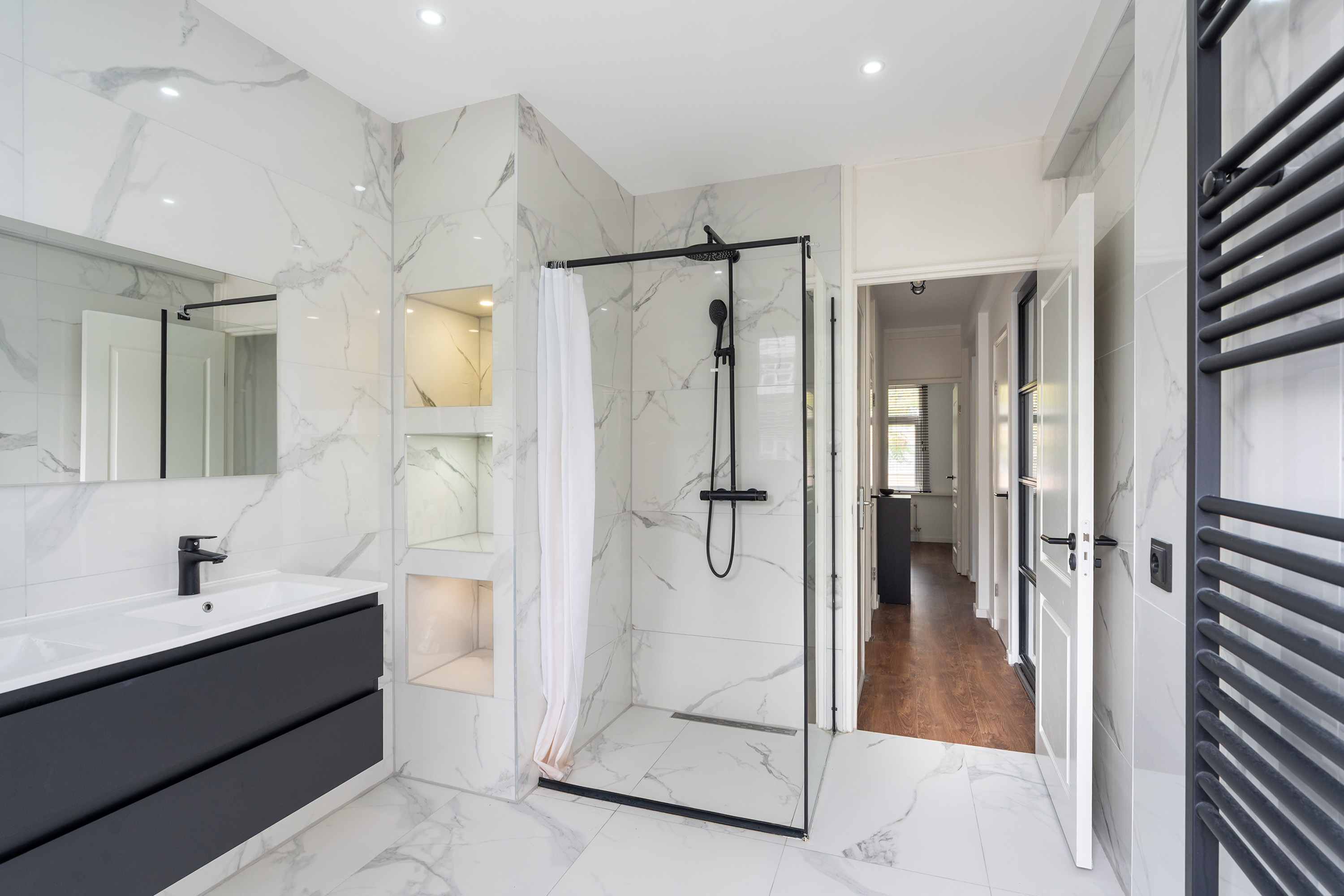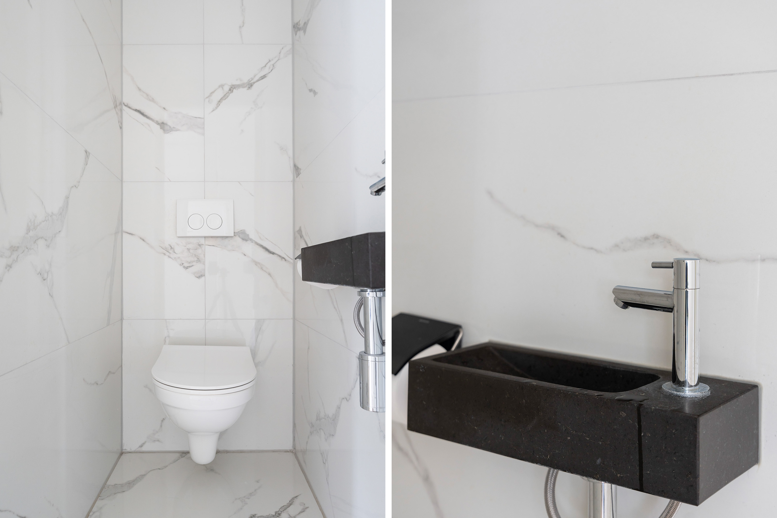 De recent vernieuwde badkamer is groot van opzet met een tijdloze marmeren tegelafwerking, dubbele wastafel met stijlvol meubel, een royale inloopdouche met zwarte accenten, een design radiator en een geïntegreerde nis met verlichting. Aangrenzend is het separate toilet, uitgevoerd in dezelfde hoogwaardige stijl. Je hebt hier ook toegang tot één van de balkons.