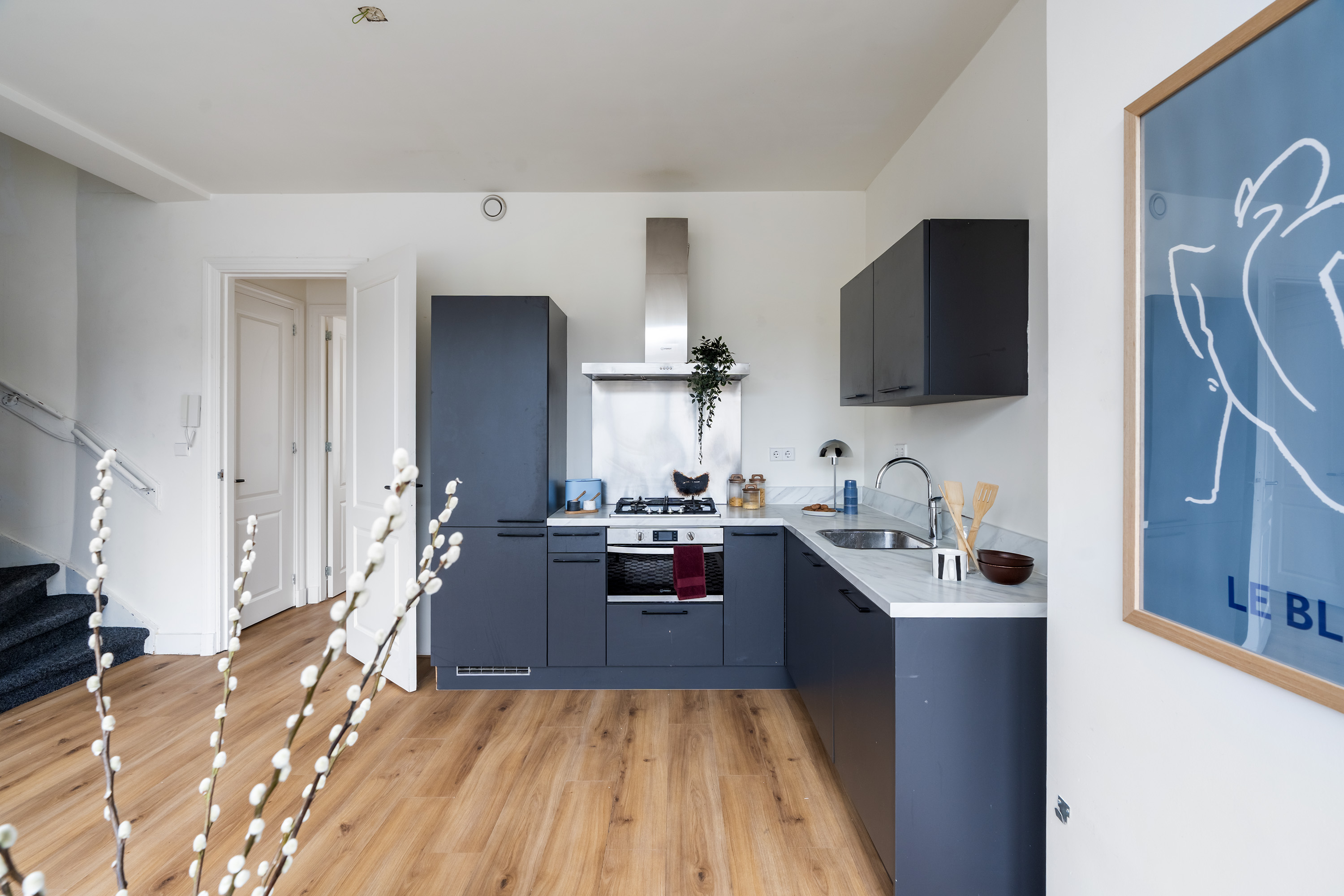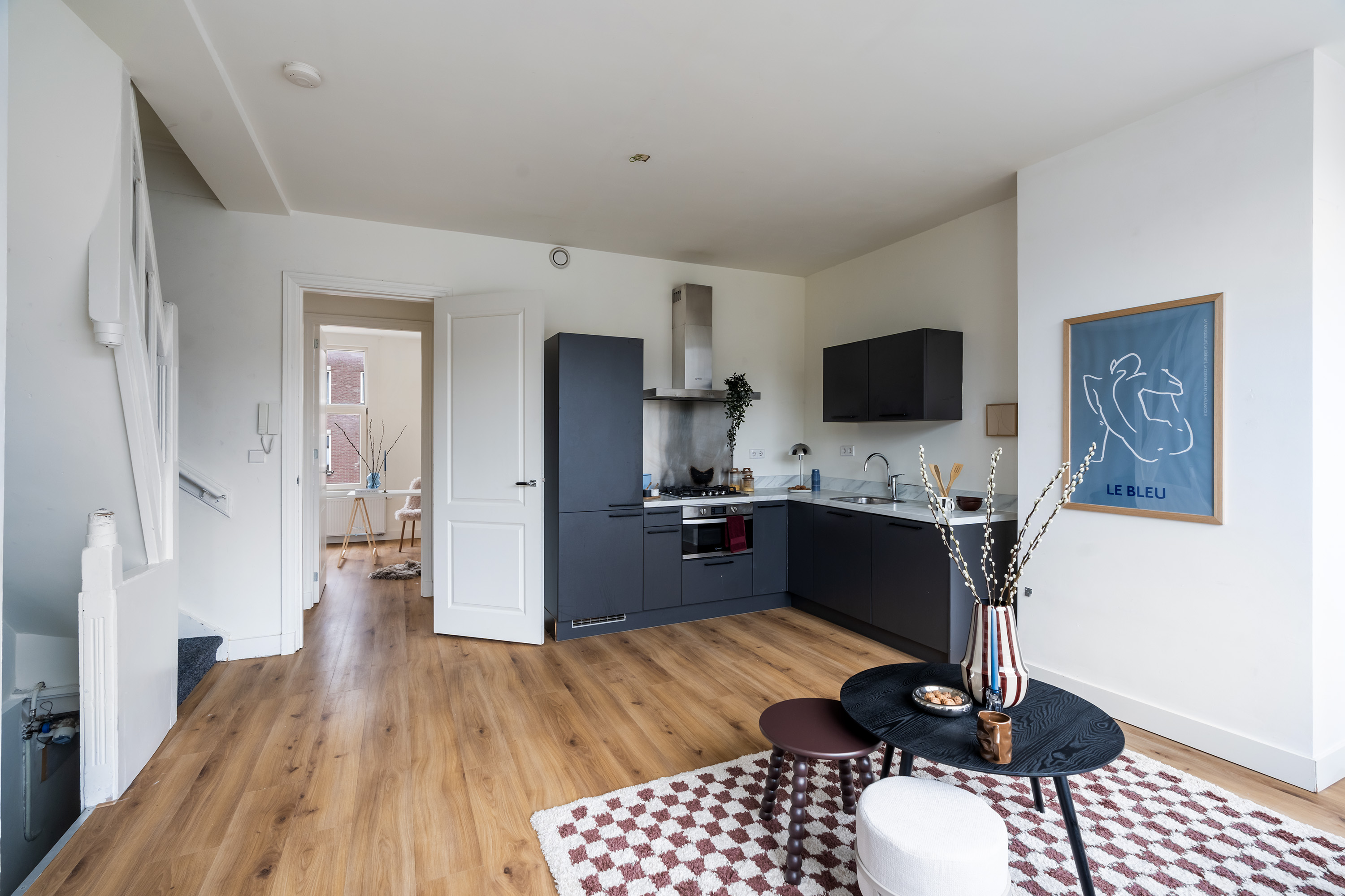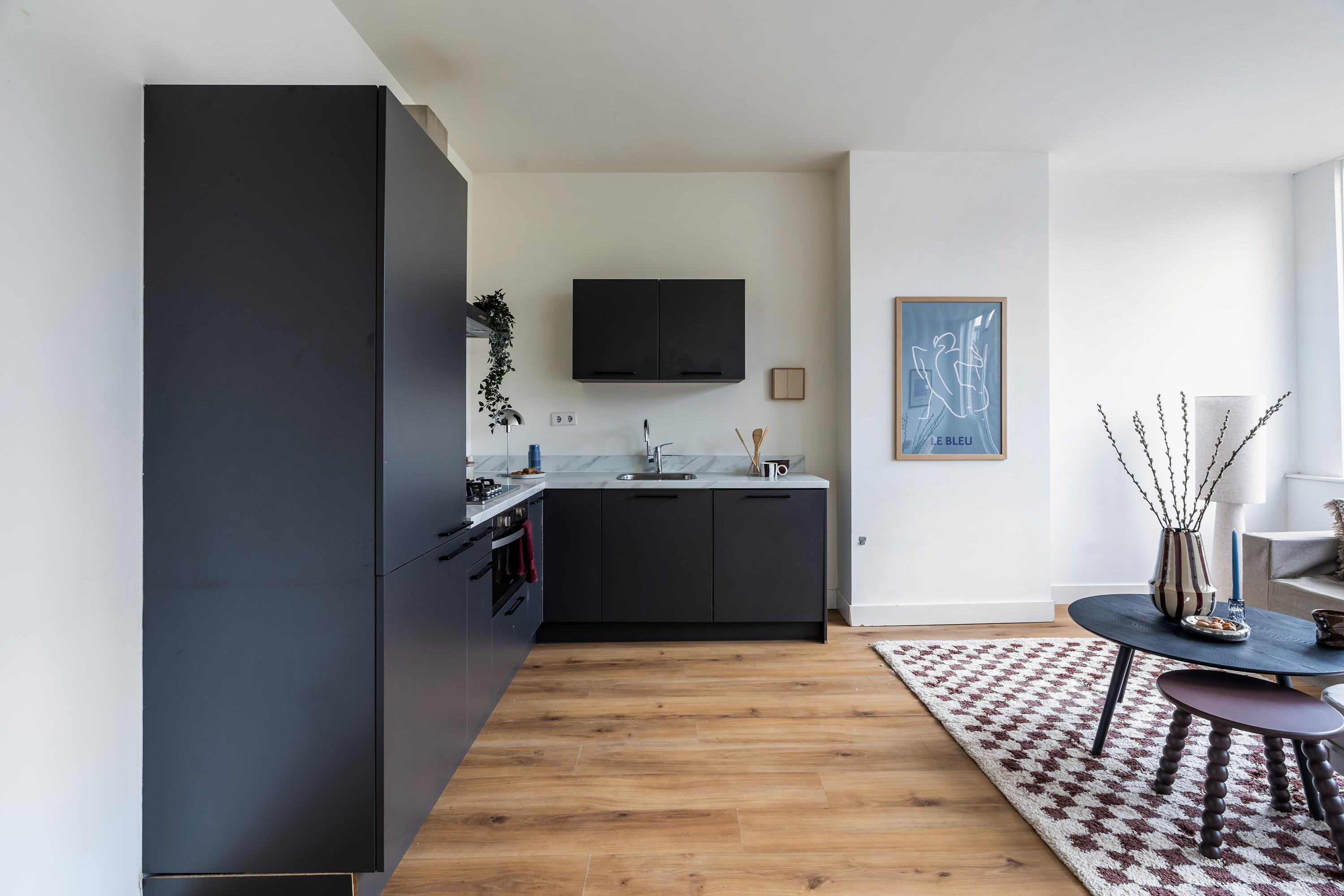 Via de overloop stap je de woning binnen en word je direct verwelkomd door de lichte en ruime woonkamer met moderne open keuken. De keuken is strak uitgevoerd in stijlvol zwart en voorzien van diverse inbouwapparatuur, ideaal voor wie van koken houdt. De grote raampartijen zorgen voor een zee aan daglicht, wat de ruimte nog groter doet aanvoelen. Vanuit de woonkamer heb je toegang tot het eerste balkon, perfect voor een kop koffie in de ochtendzon.