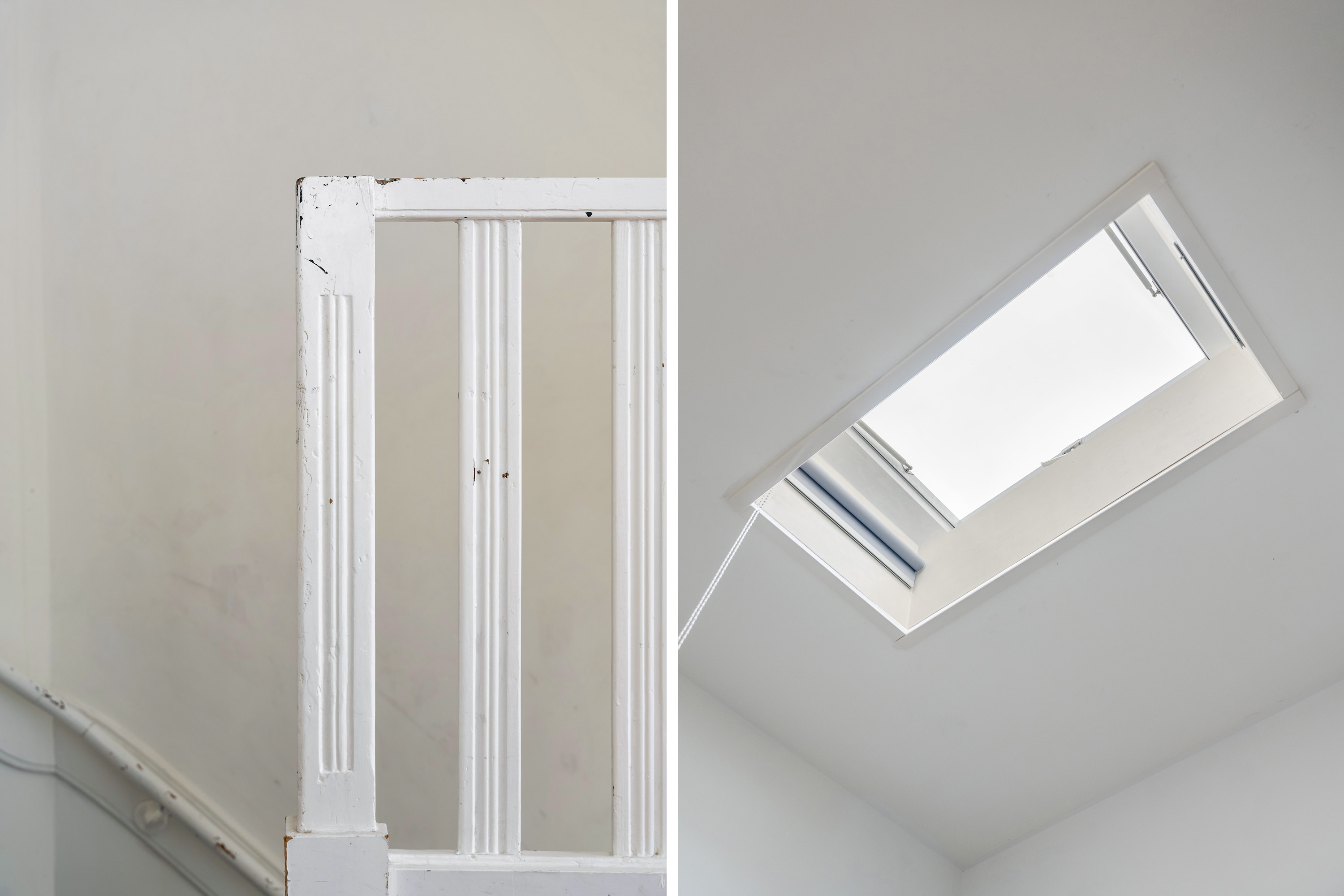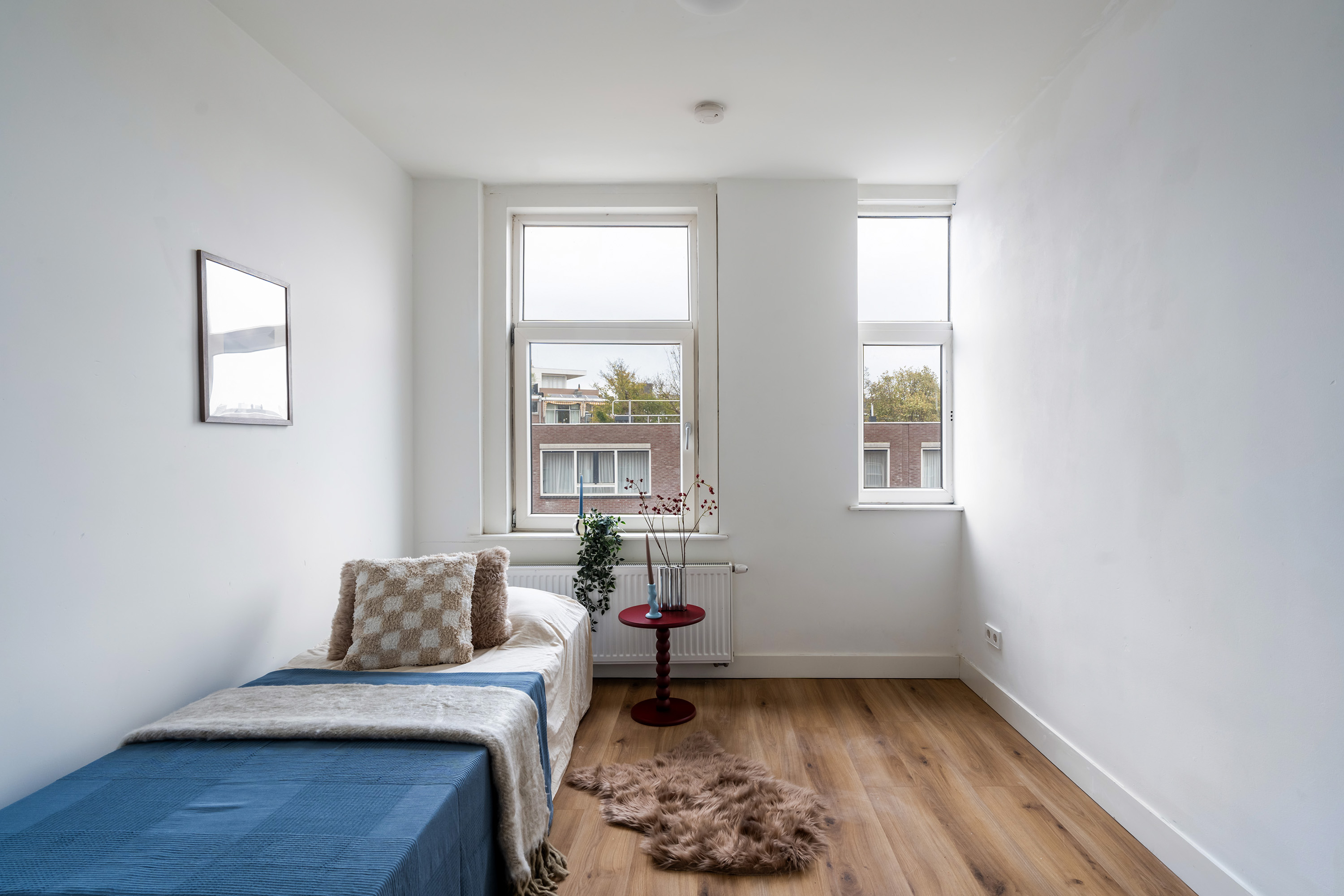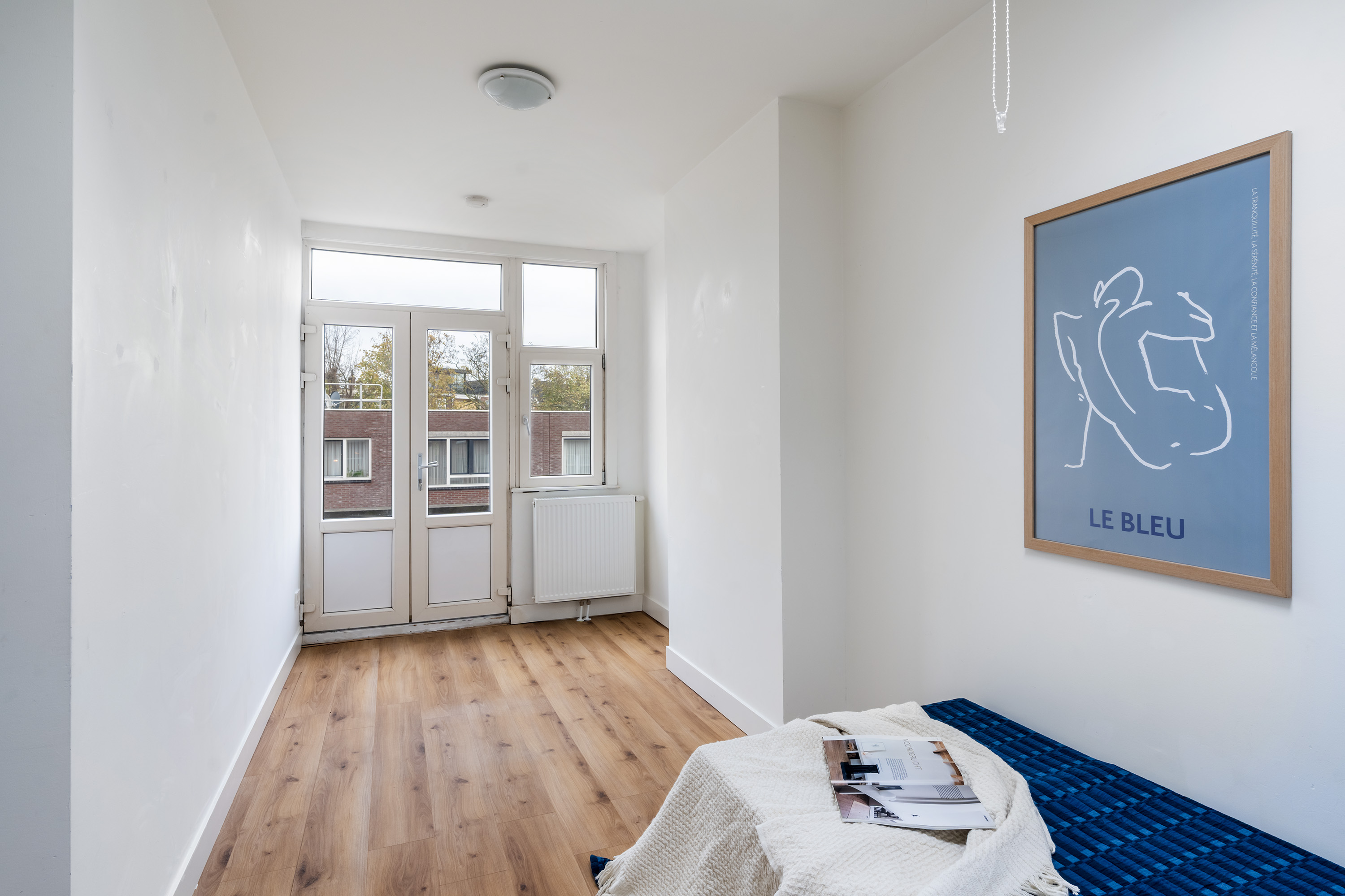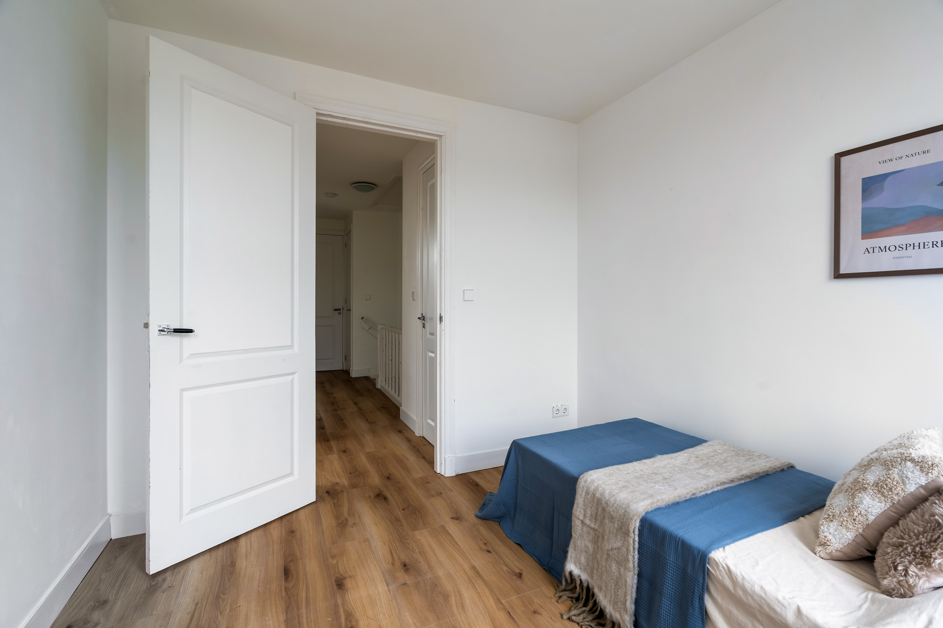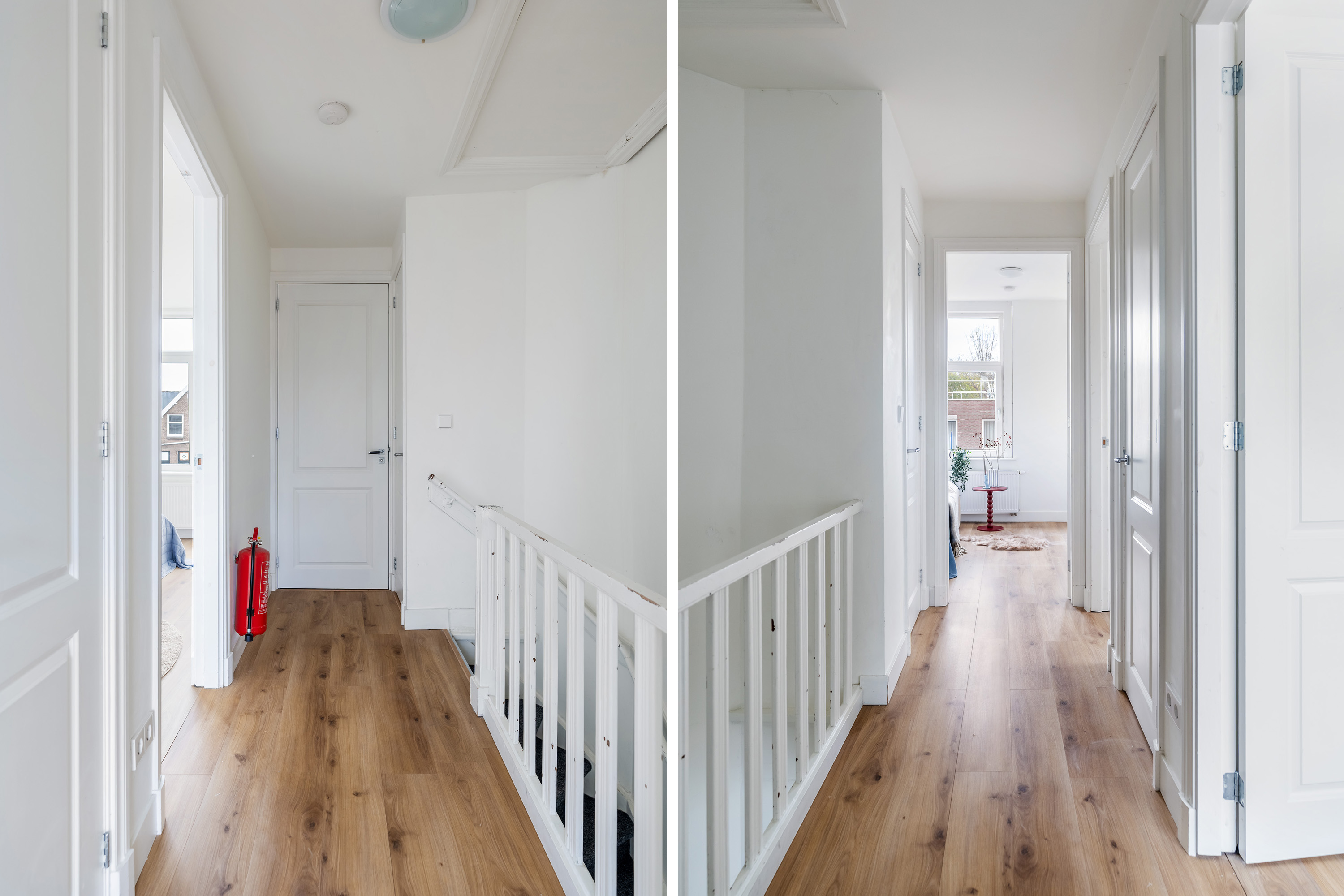 Hier bevinden zich drie royale slaapkamers, elk met een eigen karakter en veel lichtinval. De moderne badkamer is voorzien van een inloopdouche en een wastafelmeubel. Op de overloop is een aparte wasruimte aanwezig, wat zorgt voor extra gemak in het dagelijks gebruik. Aan de achterzijde bevindt zich het tweede balkon – een fijne plek om even te ontsnappen aan de drukte van de dag en te genieten van het uitzicht over de karakteristieke daken van de wijk.