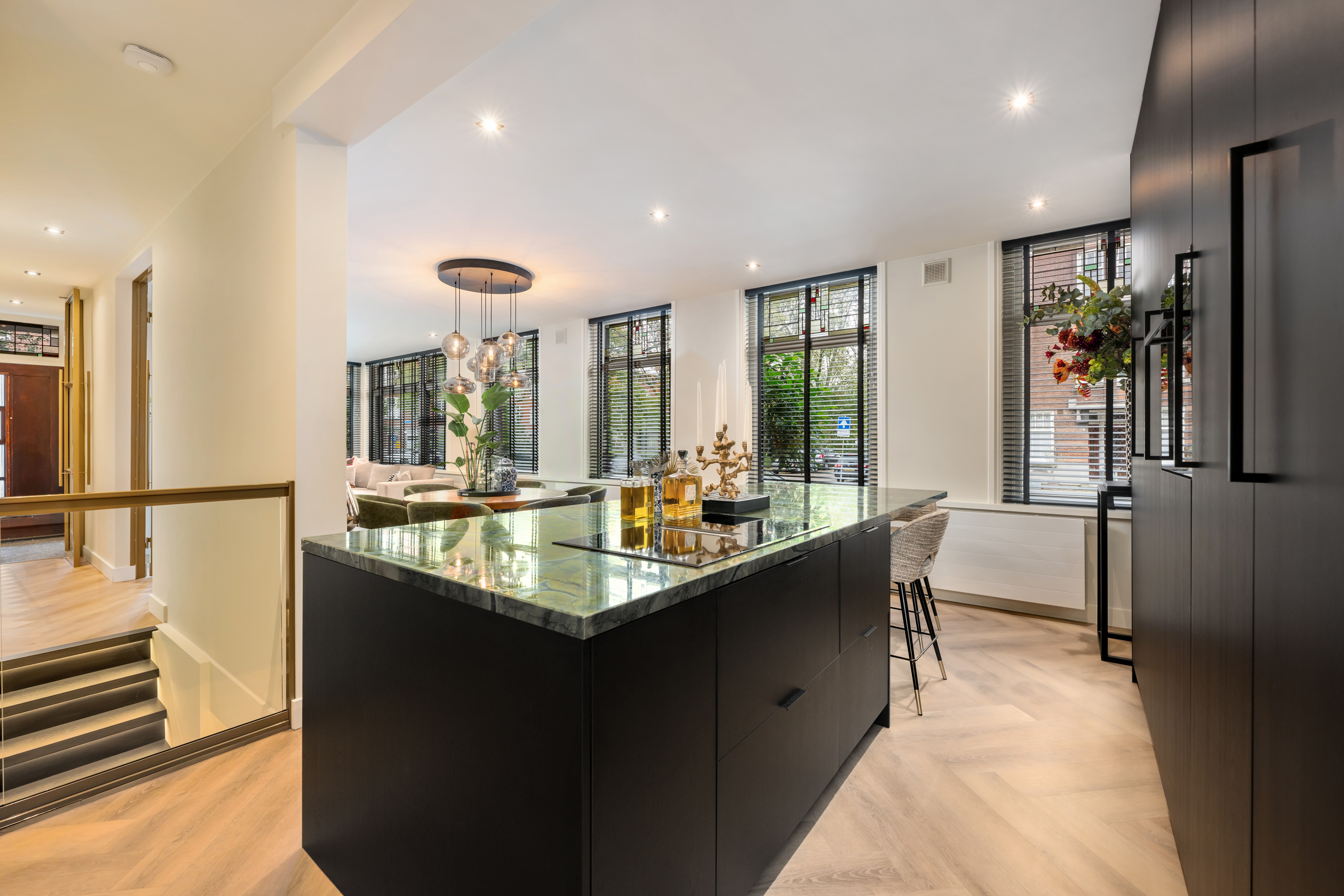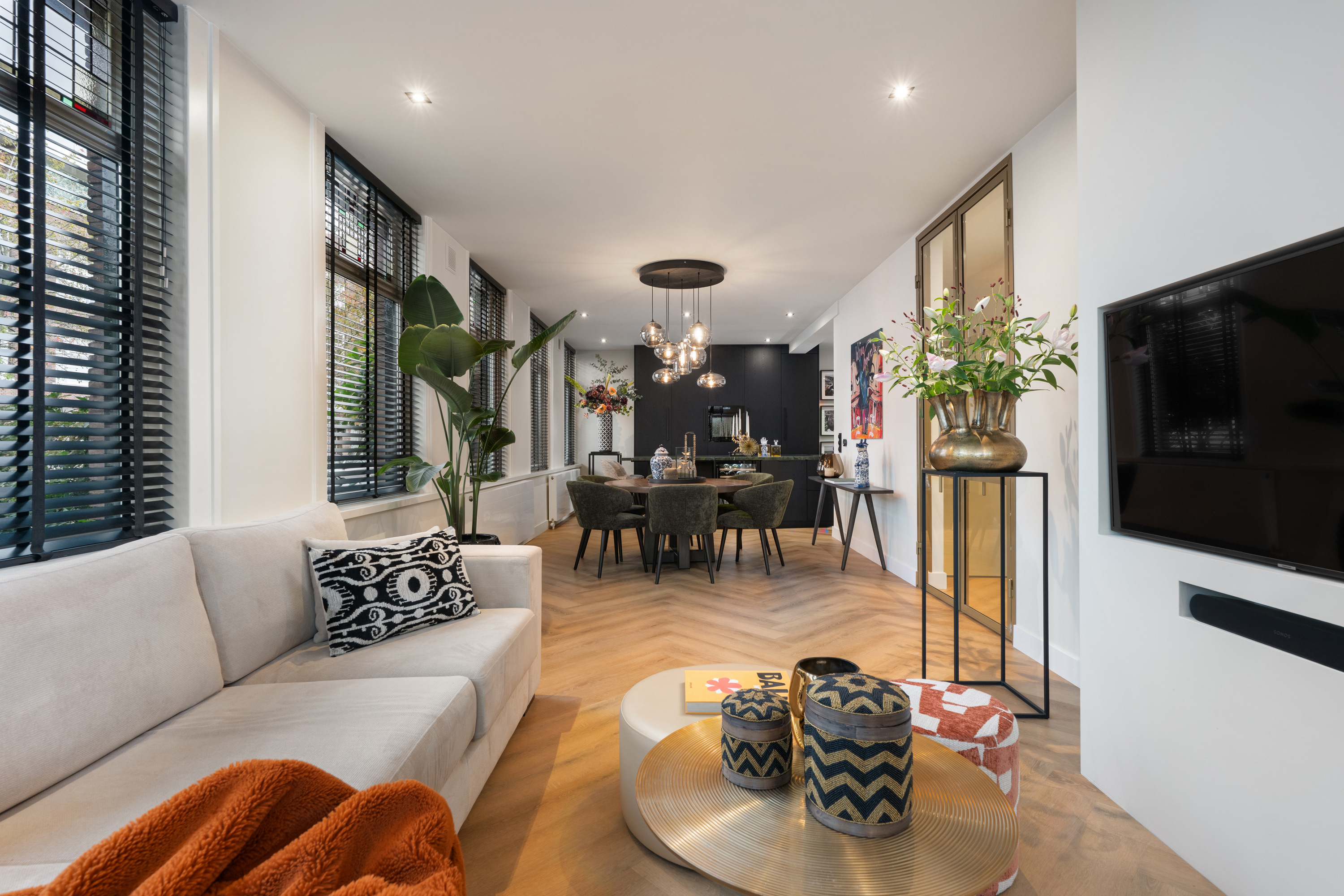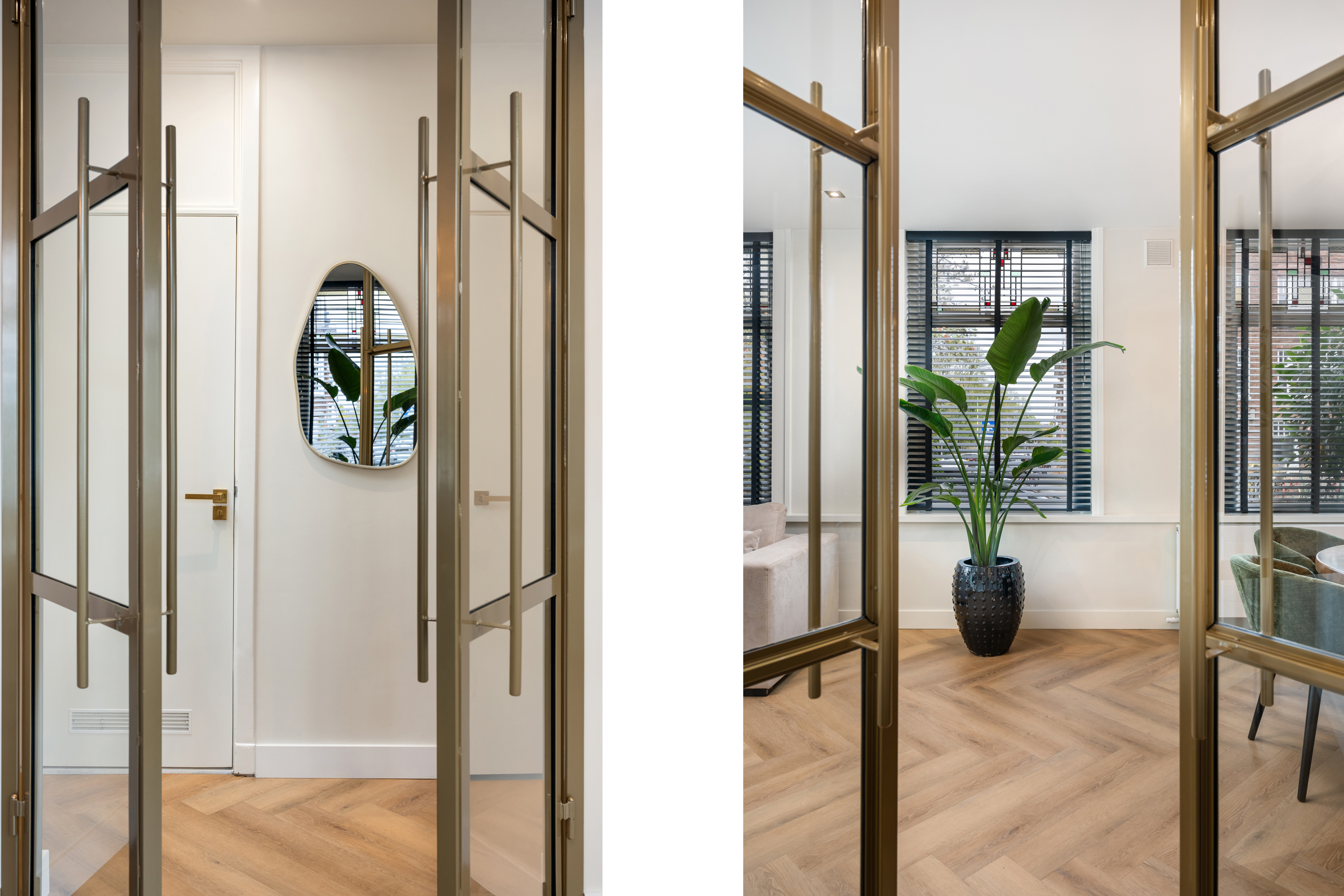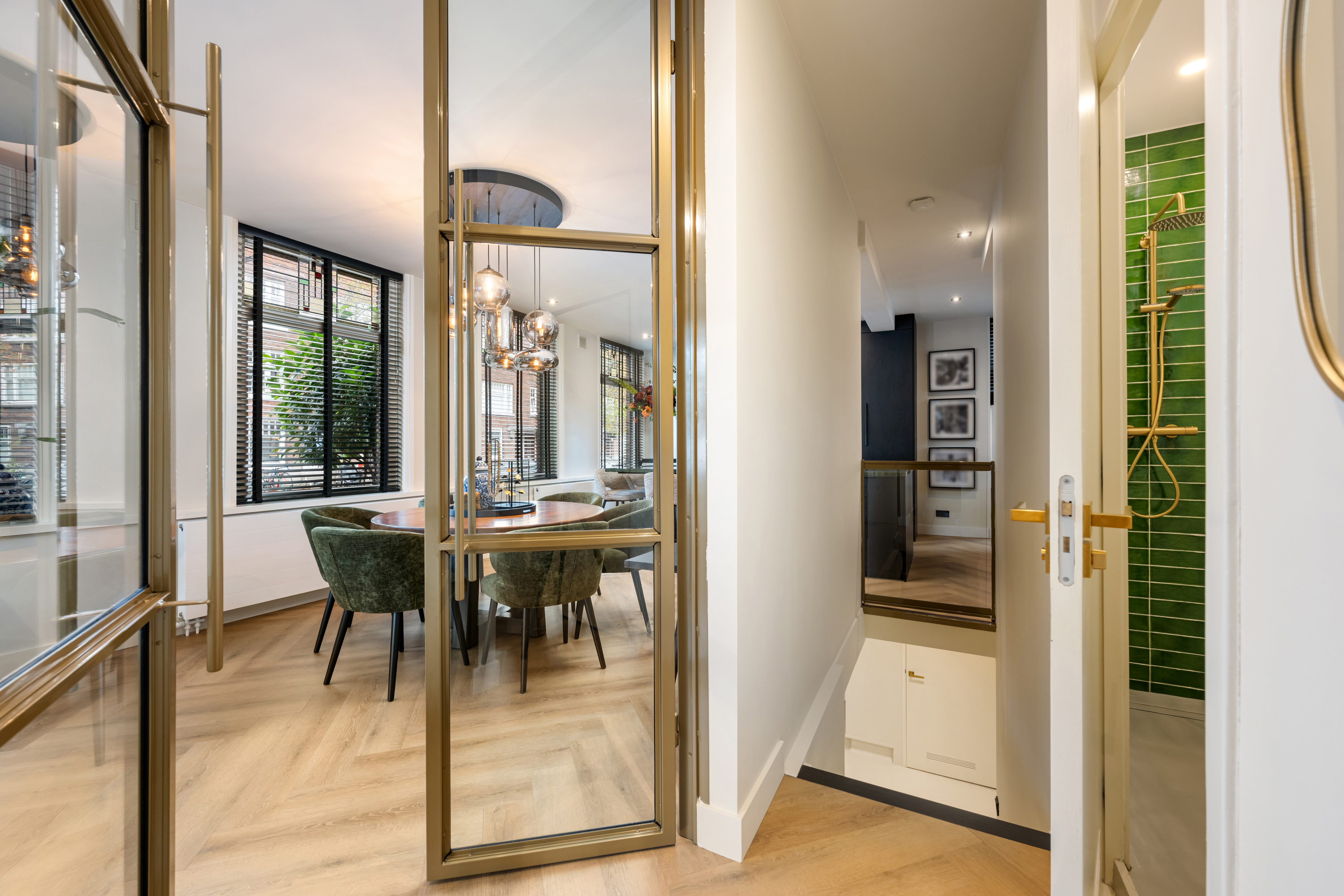Via de eigen entree op de hoek van de straat stap je binnen in de woning, doormiddel van een prachtige stalendeur in de hal kom je in de gang. Nogmaals 2 mooie stalendeuren laten je binnen in de lichte woonkamer, waar direct de prachtige raampartijen met glas-in-lood opvallen, een knipoog naar de jaren ’30, maar dan in een modern jasje. De warme visgraatvloer, de strakke wanden en het luxe Arte behang zorgen voor een stijlvolle basis.