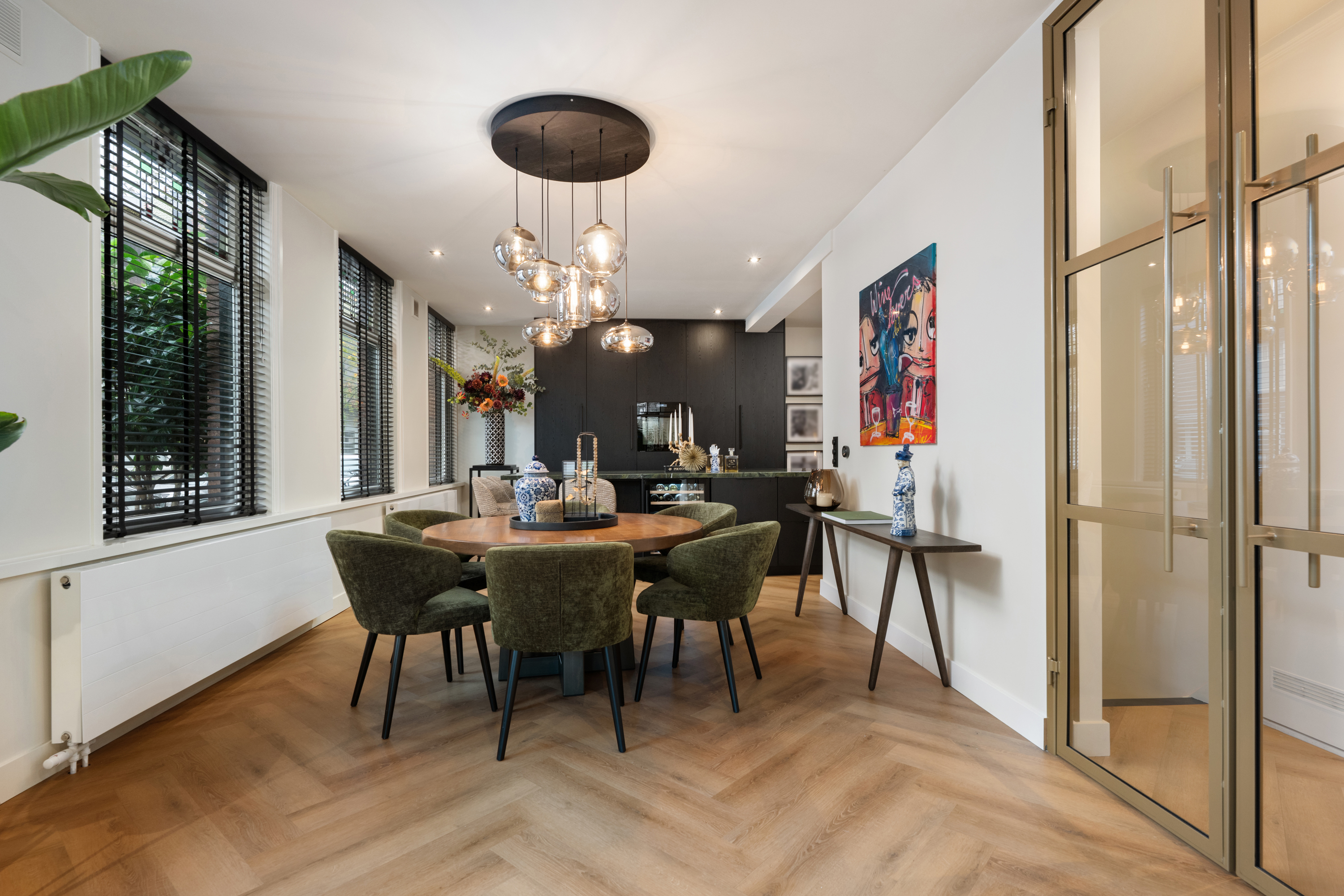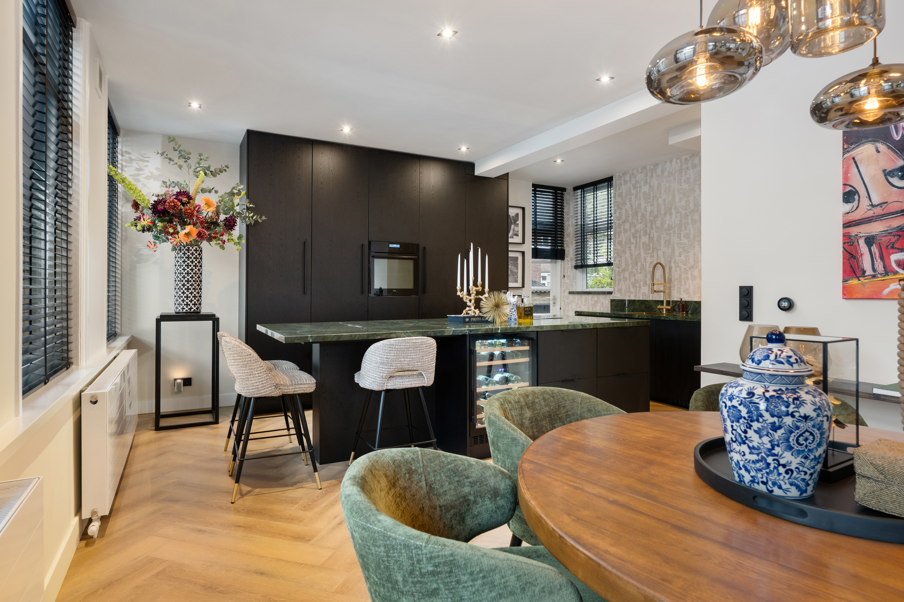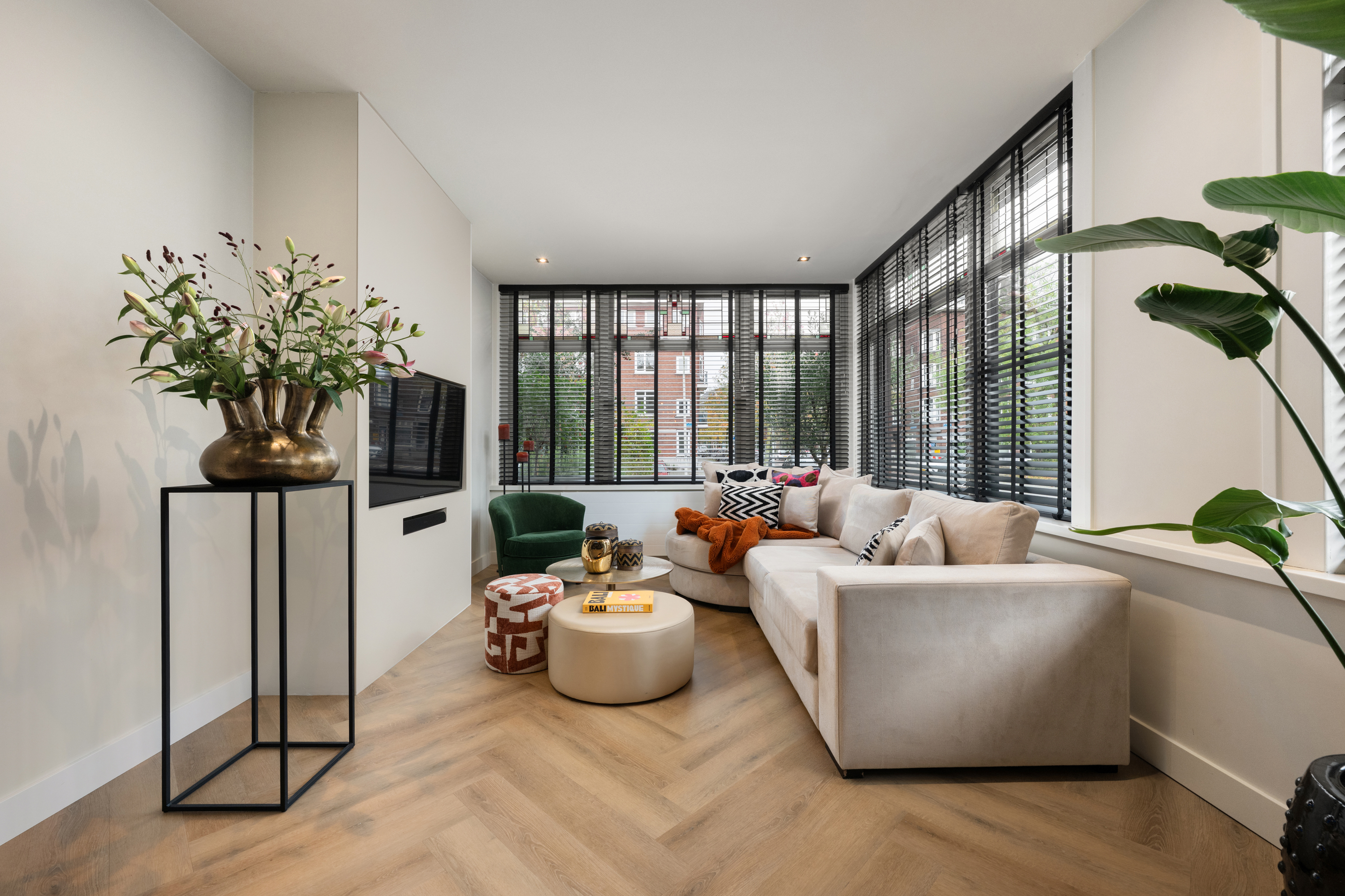Via de eigen entree op de hoek van de straat stap je binnen in de woning, doormiddel van een prachtige stalendeur in de hal kom je in de gang. Nogmaals 2 mooie stalendeuren laten je binnen in de lichte woonkamer, waar direct de prachtige raampartijen met glas-in-lood opvallen, een knipoog naar de jaren ’30, maar dan in een modern jasje. De warme visgraatvloer, de strakke wanden en het luxe Arte behang zorgen voor een stijlvolle basis.