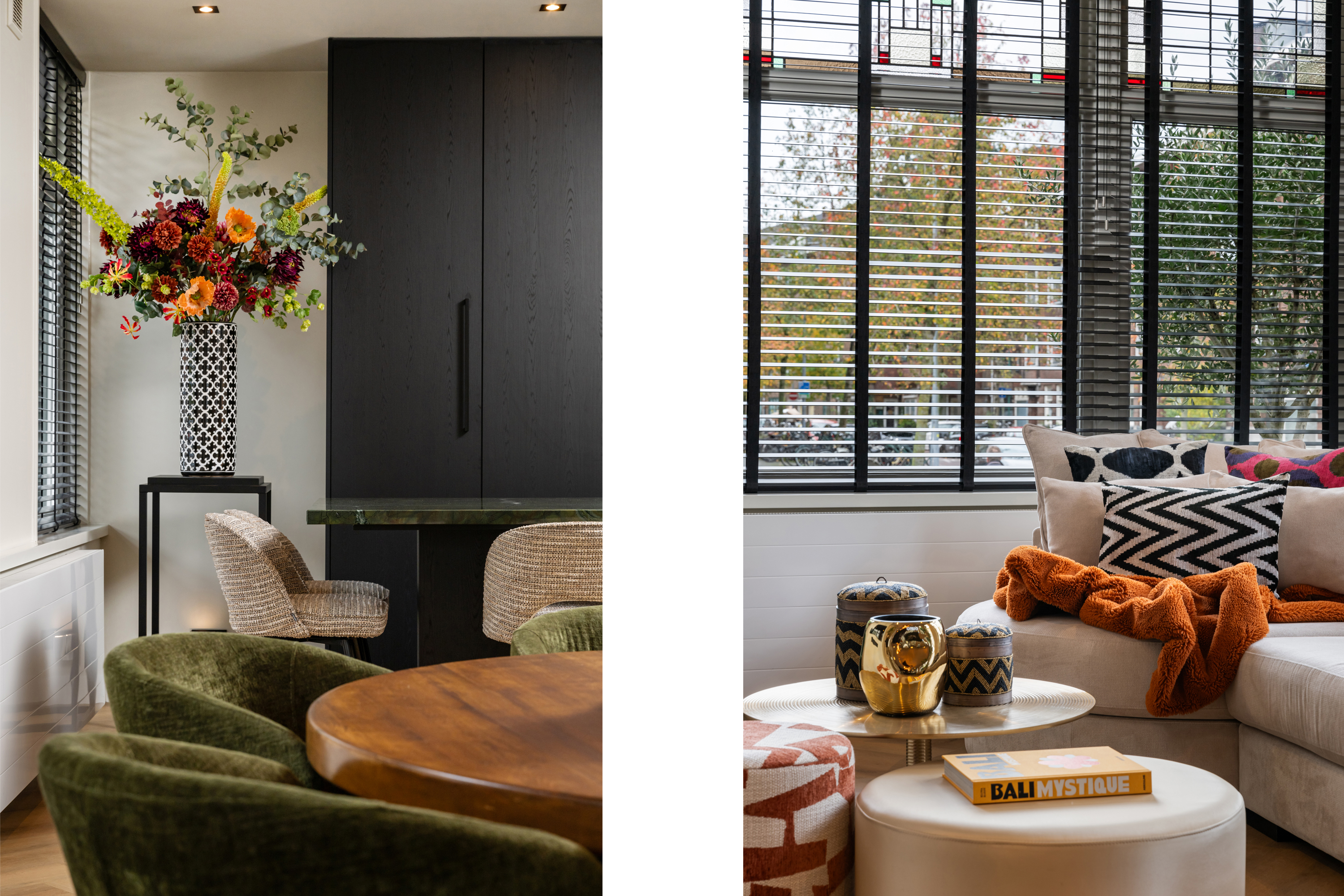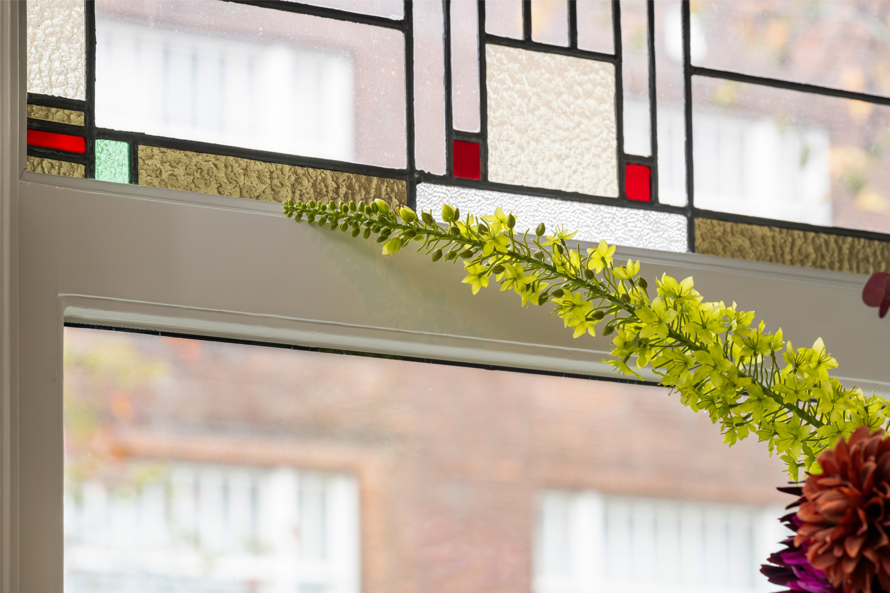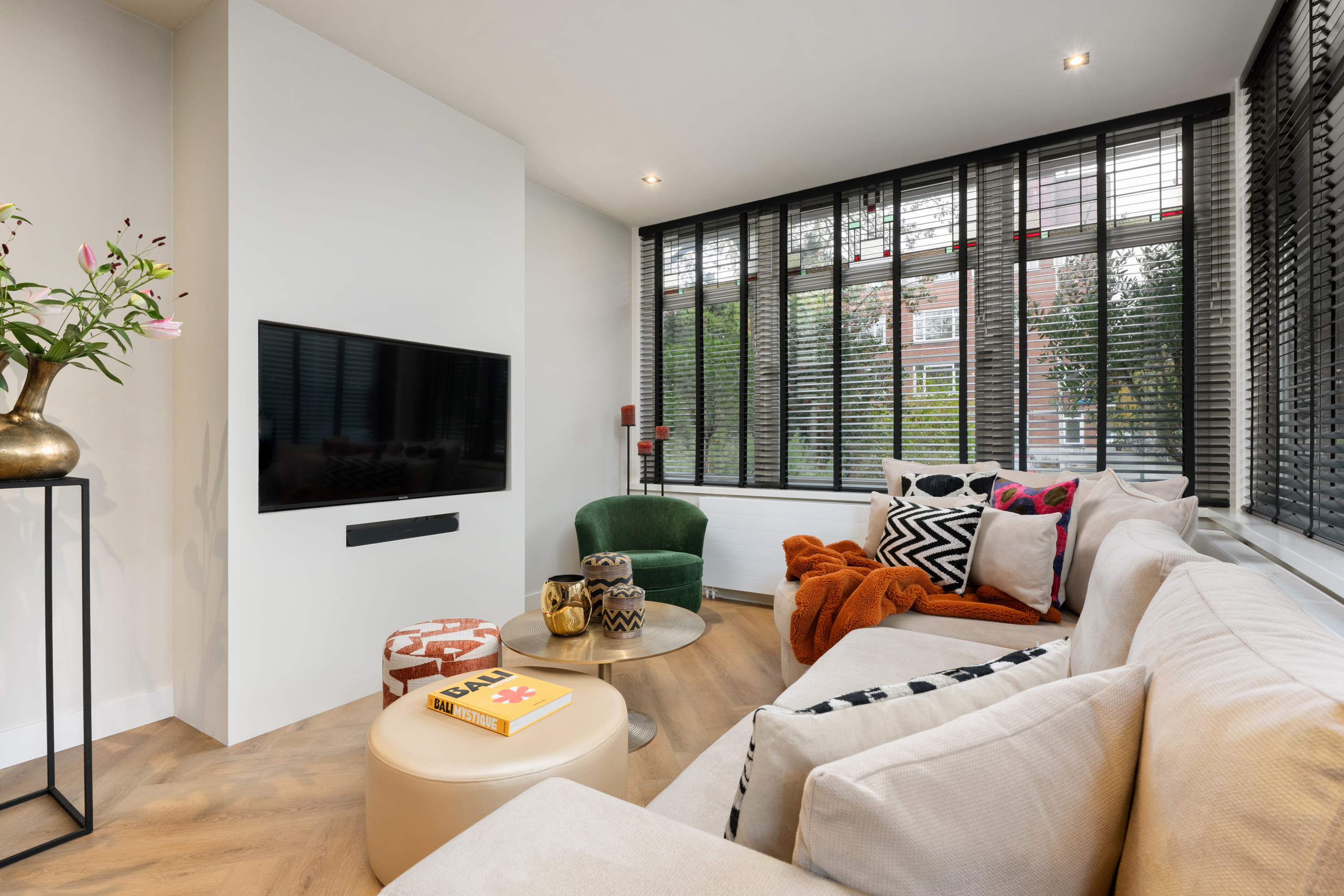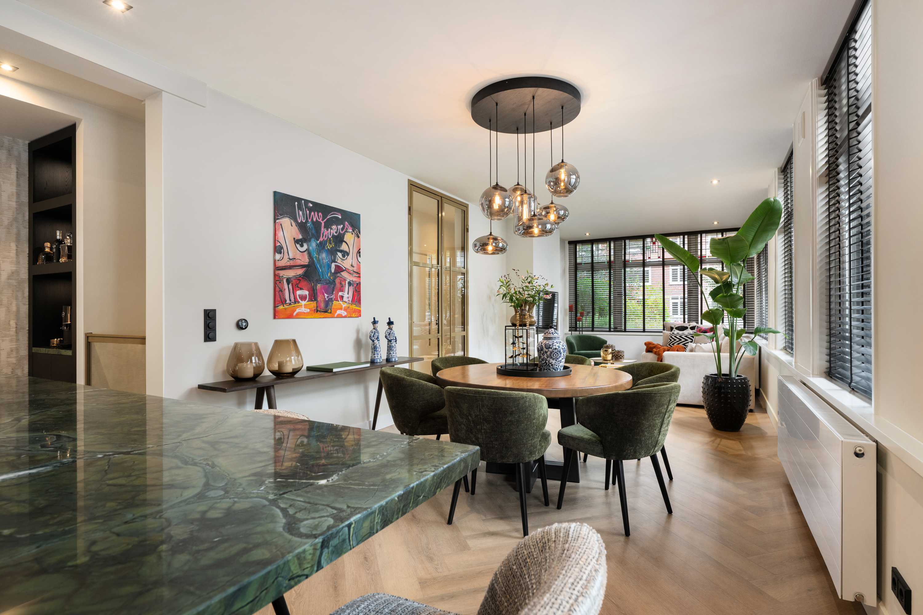 Via de eigen entree op de hoek van de straat stap je binnen in de woning, doormiddel van een prachtige stalendeur in de hal kom je in de gang. Nogmaals 2 mooie stalendeuren laten je binnen in de lichte woonkamer, waar direct de prachtige raampartijen met glas-in-lood opvallen, een knipoog naar de jaren ’30, maar dan in een modern jasje. De warme visgraatvloer, de strakke wanden en het luxe Arte behang zorgen voor een stijlvolle basis.