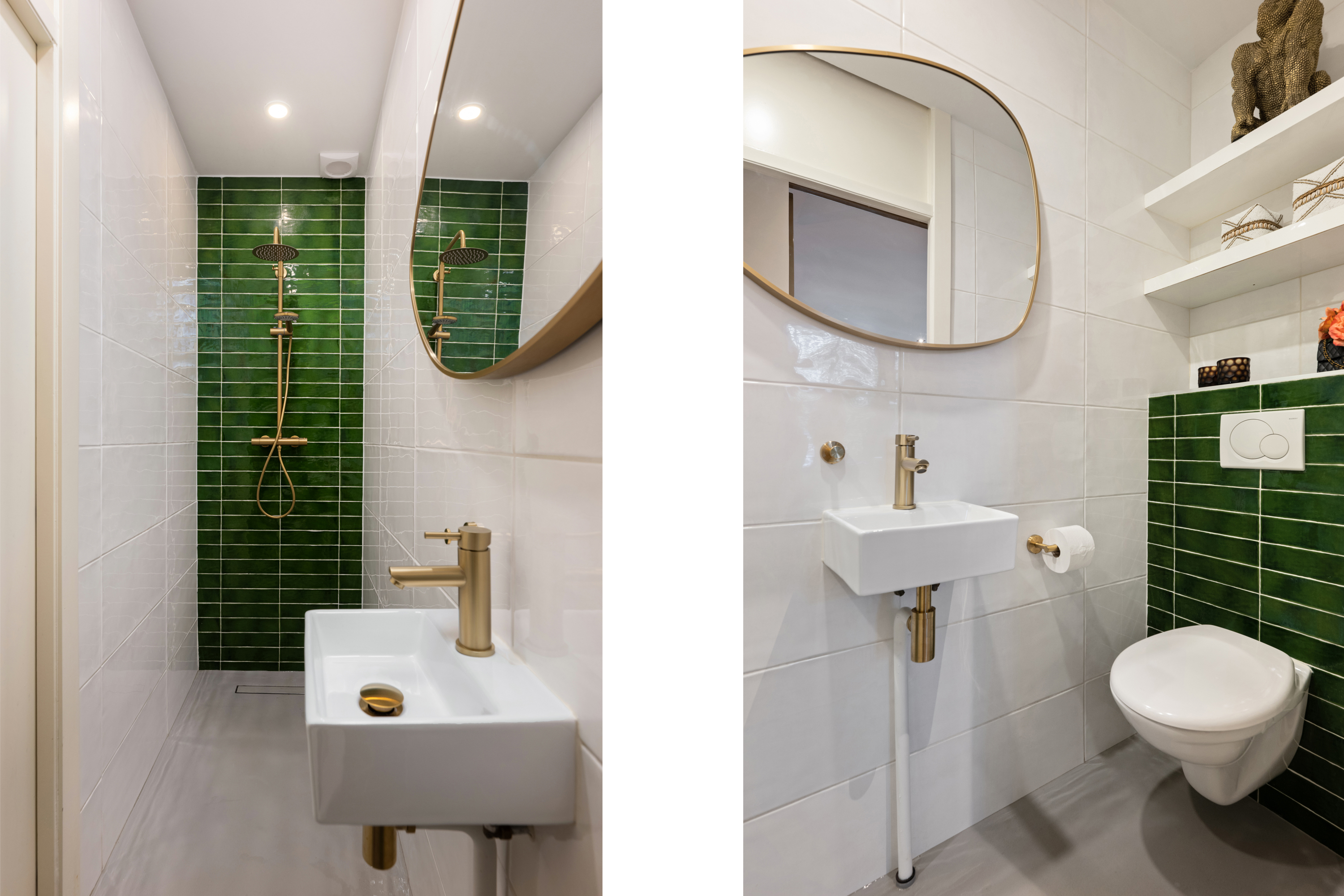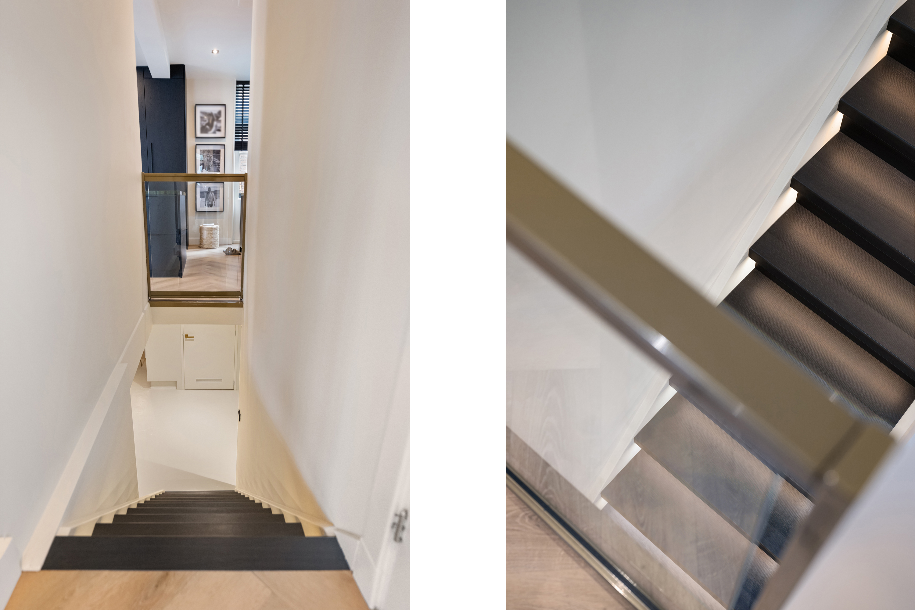 Ook vind je op deze verdieping een nette hal met de badkamer, strak afgewerkt met moderne tegels en hoogwaardige voorzieningen: een inloopdouche, wastafelmeubel en toilet zorgen voor een luxe hotelgevoel.. Met de trap naar beneden kom je in het souterrain.