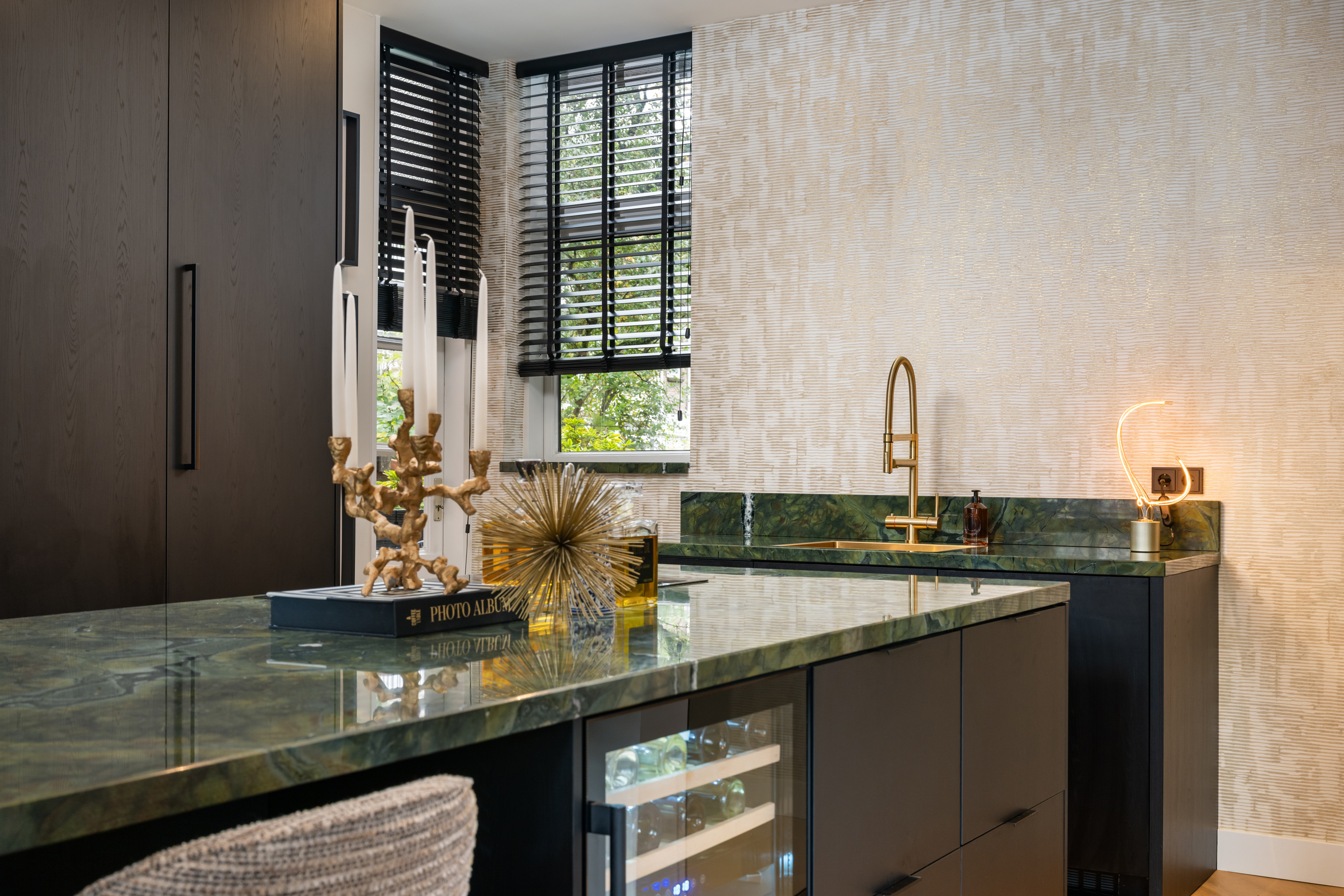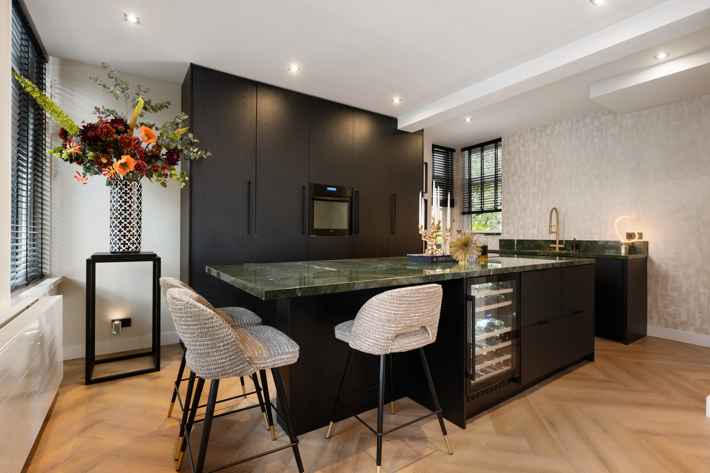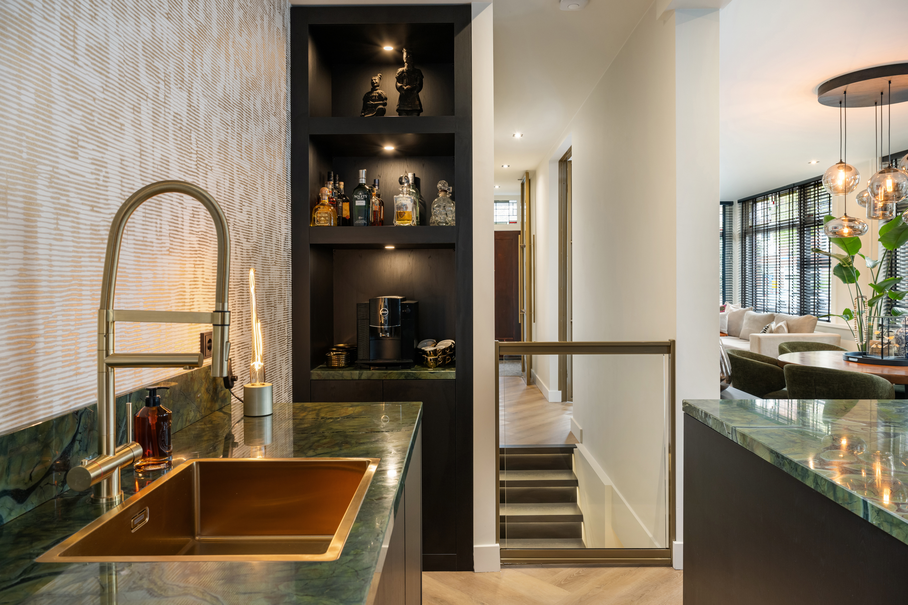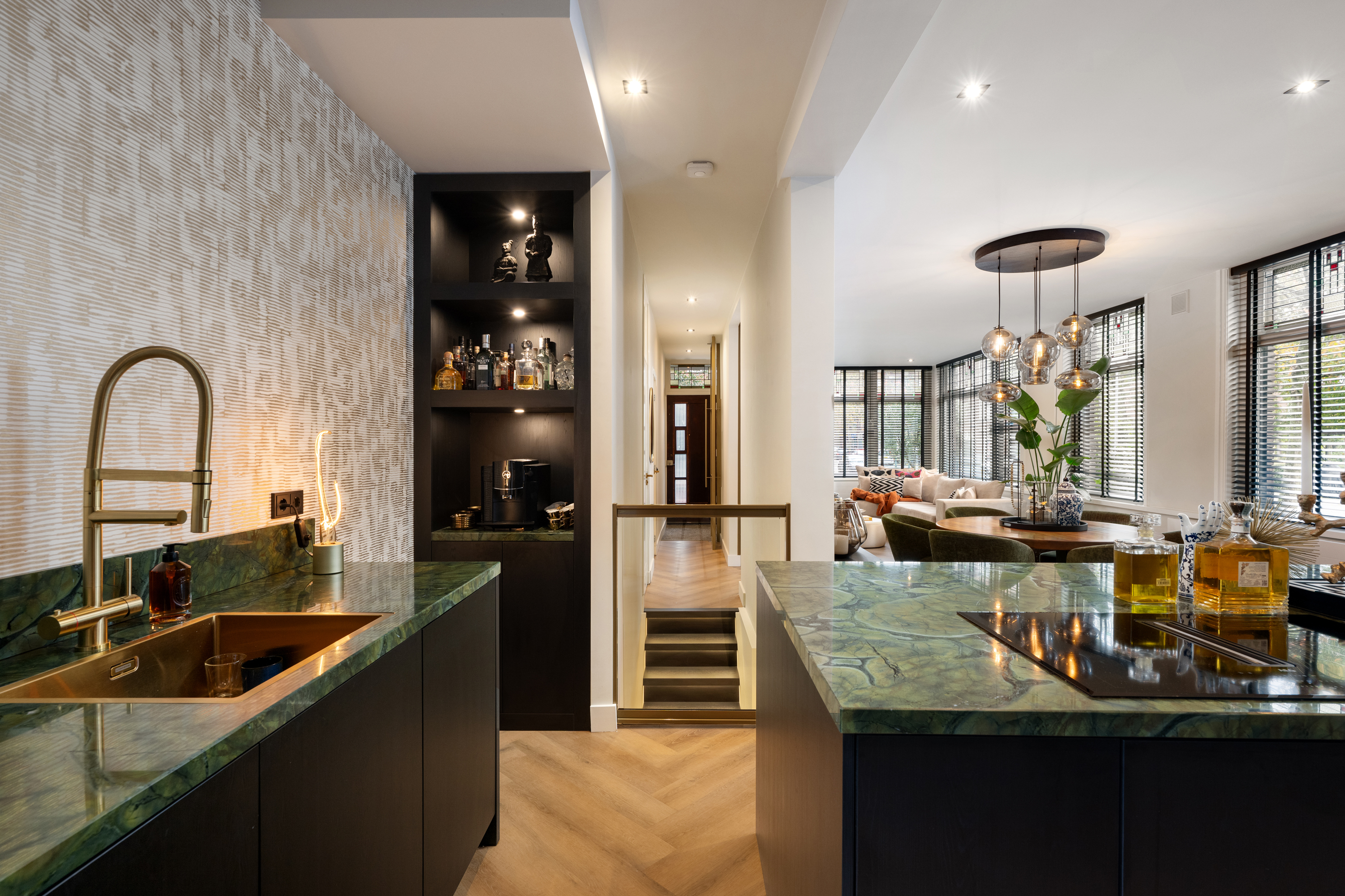 De woonkamer loopt naadloos over in de keuken: het hart van de woning. Deze moderne keuken met kookeiland is voorzien van alle denkbare inbouwapparatuur en het schitterende kwartsiet groen natuursteen werkblad geeft het geheel een luxe uitstraling. De gezellige koffiecorner maakt het plaatje compleet , een heerlijke plek om je dag te beginnen. Vanuit de keuken stap je zo het zonnige terras (ca. 6 m²) op, waar je fijn kunt borrelen of genieten van een rustige ochtendkoffie.