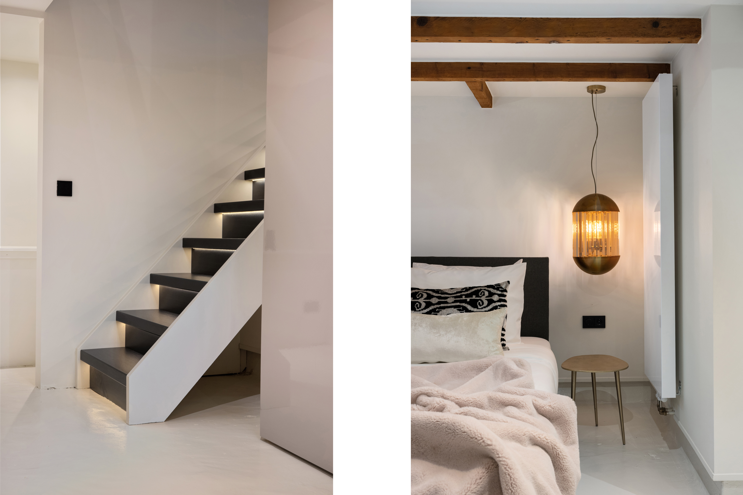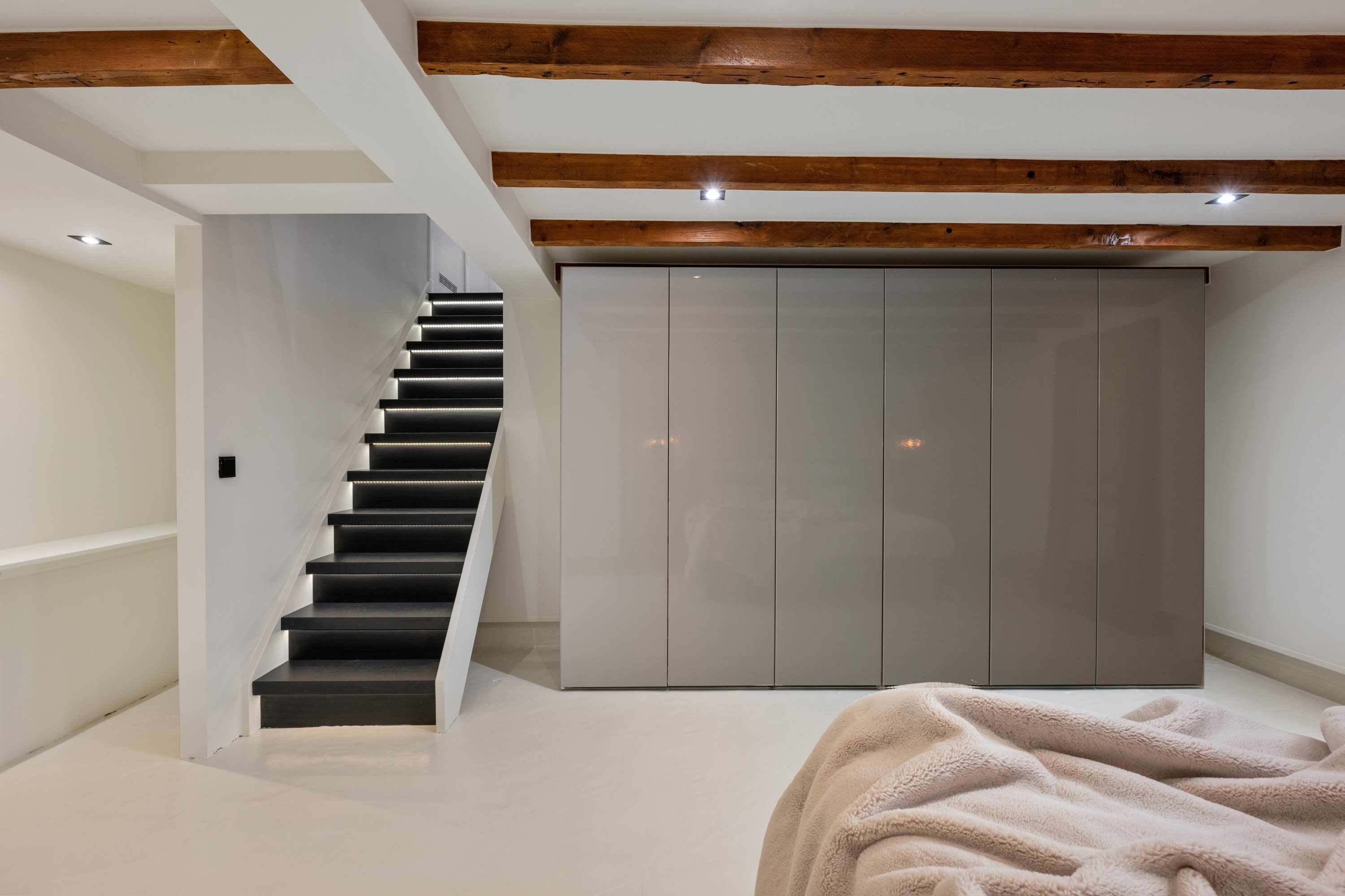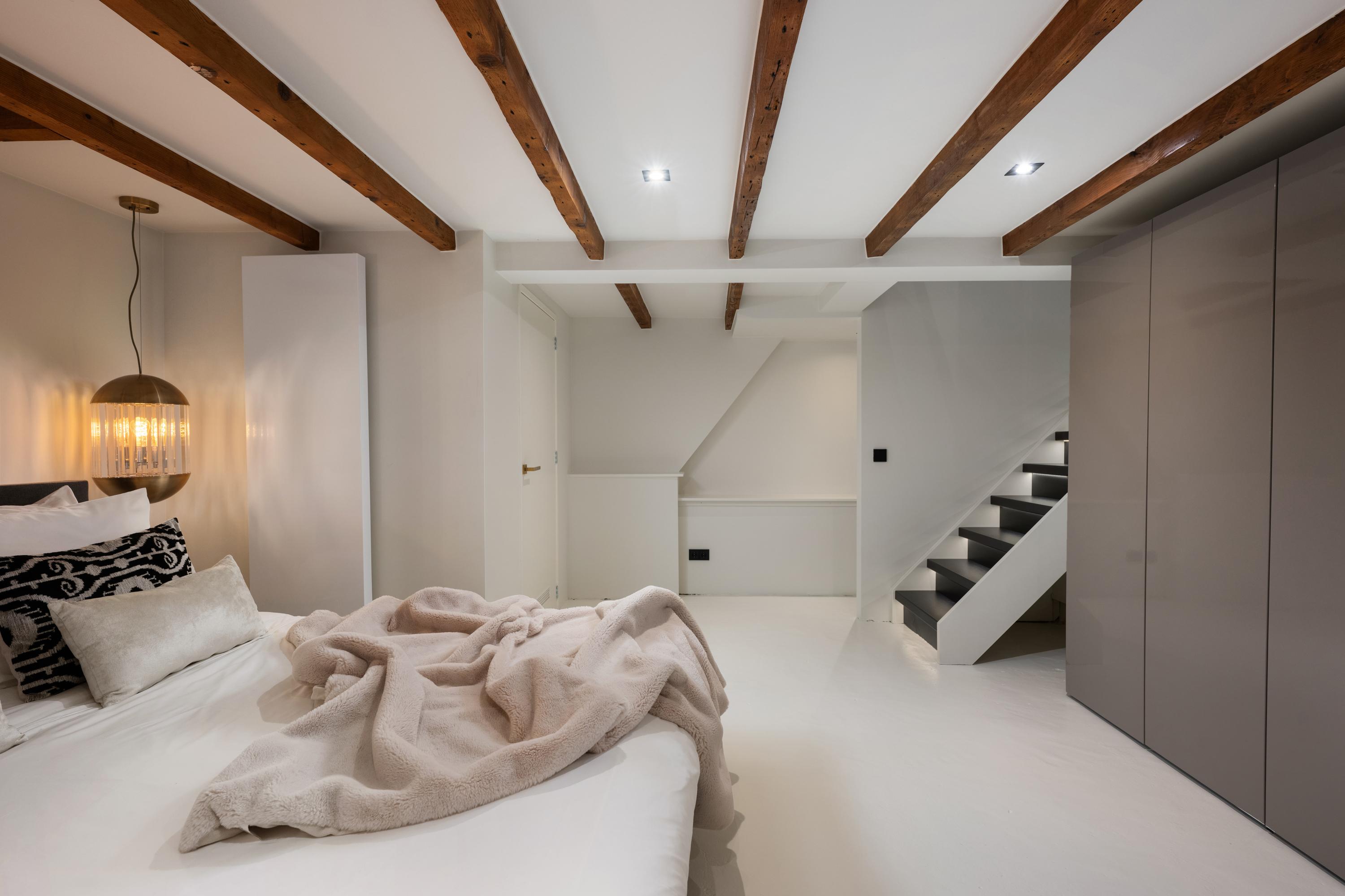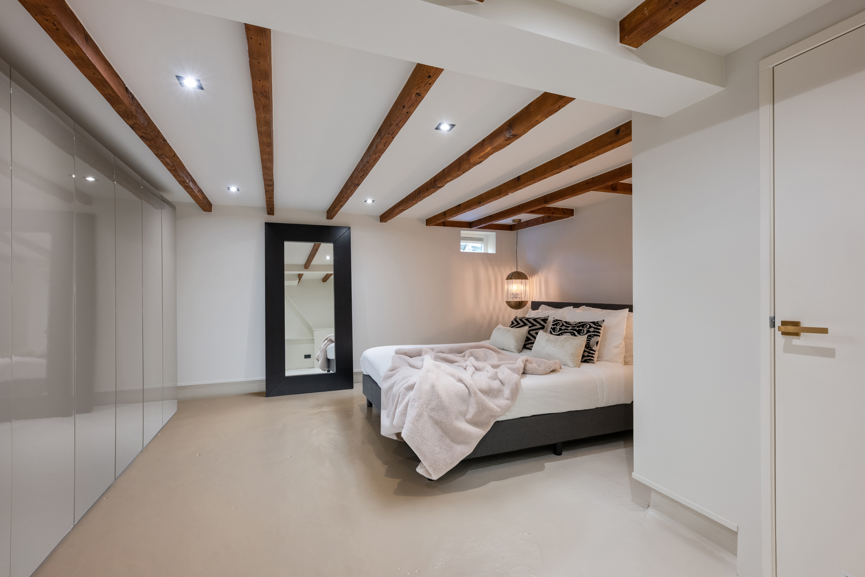 In het souterrain bevindt zich de sfeervolle slaapkamer, een heerlijk rustige plek dankzij de prettige lichtinval en het fijne klimaat beneden. De ruimte is slim ingedeeld met maatwerk kasten en fraaie details zoals de zichtbare houten balken. Verder is er in het souterrain een praktische wasruimte aanwezig.