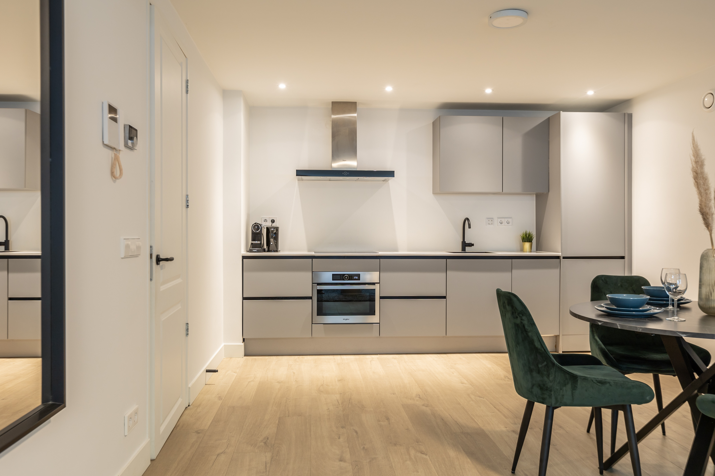 De entree geeft je toegang tot een grote hal waar je lekker veel spullen kwijt kunt plus je bereikt hier de luxe badkamer welke voorzien is van toilet, wastafel in meubel en fijne inloopdouche en naast je vloerverwarming ook nog een handdoekenradiator. Vanuit de hal kom je verder in je woning, een super fijne woonkamer met aan de achterzijde je luxe keuken welke voorzien is van de volgende apparatuur: inductiekookplaat, combimagnetron, vaatwasser, afzuigkap, koelkast en vriezer. Een kast met de CV ketel en wasmachine aansluiting maakt het geheel compleet.