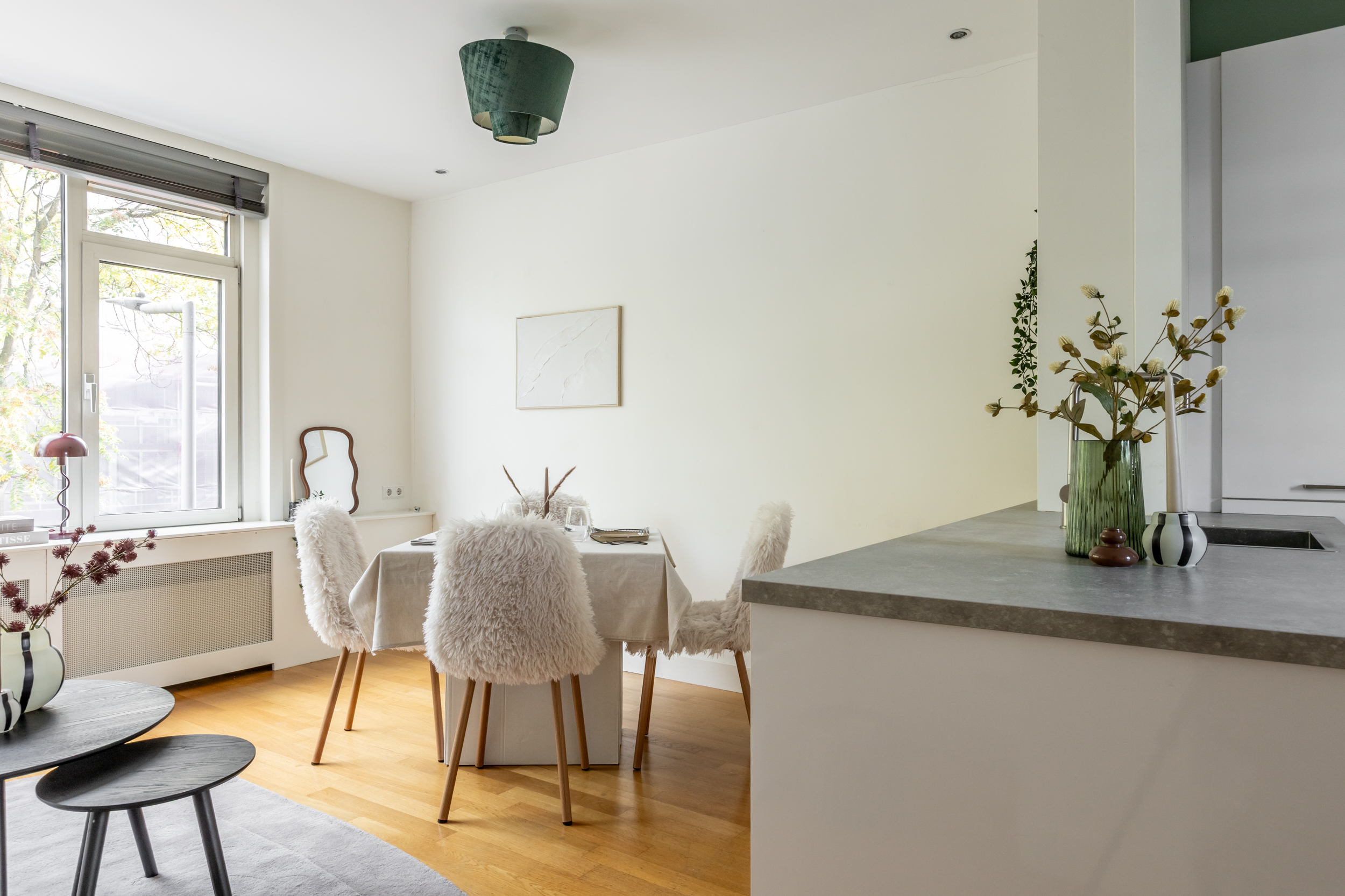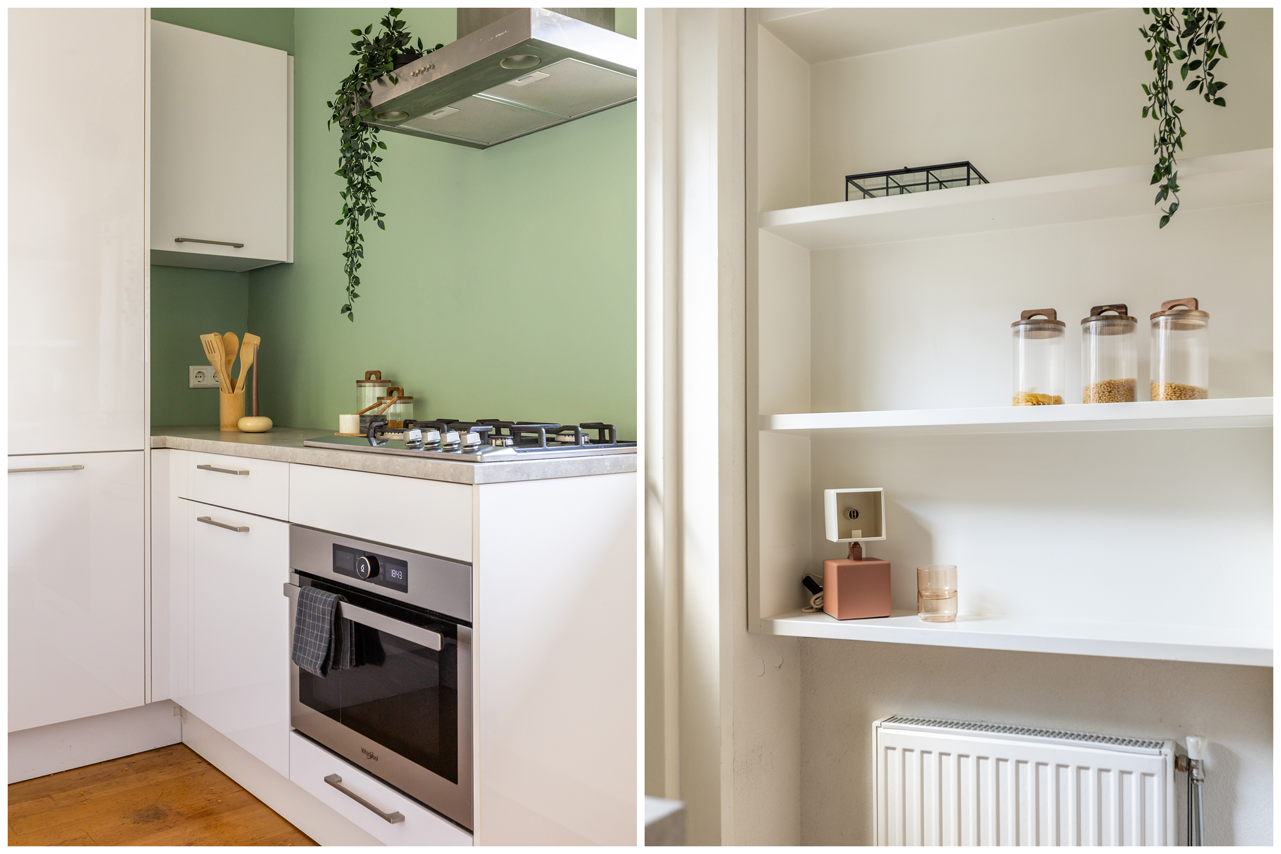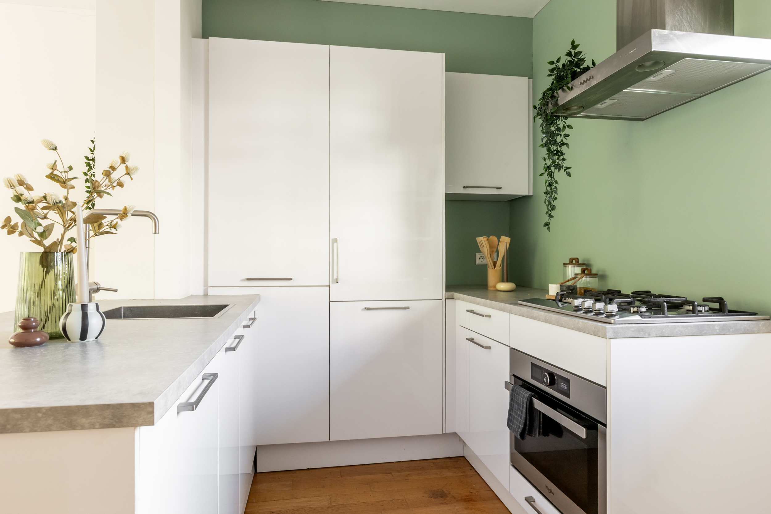 Bij binnenkomst word je verwelkomd in een open hal die toegang biedt tot alle vertrekken. Direct vanuit de hal loop je de moderne keuken in, die in verbinding staat met de lichte en keurig afgewerkte woonkamer. De inbouwspots in het plafond en de strakke wanden zorgen voor een moderne uitstraling, terwijl de nette laminaatvloer en de inbouwkasten met ruimte voor accessoires juist een warme sfeer creëren. Een plek waar je elke dag met plezier thuiskomt! De open keuken met spoeleiland staat centraal in de woning, waardoor dit de ideale plek is om te koken, borrelen en genieten van het gezelschap om je heen. Deze is voorzien van een 4-pits gasfornuis, afzuigkap, combi-oven, koel- en vriescombinatie en een vaatwasser. Hier vanuit stap je zo het balkon op, waar je in alle rust kunt genieten van de zon op het zuidwesten.