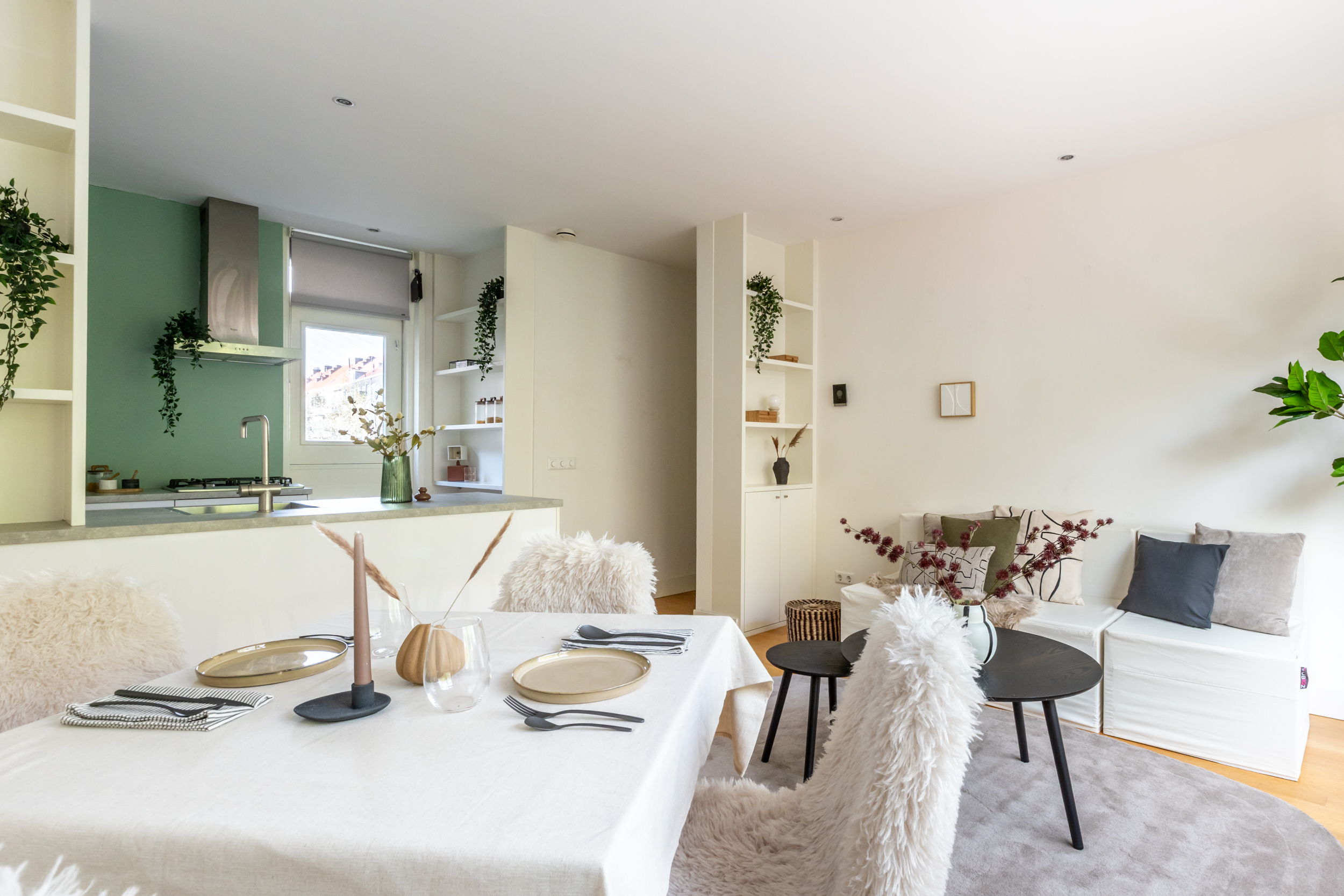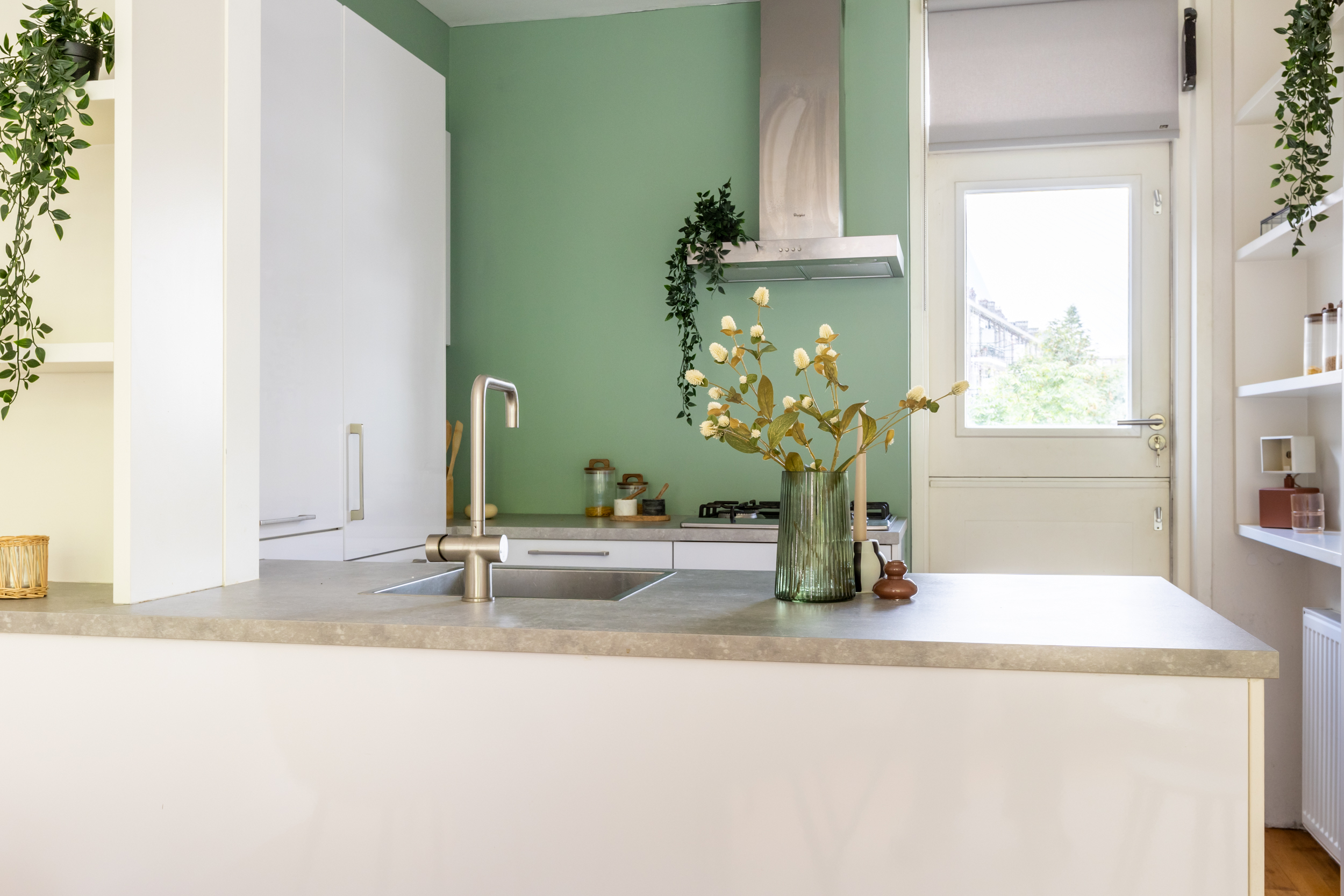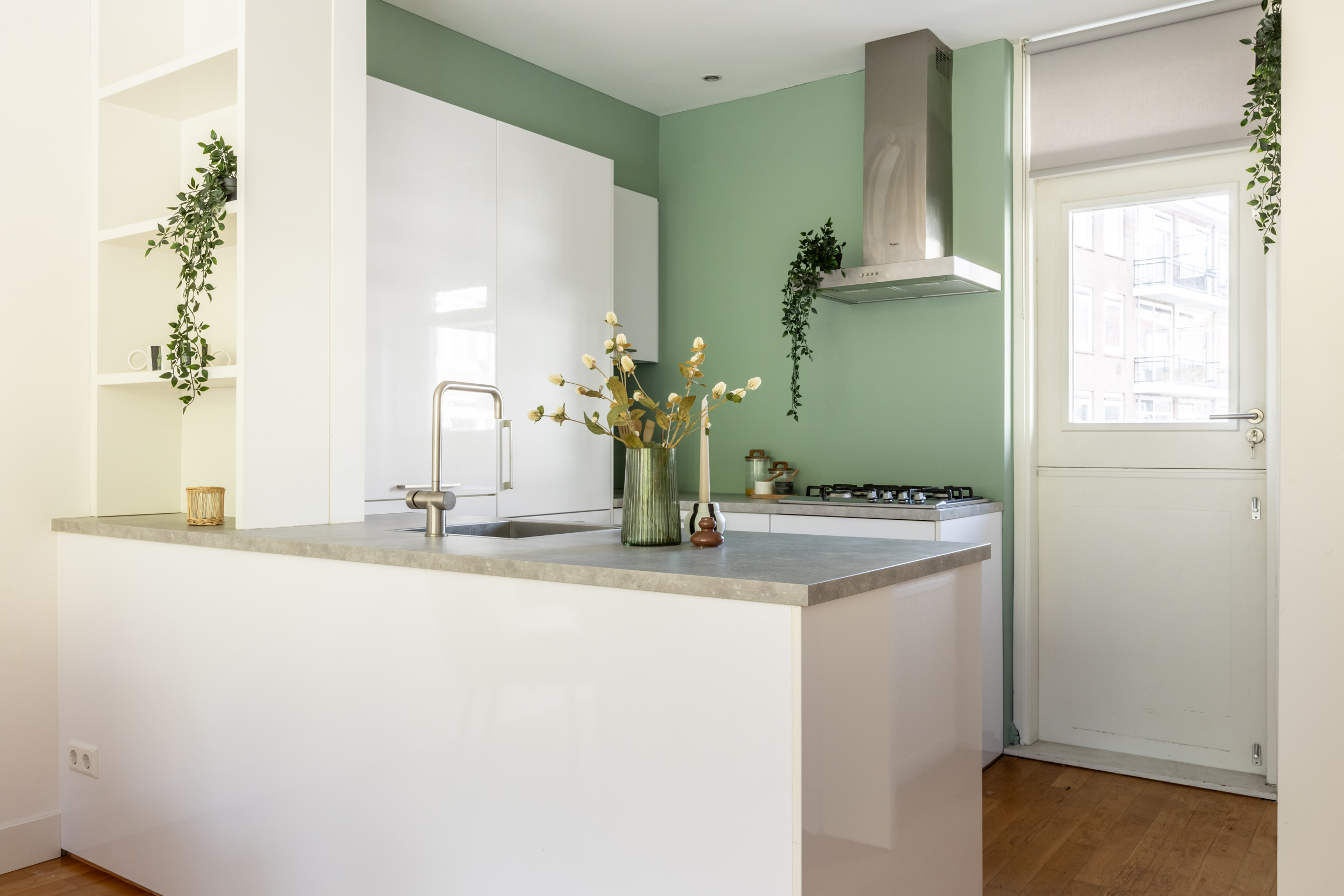 Bij binnenkomst word je verwelkomd in een open hal die toegang biedt tot alle vertrekken. Direct vanuit de hal loop je de moderne keuken in, die in verbinding staat met de lichte en keurig afgewerkte woonkamer. De inbouwspots in het plafond en de strakke wanden zorgen voor een moderne uitstraling, terwijl de nette laminaatvloer en de inbouwkasten met ruimte voor accessoires juist een warme sfeer creëren. Een plek waar je elke dag met plezier thuiskomt! De open keuken met spoeleiland staat centraal in de woning, waardoor dit de ideale plek is om te koken, borrelen en genieten van het gezelschap om je heen. Deze is voorzien van een 4-pits gasfornuis, afzuigkap, combi-oven, koel- en vriescombinatie en een vaatwasser. Hier vanuit stap je zo het balkon op, waar je in alle rust kunt genieten van de zon op het zuidwesten.
