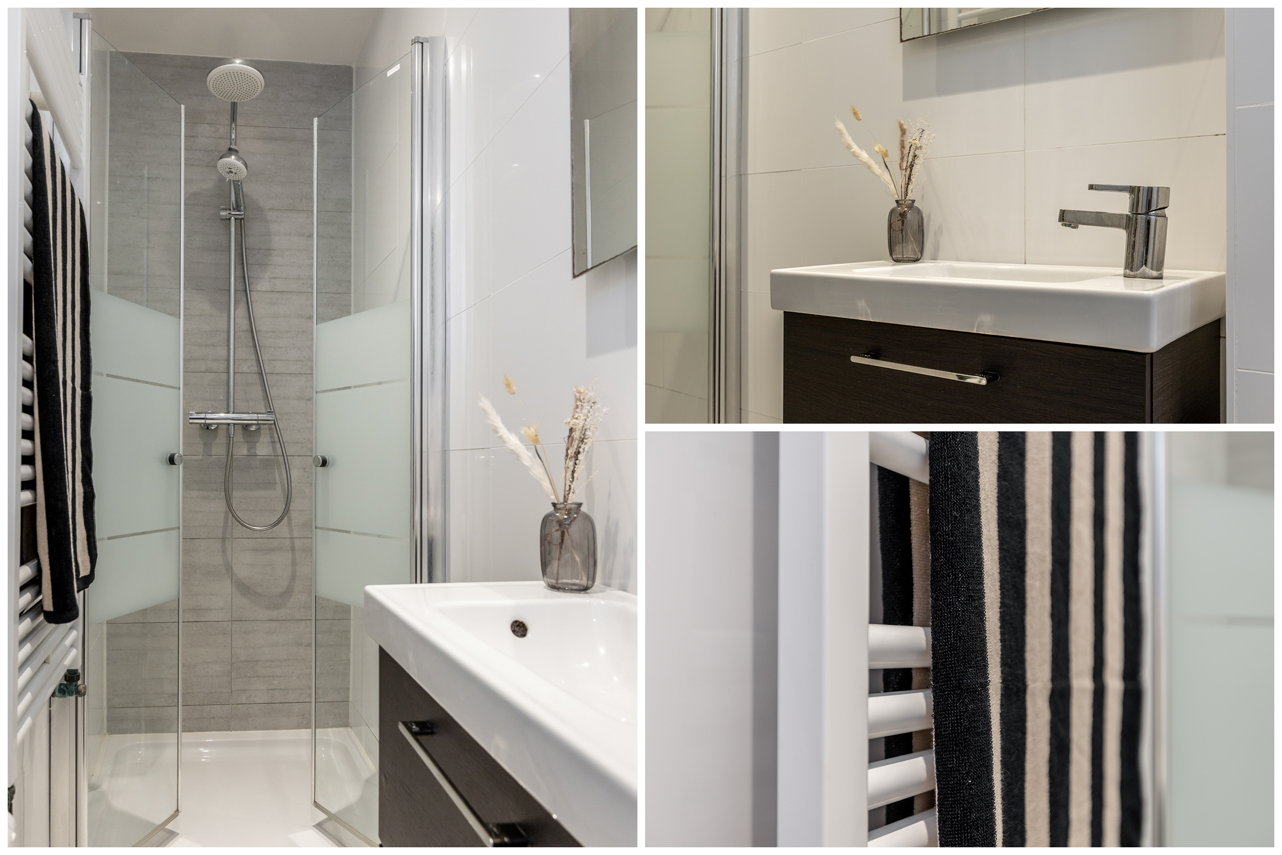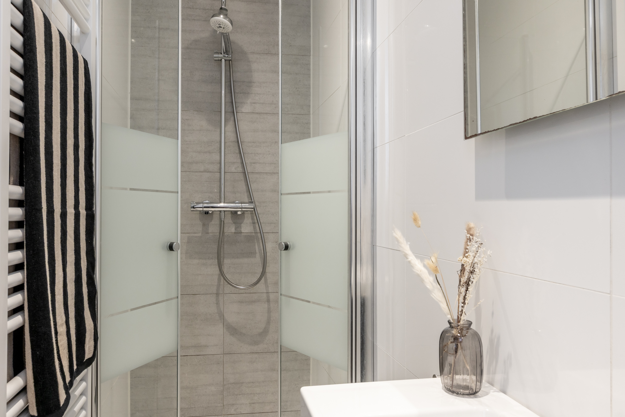 De slaapkamer is lekker ruim opgezet met grote raampartijen over de breedte. De badkamer is compleet uitgerust met een douchecabine, wastafel met zwevend meubel, toilet en handdoekradiator. Verder in de hal bevindt zich de meterkast en een vaste kast.
