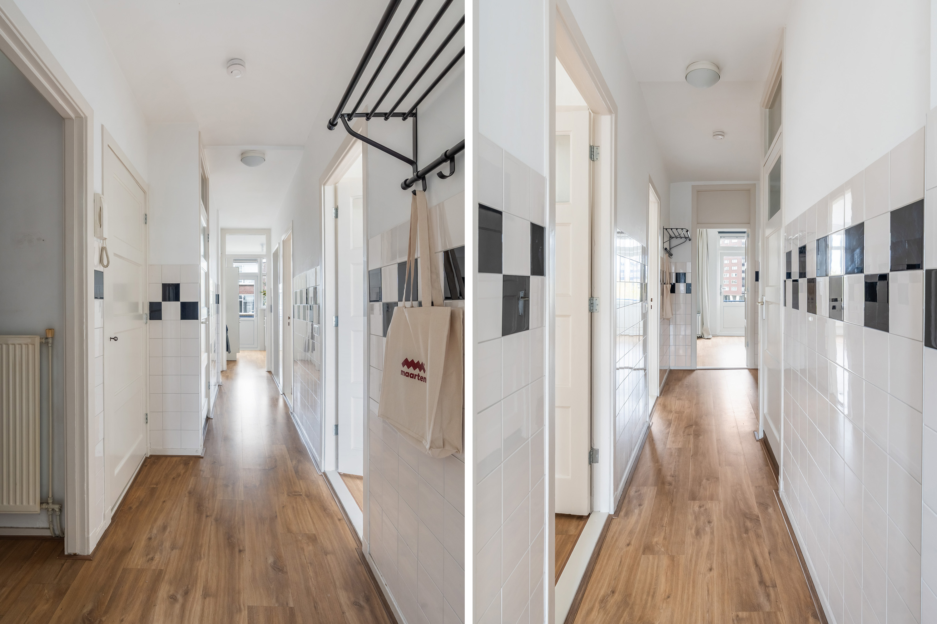 Entree in de lichte hal met intercom, meterkast en een handige kast met wasmachineaansluiting. Door het gehele appartement ligt een mooie laminaatvloer, wat zorgt voor een rustige en strakke uitstraling.