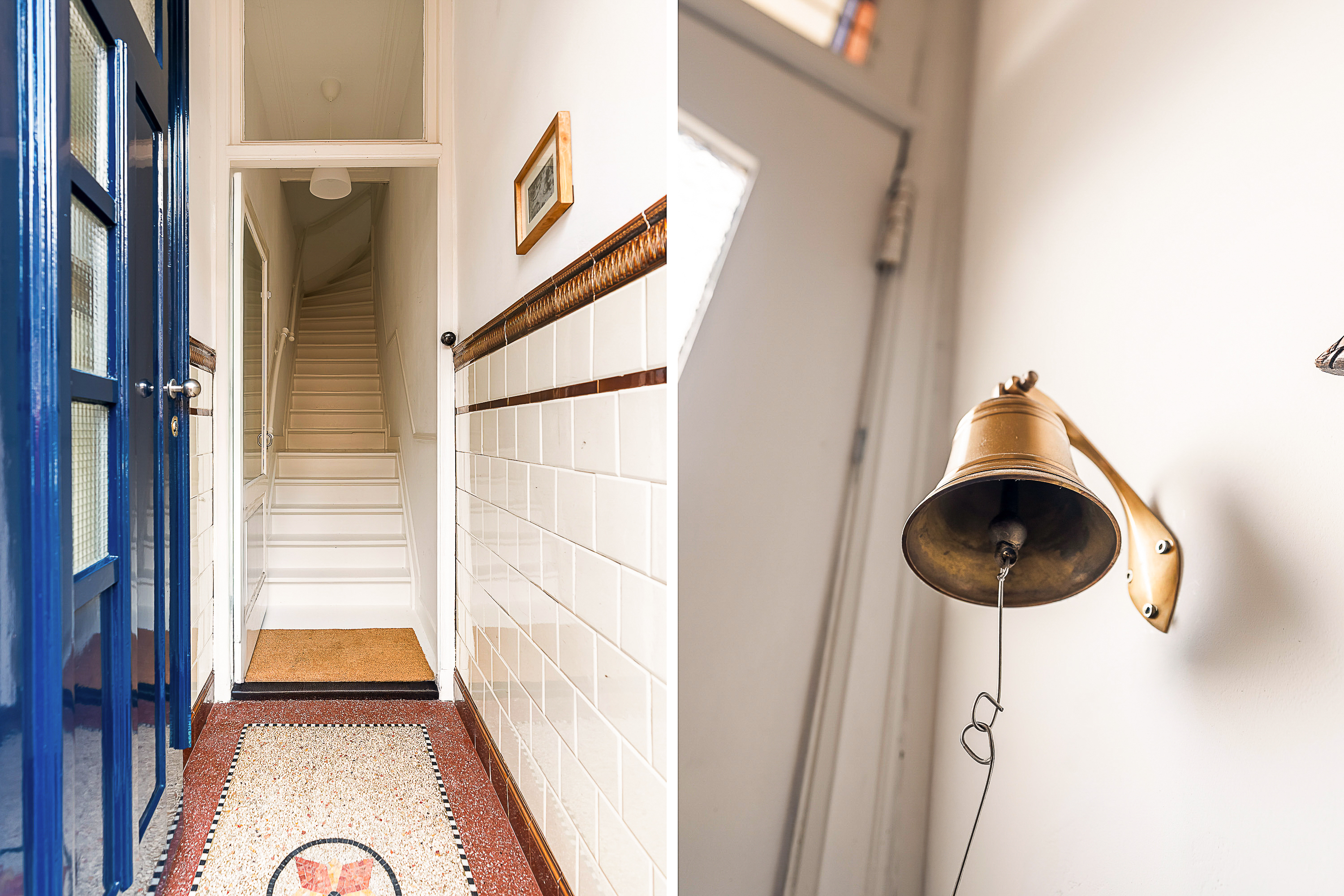 Eigen voordeur met trapopgang naar de eerste verdieping. Al bij binnenkomst voel je de prettige sfeer en de authentieke vloer en tegels in de entree zijn een echte eyecatcher.