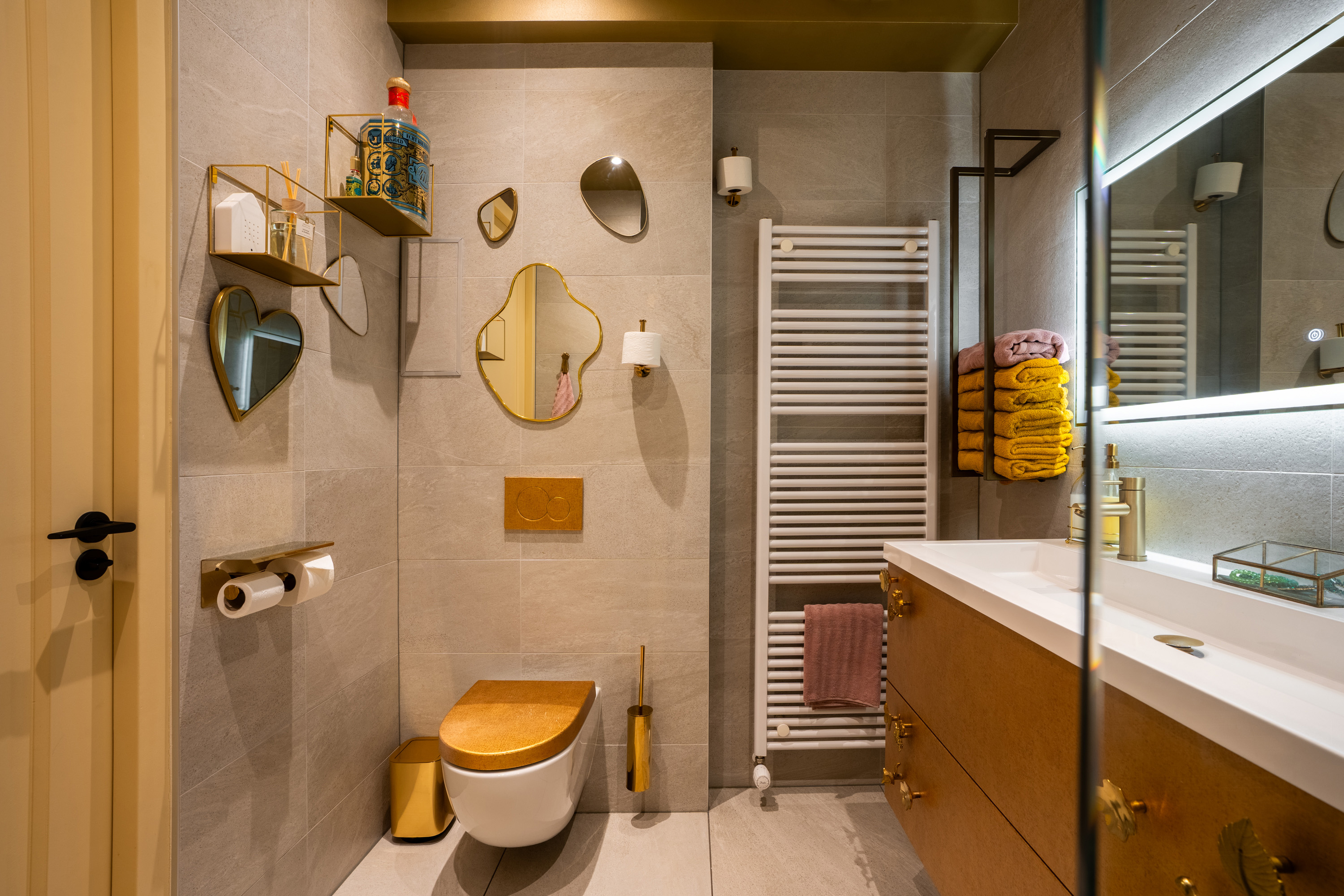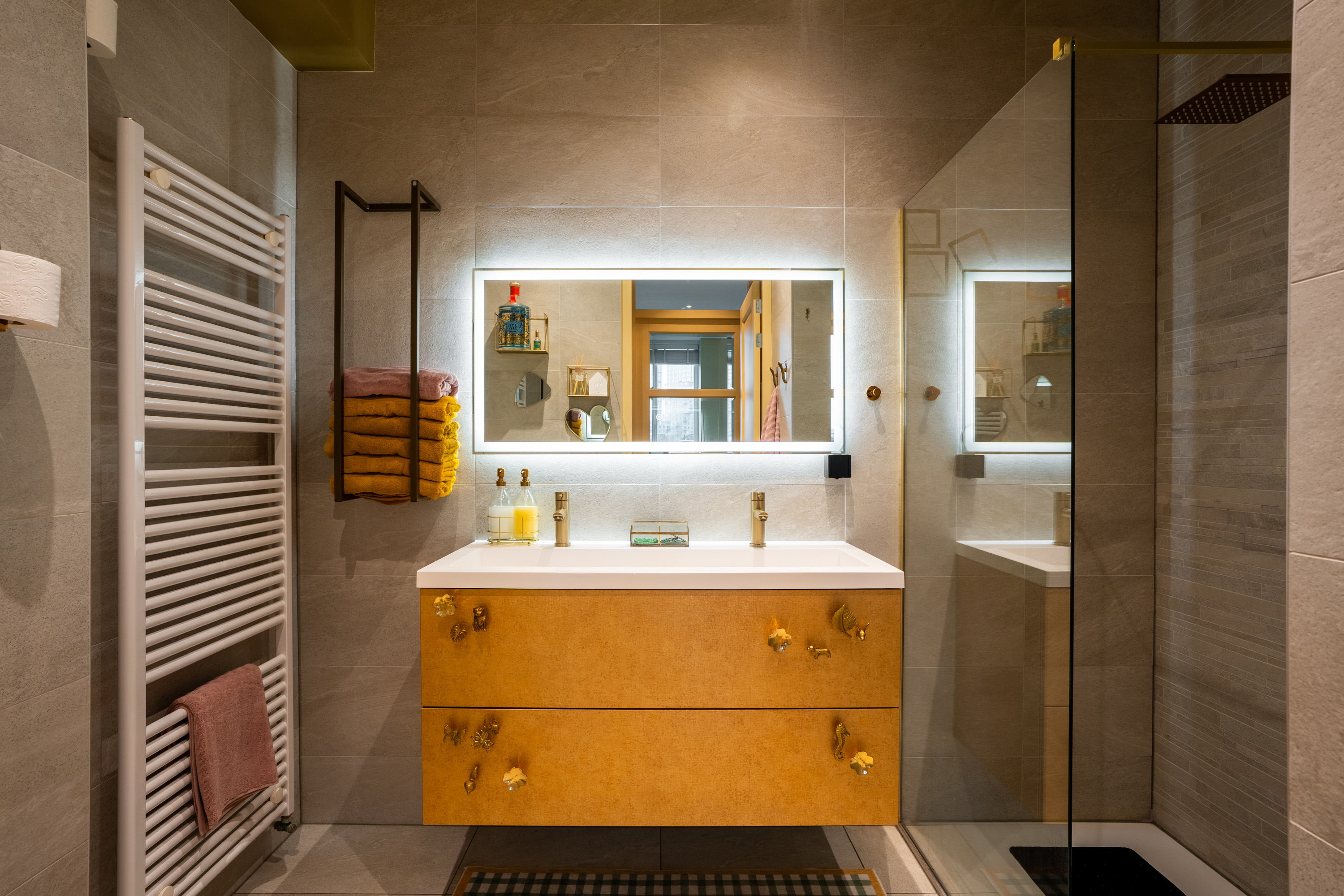In de hal is de badkamer gevestigd met een luxueuze uitstraling. Deze is uitgerust met een inloopdouche met rainshower, een dubbele wastafel met zwevend meubel, een verlichte spiegel, zwevend toilet en handdoekradiator. De trap brengt je naar de vijfde verdieping.