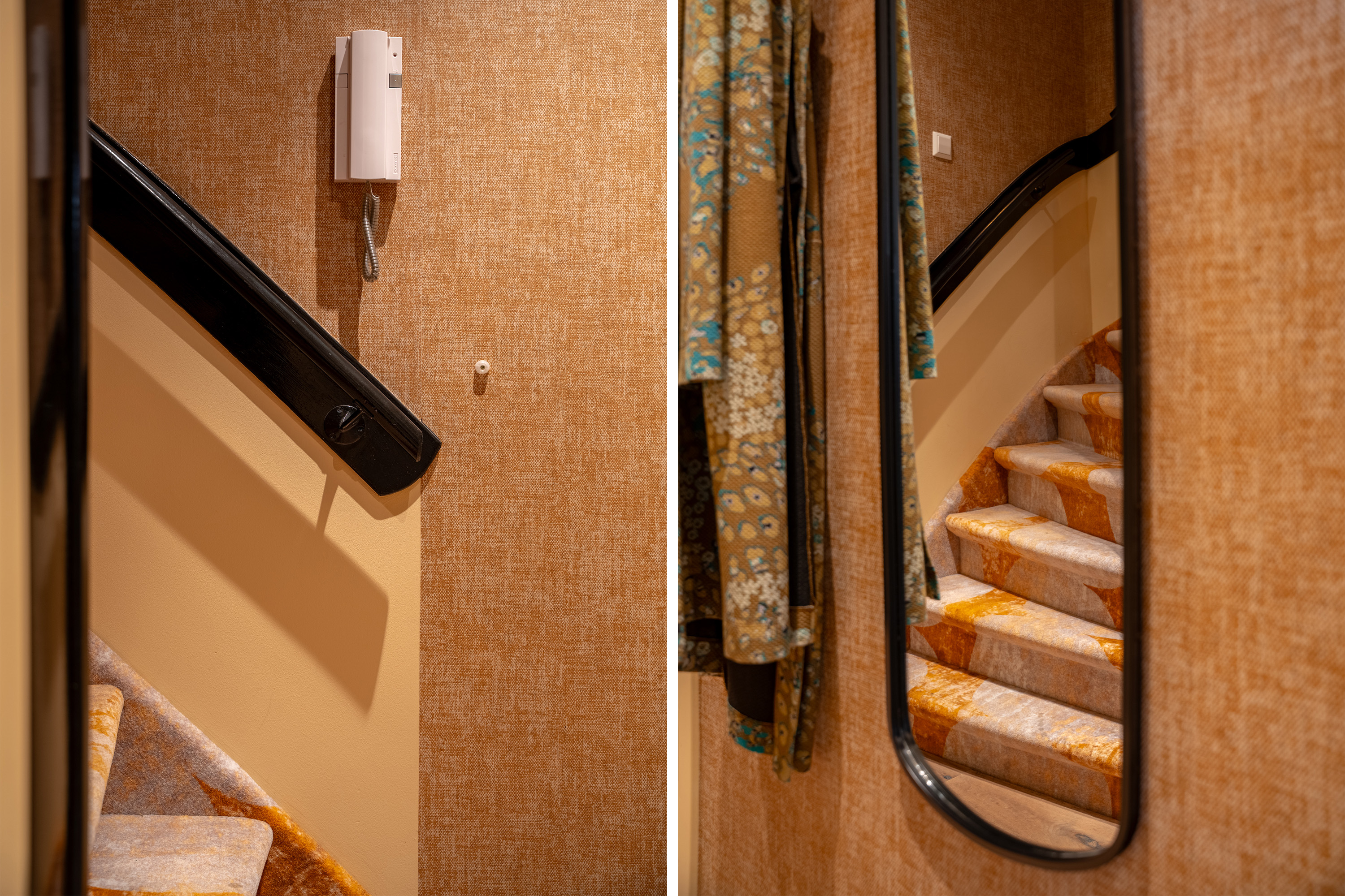 Gesloten portiek met bellentableau, brievenbussen lift en trappenhuis.