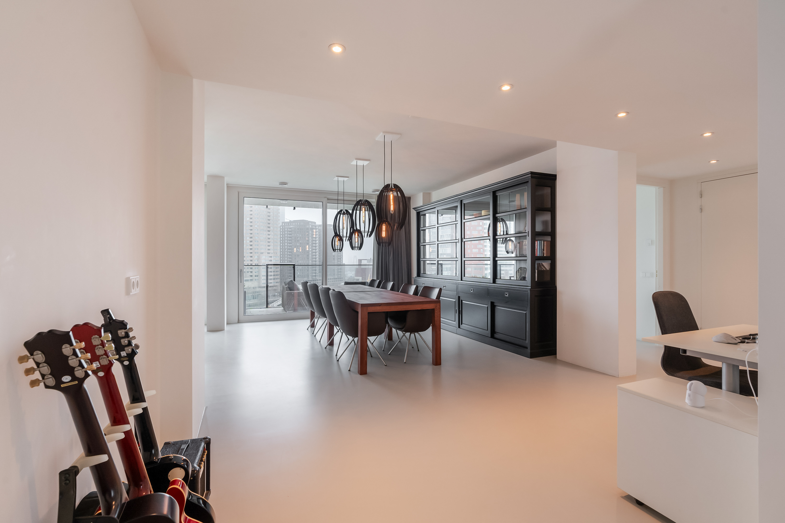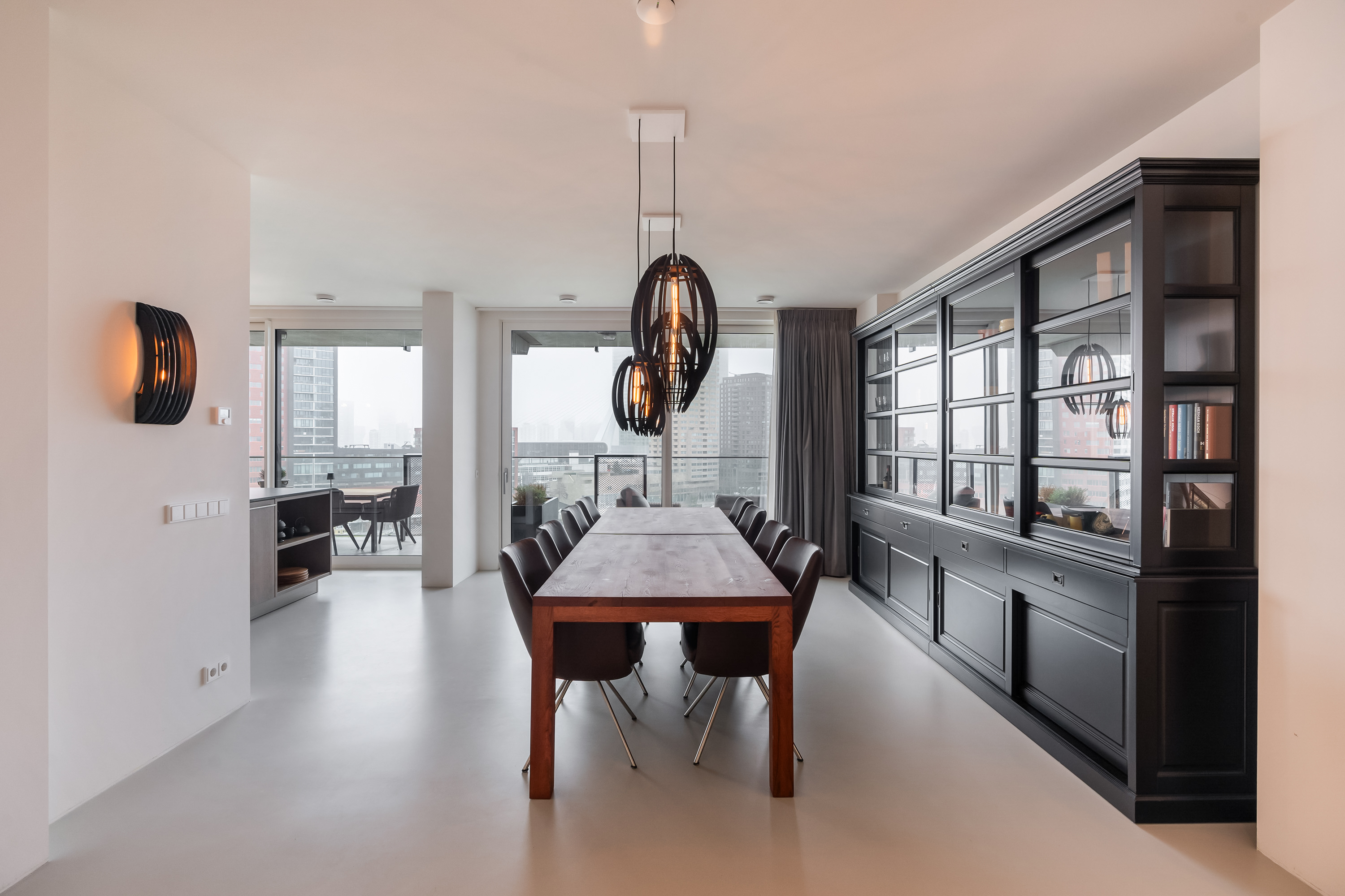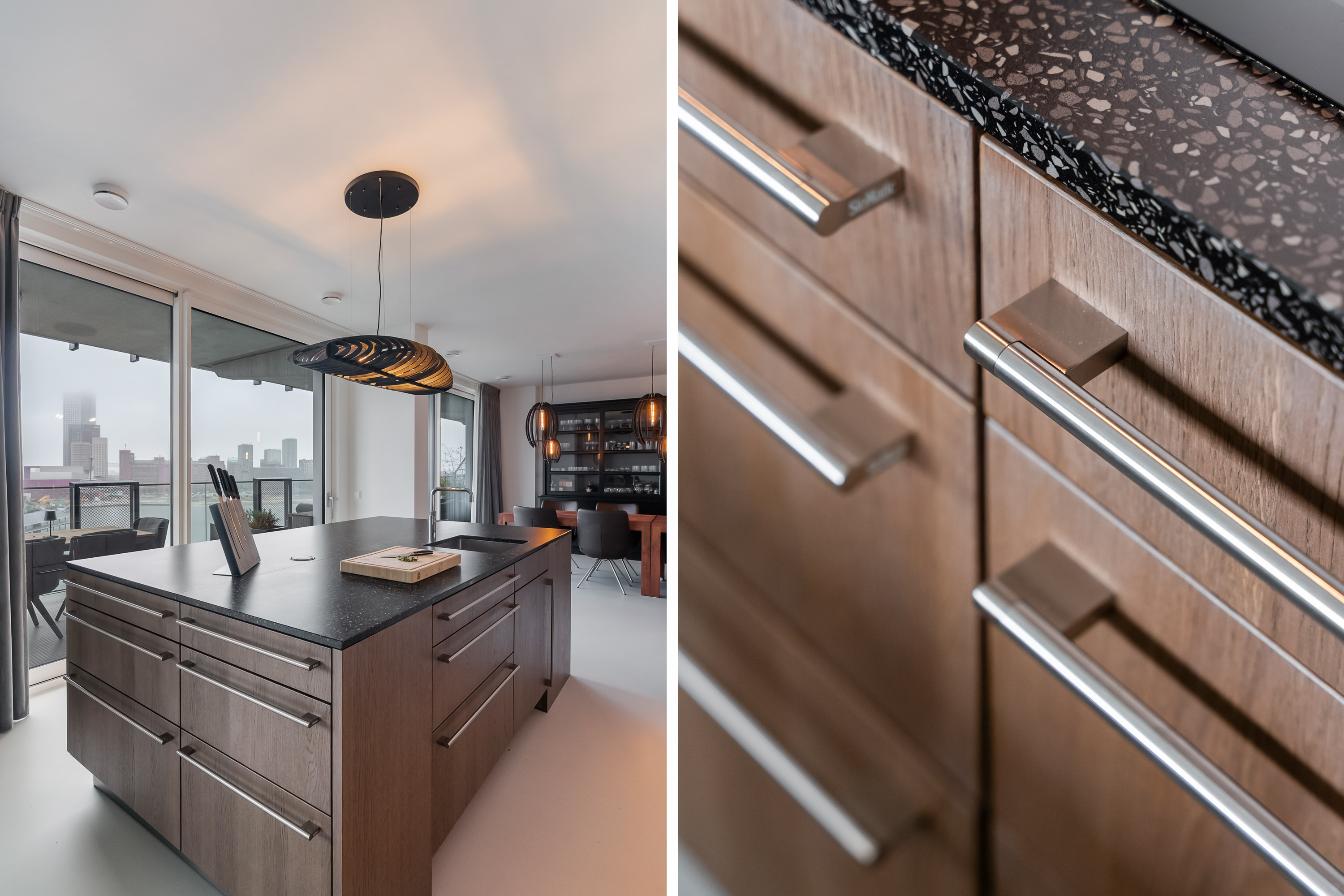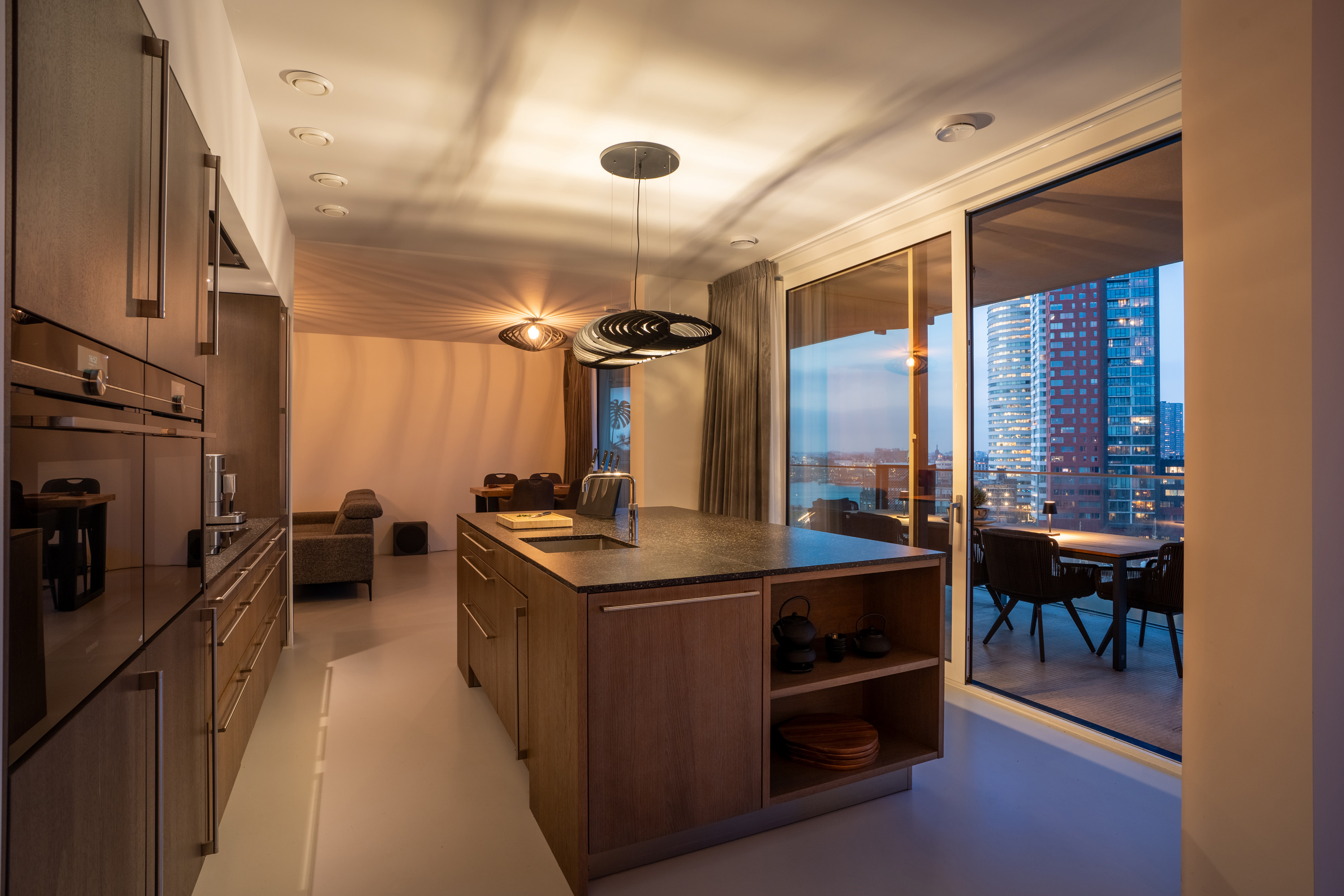 Zodra je de woning binnenstapt, voel je het meteen: ruimte, licht en uitzicht. De royale hal geeft toegang tot alle vertrekken en biedt voldoende ruimte voor een garderobekast. De leefruimte is indrukwekkend groot en dankzij de loftindeling (ontworpen door Seventeenone.nl) en hoge raampartijen baadt deze in het licht. De woonkamer, keuken en eetkamer lopen vloeiend in elkaar over en bieden een fantastisch zicht op de Maas en de skyline van Rotterdam. De gehele woning is voorzien van een Domotica Systeem van Busch Jaeger, hiermee kun je slim schakelen en diverse ruimtes verlichten. Ook de aansturing van de elektrische over-gordijnen en het aan-uit schakelen van sommige stopcontacten gaat via dit systeem, hoe handig?