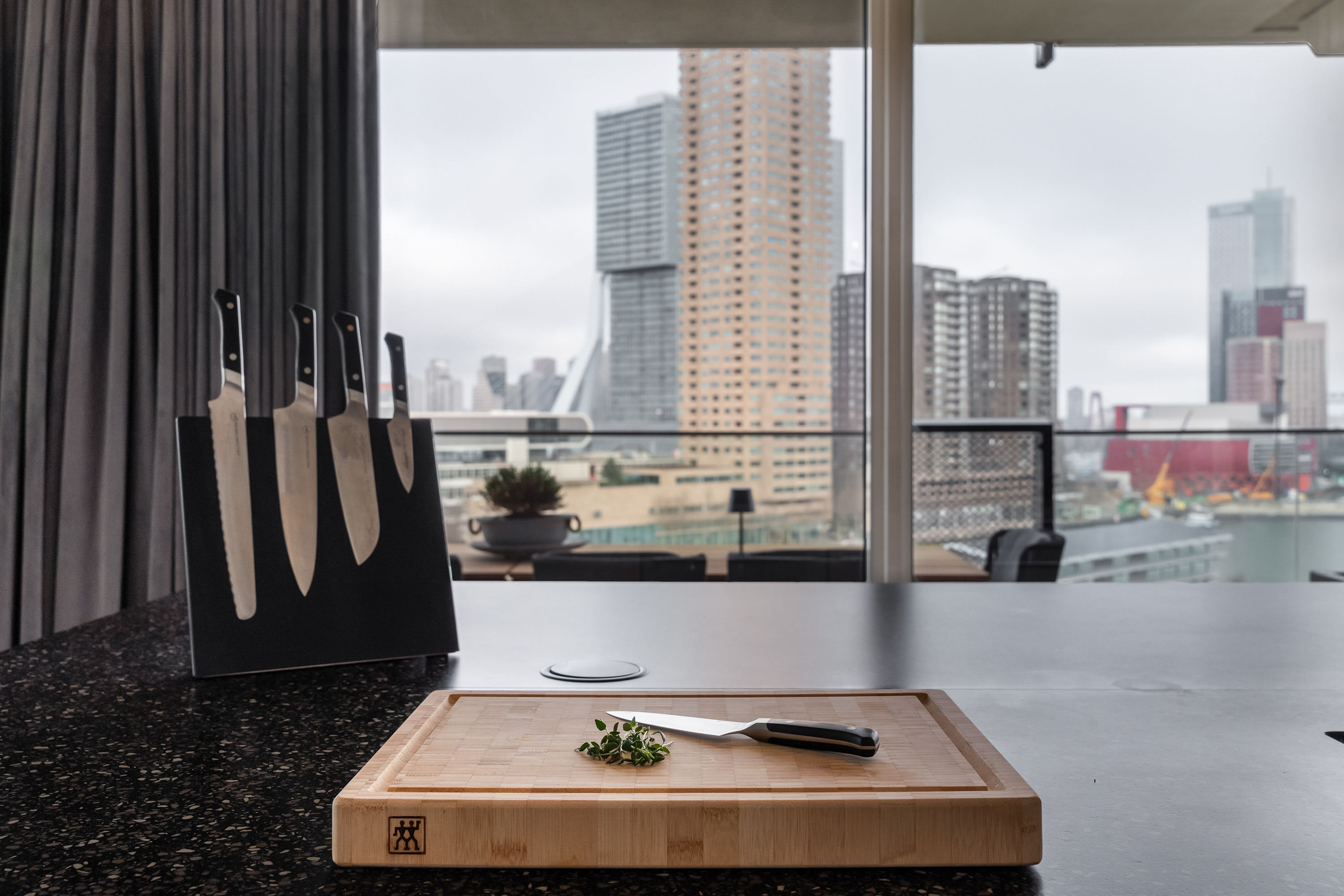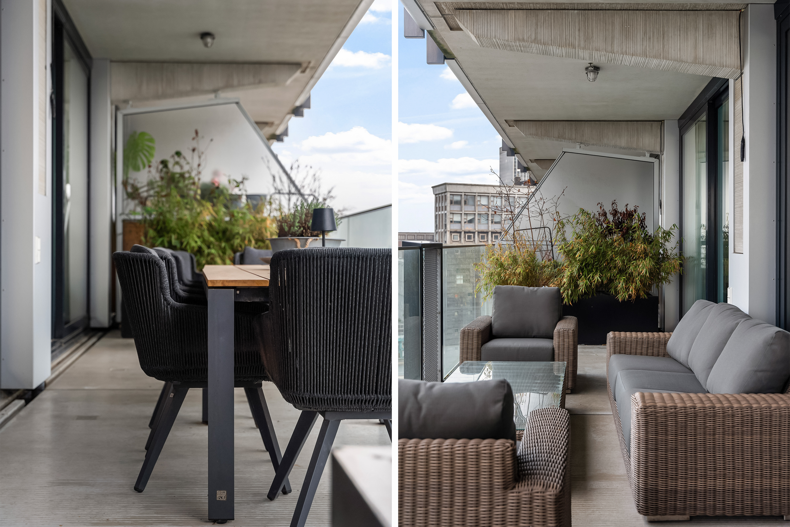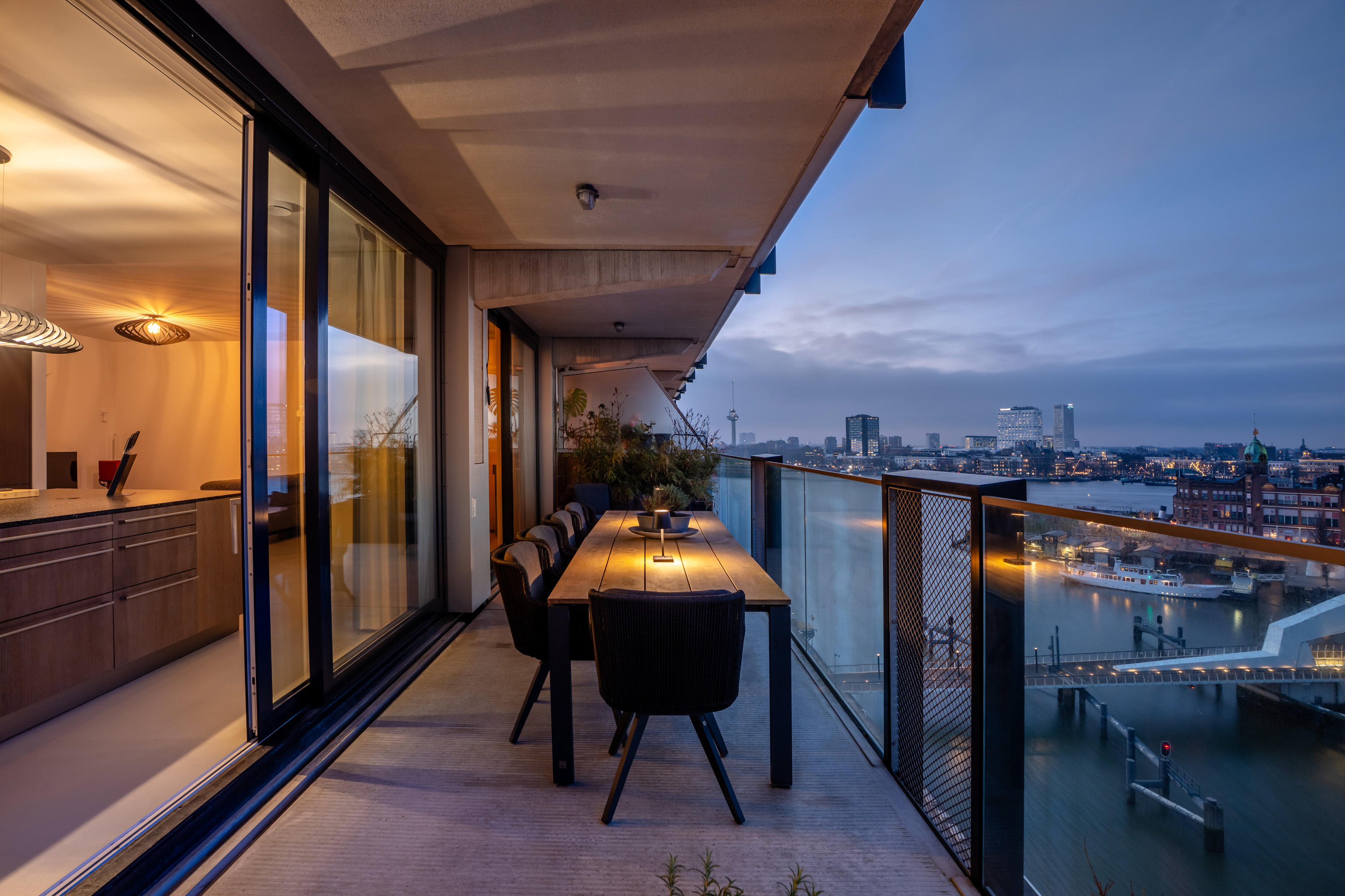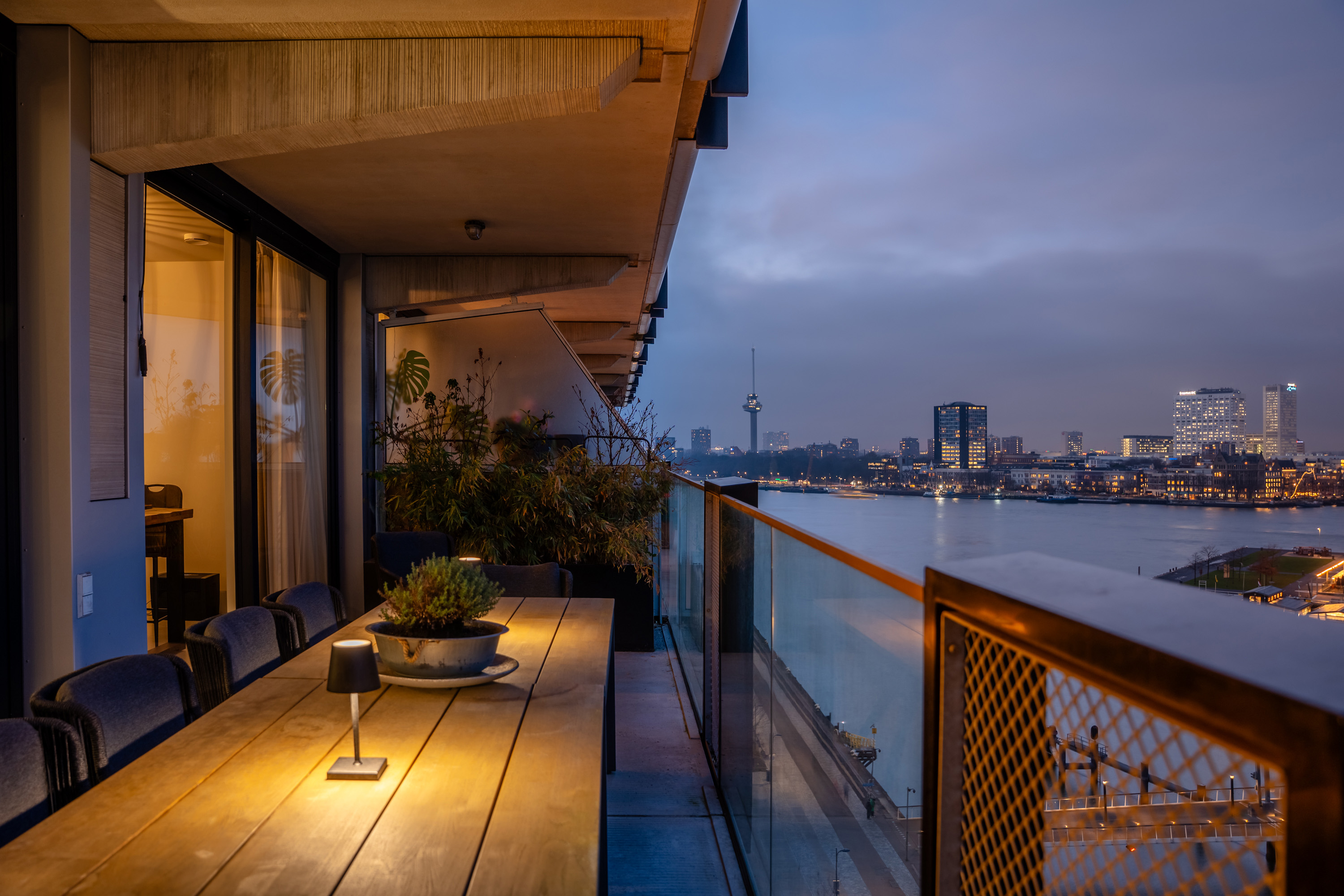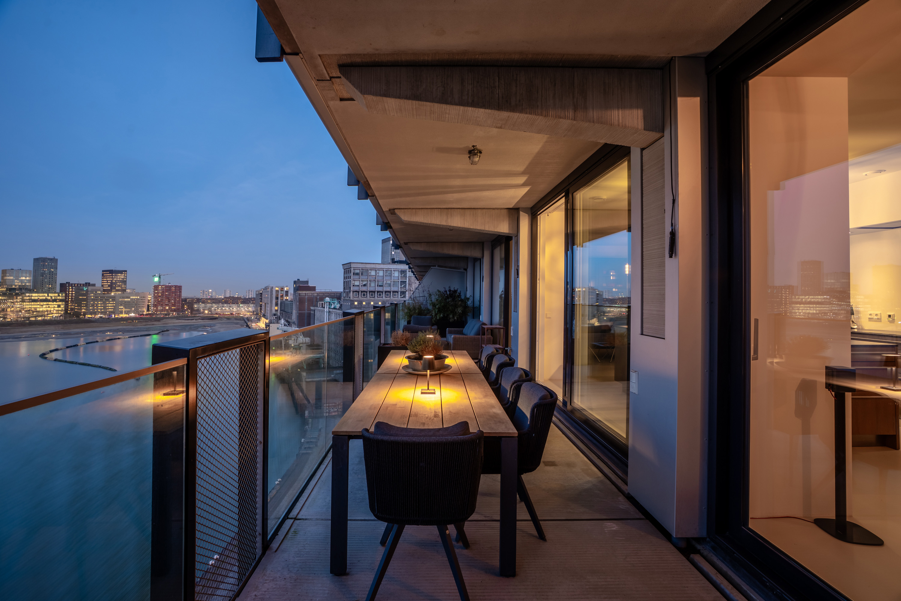 Het terras is circa 19 m² groot en werkelijk een verlengstuk van de woning. Er is plek voor een grote loungeset én een eettafel, ideaal voor lange zomeravonden met vrienden en familie, terwijl de zon langzaam ondergaat achter de stad. Je kunt hier echter het héle jaar genieten van het mooie uitzicht en het terras.
