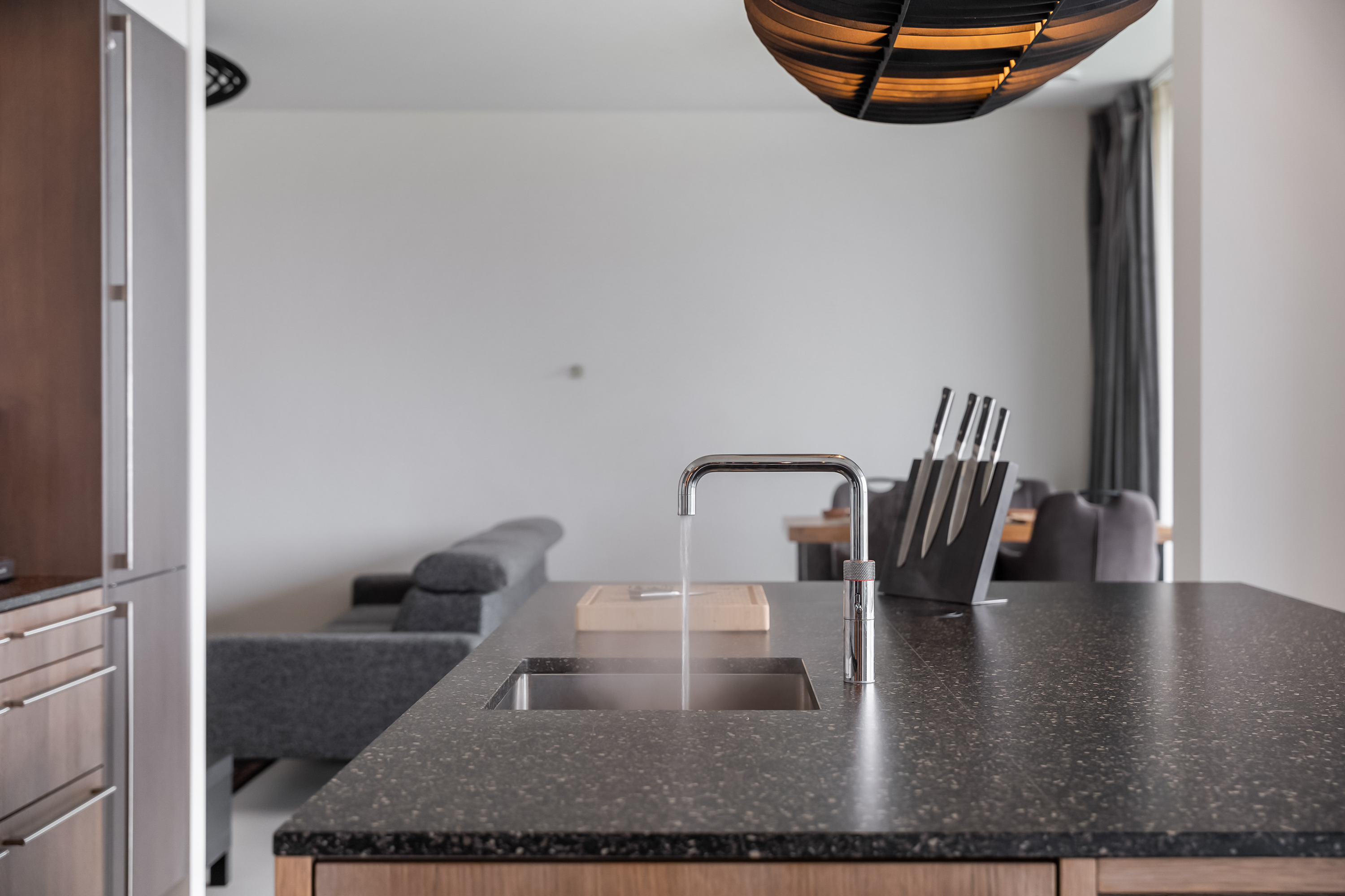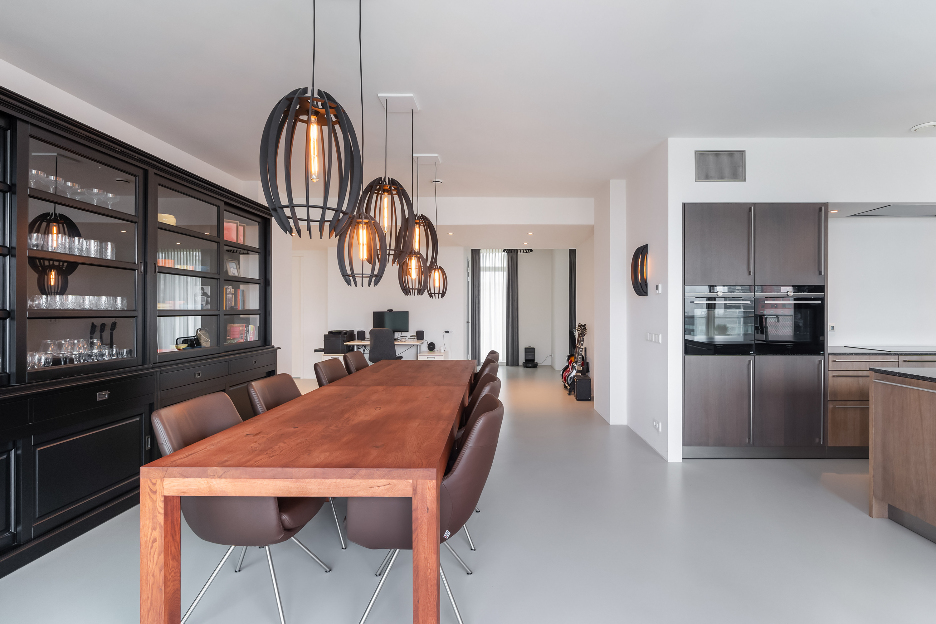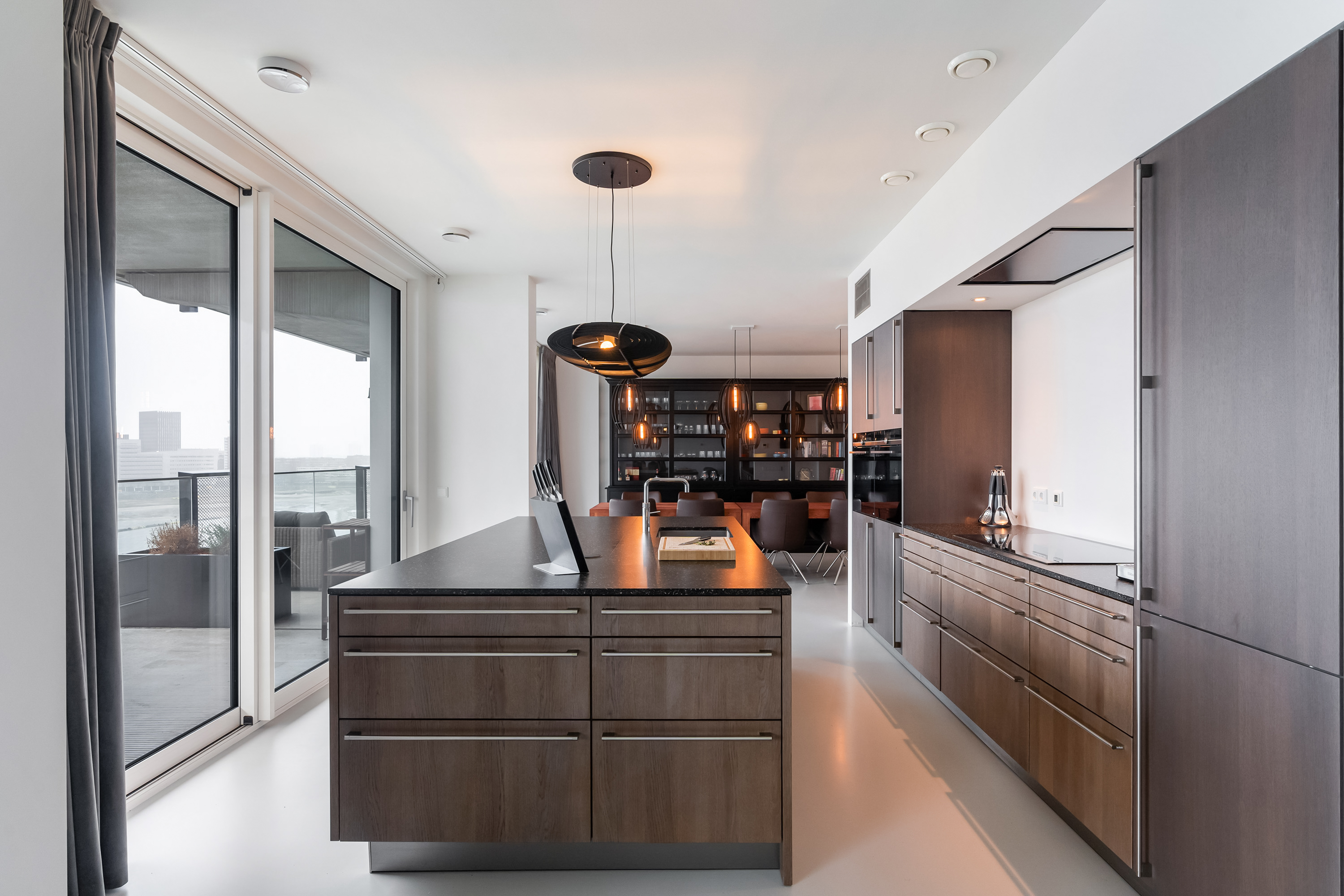 De keuken is zonder twijfel de eyecatcher van de woning. Een luxe, moderne keuken met een groot kookeiland, hoogwaardige inbouwapparatuur en volop werk en kastruimte. Hier kook je niet alleen, hier leef je. Vanuit de keuken stap je via een schuifpui zo het royale terras op.