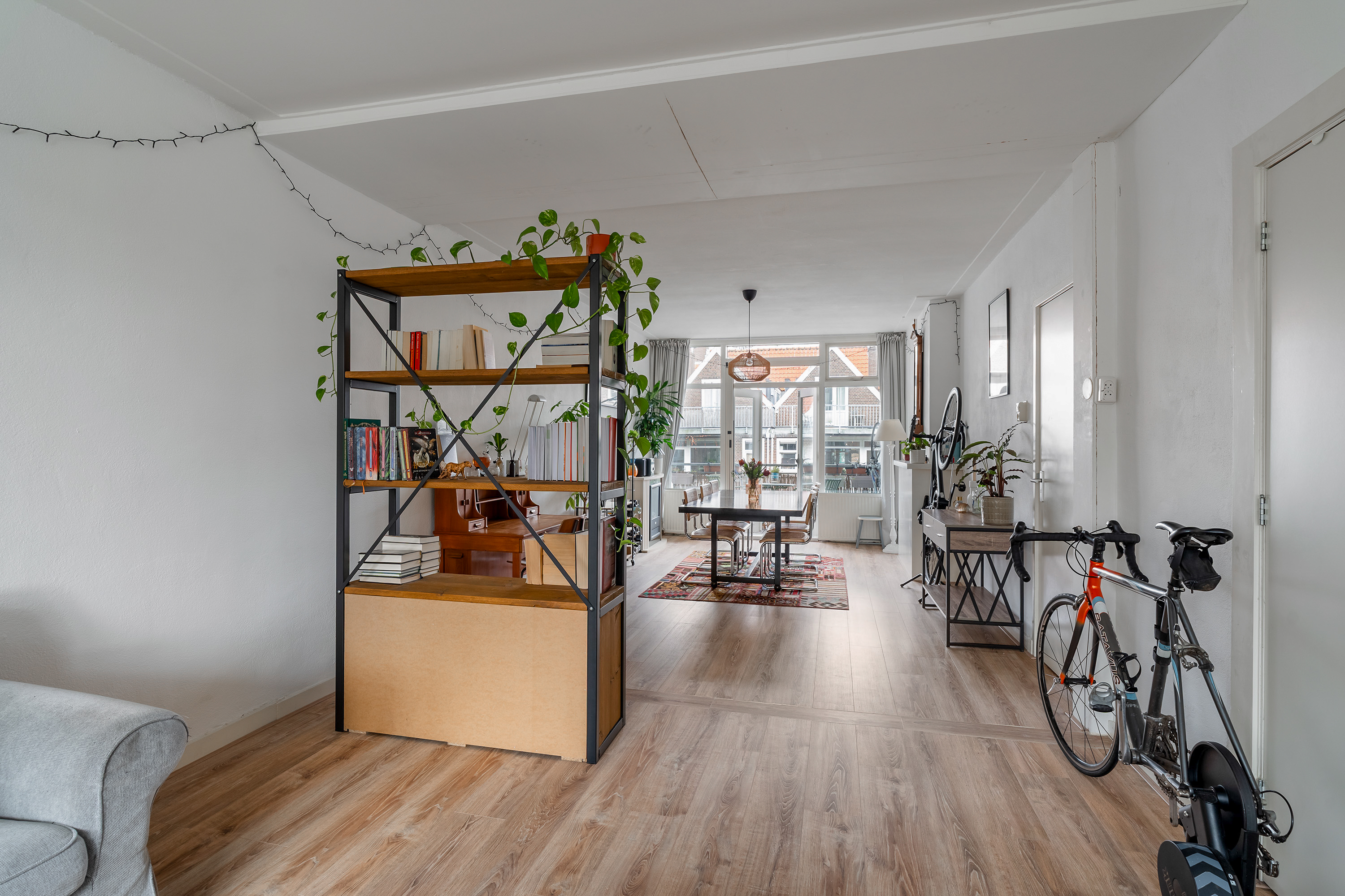 Entree in de hal met toegang tot de verschillende vertrekken. De doorzonwoonkamer is heerlijk licht dankzij de grote raampartijen aan zowel de voor als achterzijde. Hier creëer je met gemak een sfeervolle zitruimte en een royale eethoek.