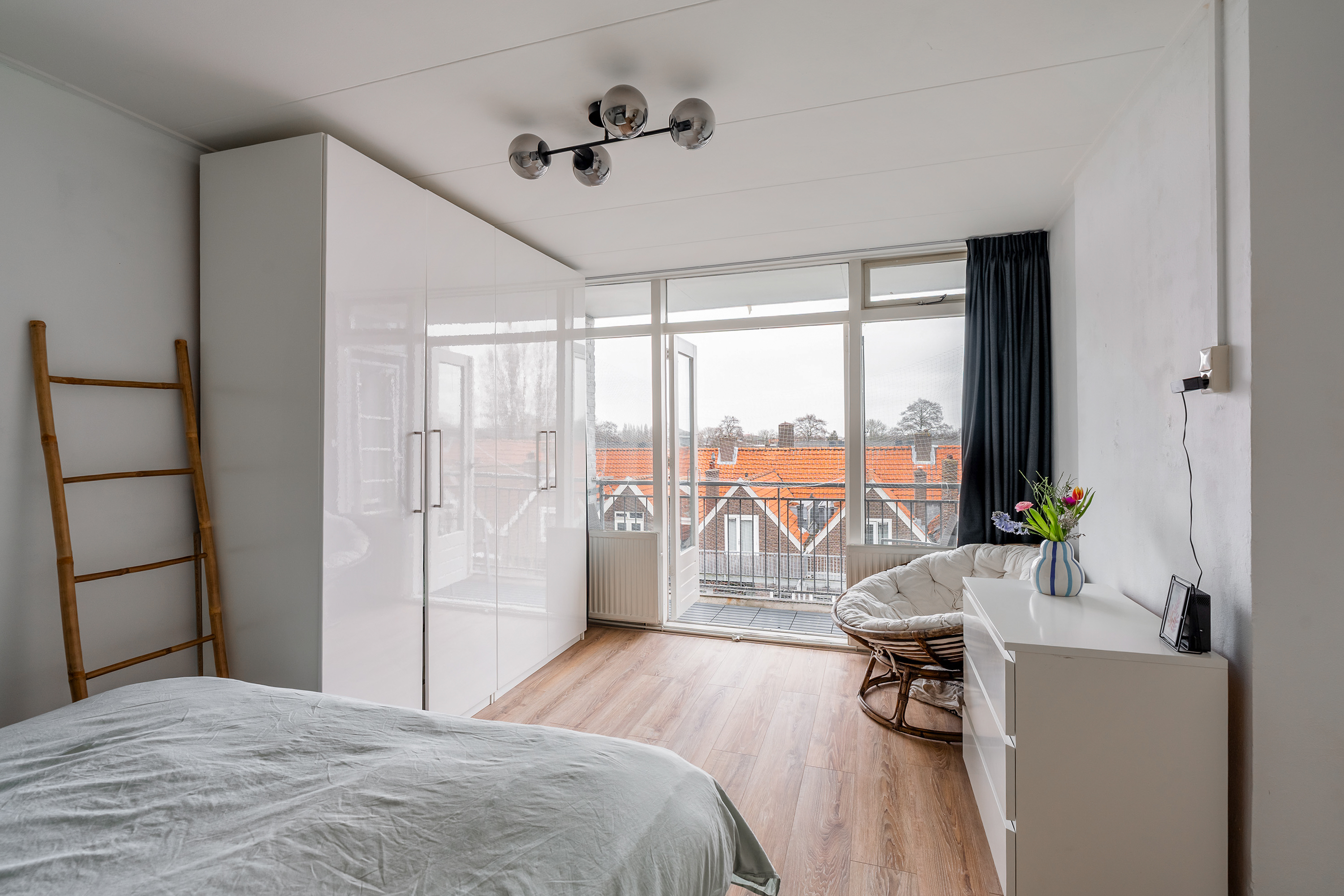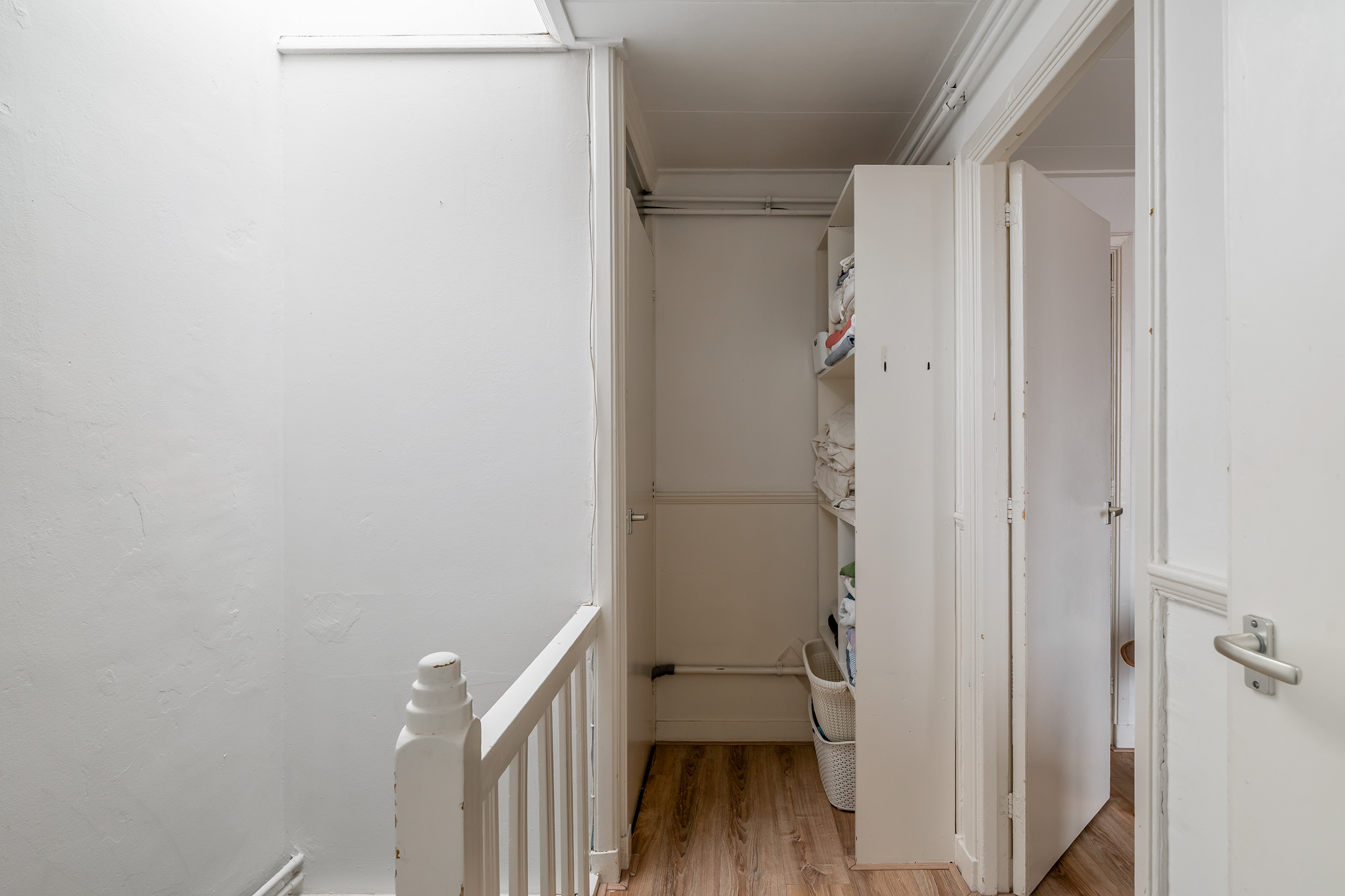Aan de achterzijde bevindt zich de dichte keuken met tevens ook toegang tot het eerste balkon op het noordoosten. Een fijne plek voor een kop koffie in de ochtendzon. Je hebt vanuit de woonkamer ook doormiddel van openslaande deuren toegang tot dit balkon. Op deze verdieping is een extra kamer aanwezig die uitstekend kan dienen als kinder-, werk- of logeerkamer en op de overloop vind je een separaat toilet met fonteintje.