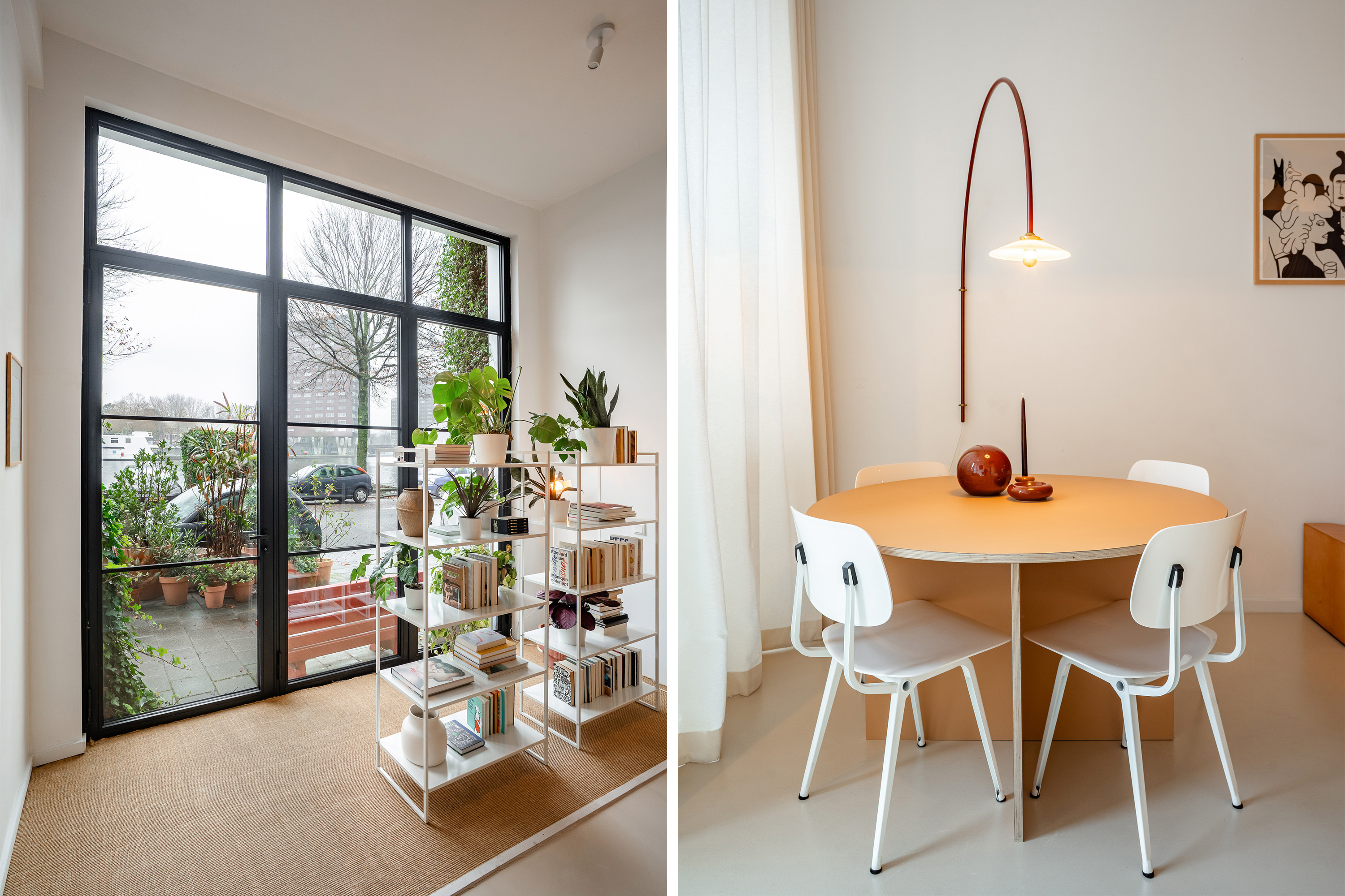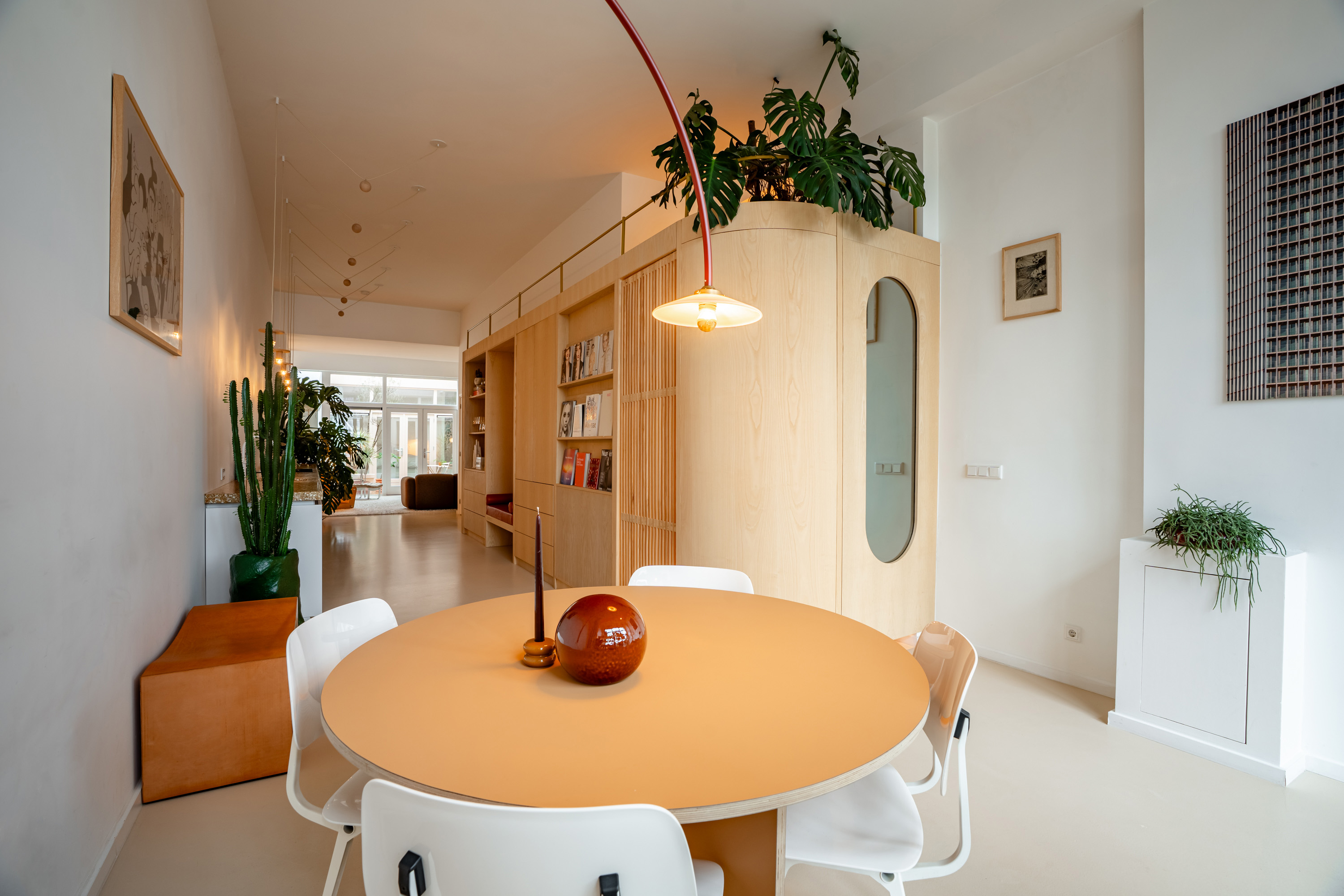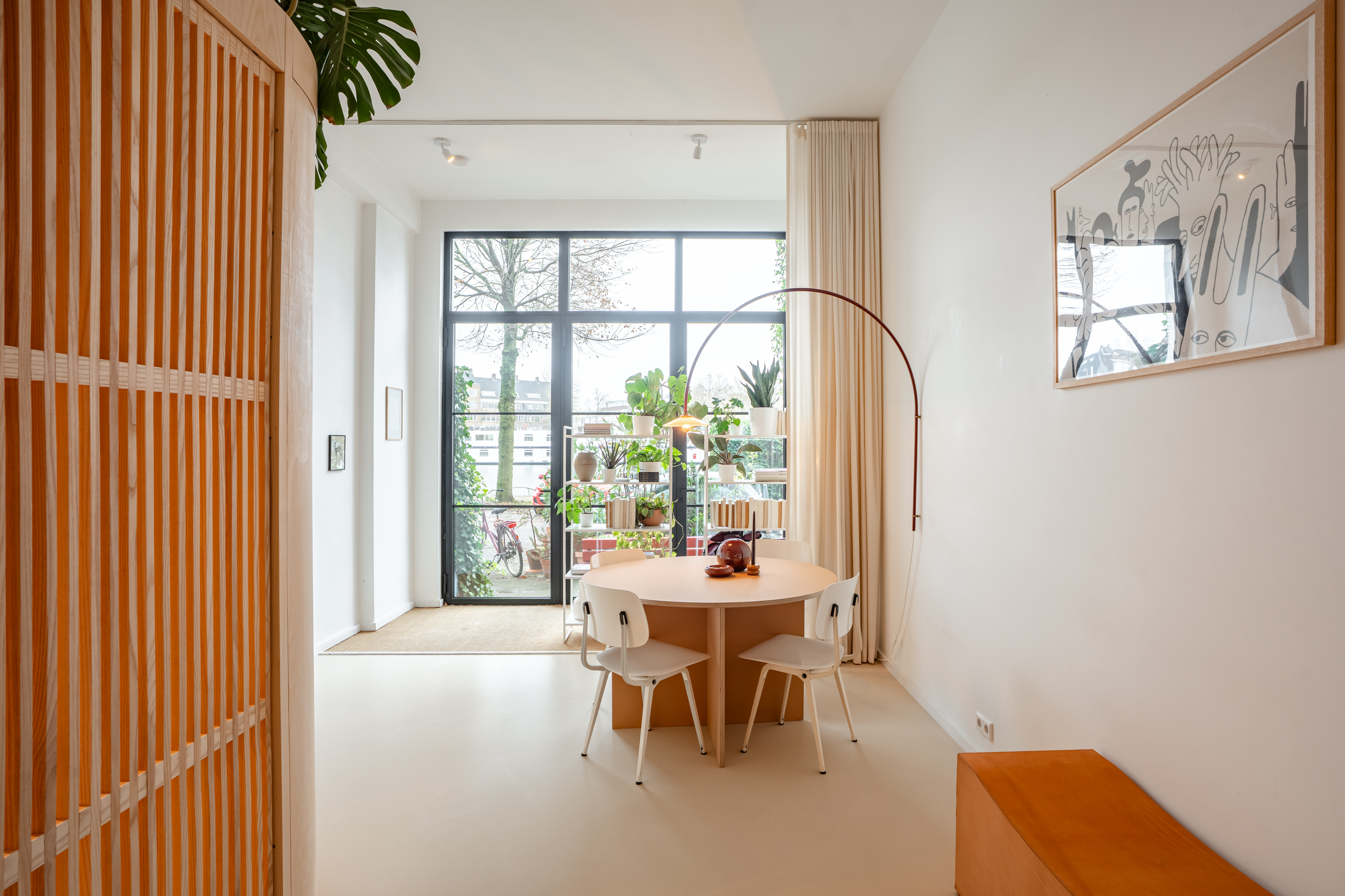 Via de grote glazen pui stap je binnen in de woning waar direct de serene sfeer en het prachtige licht opvallen. De eettafel is centraal gesitueerd en vormt een fijne plek voor diners of een kop koffie in de ochtend. In de hal bevindt zich de garderobe en het separate toilet met fonteintje, strak en modern uitgevoerd.