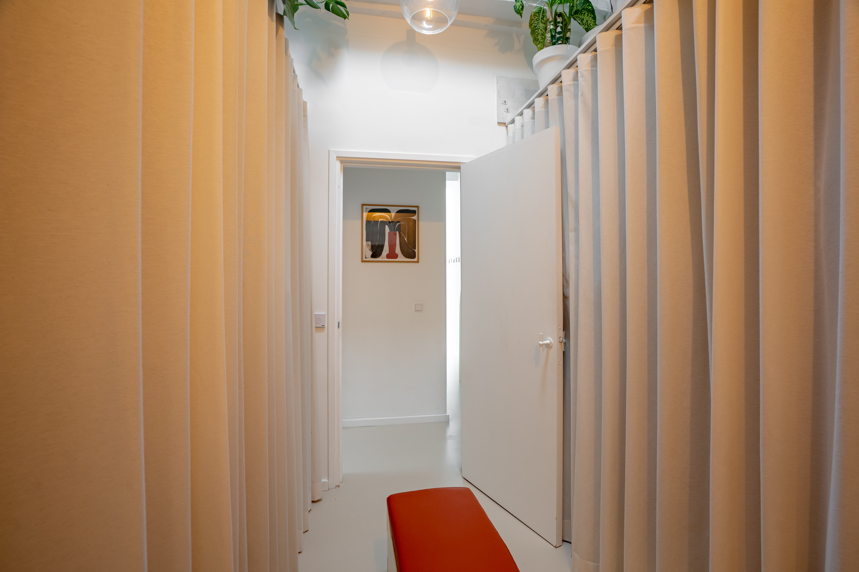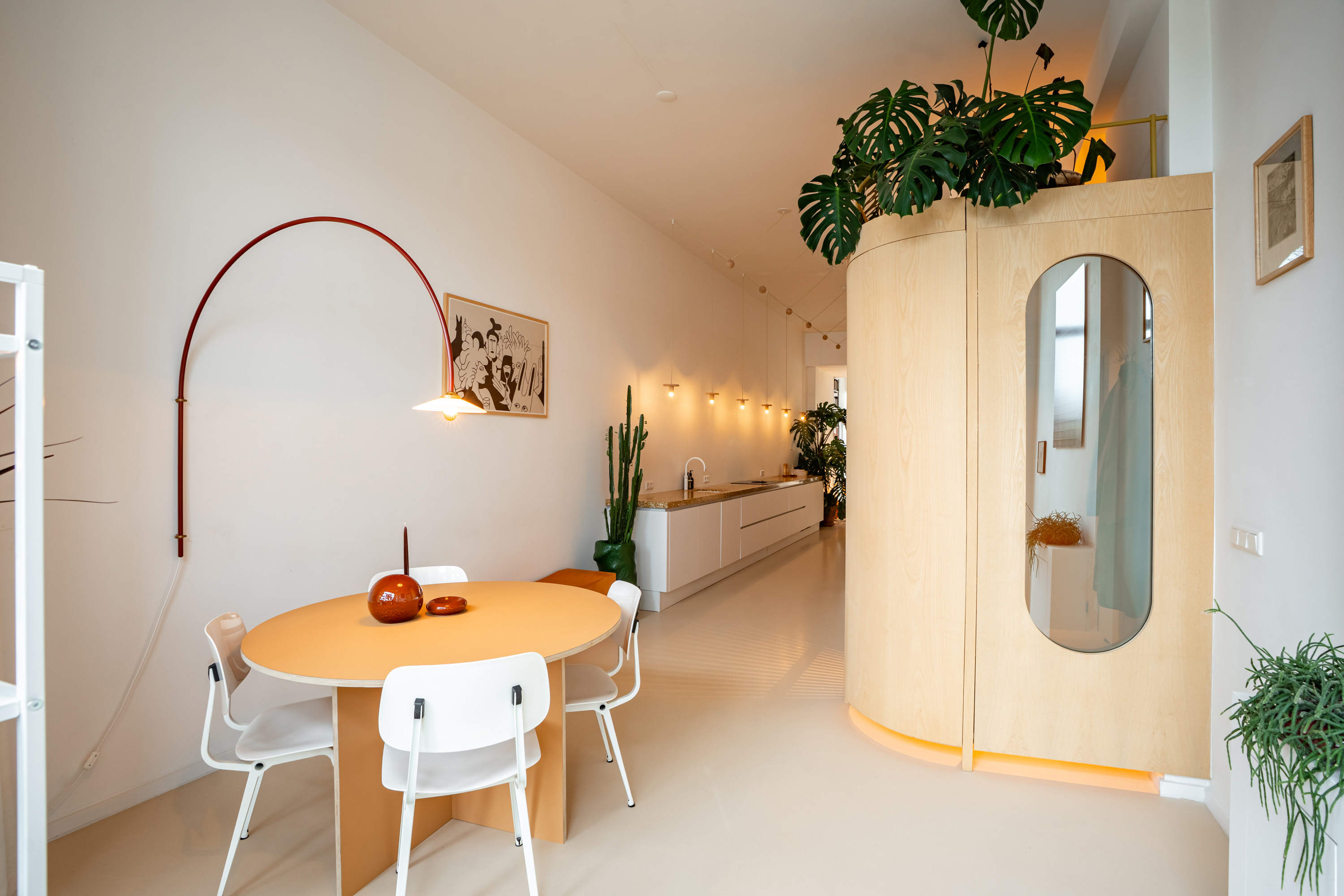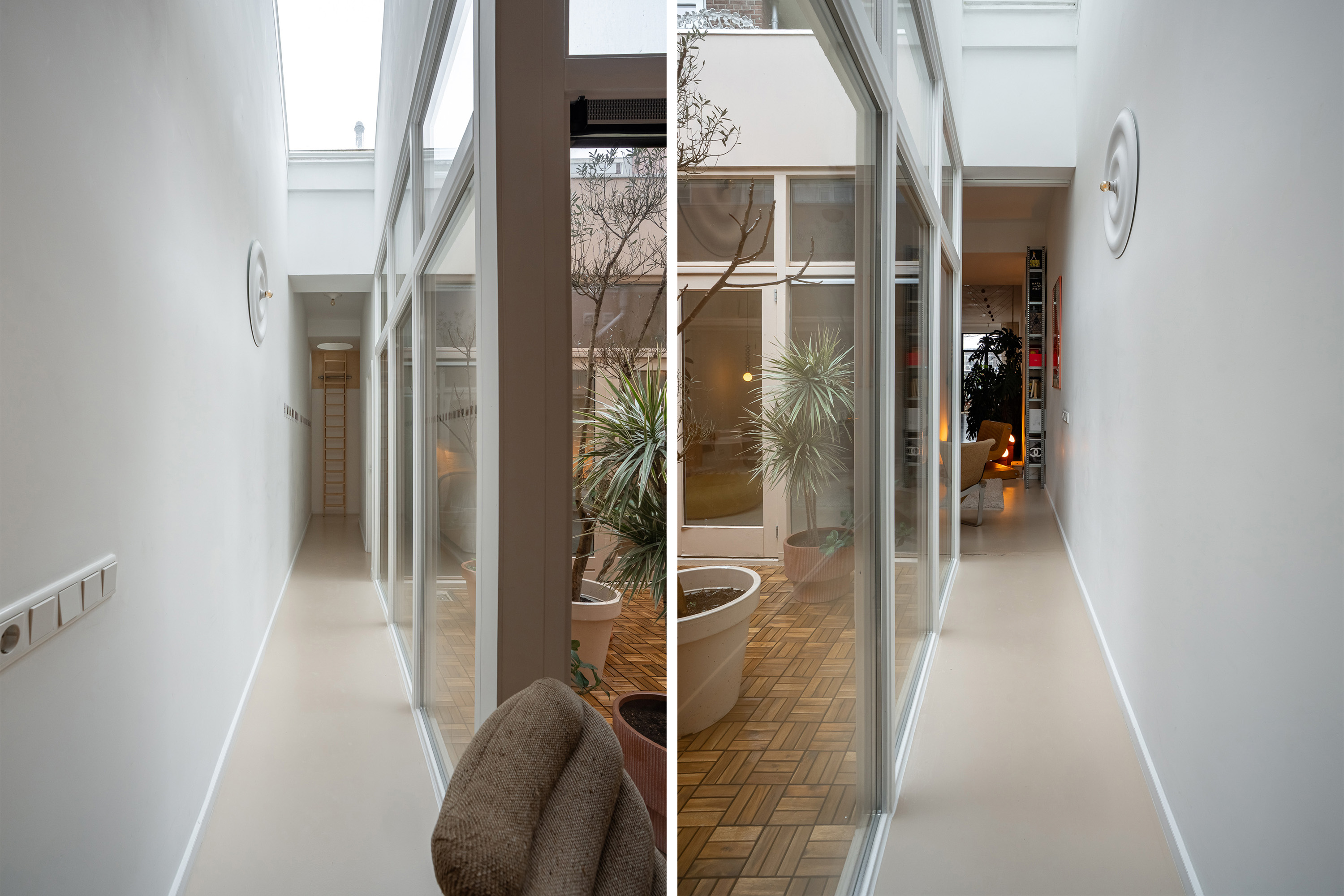 Via de grote glazen pui stap je binnen in de woning waar direct de serene sfeer en het prachtige licht opvallen. De eettafel is centraal gesitueerd en vormt een fijne plek voor diners of een kop koffie in de ochtend. In de hal bevindt zich de garderobe en het separate toilet met fonteintje, strak en modern uitgevoerd.