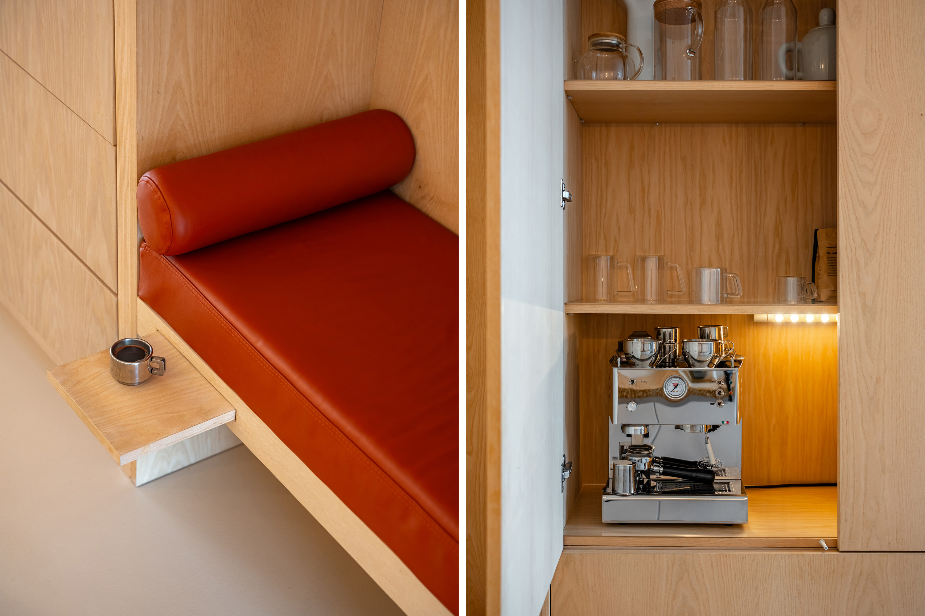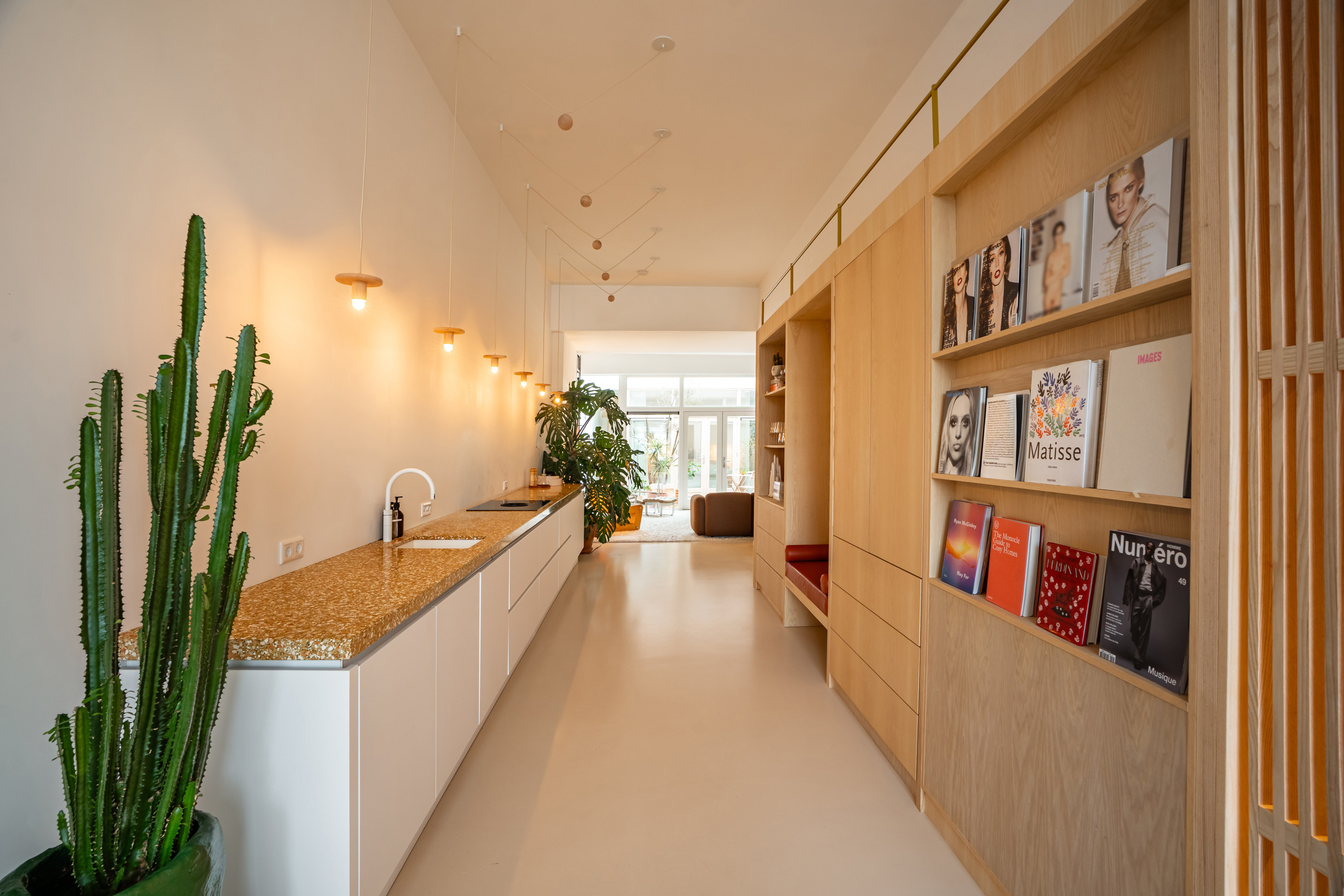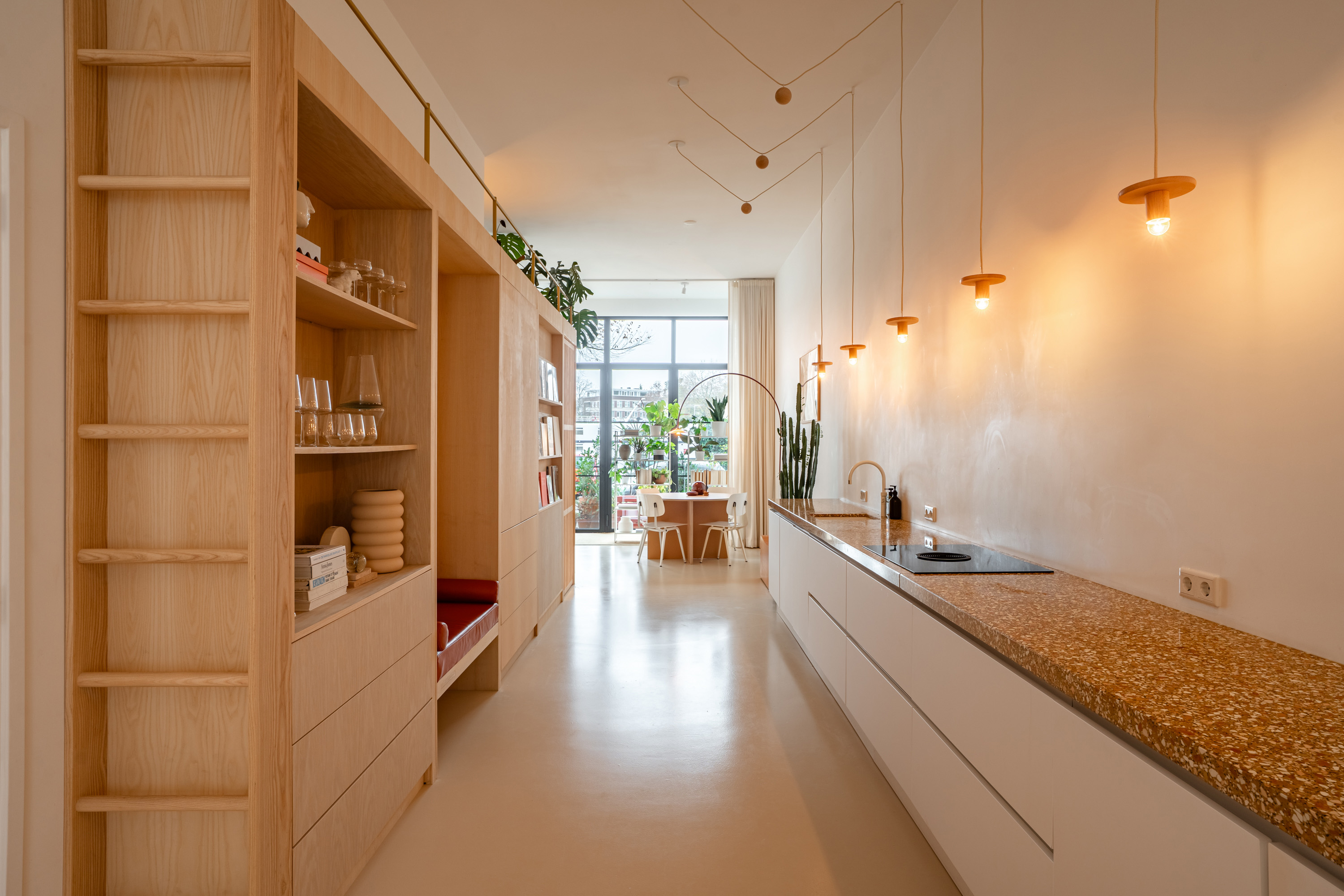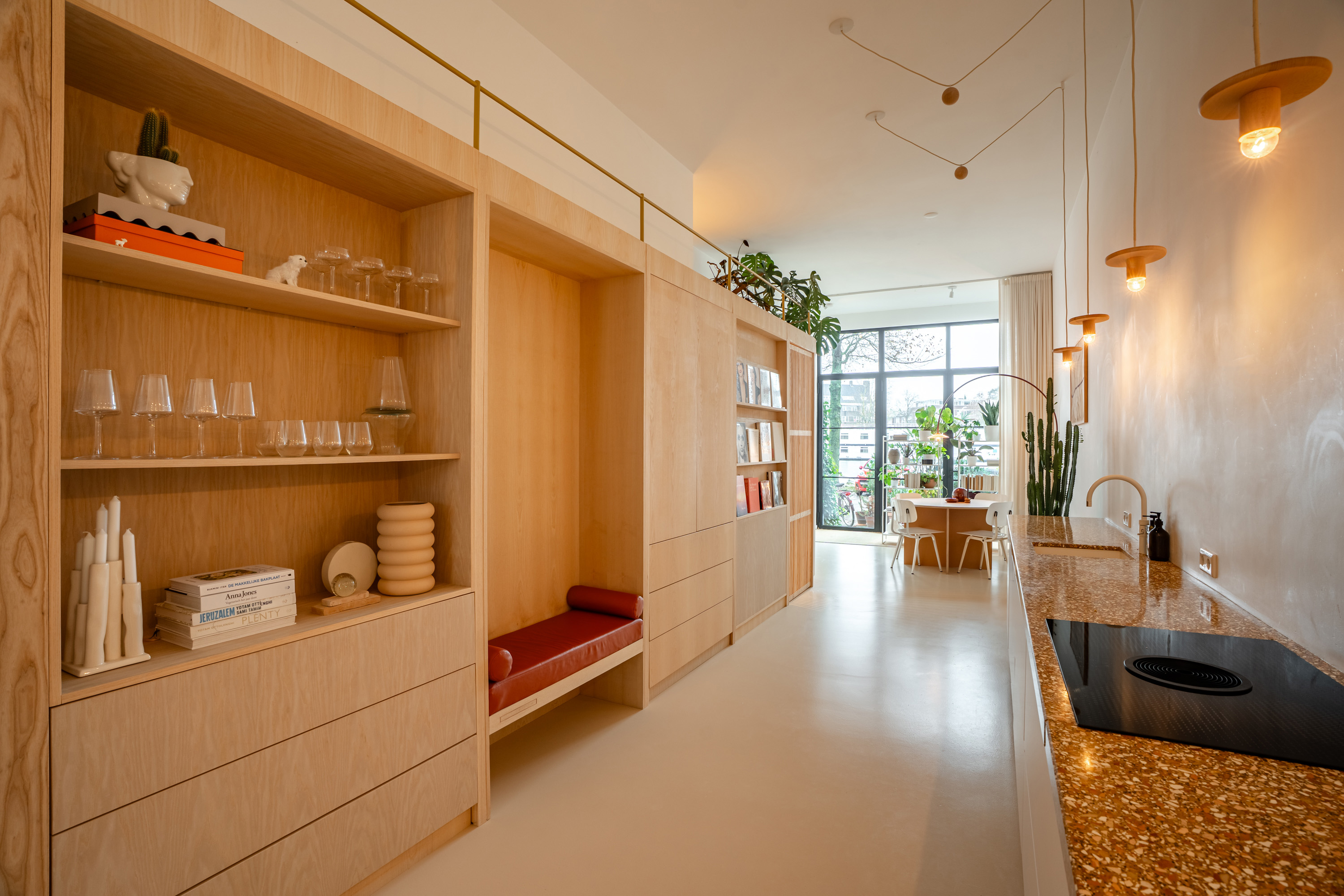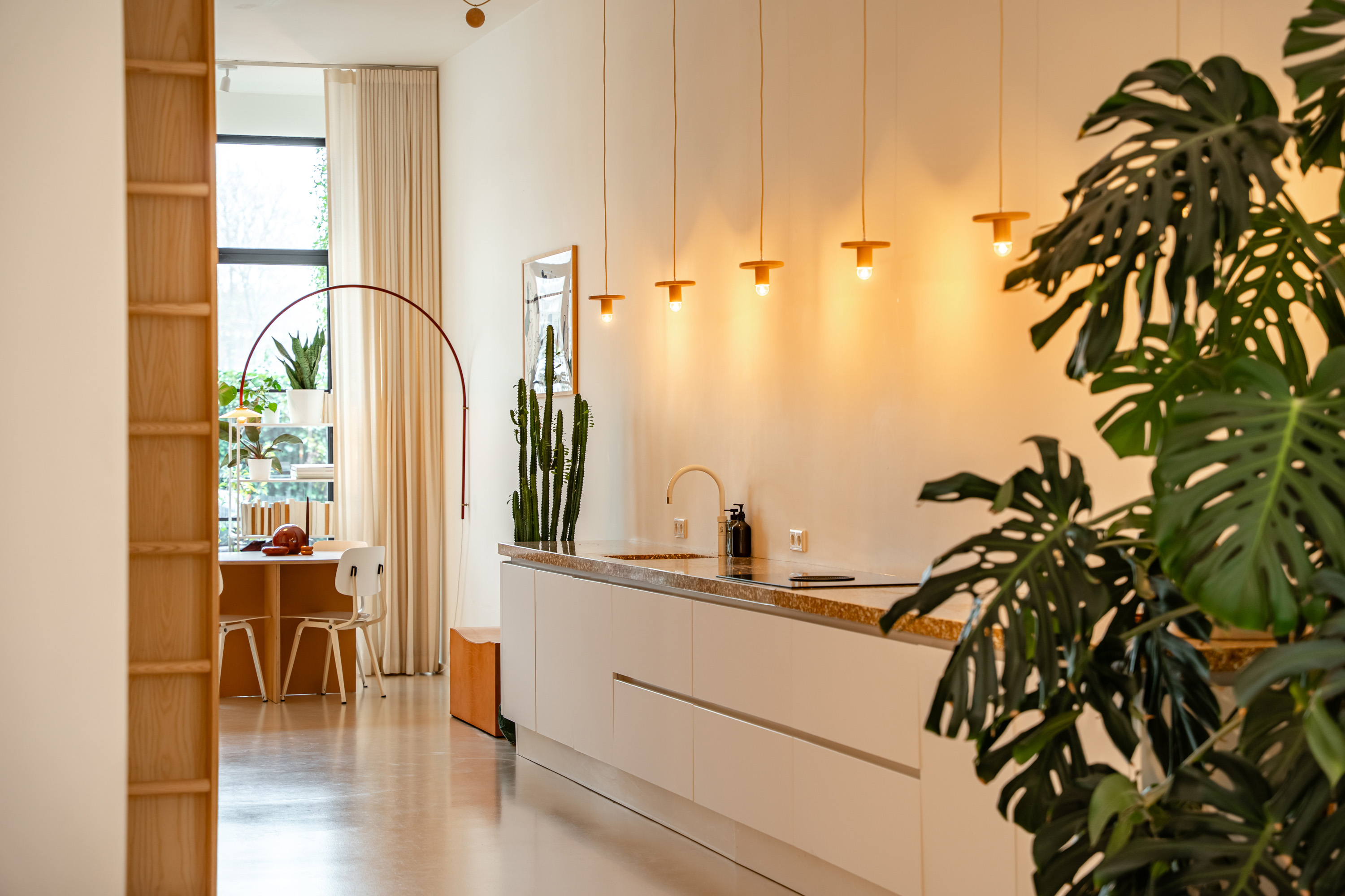 De lichte gietvloer, die door de hele woning loopt, zorgt voor een rustige basis en een ruimtelijk geheel. Aansluitend bereik je de moderne open keuken. Deze ruimte is écht een parel. De combinatie van warme houtdetails, op maat gemaakte inbouwkasten en een prachtig werkblad geeft het geheel een luxe uitstraling. De keuken is volledig uitgerust: een inductiekookplaat met geïntegreerde afzuiging, een kraan met Quooker, vaatwasser en een sfeervolle koffiecorner maken dit tot een ultieme keuken voor de kookliefhebber.