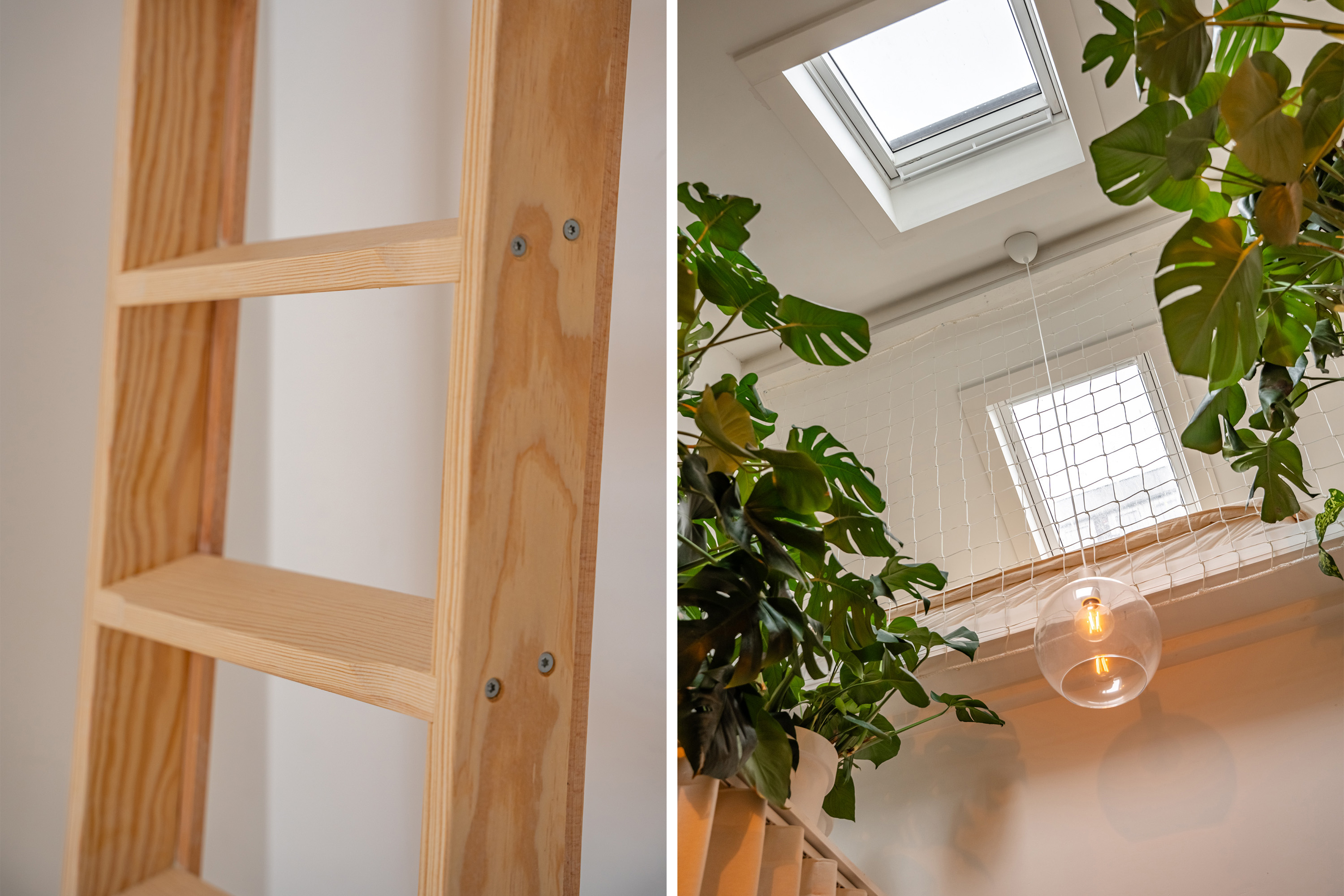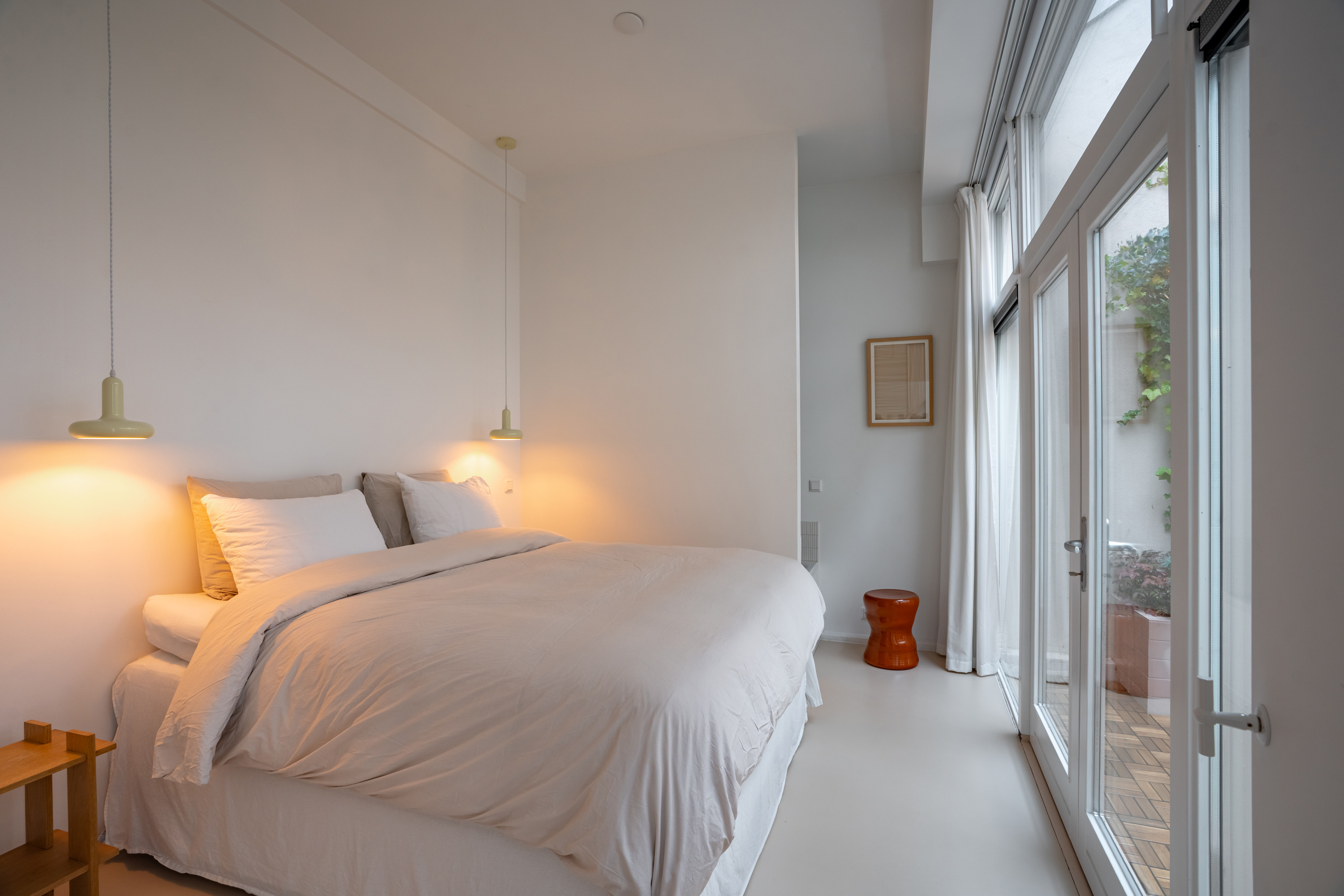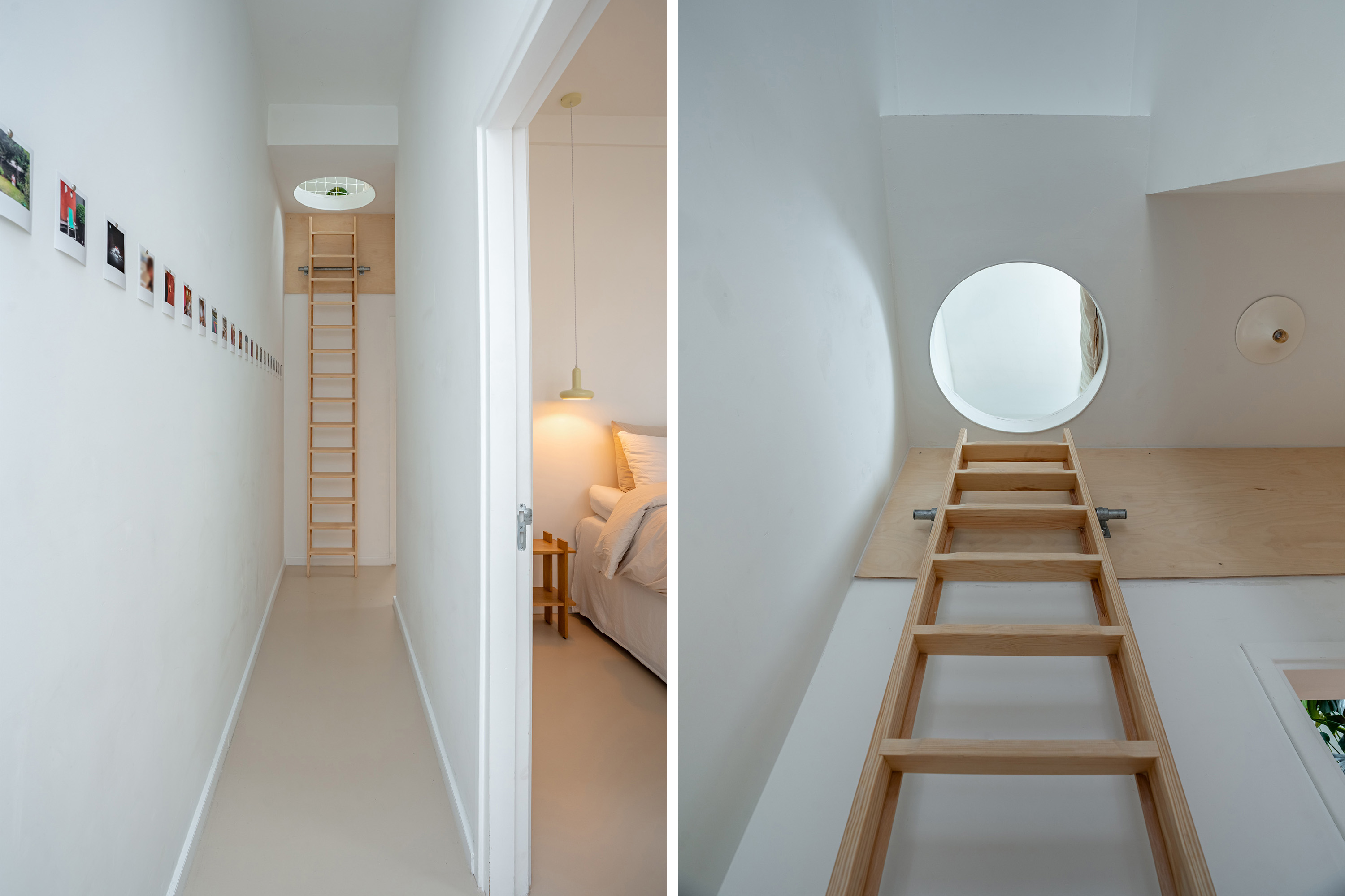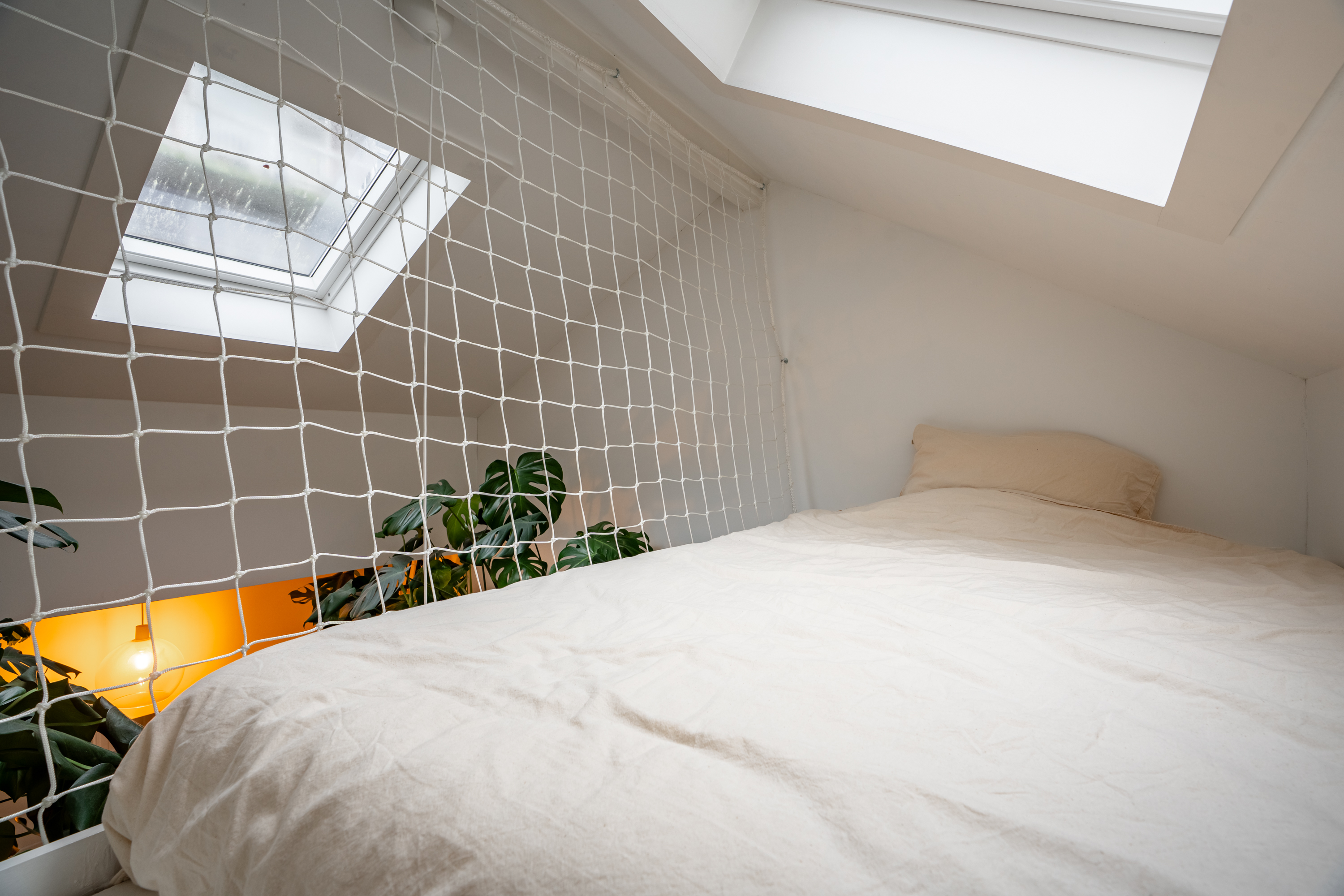 De bewoners hebben daarnaast een slimme, extra slaapruimte gecreëerd op de zolderverdieping. Via een houten trap kom je op een lichte logeerruimte met dakramen, perfect voor gasten. De vormgeving is minimalistisch en sfeervol, waardoor dit écht een waardevolle toevoeging is.