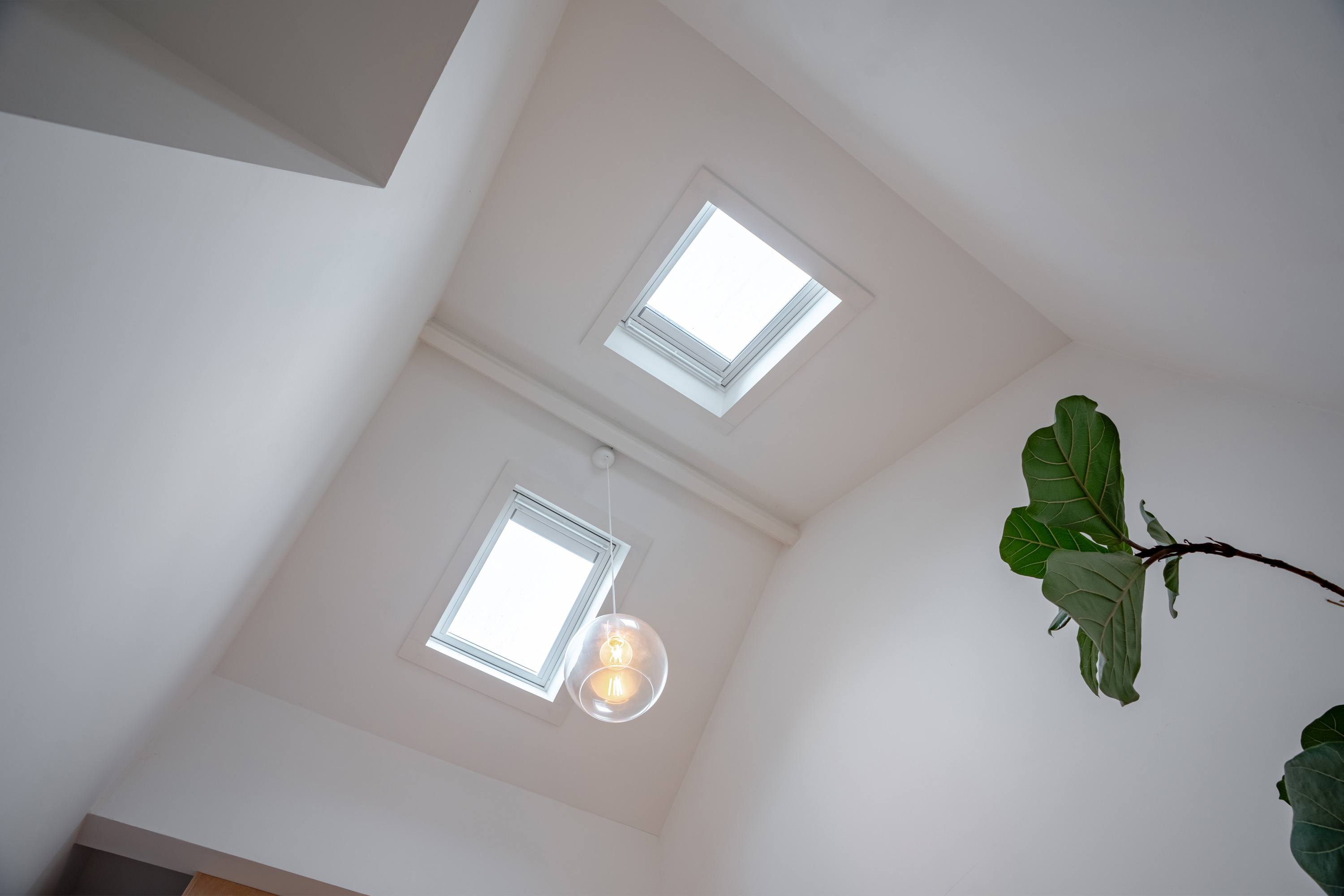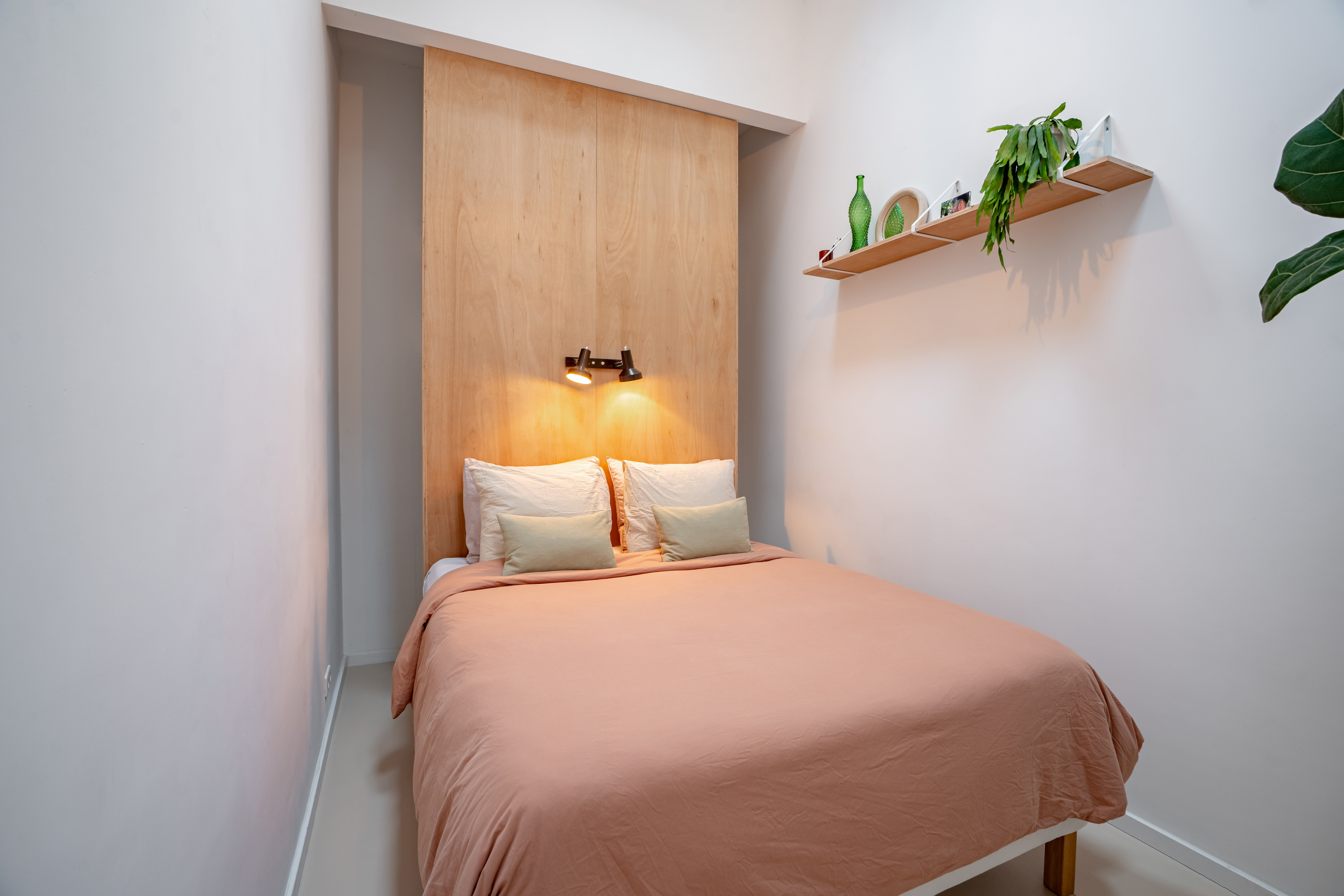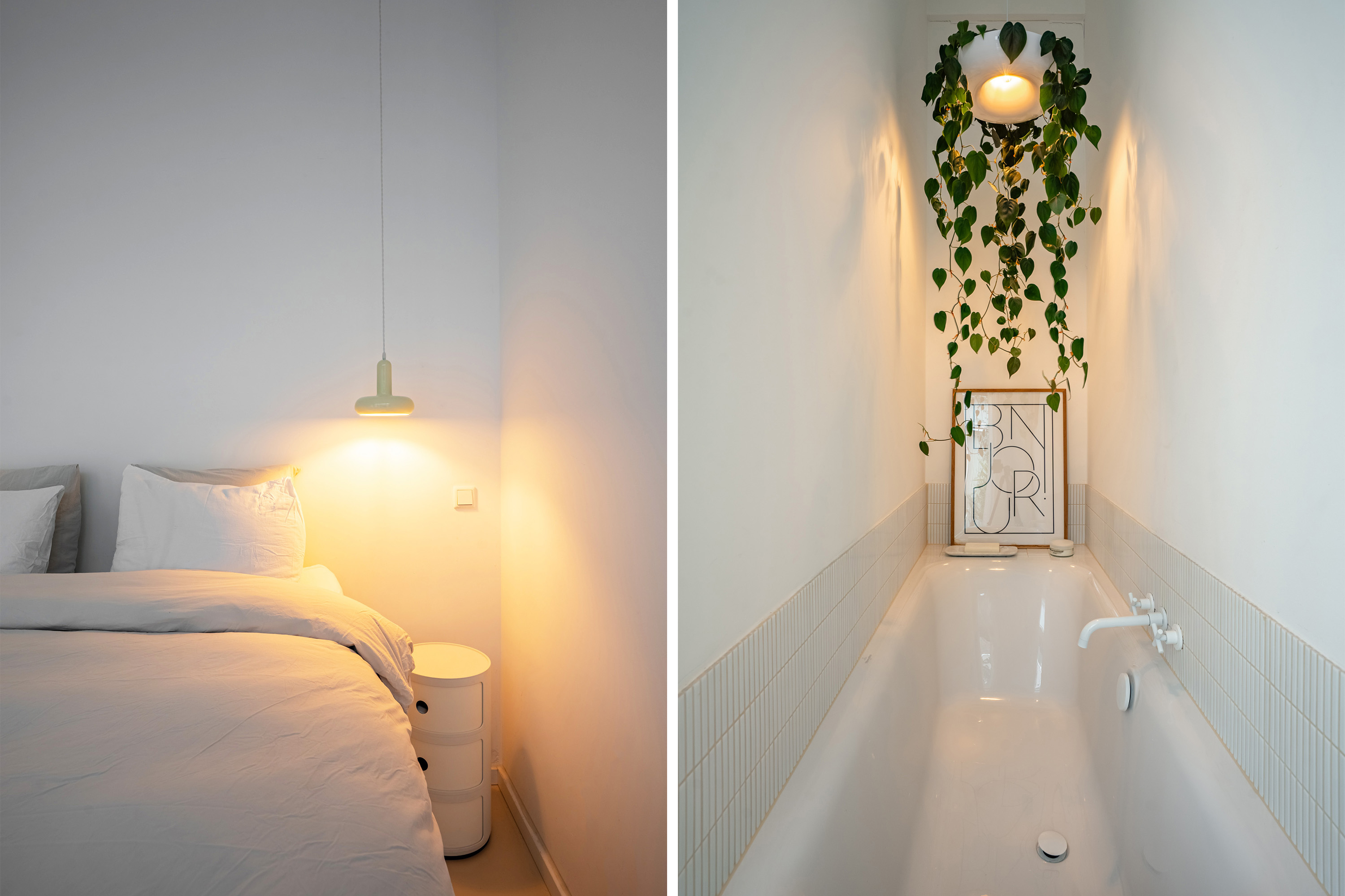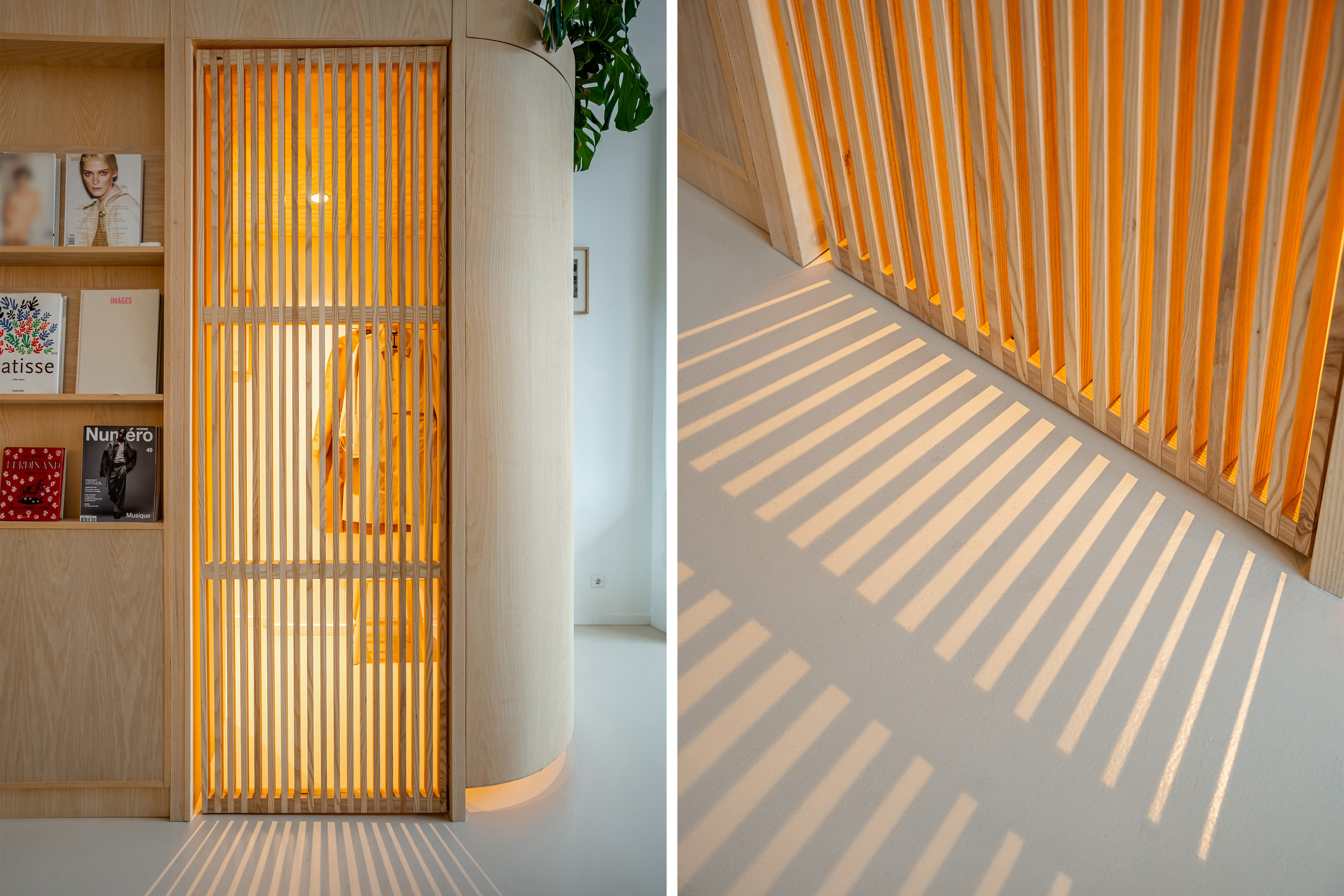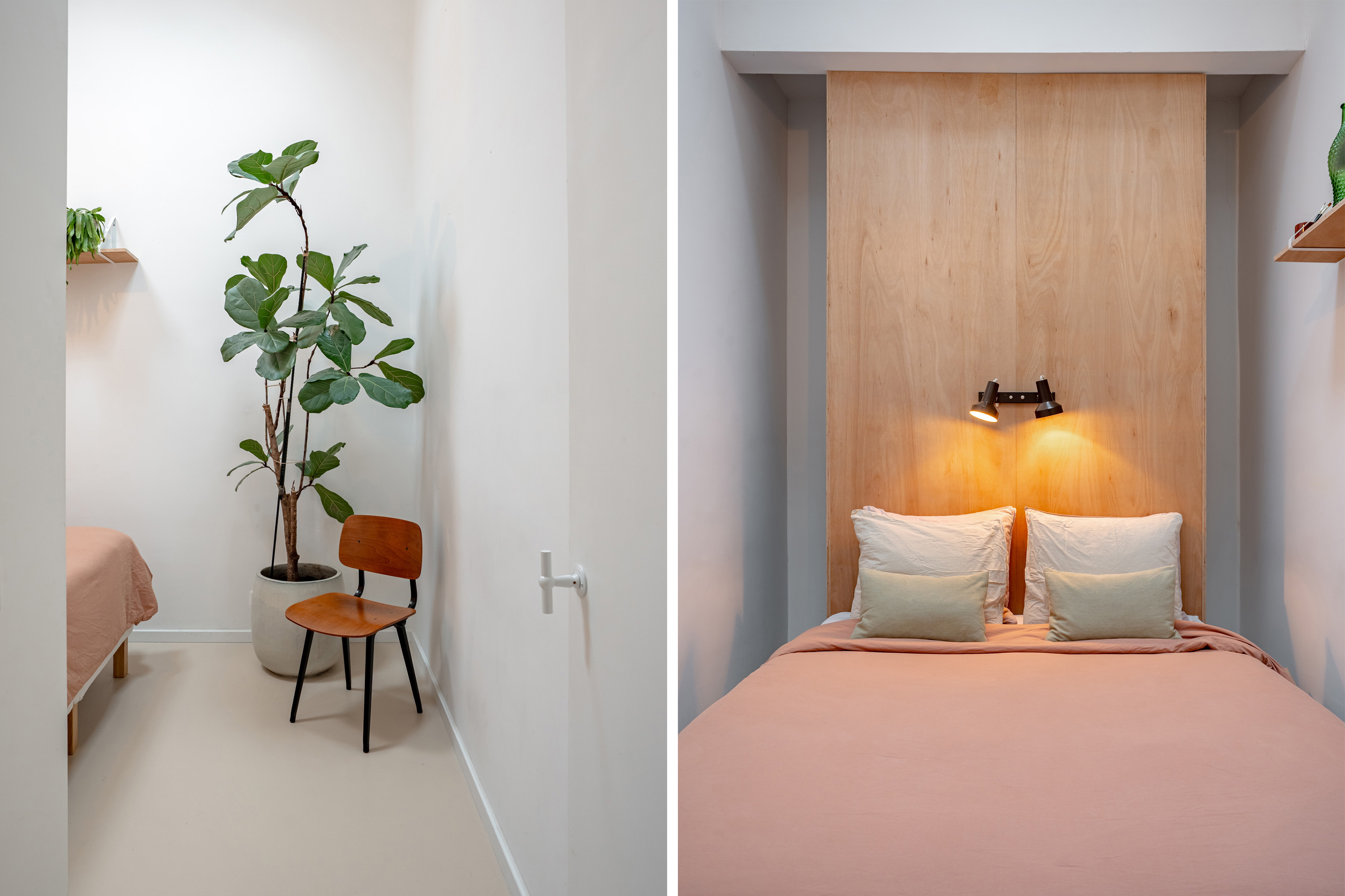 De bewoners hebben daarnaast een slimme, extra slaapruimte gecreëerd op de zolderverdieping. Via een houten trap kom je op een lichte logeerruimte met dakramen, perfect voor gasten. De vormgeving is minimalistisch en sfeervol, waardoor dit écht een waardevolle toevoeging is.
