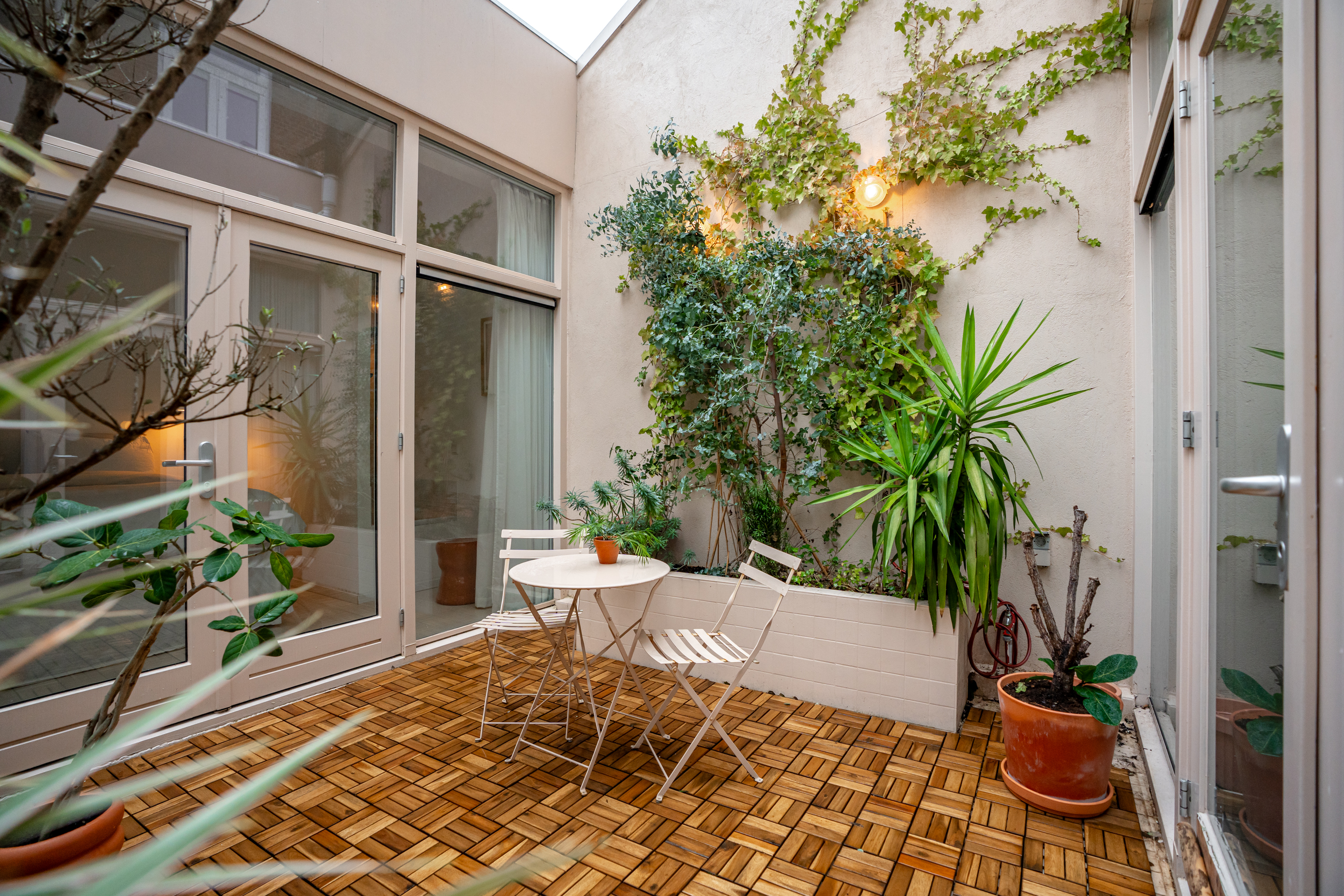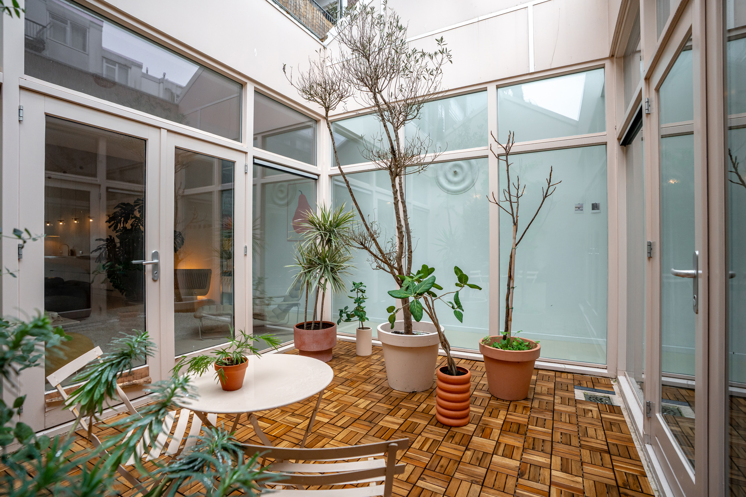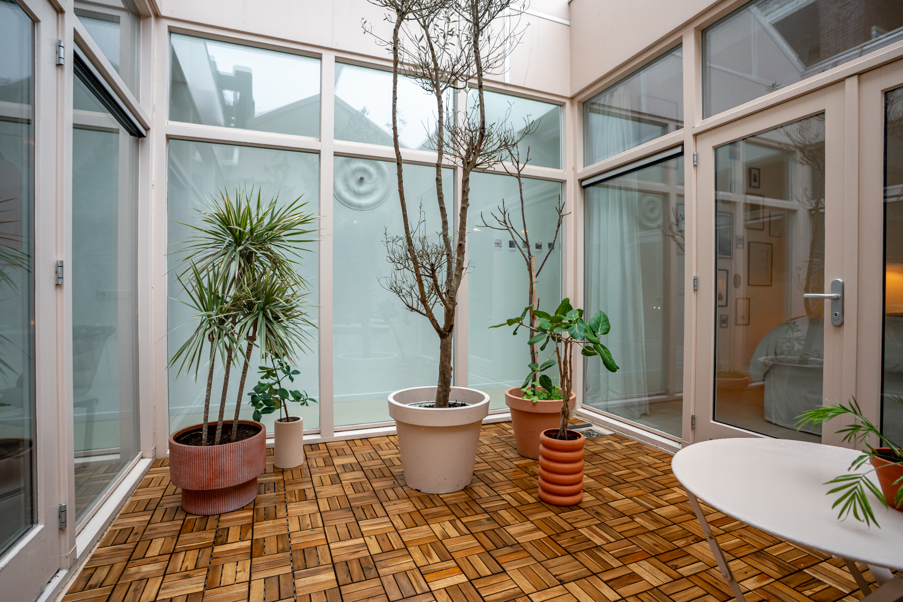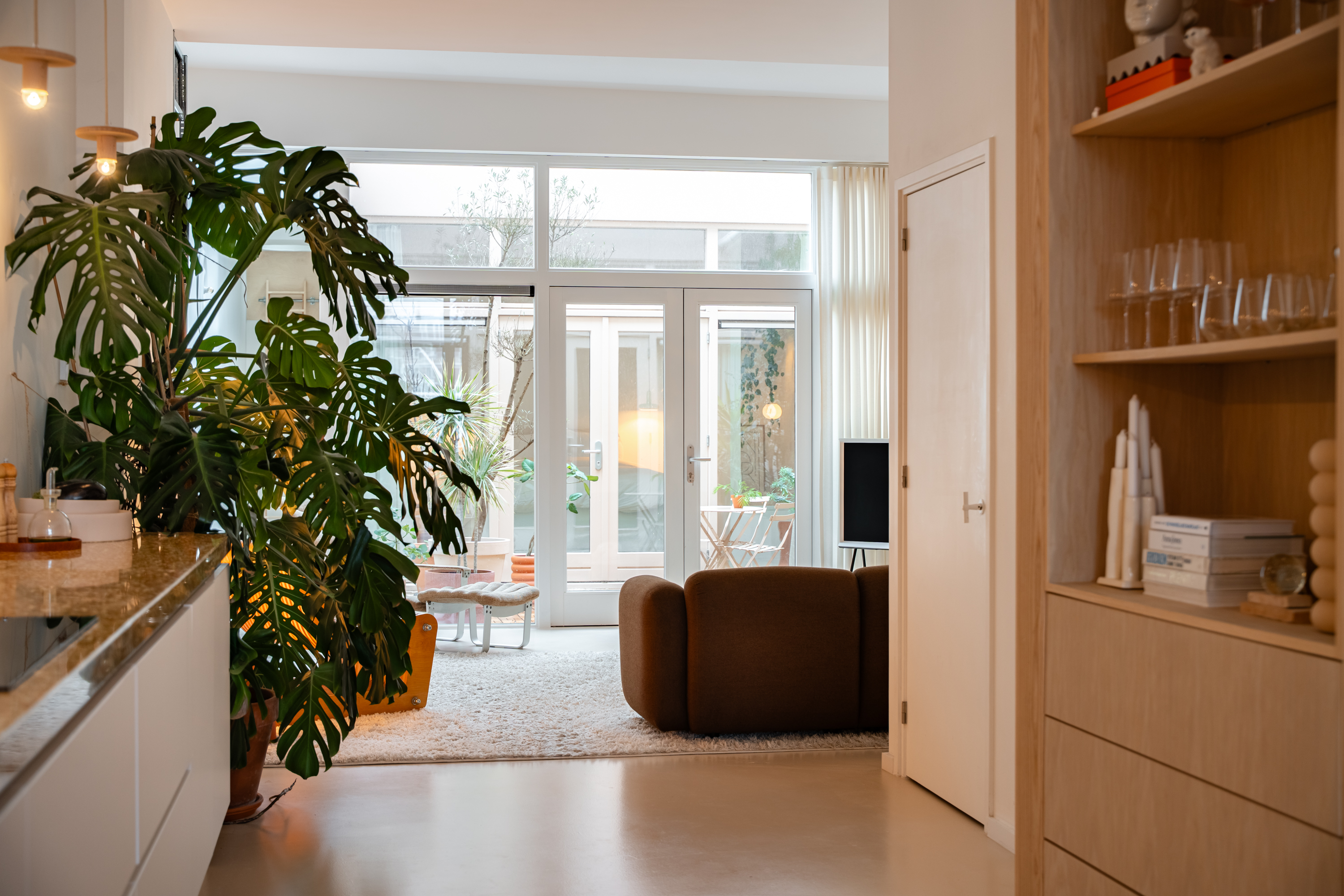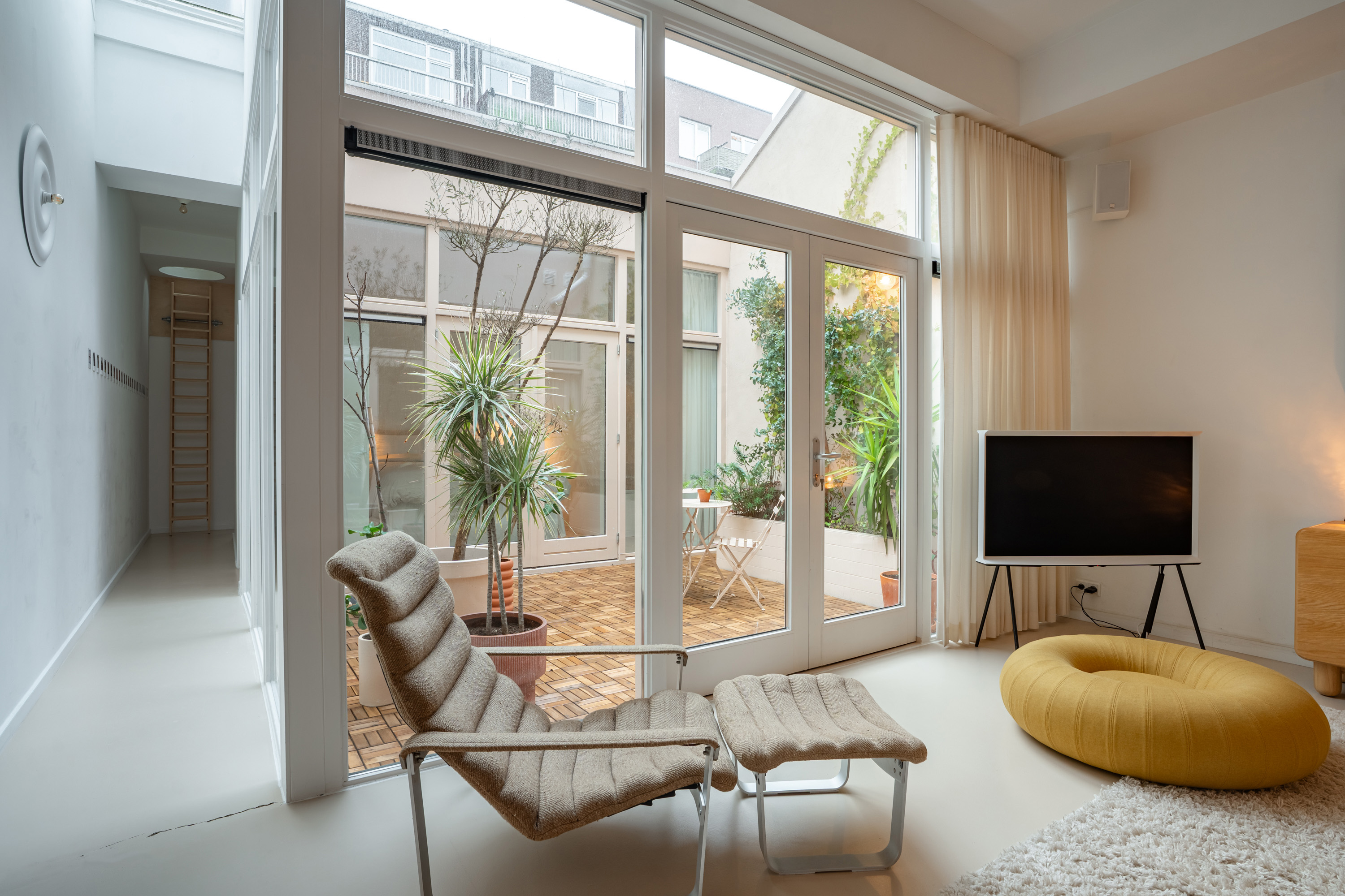 Loop je door de keuken heen dan kom je in de woonkamer, een lichte en uitnodigende ruimte dankzij de grote raampartijen. Een vaste kast herbergt de meterkast en de wasmachineaansluiting. De woonkamer voelt warm en modern tegelijk en heeft openslaande deuren naar de patio, een heerlijke eigen buitenruimte van circa 12 m². Hier geniet je van je eerste kopje koffie, een ontspannen middag of een gezellige borrel in de avond. De houten vlonders, het groen en de hoge glazen wanden zorgen voor een bijna Mediterrane sfeer.