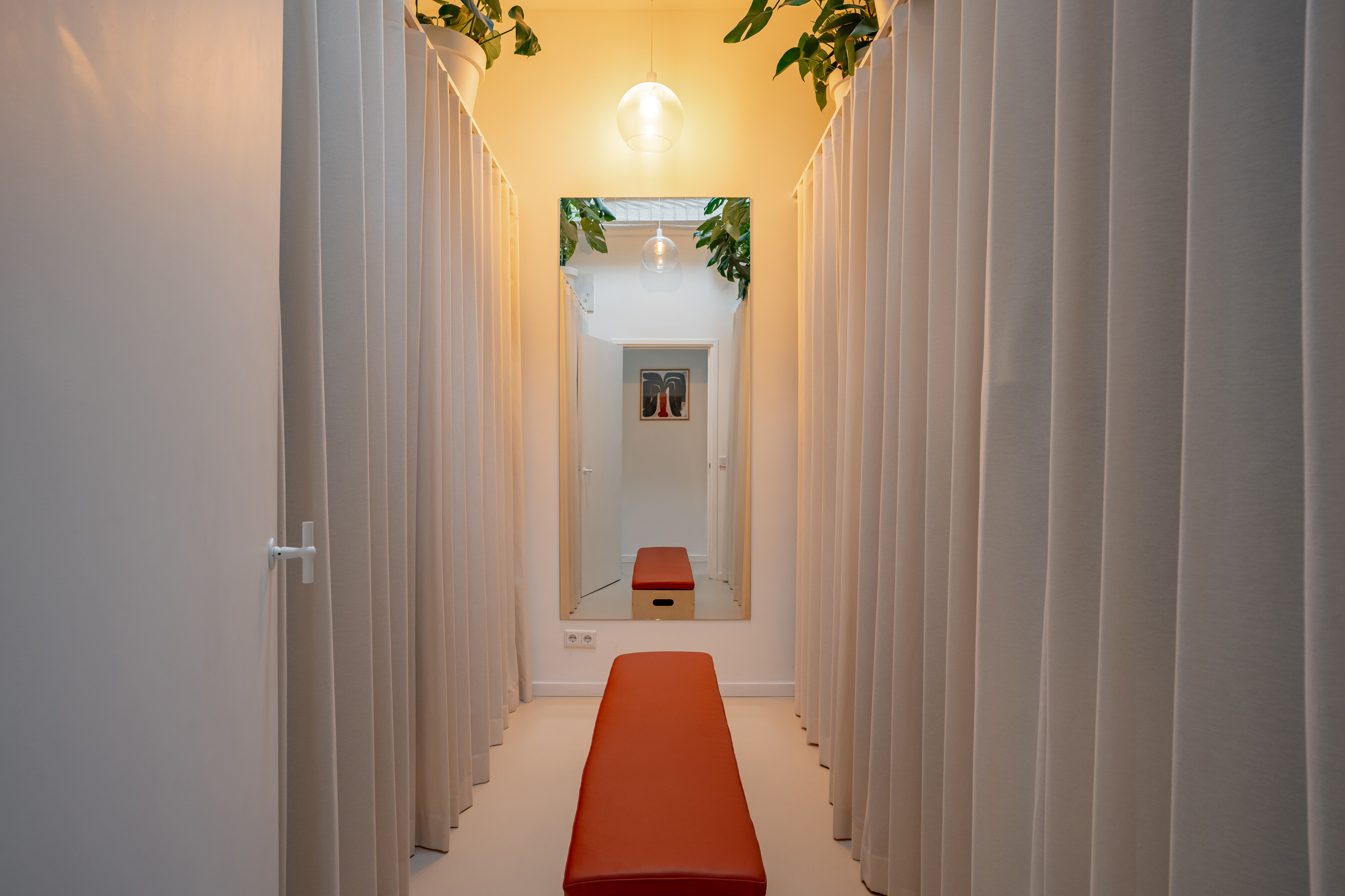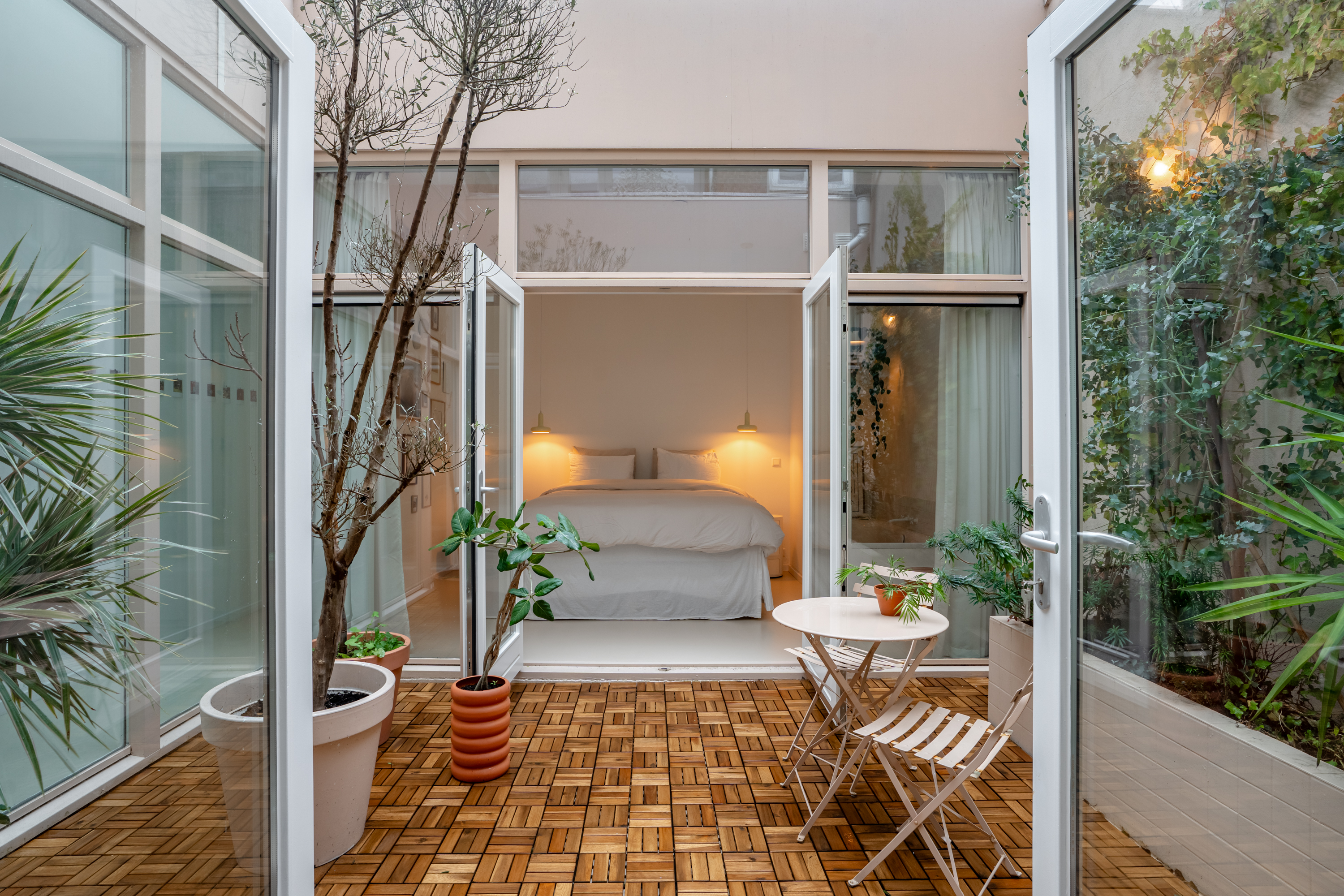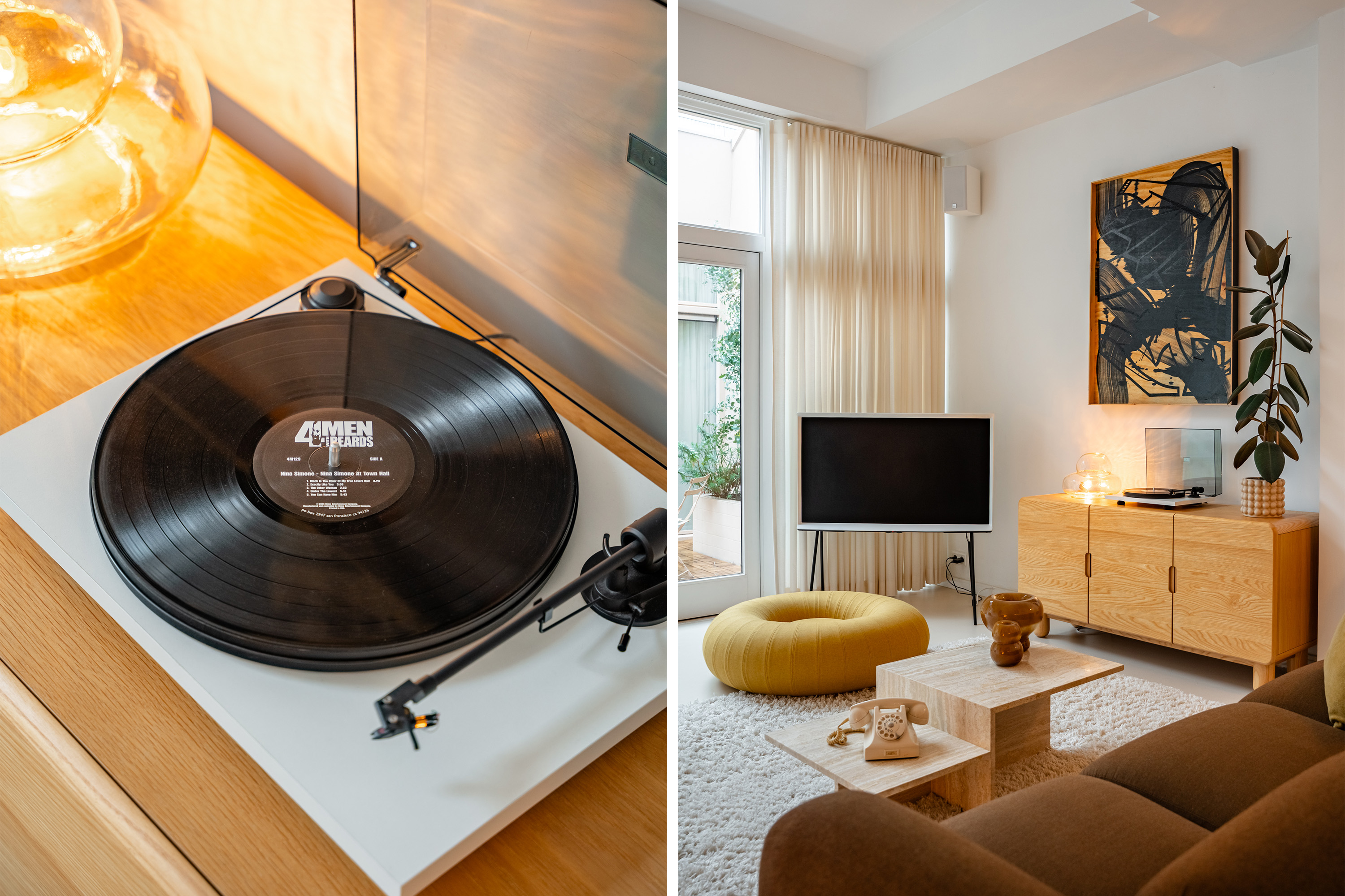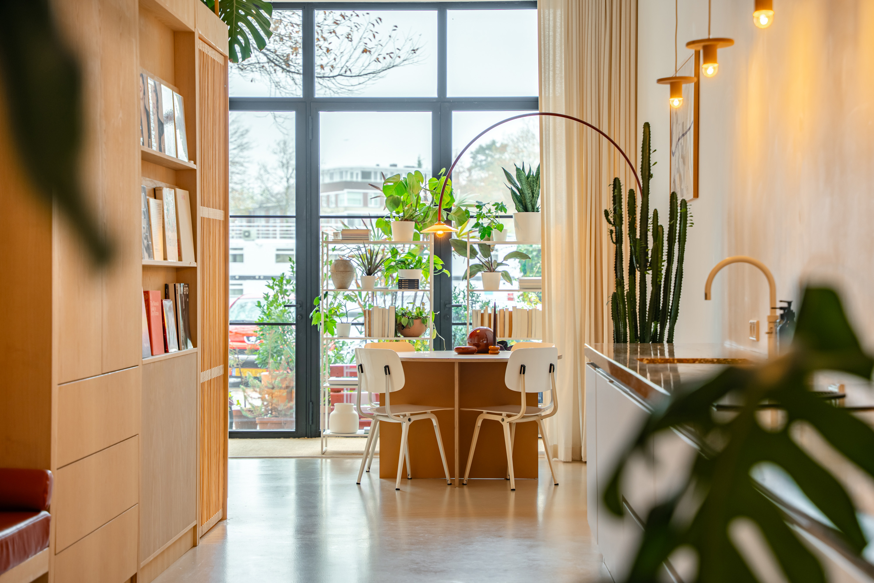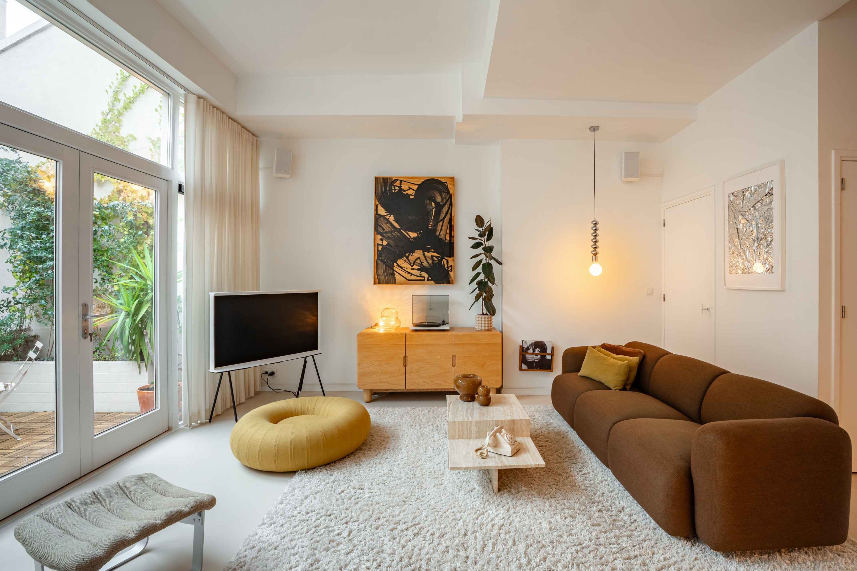 Loop je door de keuken heen dan kom je in de woonkamer, een lichte en uitnodigende ruimte dankzij de grote raampartijen. Een vaste kast herbergt de meterkast en de wasmachineaansluiting. De woonkamer voelt warm en modern tegelijk en heeft openslaande deuren naar de patio, een heerlijke eigen buitenruimte van circa 12 m². Hier geniet je van je eerste kopje koffie, een ontspannen middag of een gezellige borrel in de avond. De houten vlonders, het groen en de hoge glazen wanden zorgen voor een bijna Mediterrane sfeer.