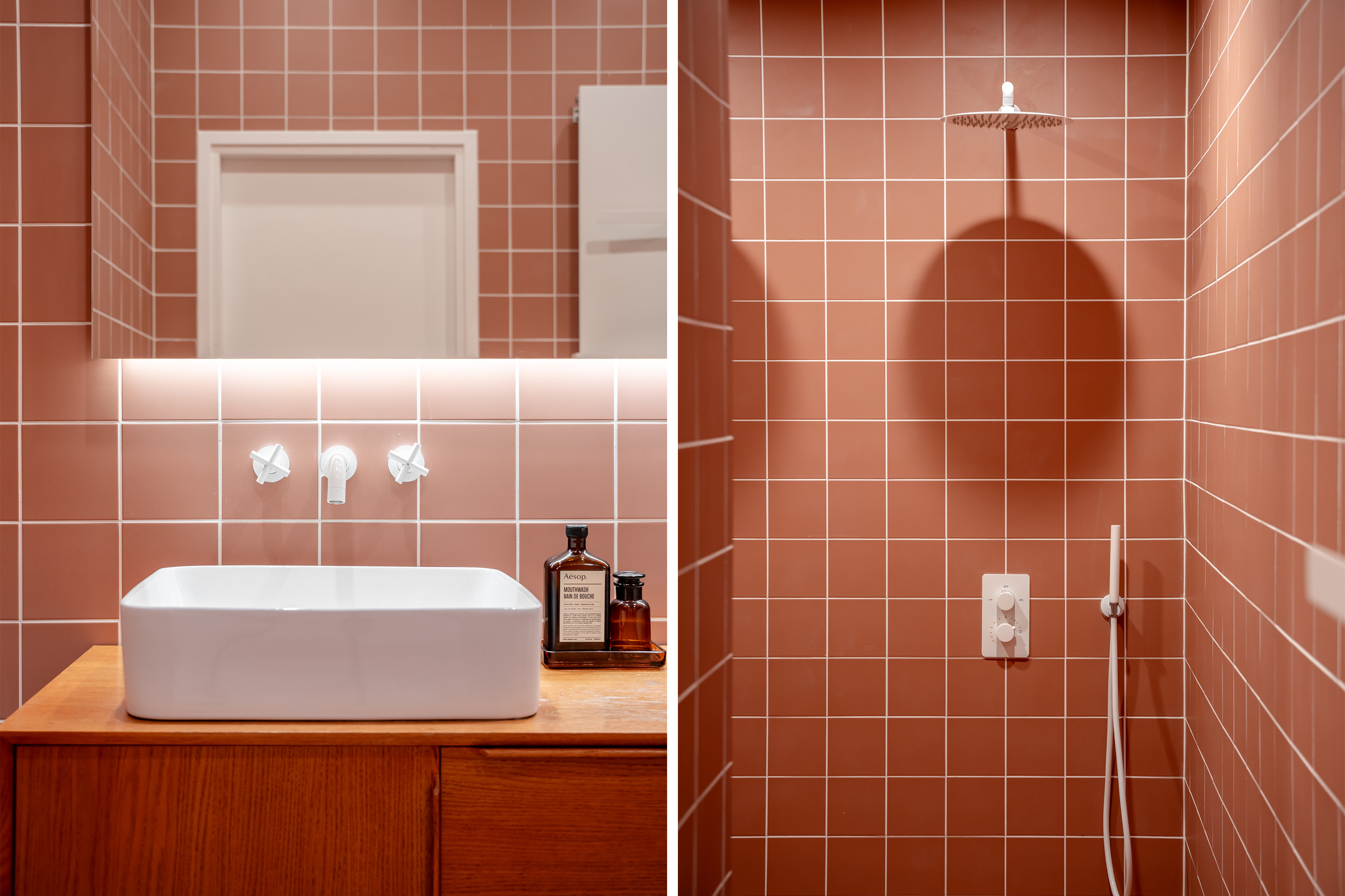 En dan de badkamer… Wat een eyecatcher. De prachtige warme tegelkleur, de luxe afwerking, het dubbele wastafelmeubel en de royale inloopdouche maken dit tot een badkamer waar je spontaan verliefd op wordt. Dit is zo’n ruimte die je in boutique hotels ziet: stijlvol, modern en bijzonder sfeervol.