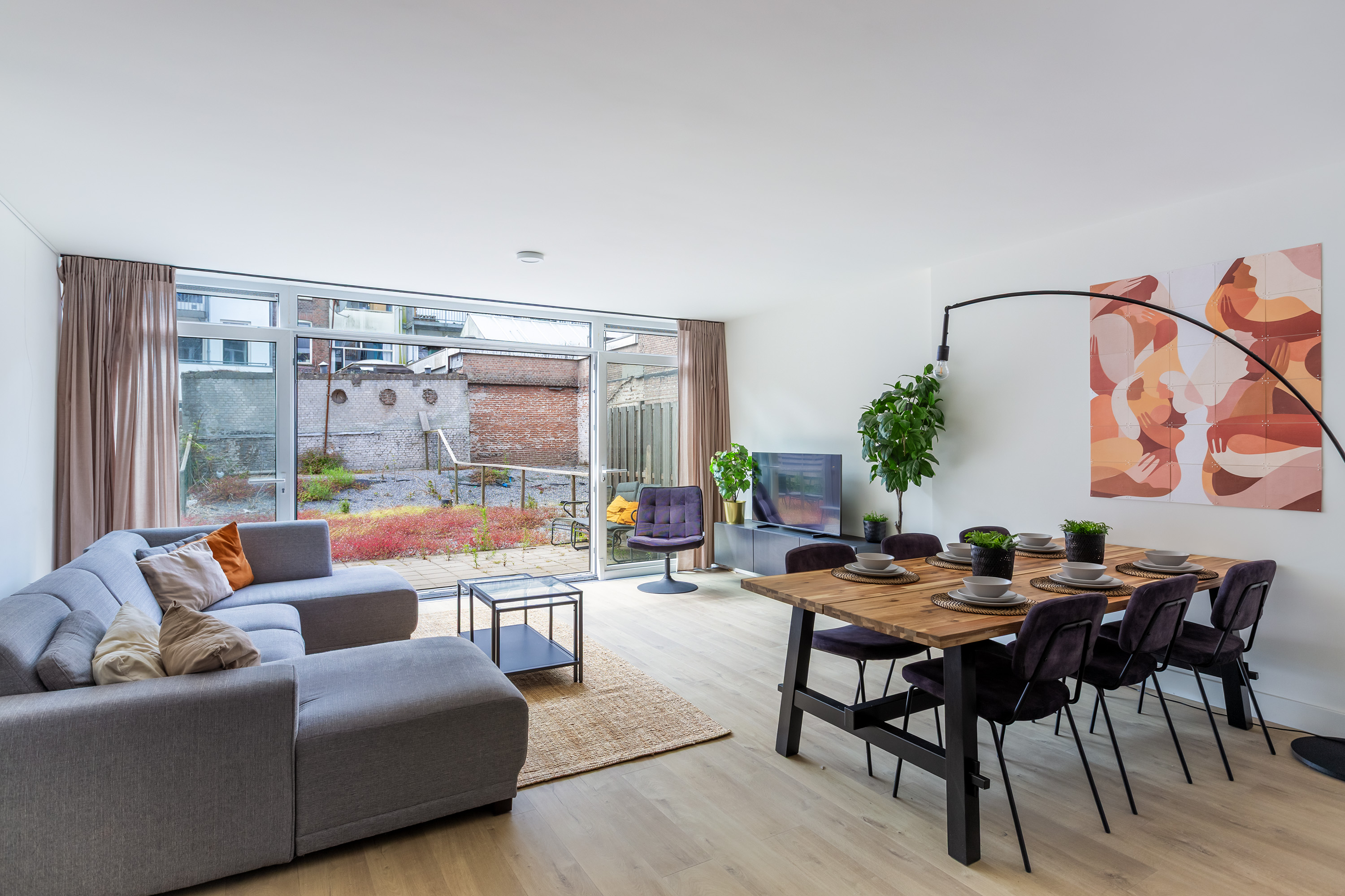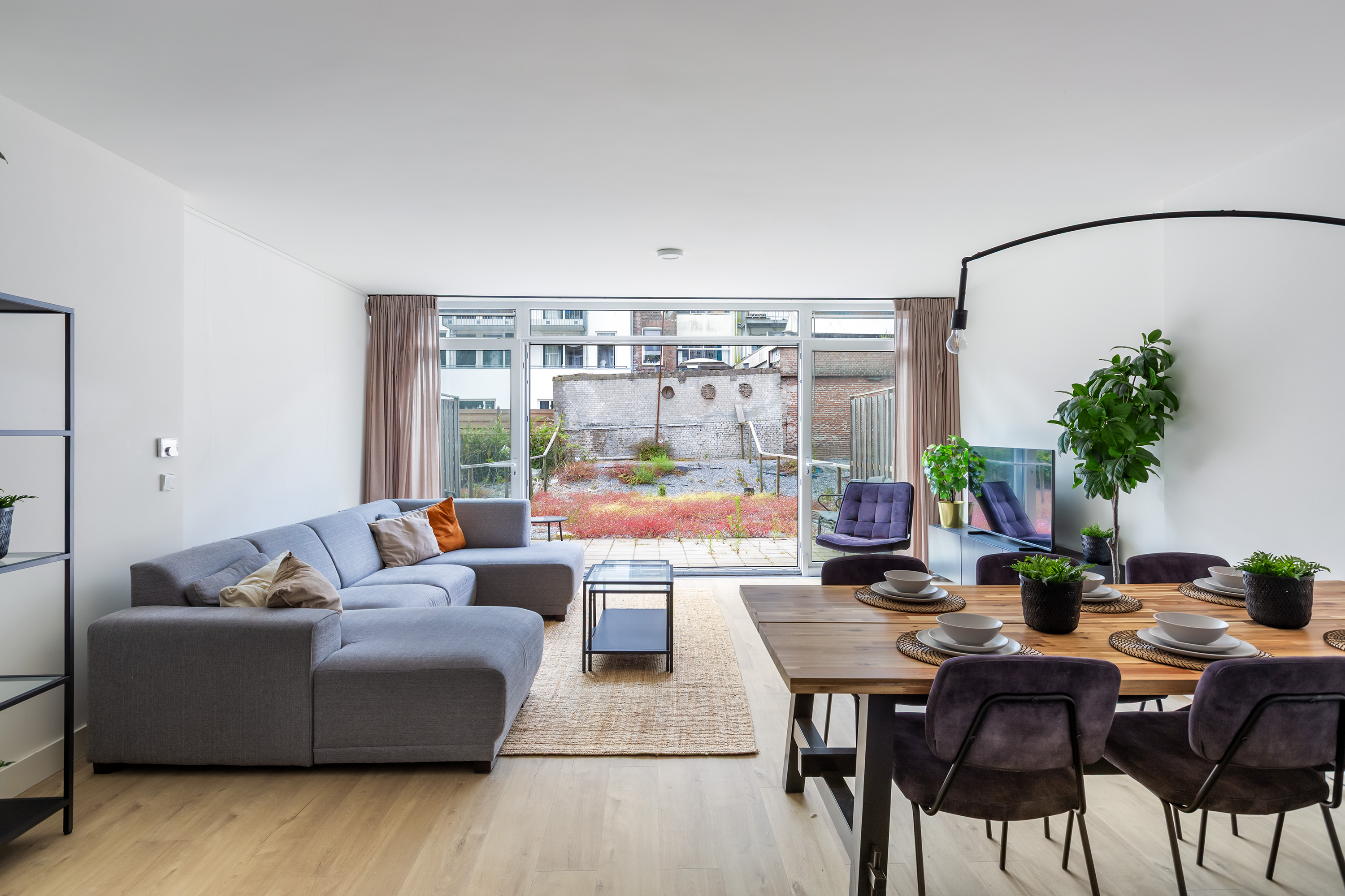 Dankzij de grote dubbele schuifpui naar de tuin stroomt het daglicht rijkelijk naar binnen. Het is een heerlijk lichte ruimte waar je zowel ontspannen als gezellig samen kunt zijn. De strakke vloer, die door de hele woning is doorgetrokken en voorzien is van vloerverwarming, zorgt voor een moderne, rustige uitstraling.