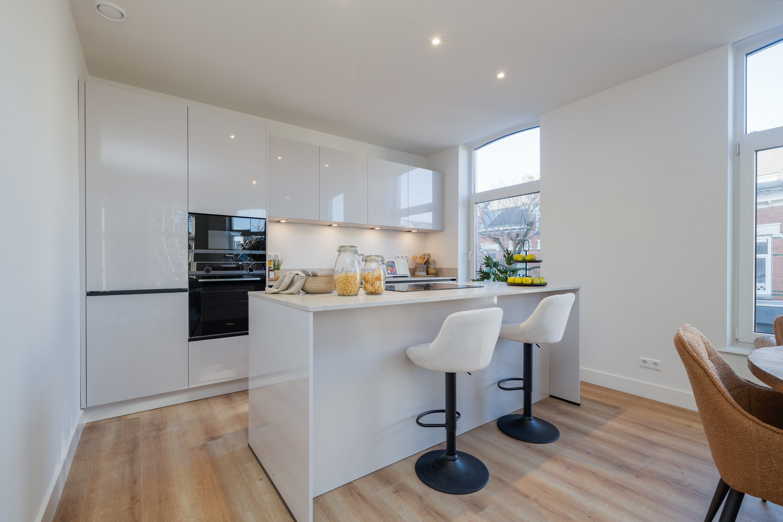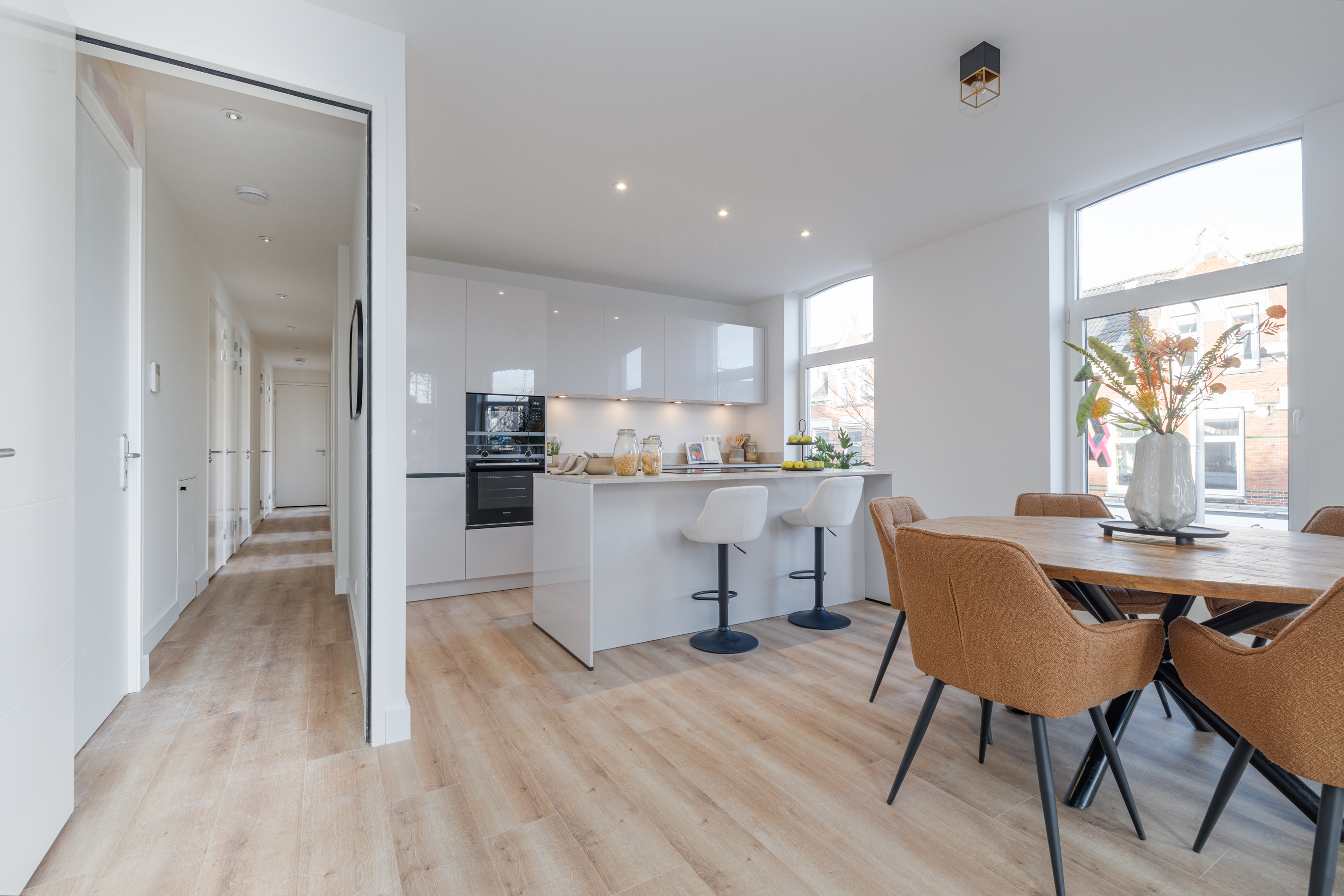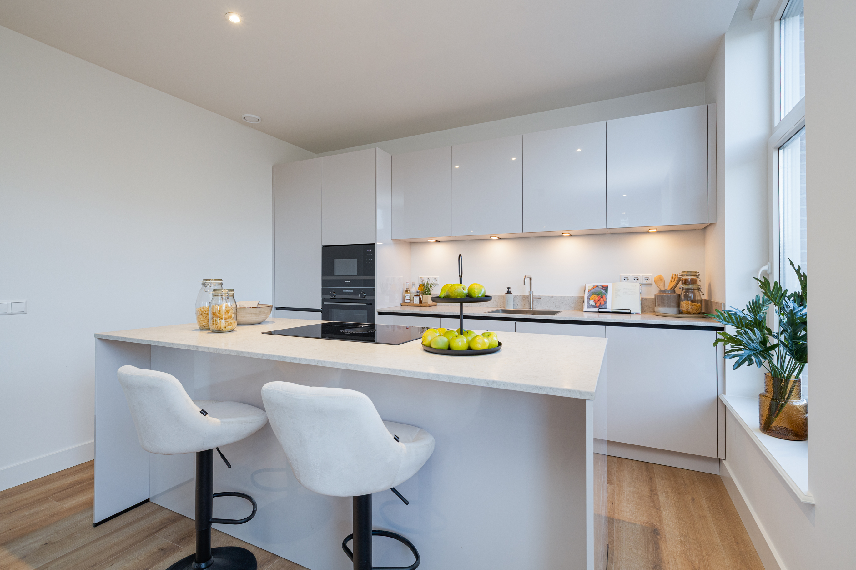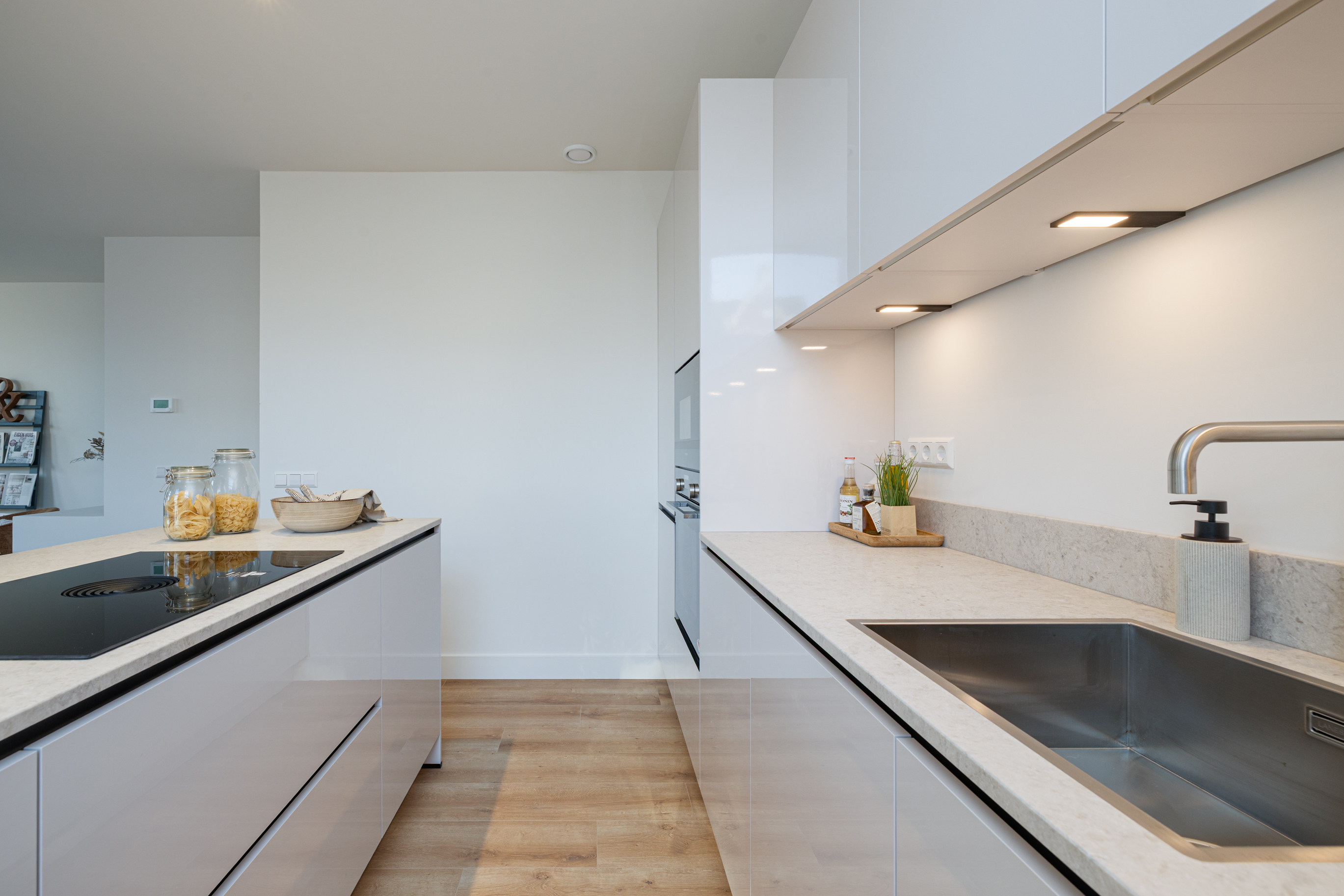 De ruime woonkamer, gelegen op de hoek met uitzicht alle kanten op, omarmt je, mede dankzij de prachtige open keuken met kookeiland. Deze hoogglans keuken met fraai composieten werkblad is echt een eyecatcher.
