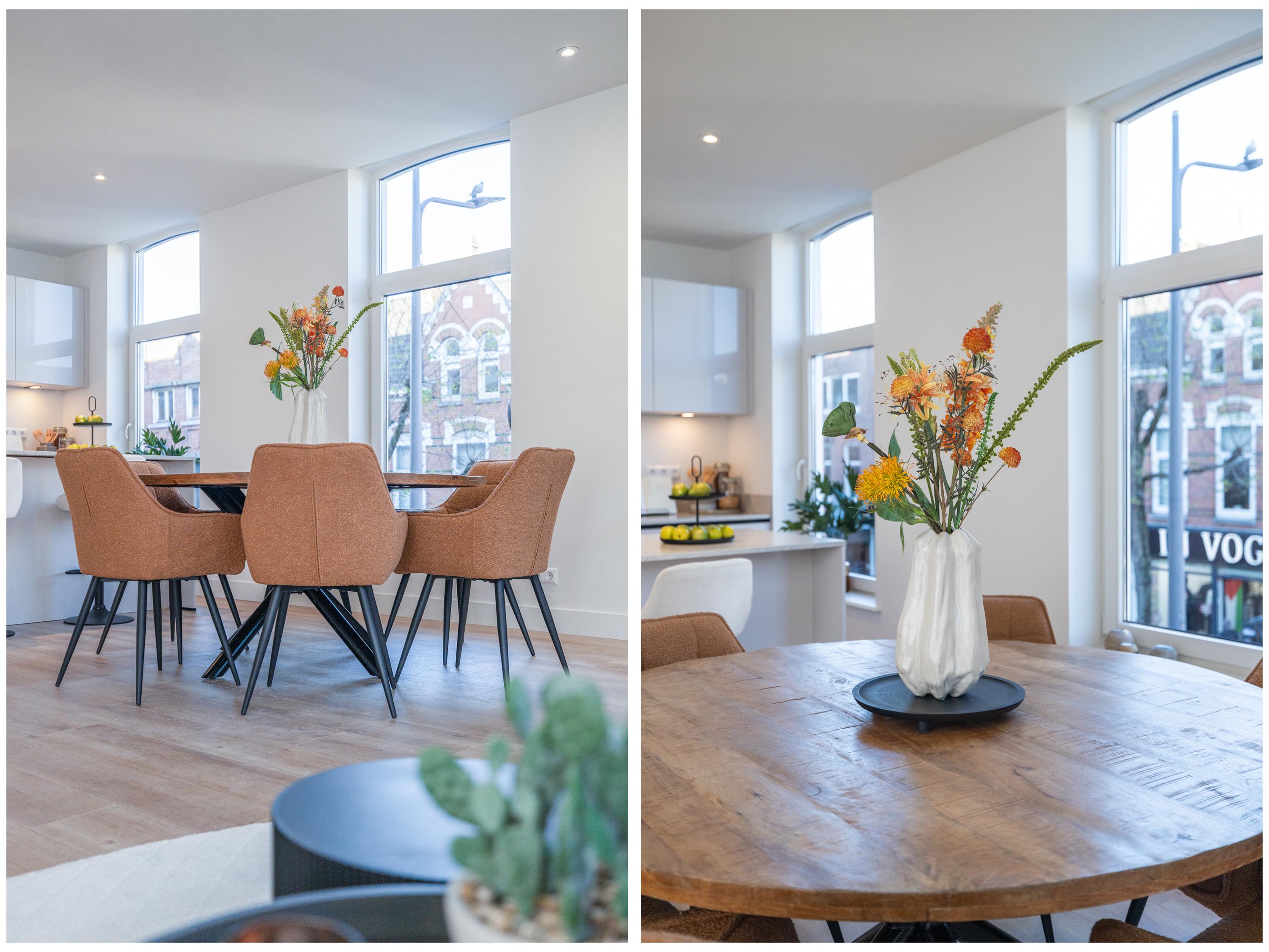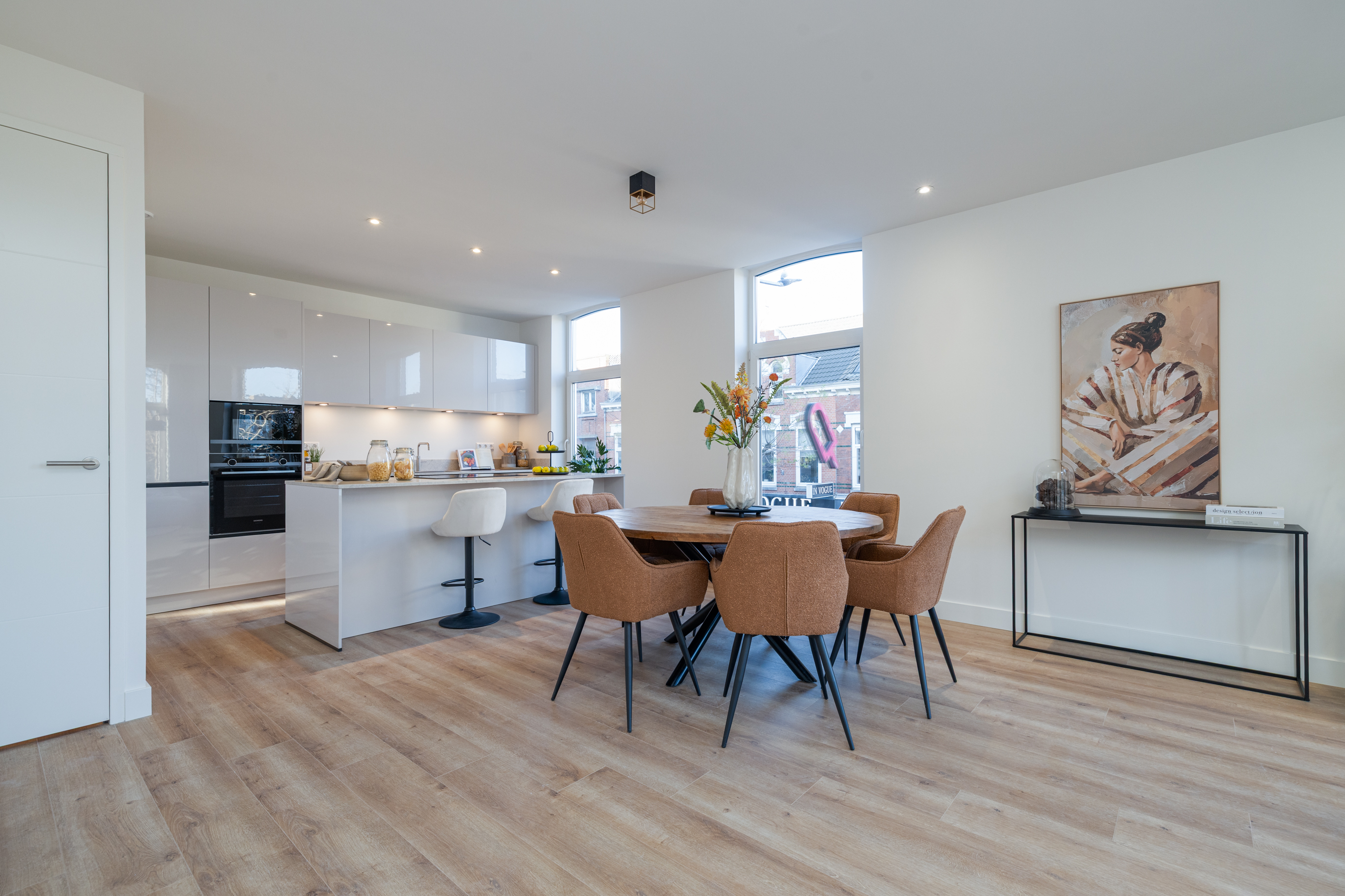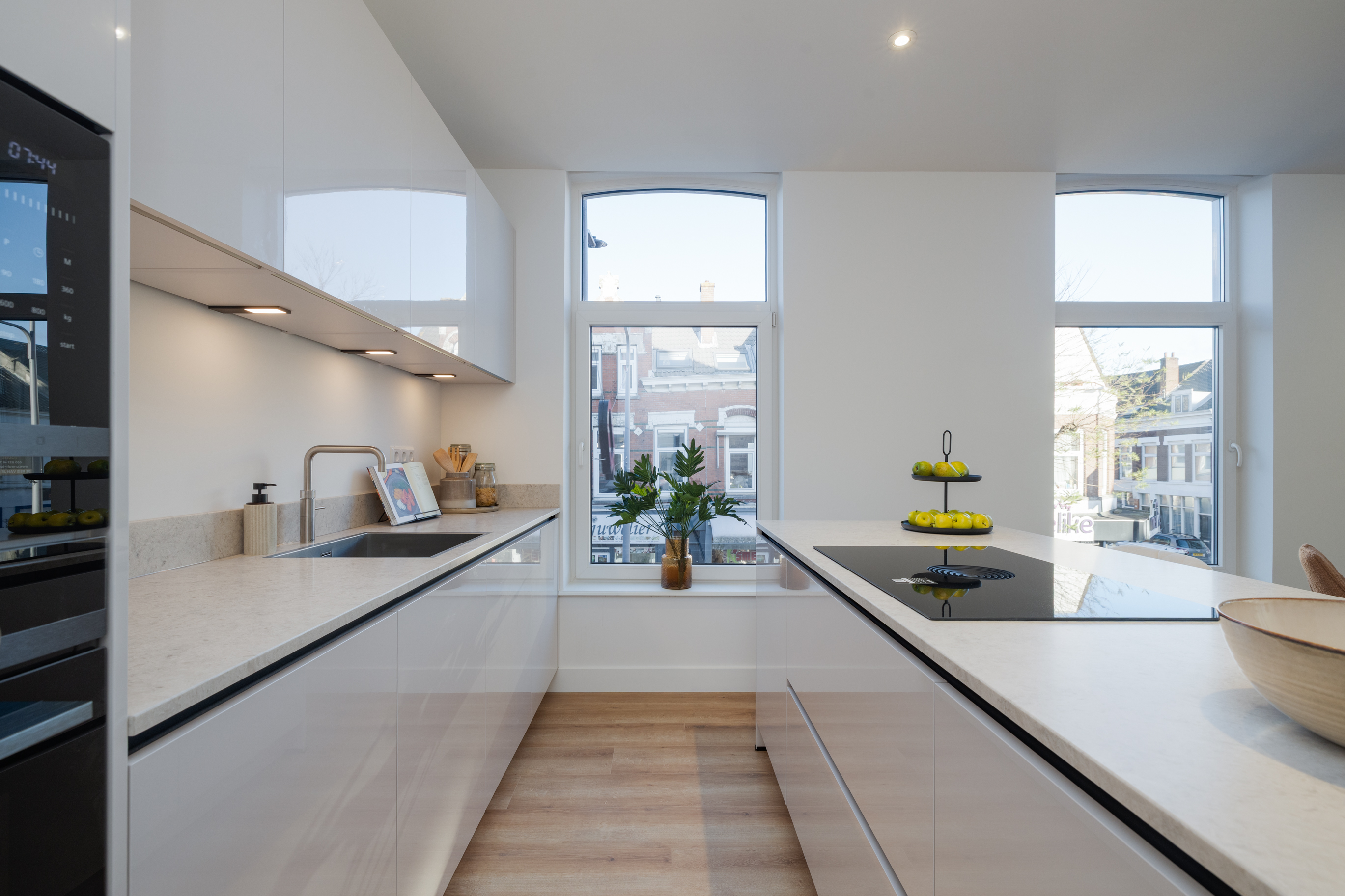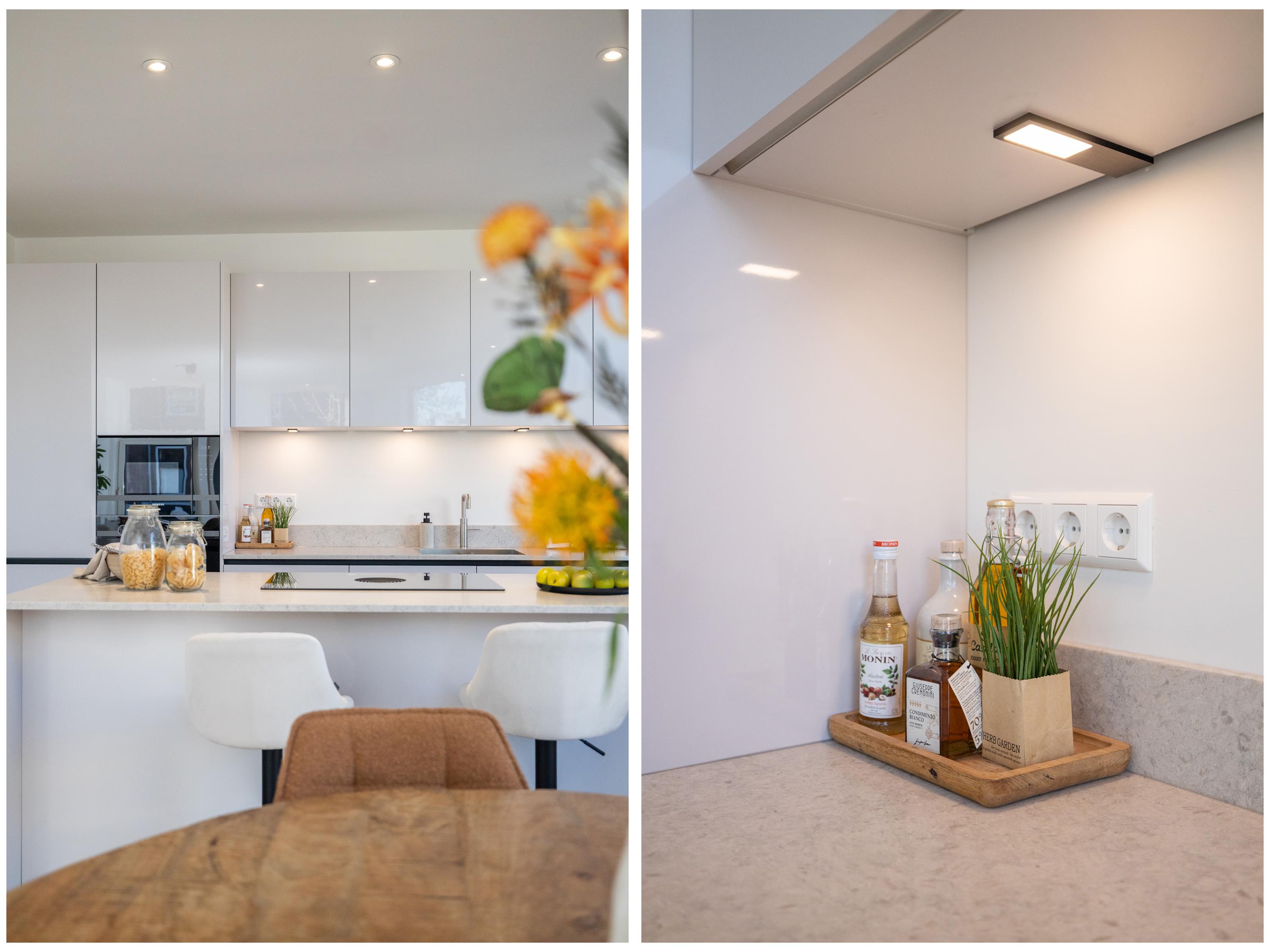 De ruime woonkamer, gelegen op de hoek met uitzicht alle kanten op, omarmt je, mede dankzij de prachtige open keuken met kookeiland. Deze hoogglans keuken met fraai composieten werkblad is echt een eyecatcher.