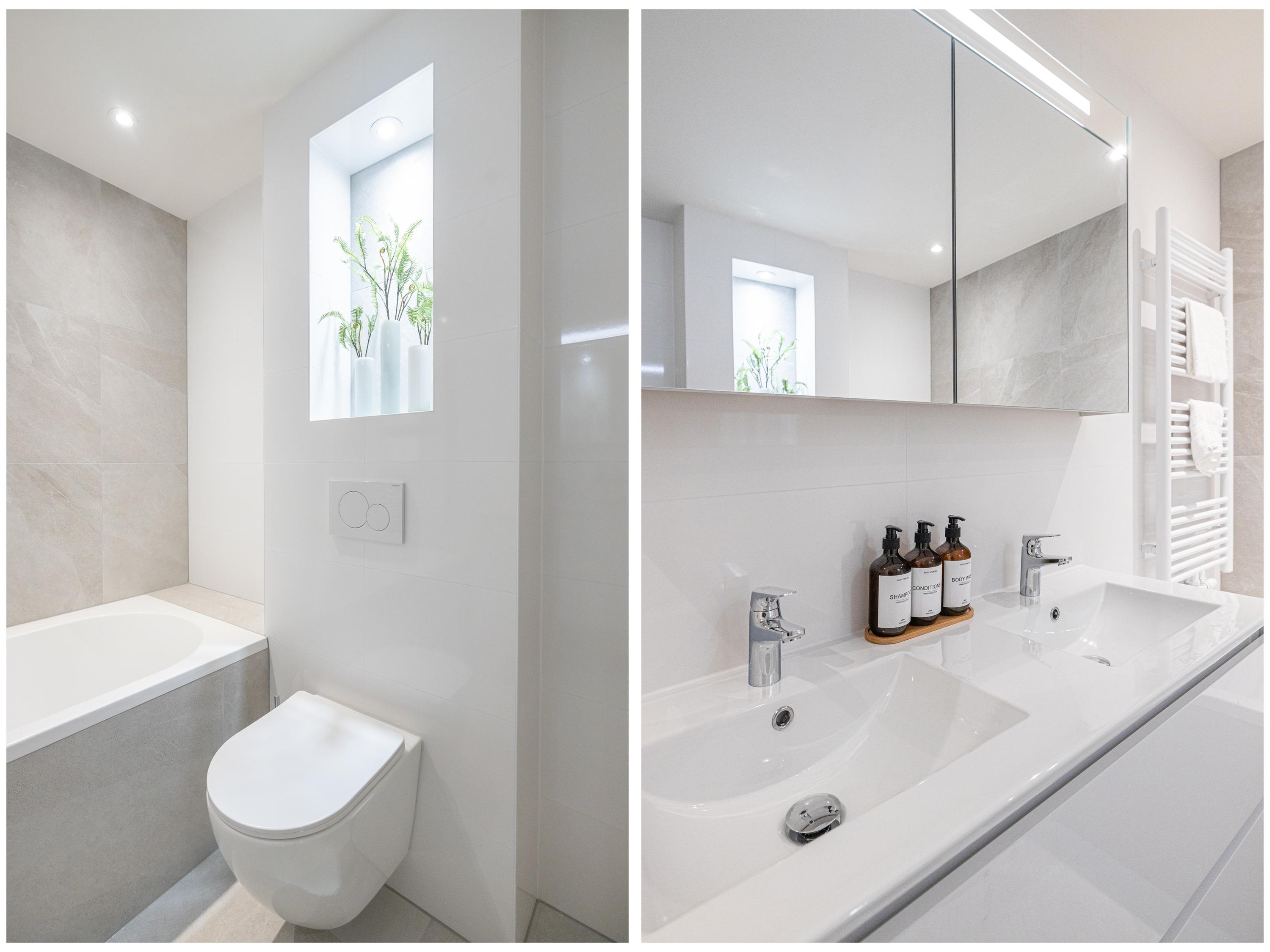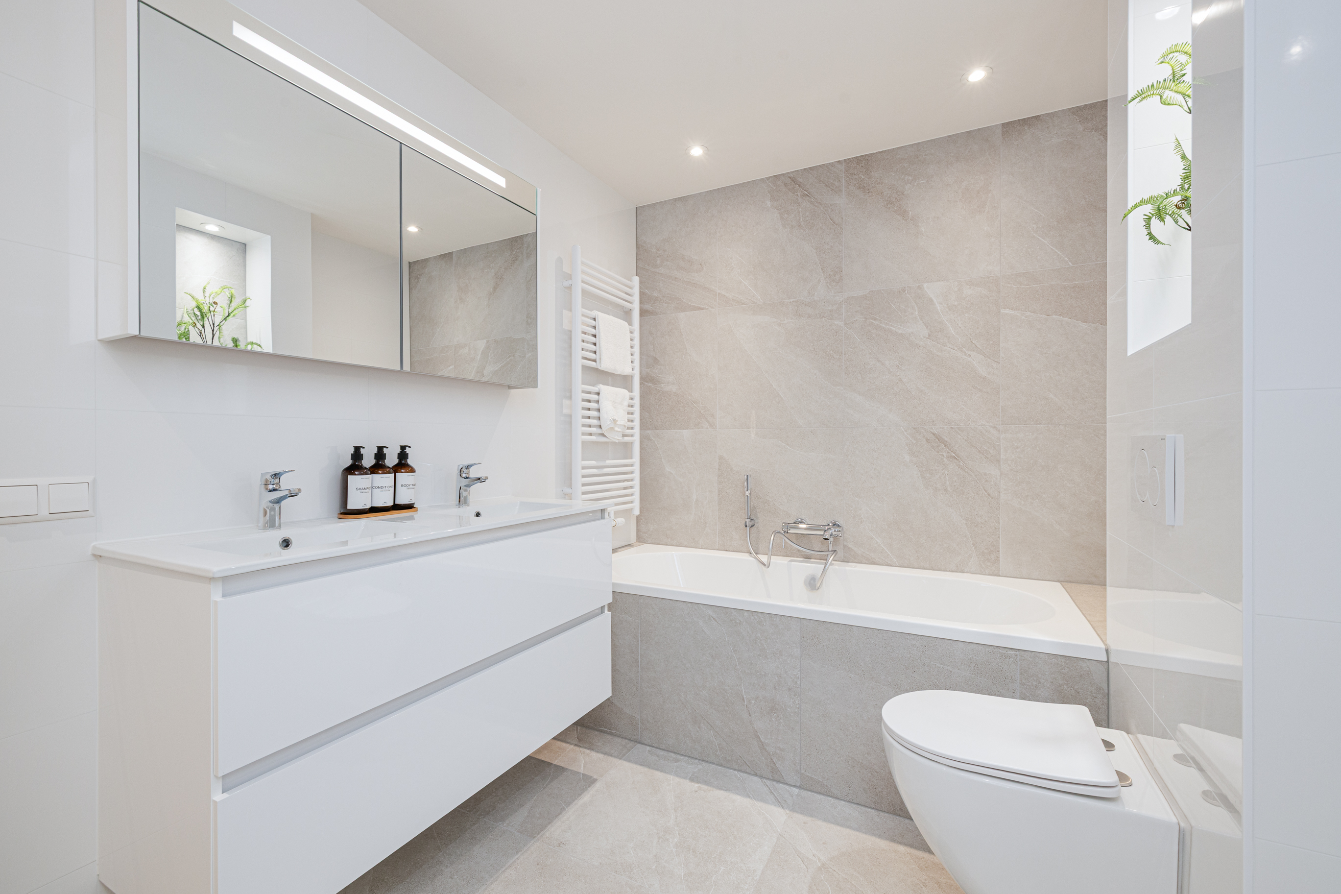 - Aangrenzend aan de master bedroom een grote badkamer met ligbad, inloopdouche, toilet, dubbele wastafel met lades, grote spiegelkast, accessoires, designradiator en inbouwspots.