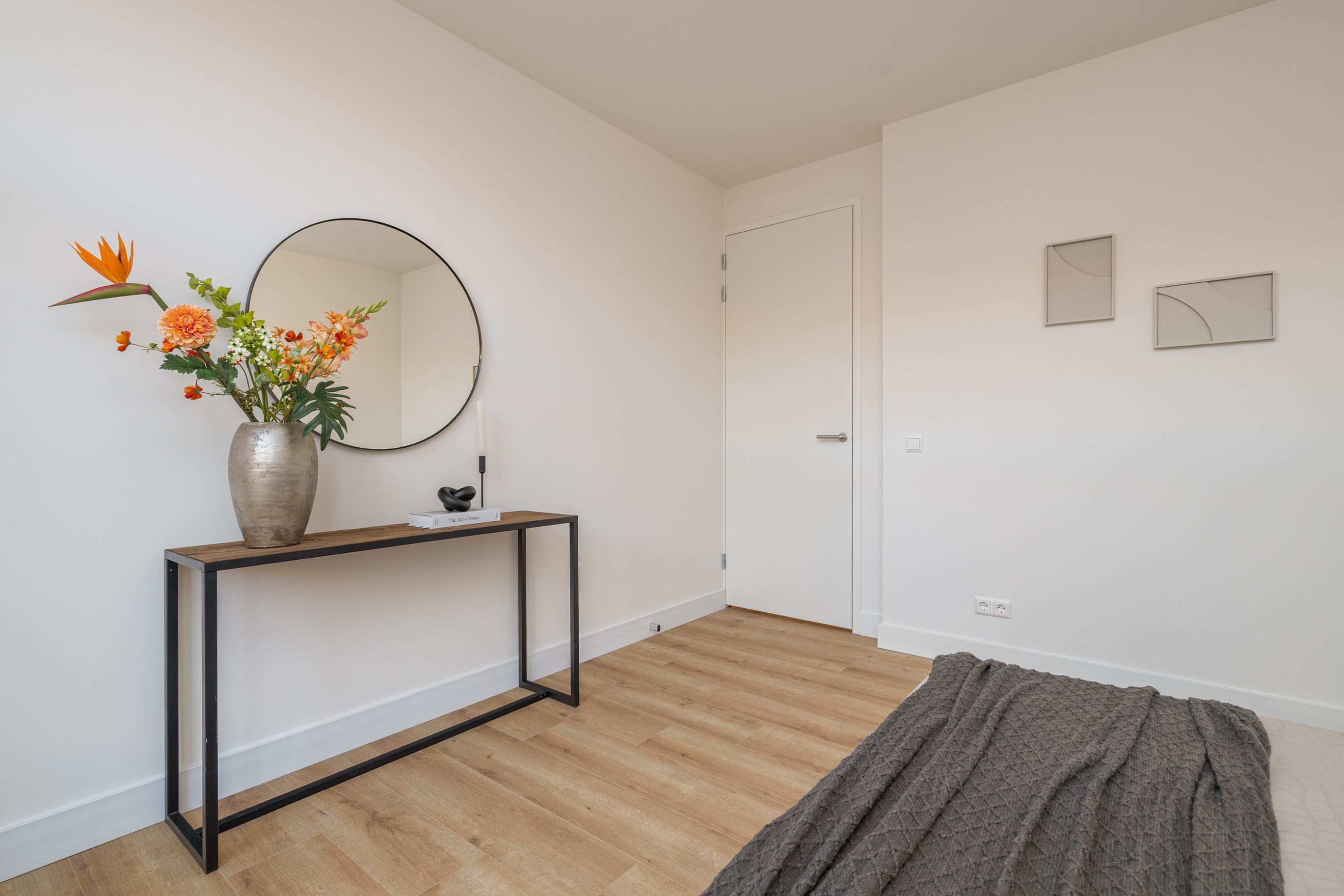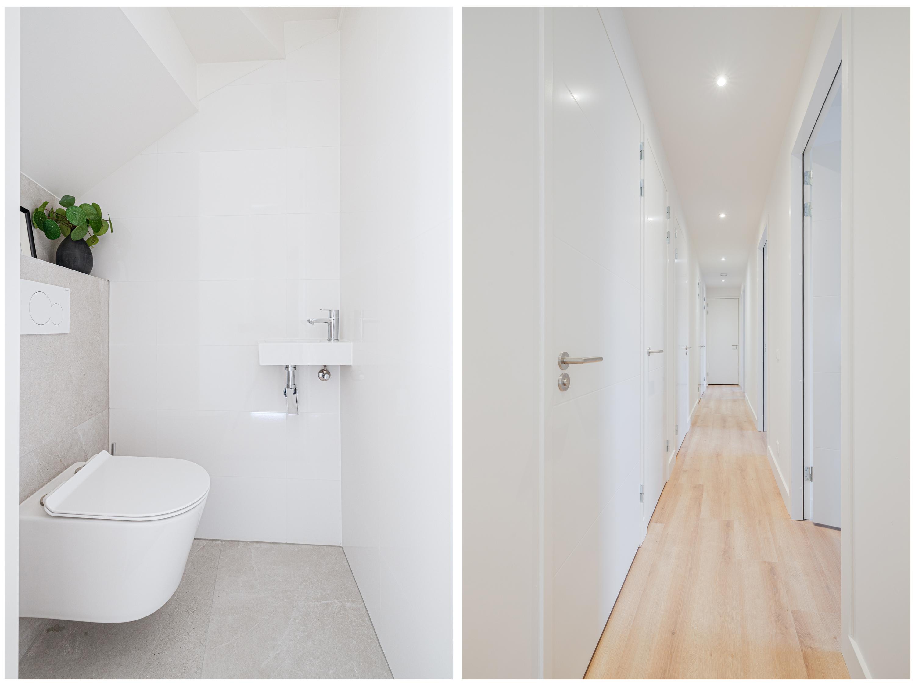 De afwerking is subliem, met hoogwaardige laminaatvloer, hoge plinten, grote wandtegels in sanitaire ruimtes en strak gestucte wanden en plafonds met inbouwspots.