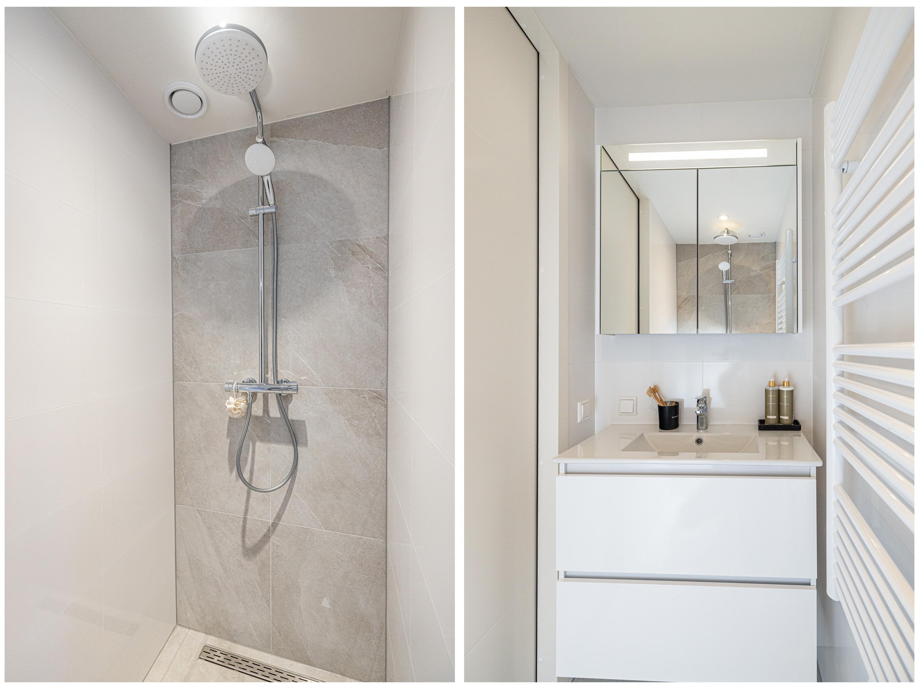 - Een tweede badkamer met inloopdouche, wastafel met lades en spiegelkast, designradiator en inbouwspots.