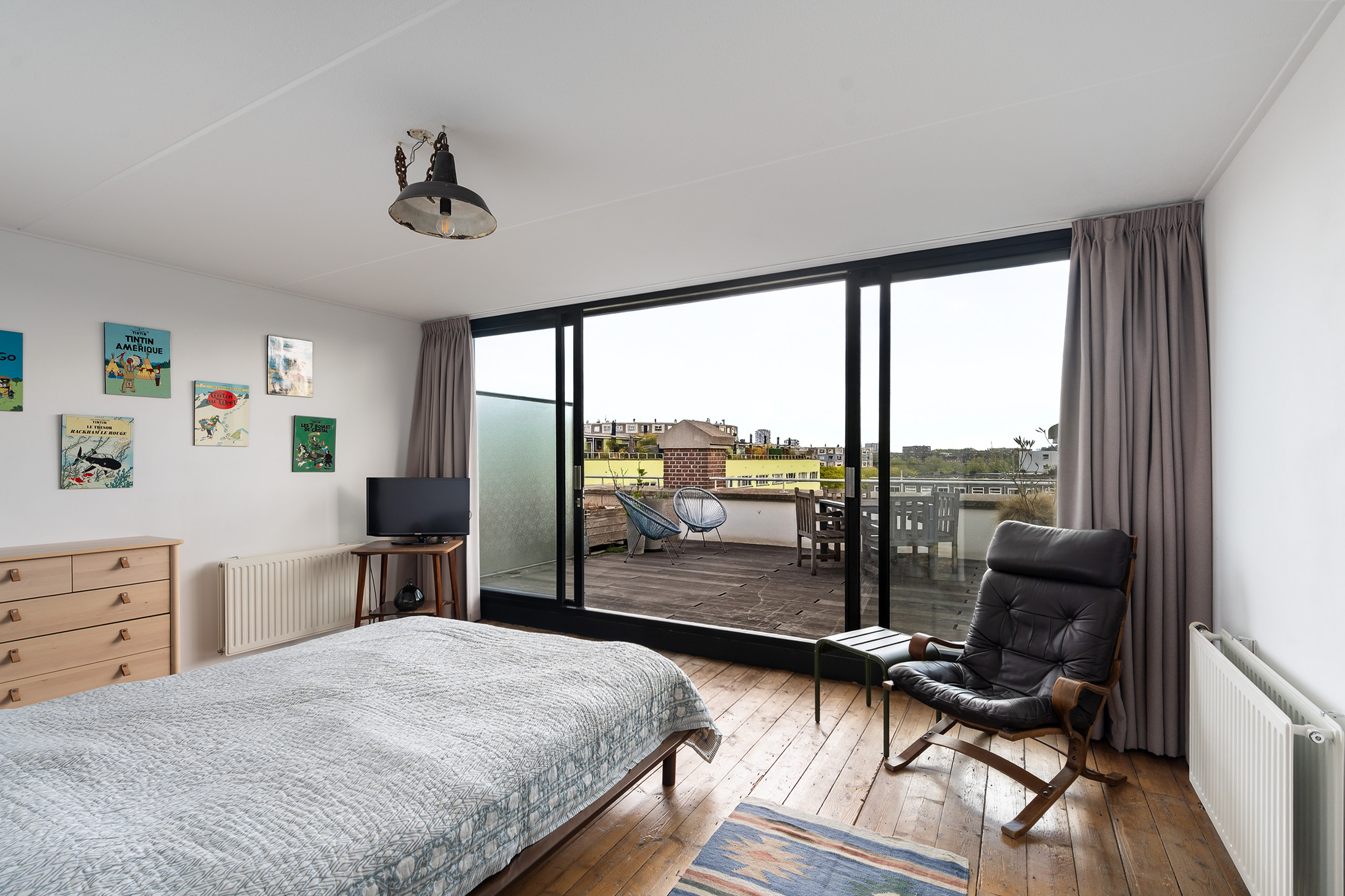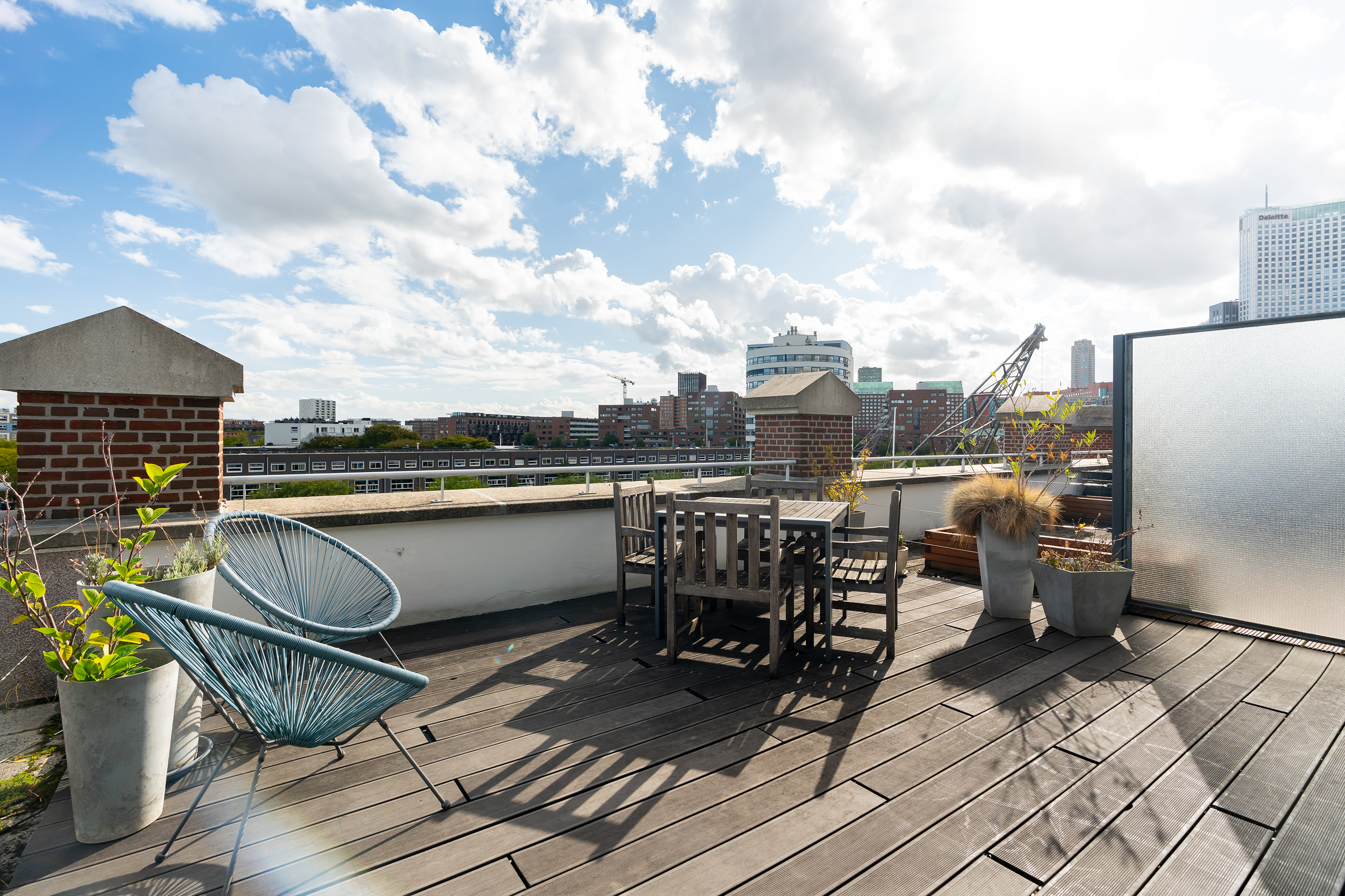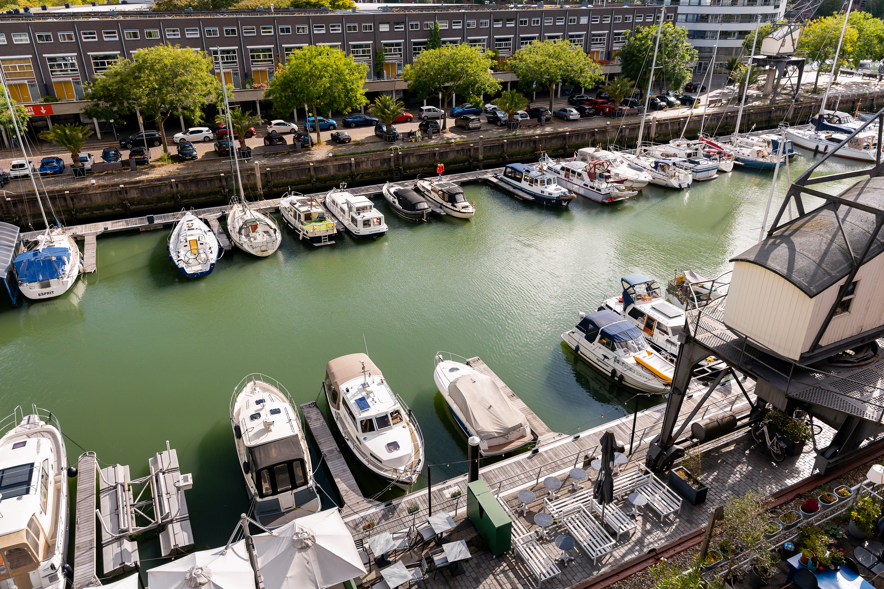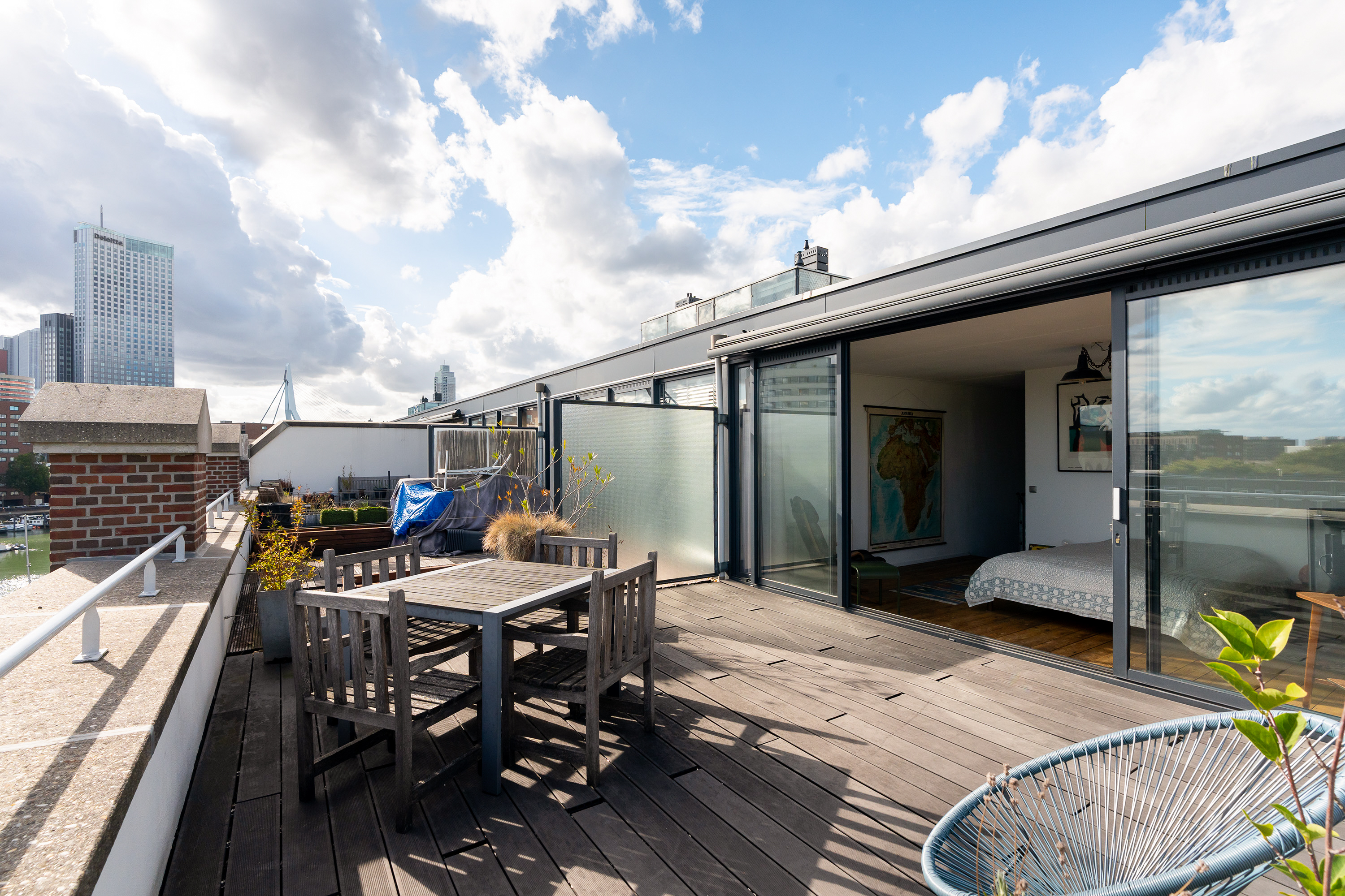 Via de stoere industriële trap kom je op de ruime slaapetage. Hier vind je alles voor optimaal wooncomfort: voldoende plek voor een groot bed en een kastenwand, een badkamer met ligbad, douche en dubbele wastafels, én een apart toilet met fonteintje. Ook is er een praktische wasruimte met aansluitingen voor wasmachine en droger. De absolute eyecatcher is de grote schuifpui naar het dakterras van circa 22 m², gelegen op het zuidoosten. Hier is ruimte genoeg voor zowel een loungehoek als een eettafel, ideaal om uitgebreid te tafelen of te barbecueën met vrienden. Het uitzicht is werkelijk spectaculair: de jachthaven ligt aan je voeten en zelfs de Erasmusbrug is zichtbaar.