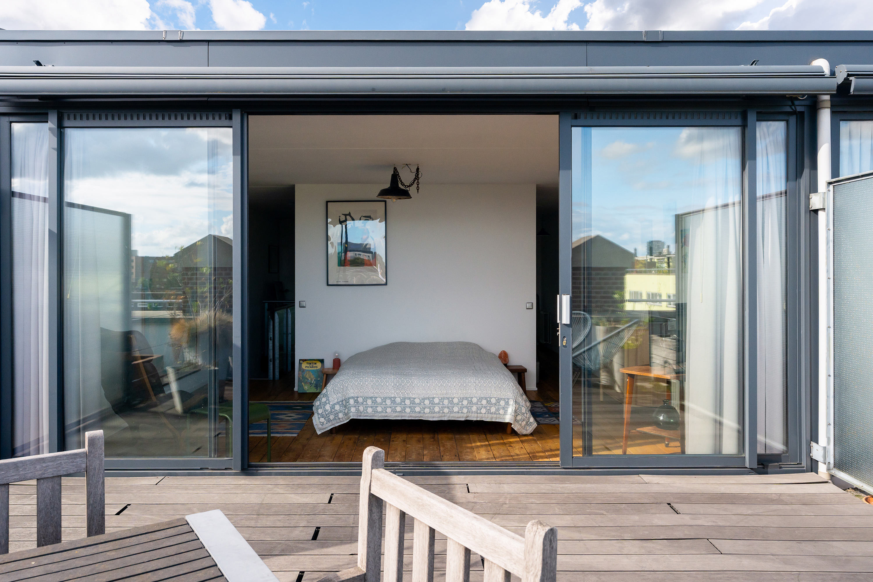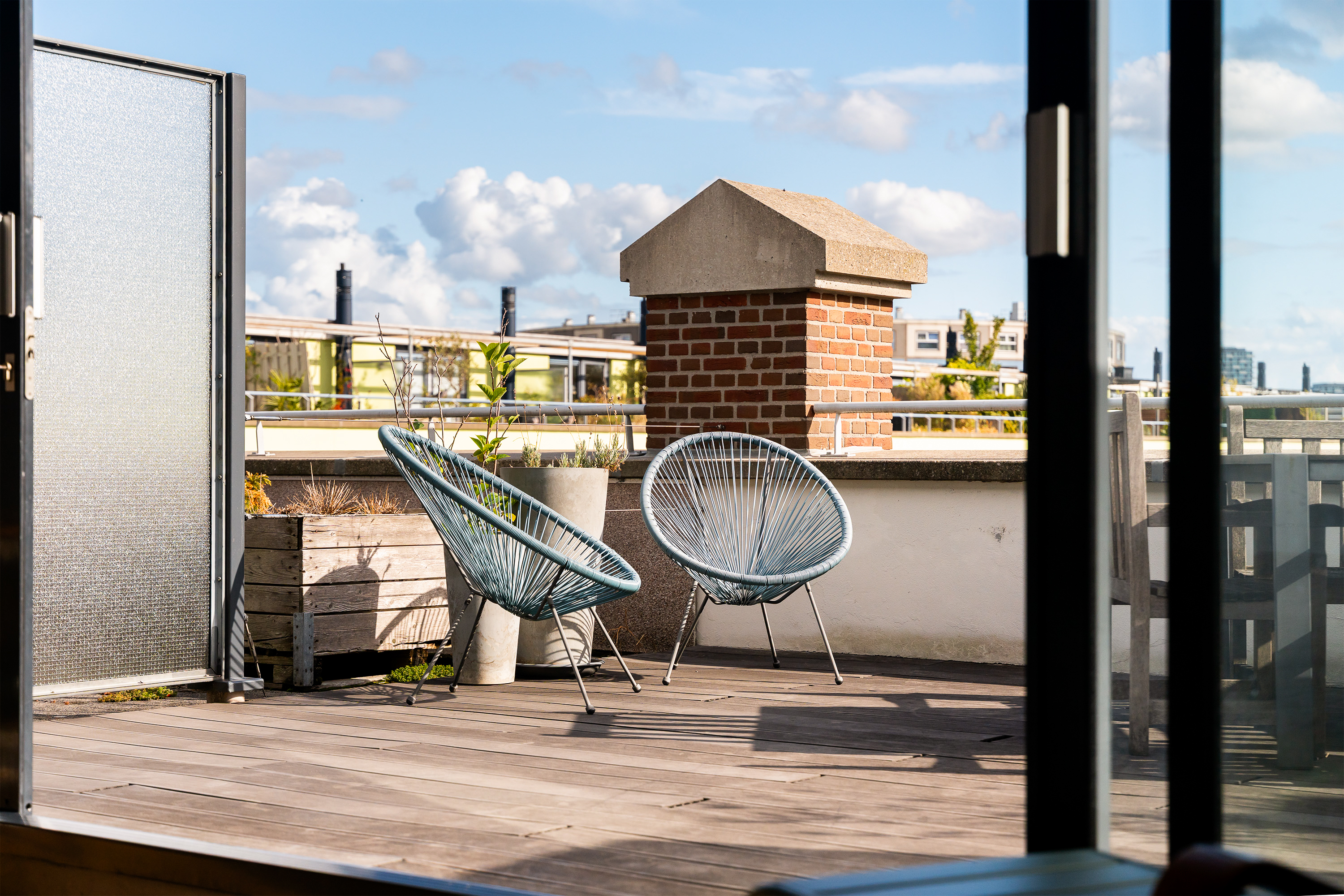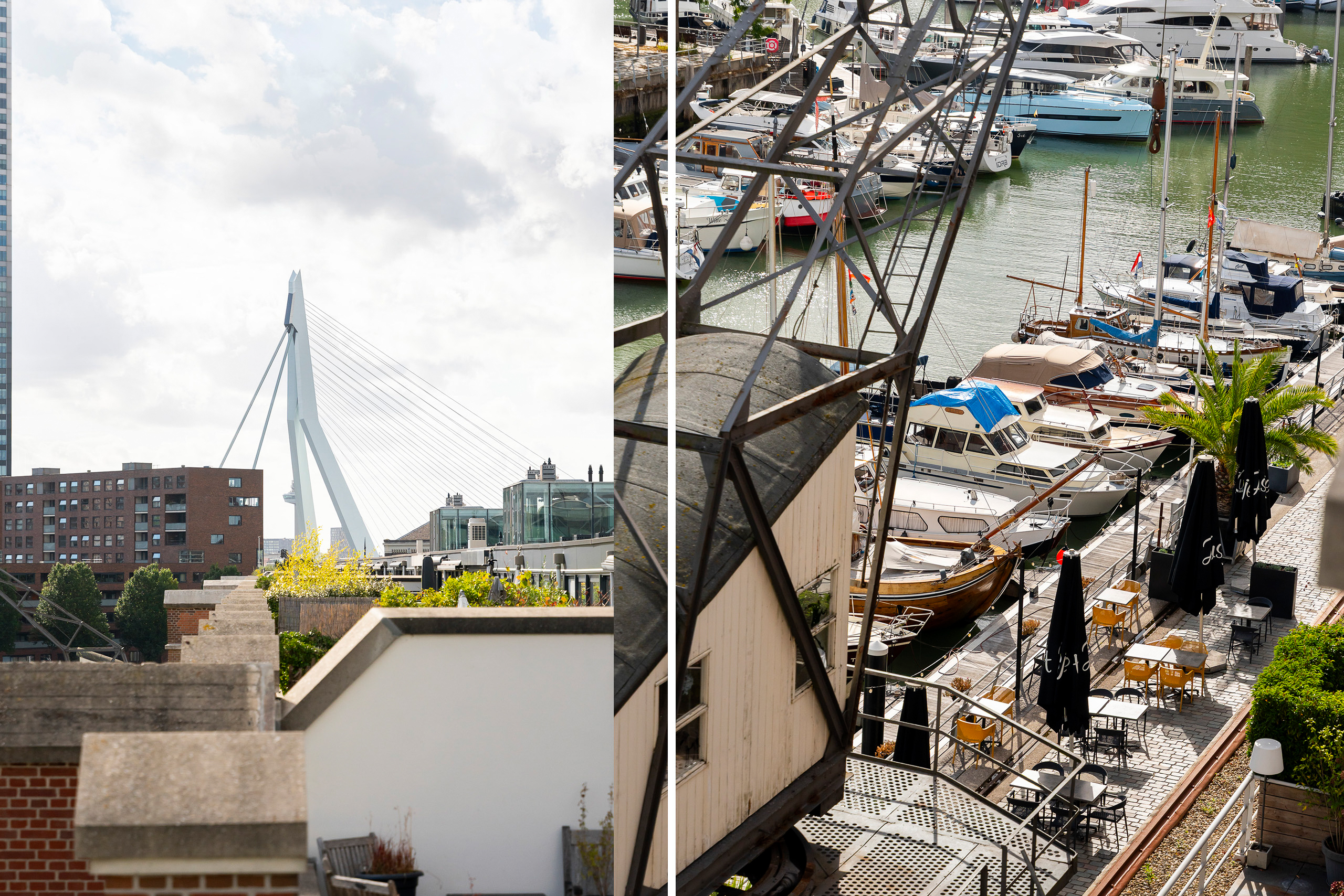 Via de stoere industriële trap kom je op de ruime slaapetage. Hier vind je alles voor optimaal wooncomfort: voldoende plek voor een groot bed en een kastenwand, een badkamer met ligbad, douche en dubbele wastafels, én een apart toilet met fonteintje. Ook is er een praktische wasruimte met aansluitingen voor wasmachine en droger. De absolute eyecatcher is de grote schuifpui naar het dakterras van circa 22 m², gelegen op het zuidoosten. Hier is ruimte genoeg voor zowel een loungehoek als een eettafel, ideaal om uitgebreid te tafelen of te barbecueën met vrienden. Het uitzicht is werkelijk spectaculair: de jachthaven ligt aan je voeten en zelfs de Erasmusbrug is zichtbaar.