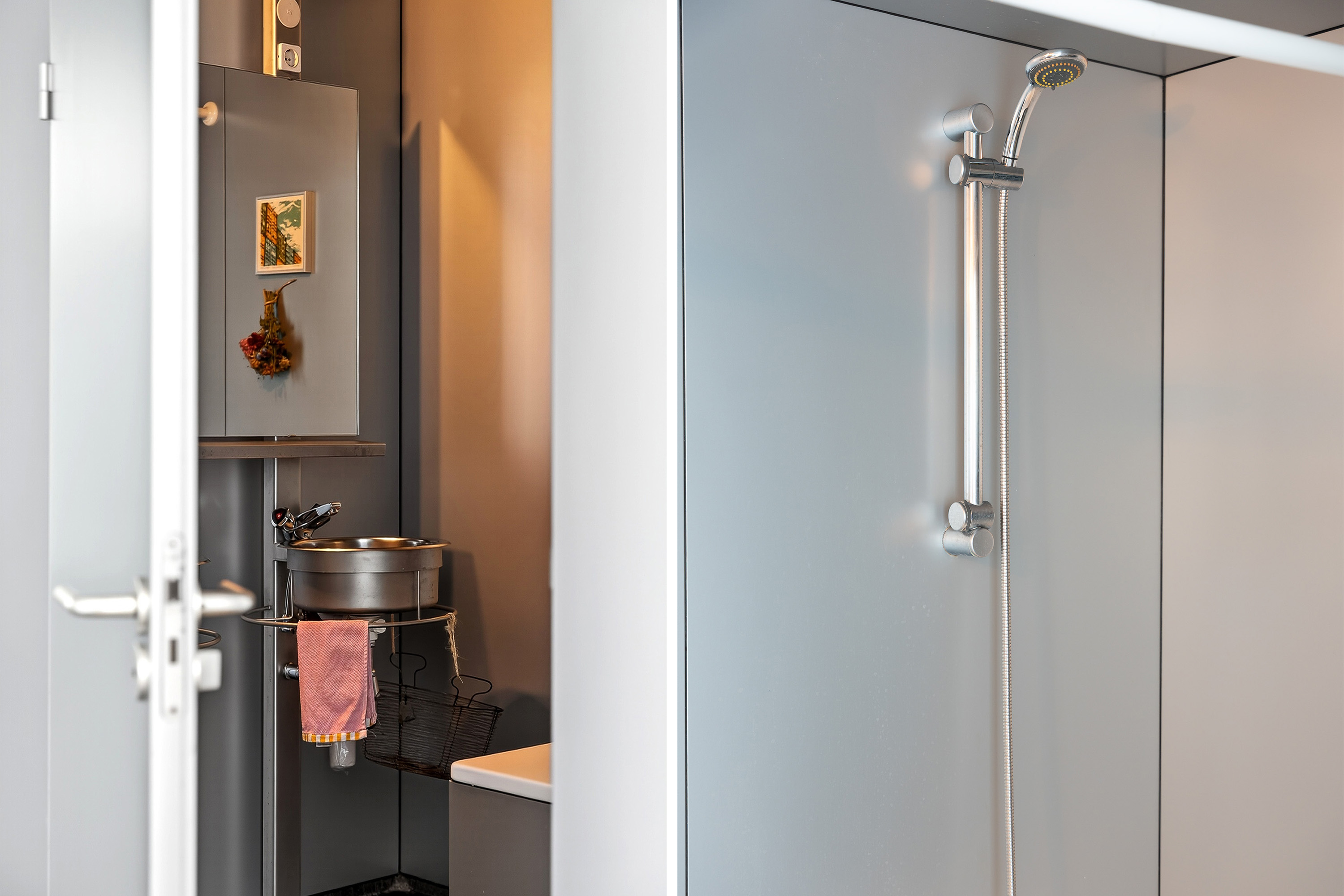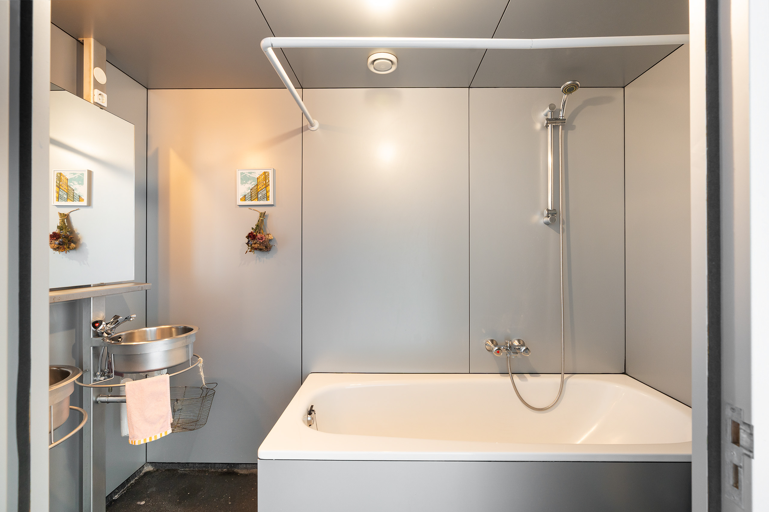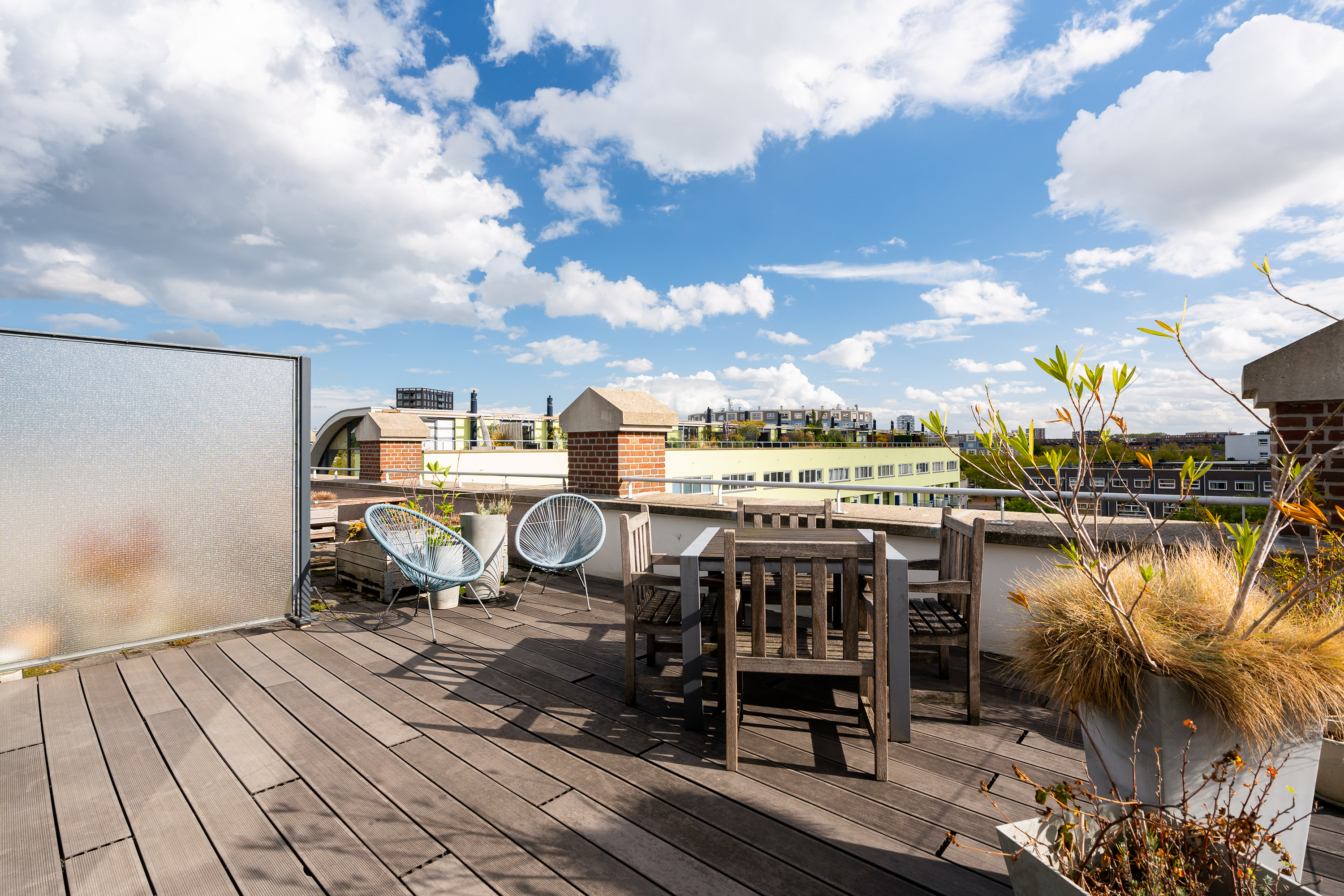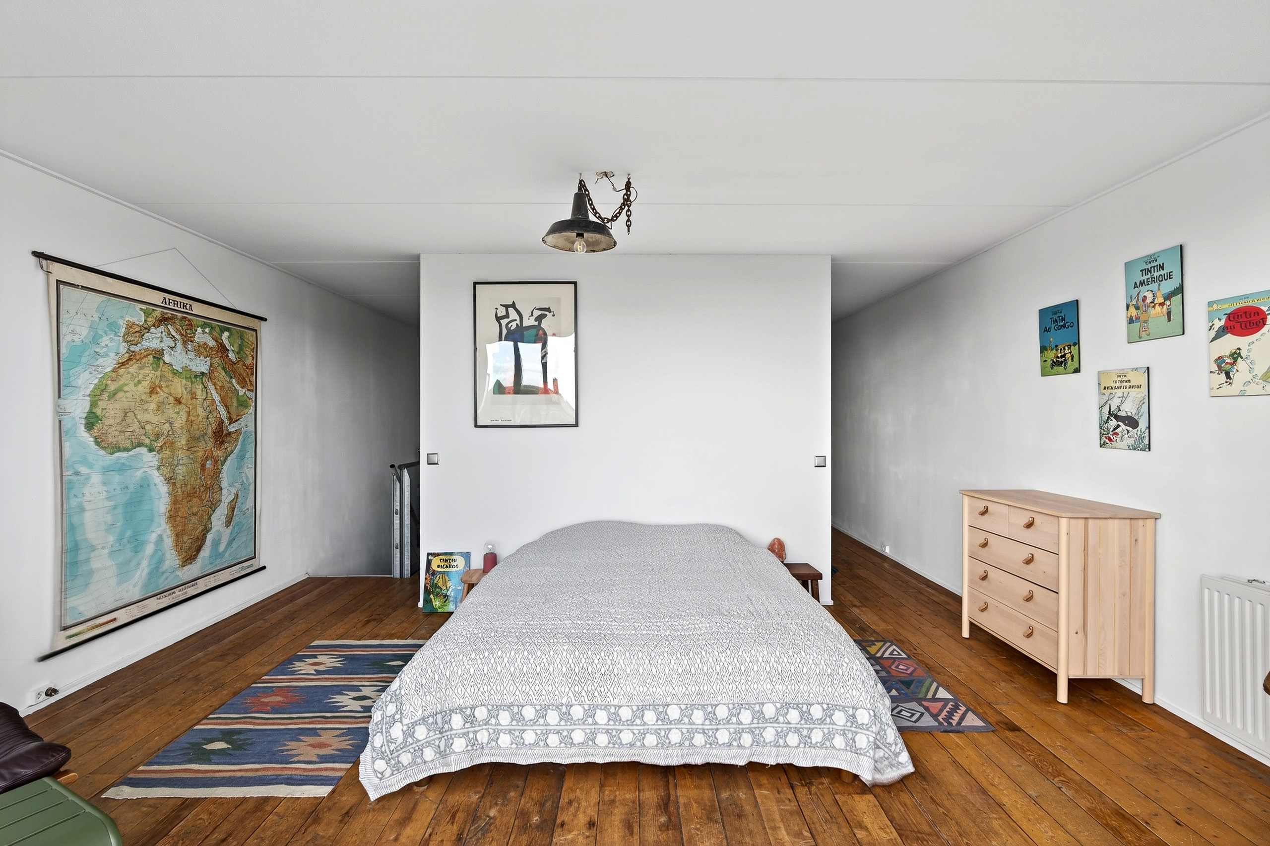 Via de stoere industriële trap kom je op de ruime slaapetage. Hier vind je alles voor optimaal wooncomfort: voldoende plek voor een groot bed en een kastenwand, een badkamer met ligbad, douche en dubbele wastafels, én een apart toilet met fonteintje. Ook is er een praktische wasruimte met aansluitingen voor wasmachine en droger. De absolute eyecatcher is de grote schuifpui naar het dakterras van circa 22 m², gelegen op het zuidoosten. Hier is ruimte genoeg voor zowel een loungehoek als een eettafel, ideaal om uitgebreid te tafelen of te barbecueën met vrienden. Het uitzicht is werkelijk spectaculair: de jachthaven ligt aan je voeten en zelfs de Erasmusbrug is zichtbaar.