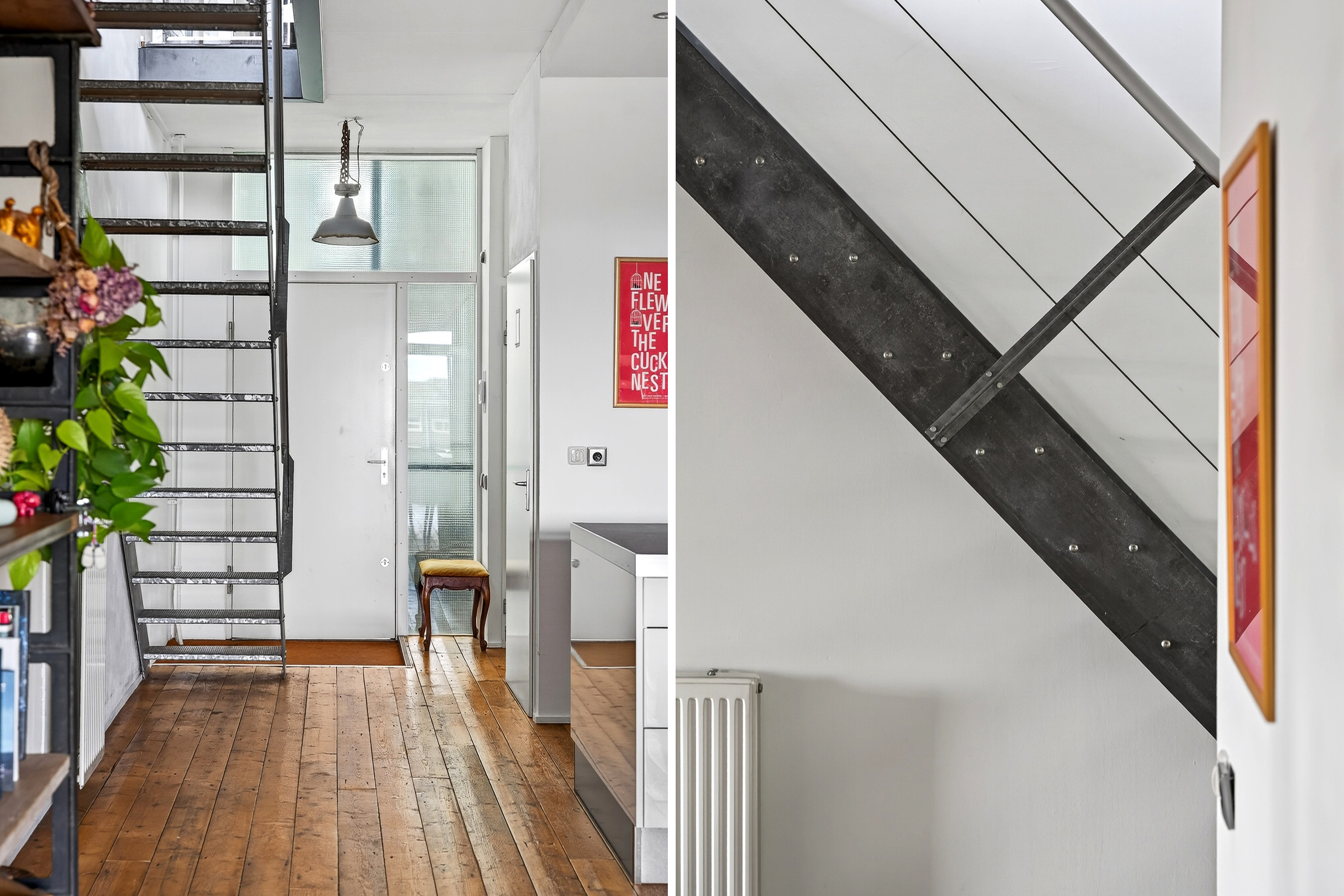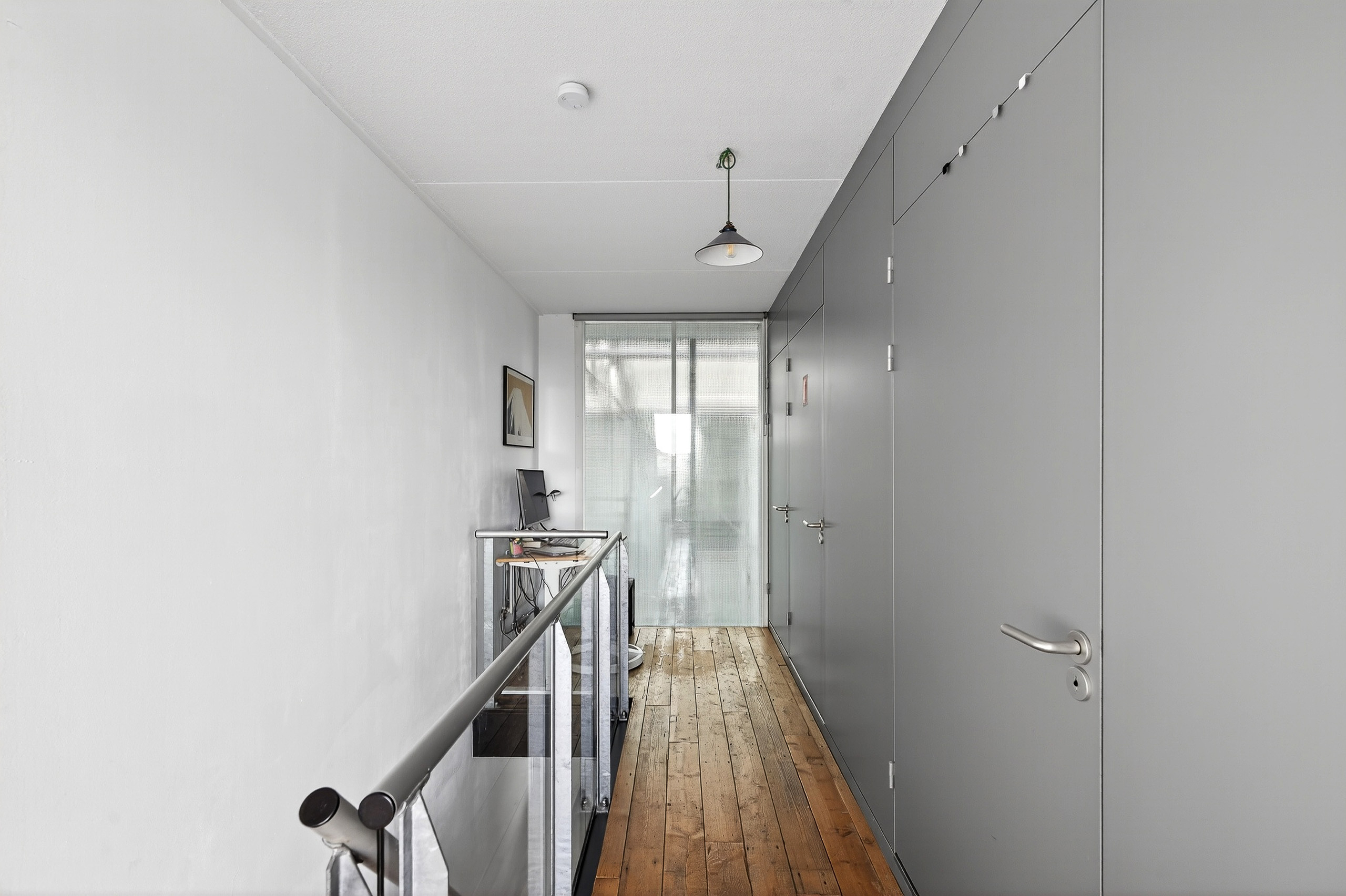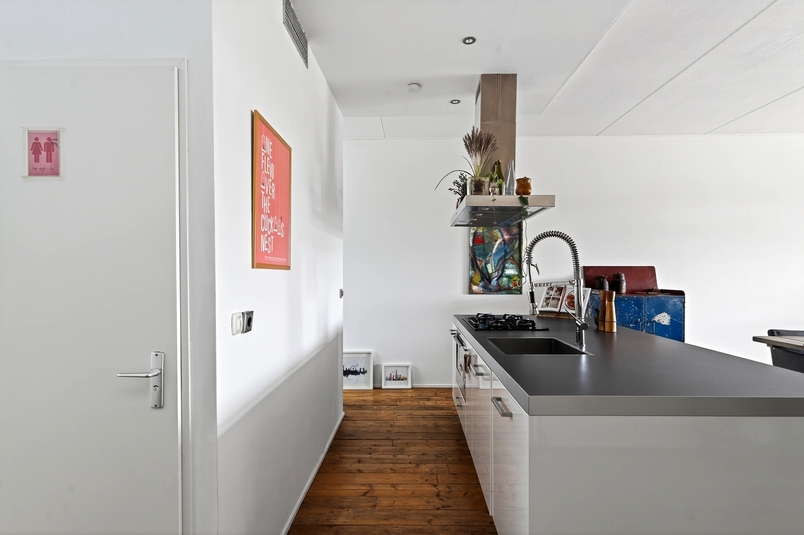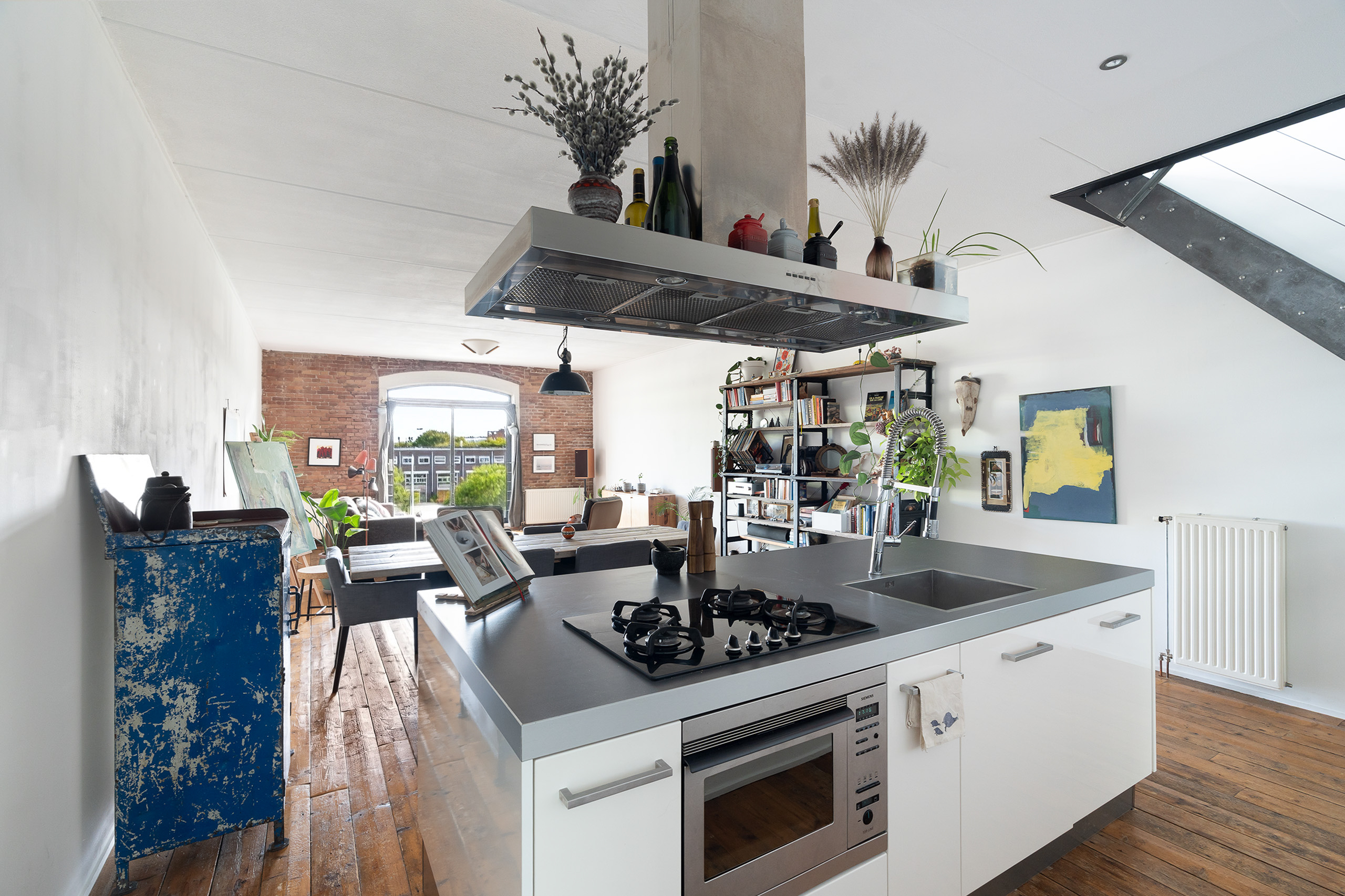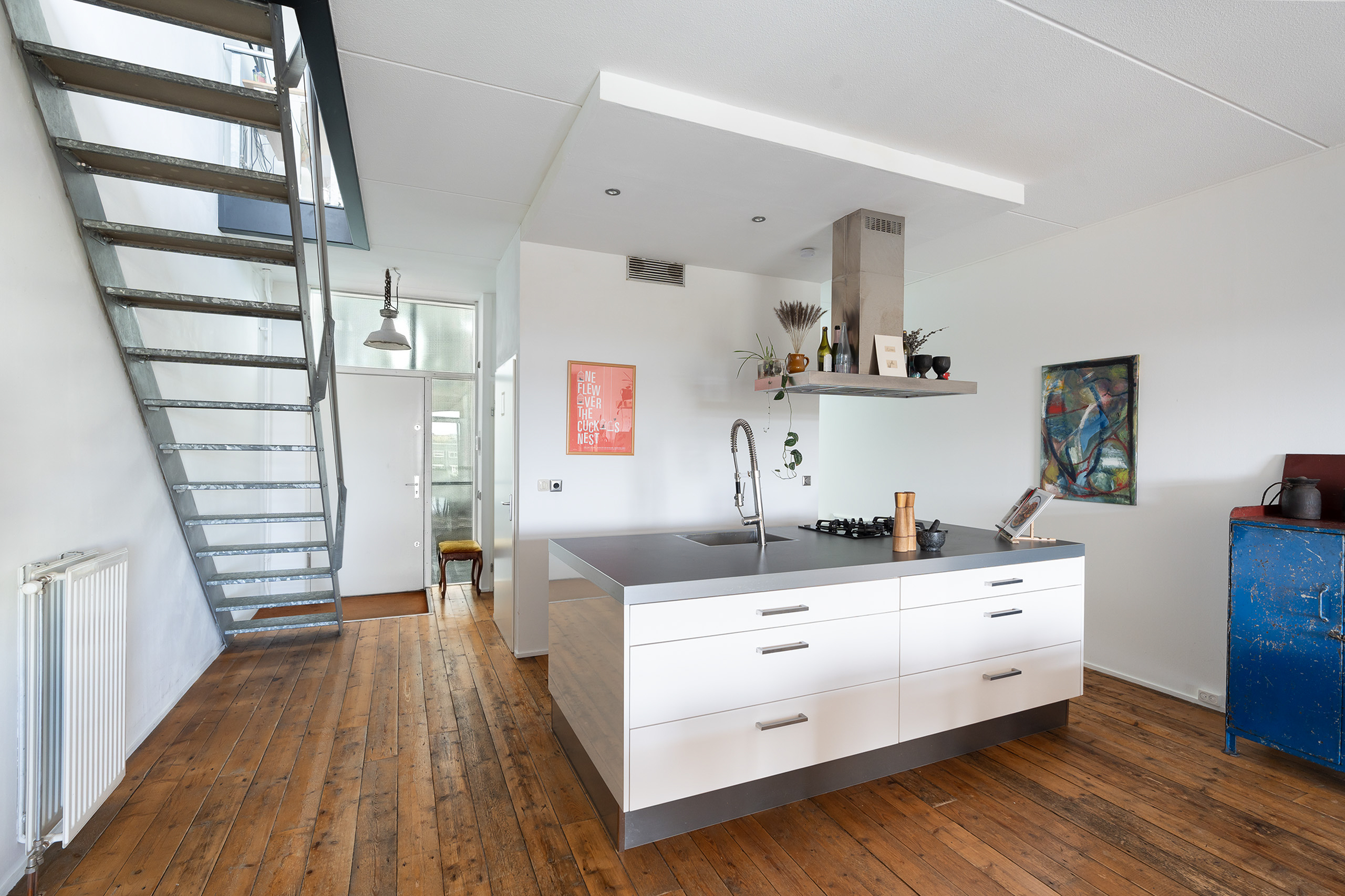 Via de interne galerij bereik je de woning op de derde verdieping. Bij binnenkomst word je direct verwelkomd in de entree, waar de open indeling zorgt voor een ruimtelijk en uniek gevoel. Het leefgedeelte sluit naadloos aan en is royaal opgezet, met grote raampartijen die veel licht binnenlaten. Centraal in de ruimte bevindt zich de open keuken, modern en praktisch ingericht. De afwerking is strak met een industriële touch: een robuuste houten vloer en originele details geven het geheel karakter en sfeer.